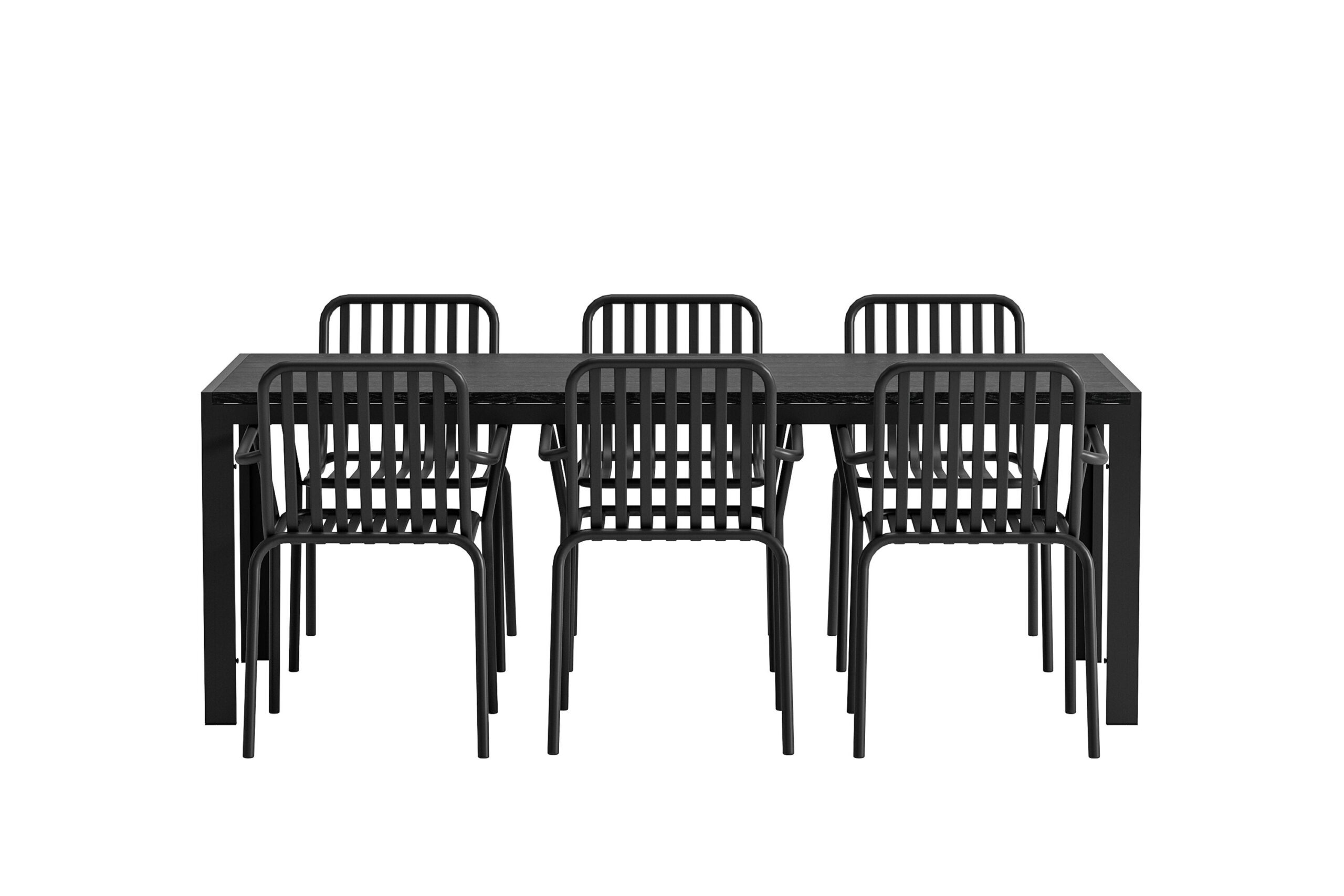 Andke oma väliruumile kaasaegne ja rafineeritud tõuge selle elegantse söögikomplektiga, mis ühendab Pekingi söögitoolid avara Mirko söögilauaga. Pekingi toolil on stiilne liistude disain ja suitsune must värv, mis loob ajatu ja kaasaegse ilme. See on valmistatud kergest alumiiniumist ja sellel on integreeritud käetoed lisamugavuse tagamiseks. See on ka virnastatav, muutes ladustamise lihtsaks ja mugavaks. Mirko söögilaud pakub elegantset musta värvi ja moodsat ristkülikukujulist kuju, mis annab õuealale värske ja eksklusiivse tunde. Roostekindel alumiiniumraam muudab laua nii kergeks kui ka vastupidavaks, kaunis polüpuidust lauaplaat lisab aga loomulikku soojust. Rikkalik suurus pakub palju ruumi nii einete kui ka seltskondlike koosviibimiste jaoks.