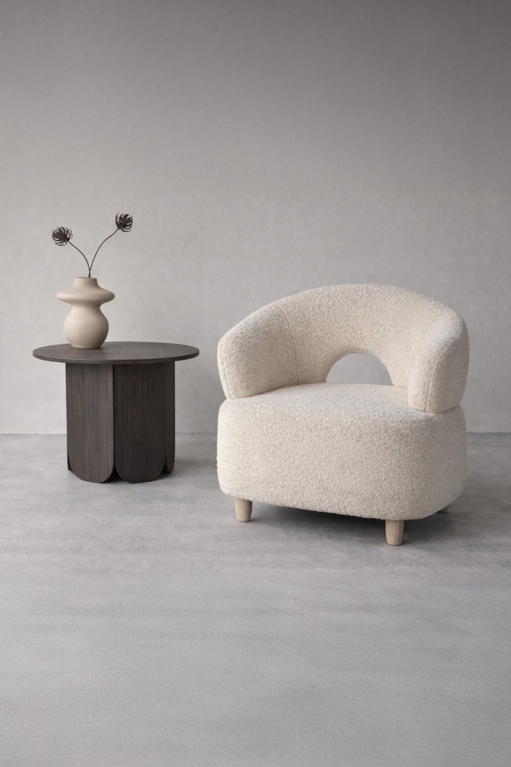 Moglas on stiilne ümara disaini ja valge polstriga tugitool, mis loob sooja ja kutsuva tunde. Avatud seljaosa lisab moodsat hõngu, muutes tugitooli nii ilusaks kui ka mugavaks.