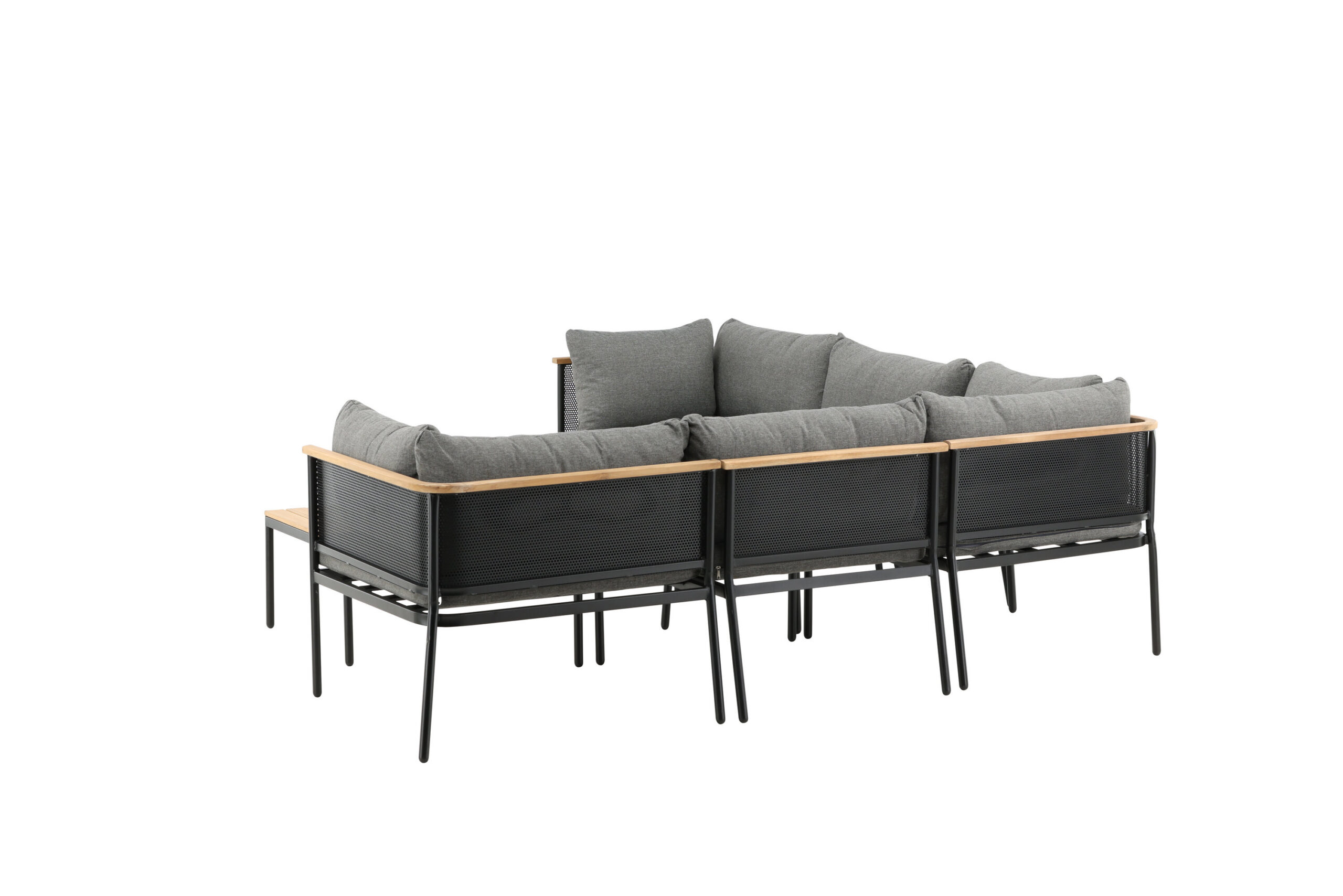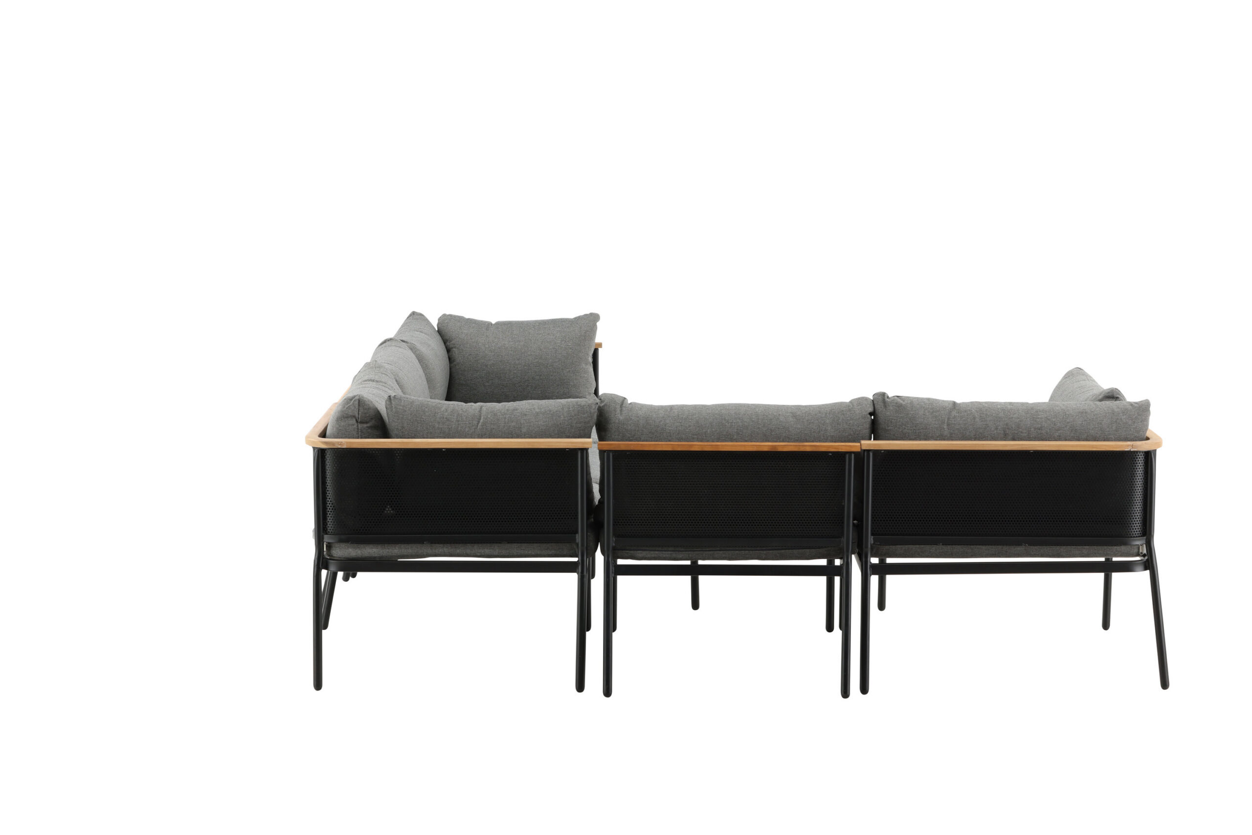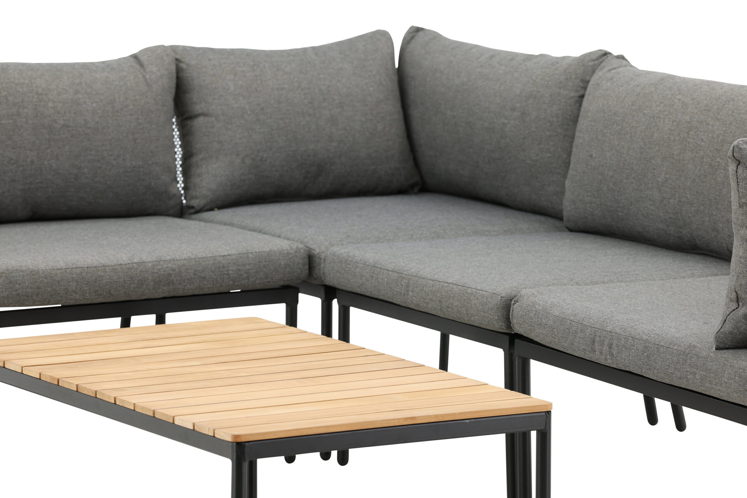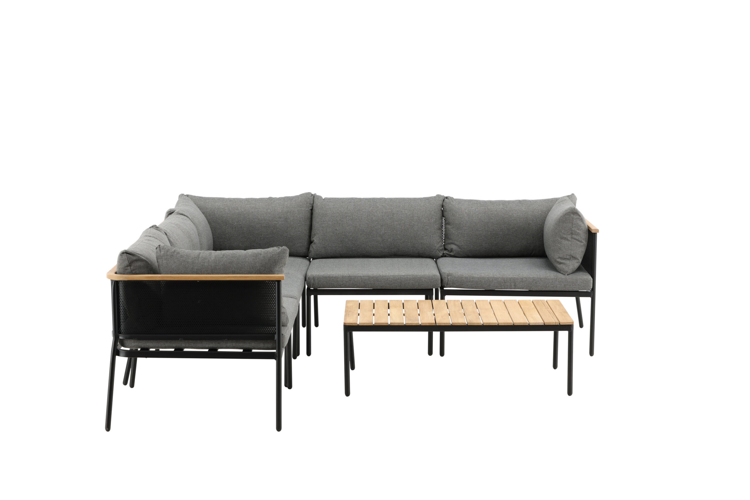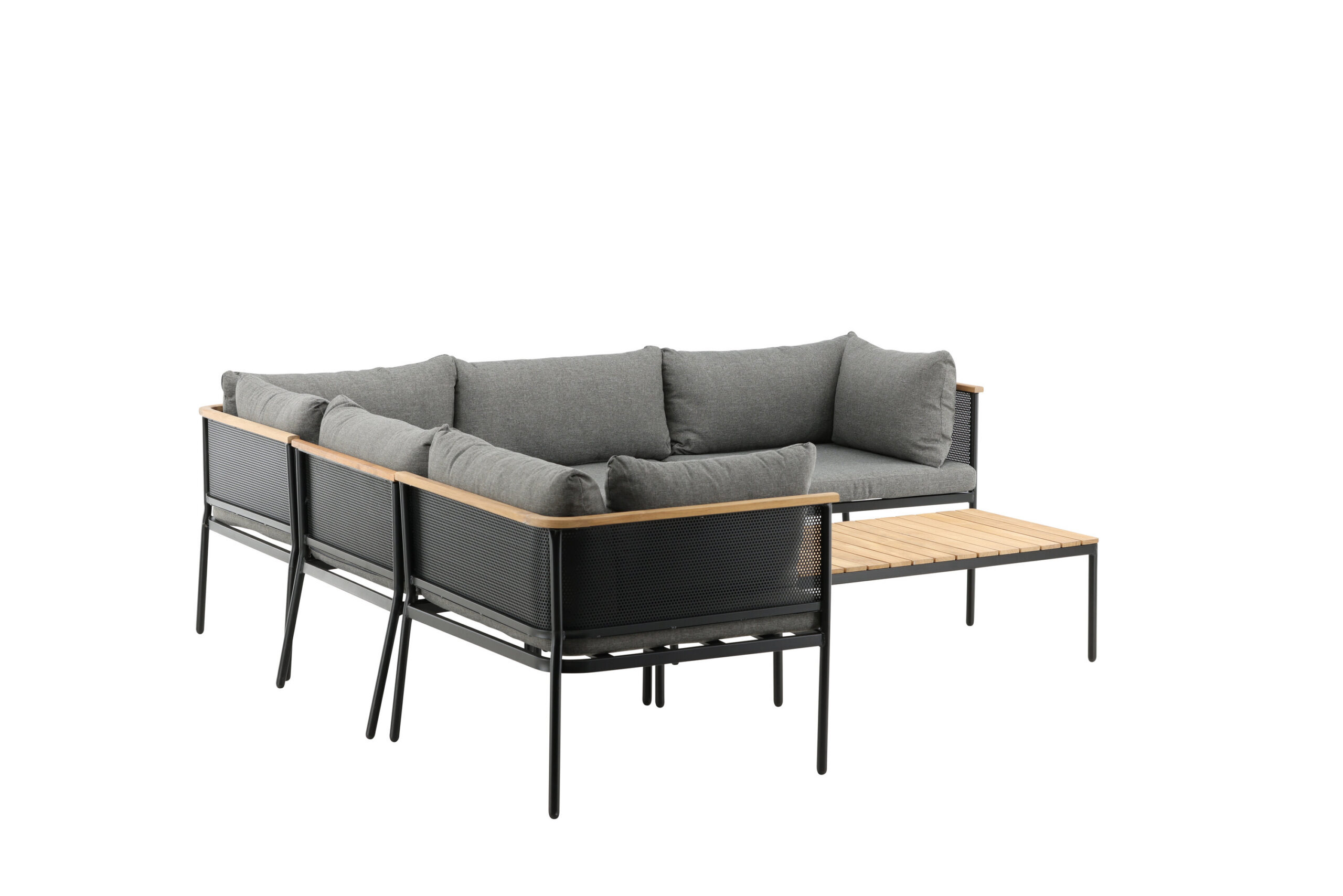 Moodsa stiilse disainiga diivanirühm teie siseõuele või terrassile. Diivanigrupp koosneb nurgadiivanist, mis on moodulipõhine, seega saad selle paigutada mitmel viisil just nii, nagu soovid 3 istme ja nurgaosaga. Valmistatud mustast pulbervärvitud metallist ja detailid mustast metallvõrkudest ja tiikpuust, sealhulgas pehmed hallid padjad ning tiikpuust lauaplaadiga ristkülikukujuline kohvilaud. Vajalik on kergem montaaž.