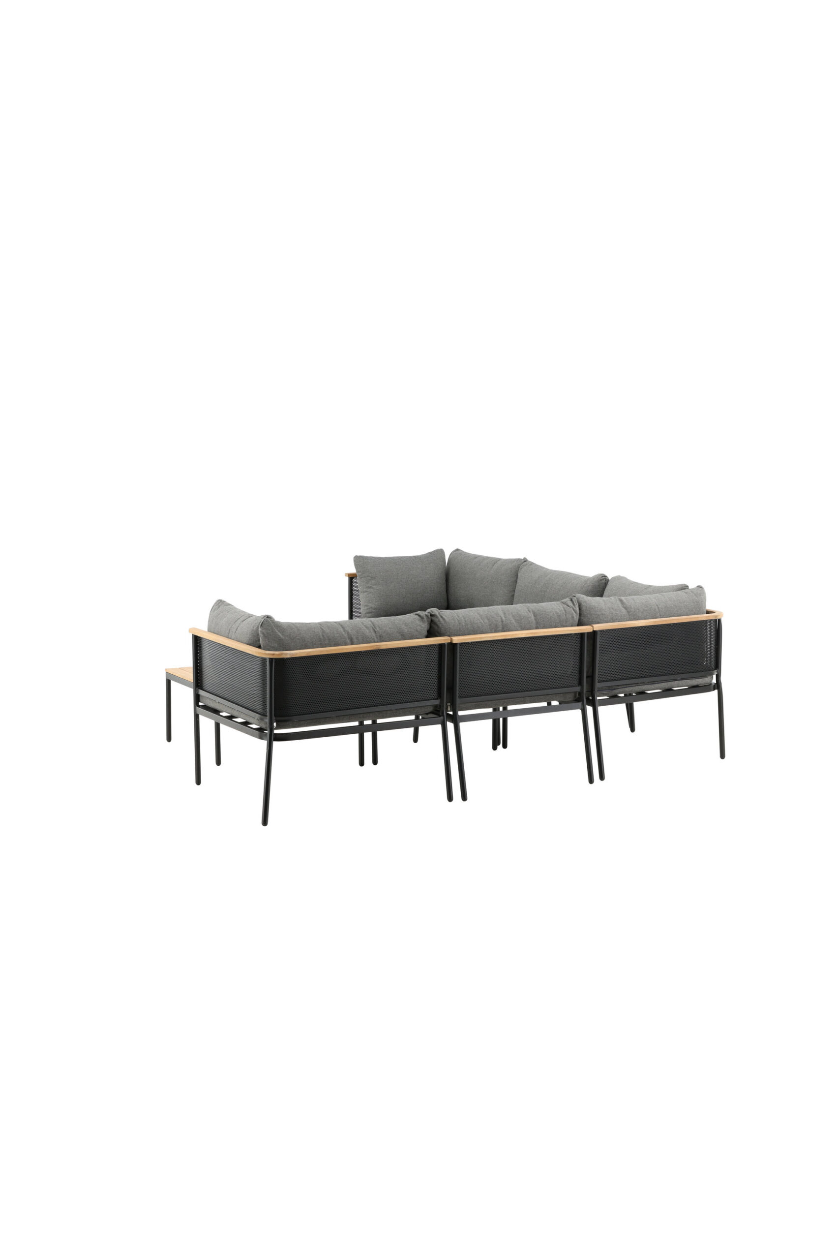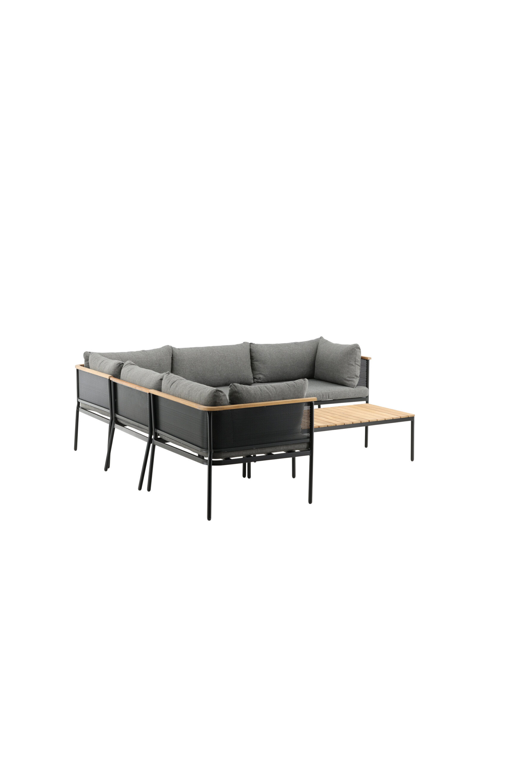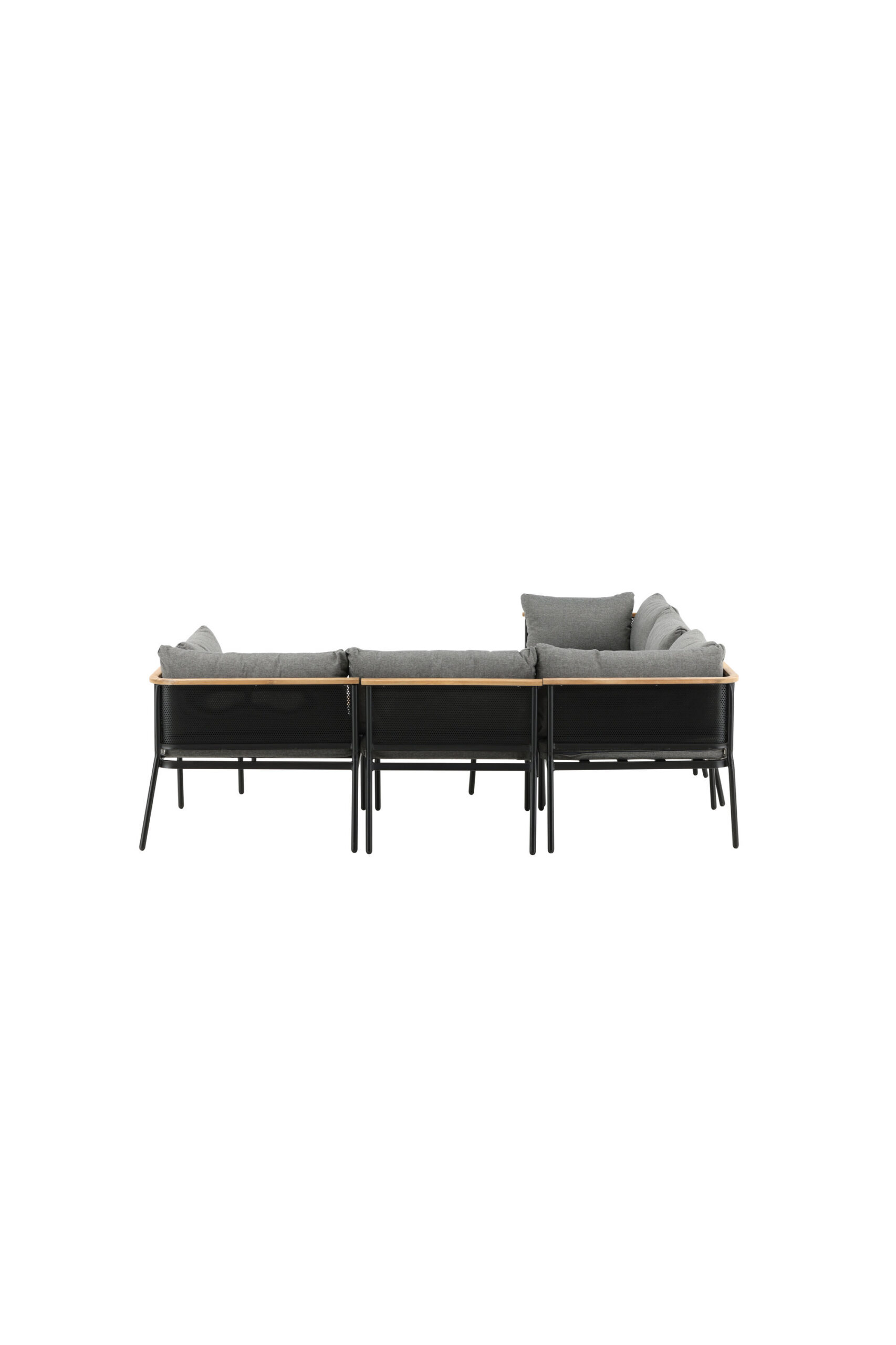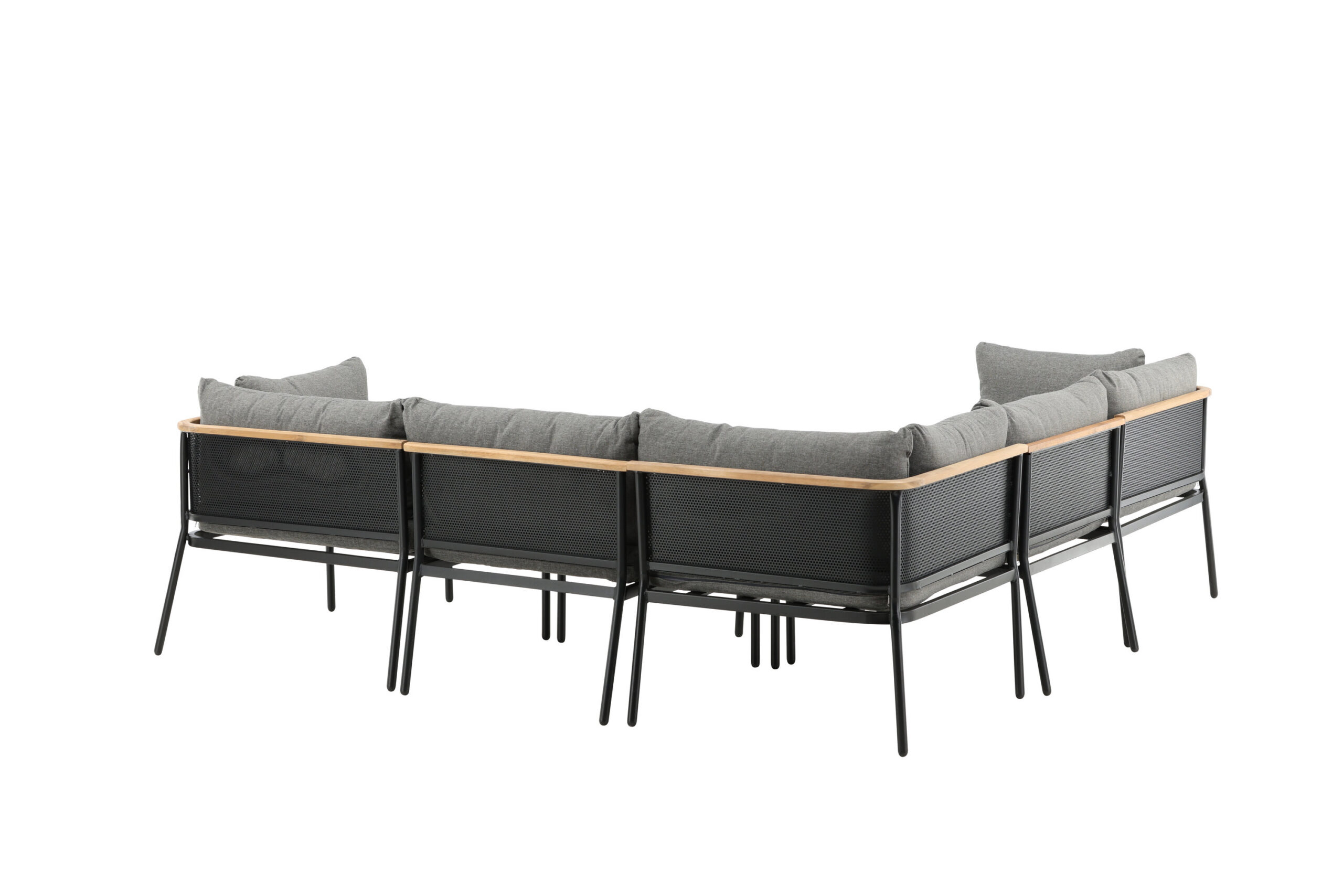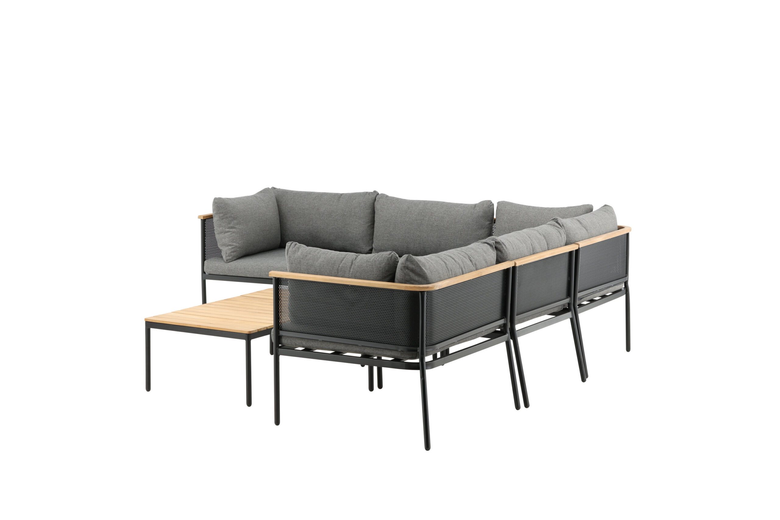 Moodsa stiilse disainiga diivanirühm teie siseõuele või terrassile. Diivanigrupp koosneb nurgadiivanist, mis on moodulipõhine, seega saad selle paigutada mitmel viisil just nii, nagu soovid 3 istme ja nurgaosaga. Valmistatud mustast pulbervärvitud metallist ja detailid mustast metallvõrkudest ja tiikpuust, sealhulgas pehmed hallid padjad ning tiikpuust lauaplaadiga ristkülikukujuline kohvilaud. Vajalik on kergem montaaž.