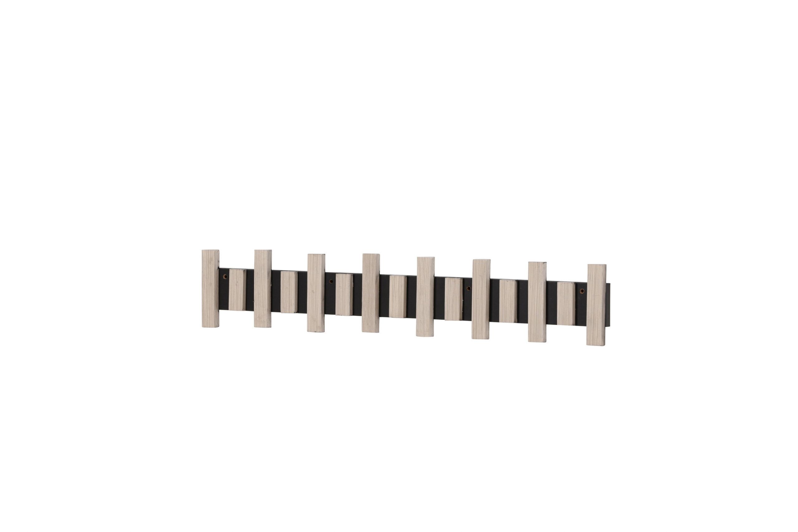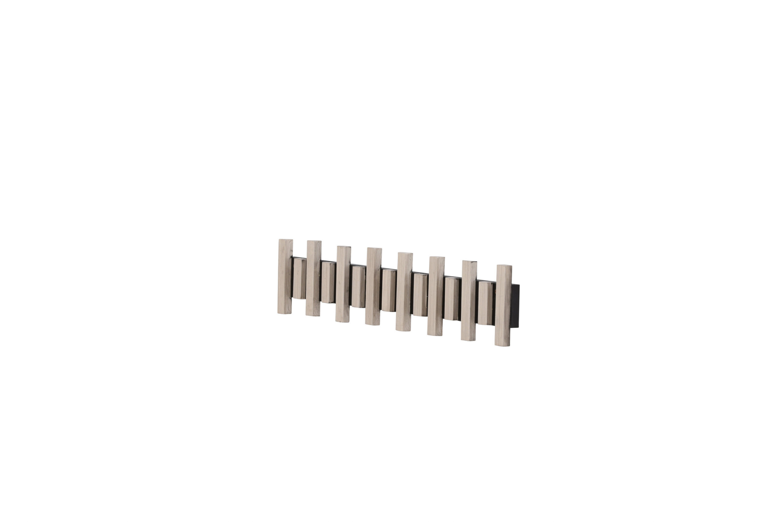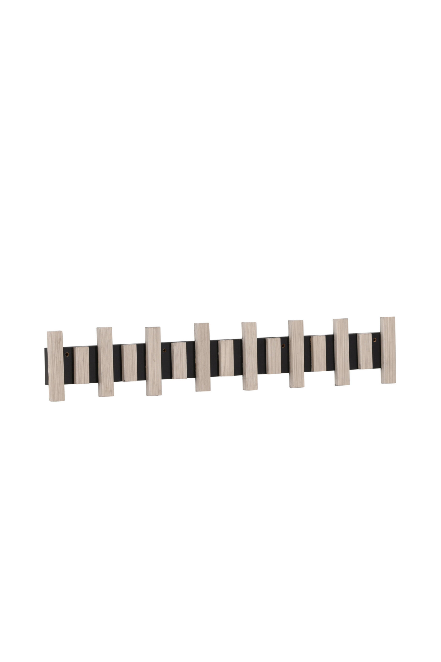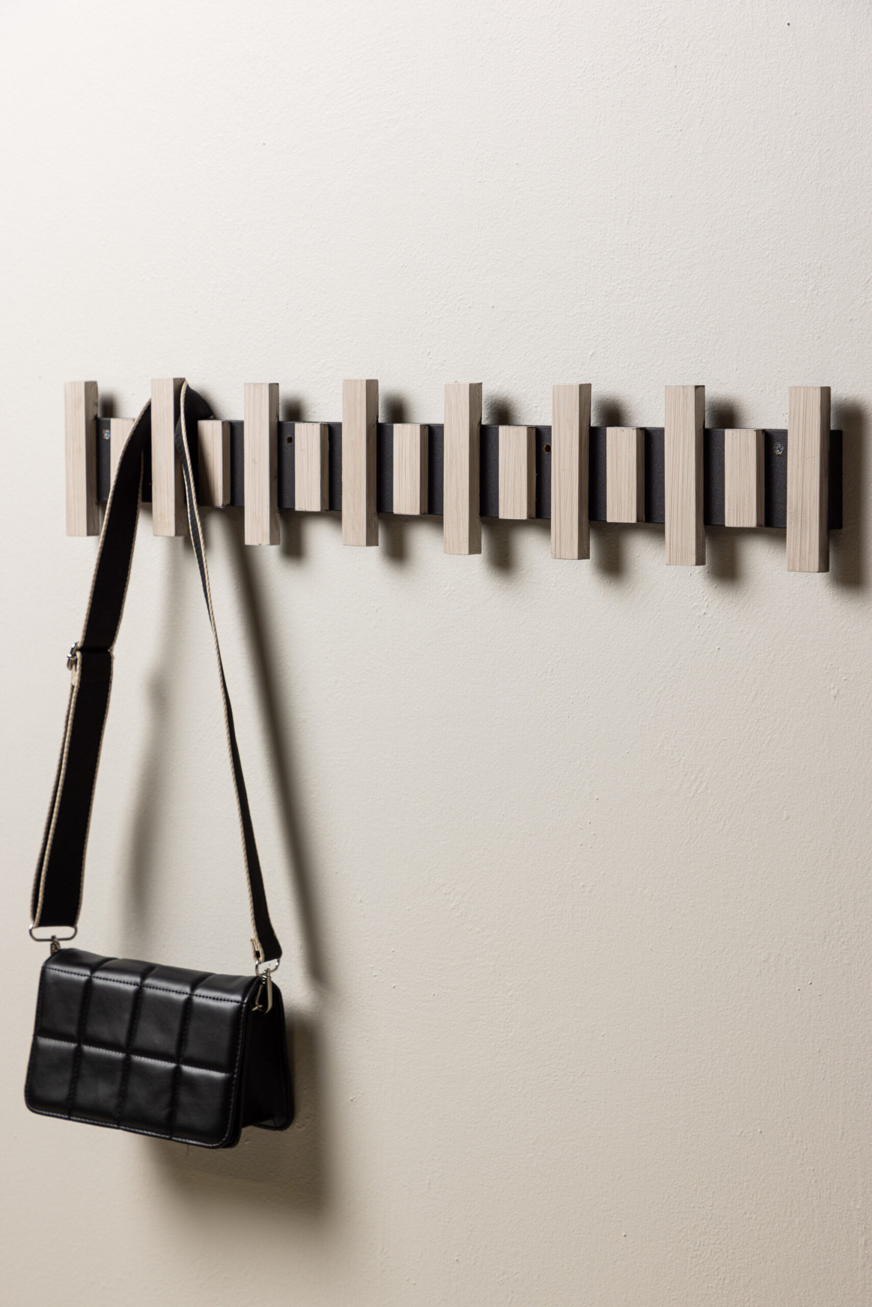 See nutikas riidepuu on kinnitatud seinale mustale metallsiinile, mis toetab mitut valgeks krohvitud MDF-ist riidepuud. Sama nutikas ja stiilne, lihtsalt diskreetse disainiga, mis toetab kõike, mida soovite koridoris riputada.