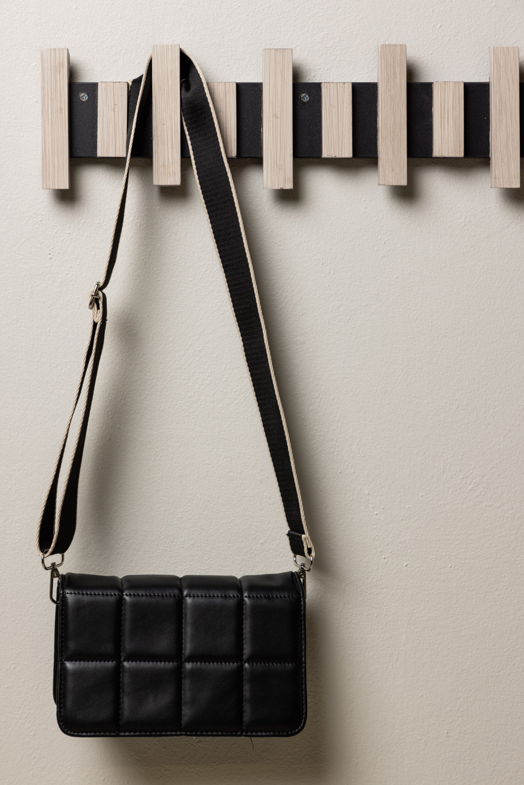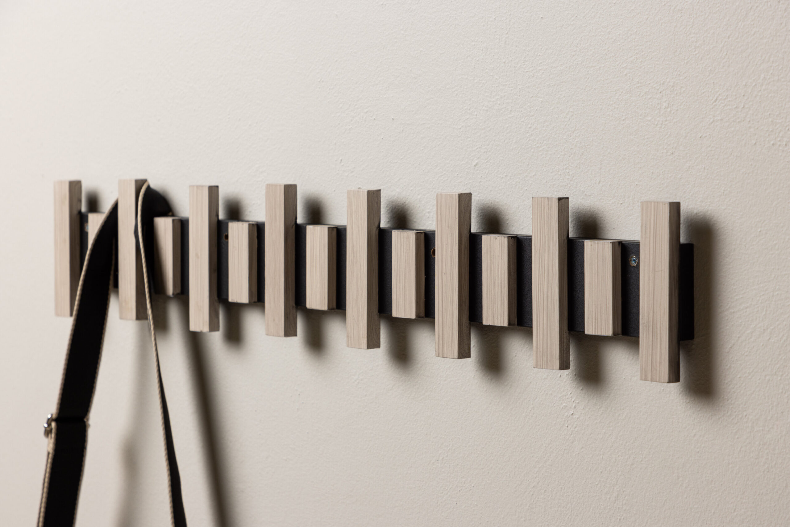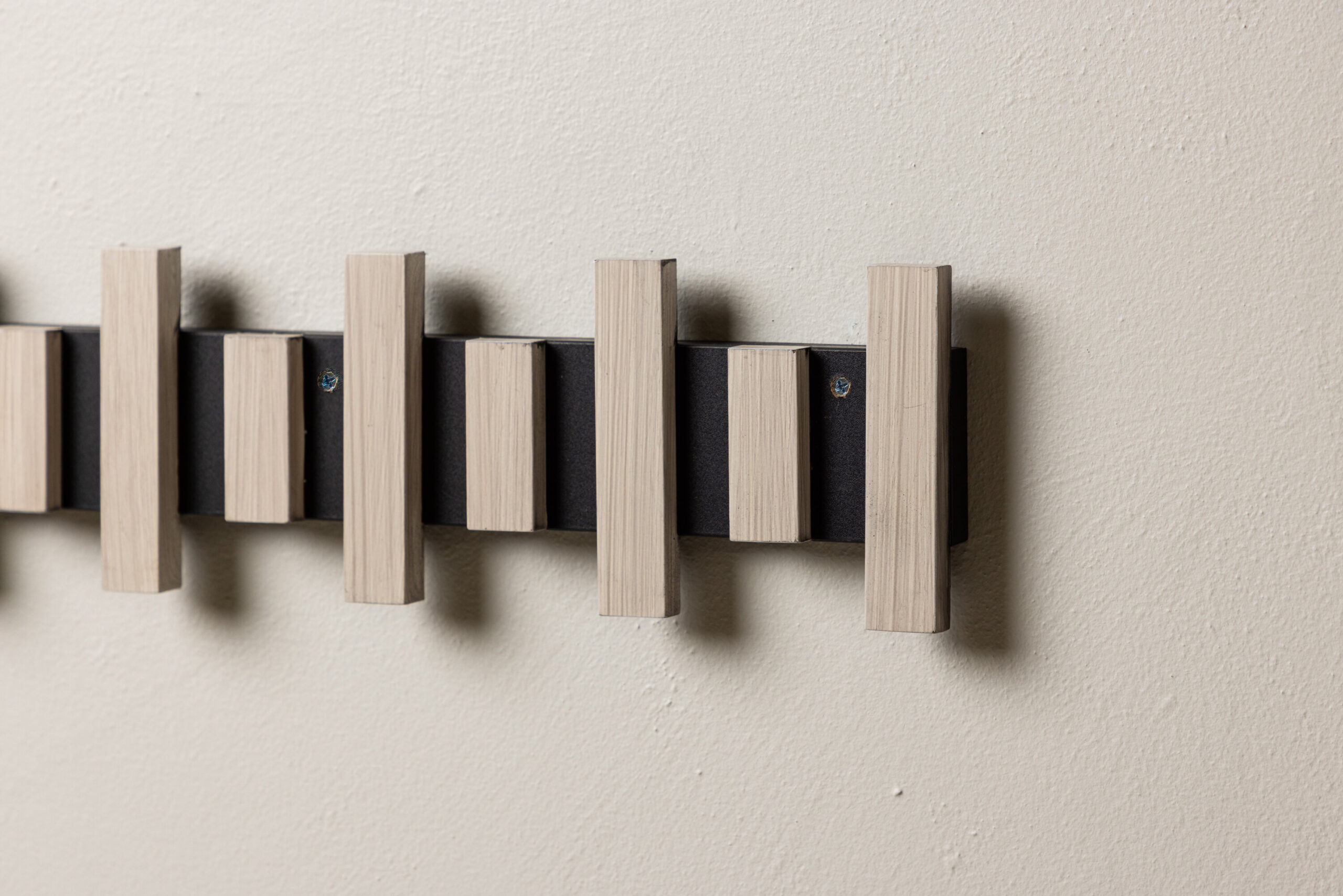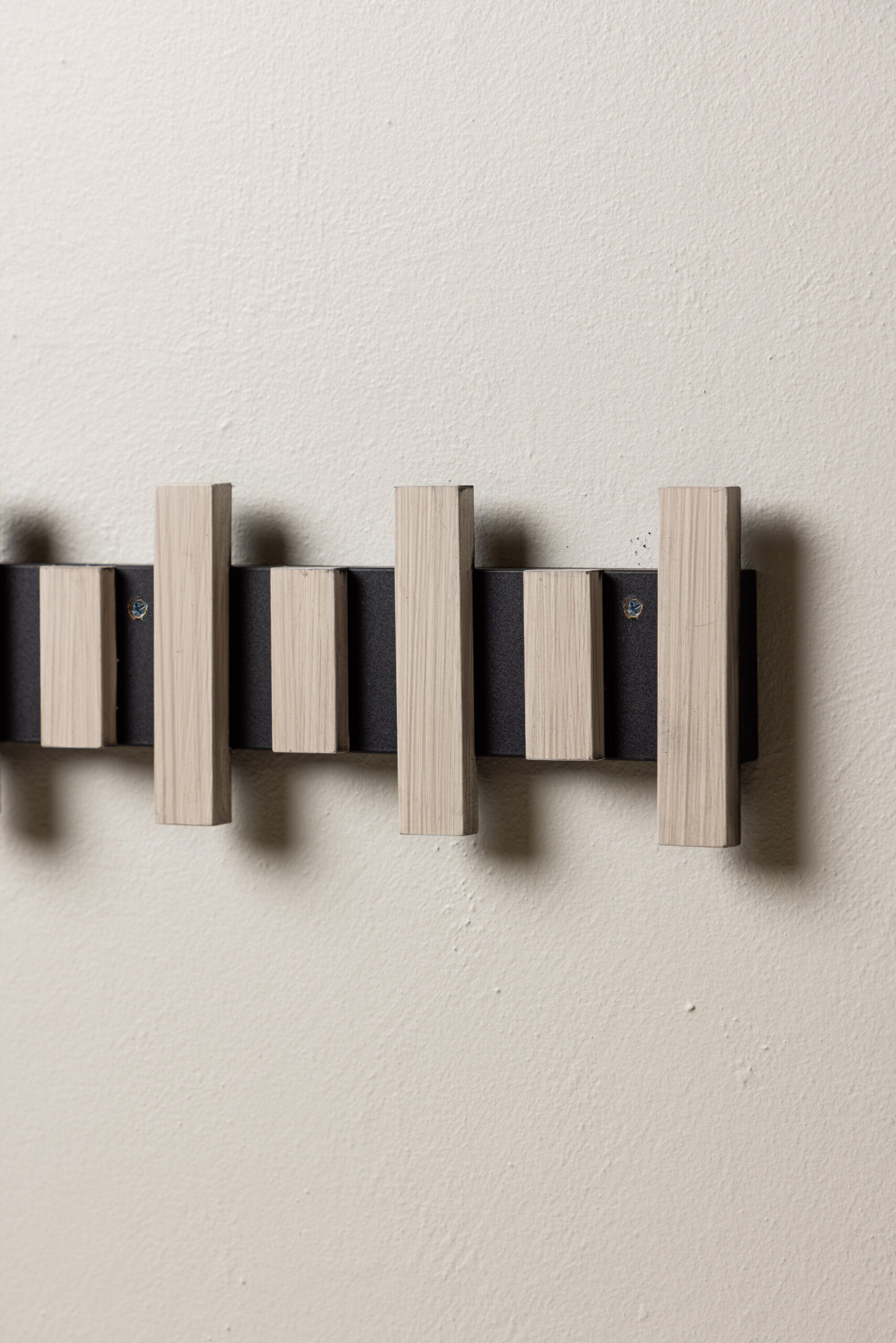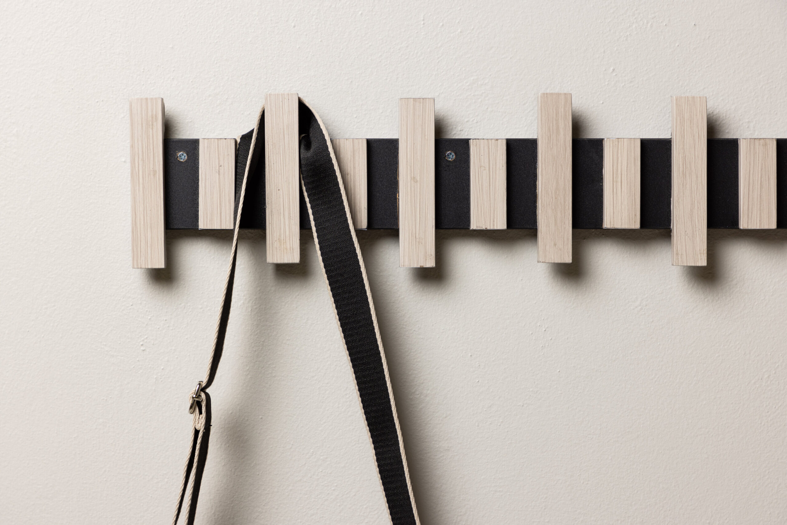 See nutikas riidepuu on kinnitatud seinale mustale metallsiinile, mis toetab mitut valgeks krohvitud MDF-ist riidepuud. Sama nutikas ja stiilne, lihtsalt diskreetse disainiga, mis toetab kõike, mida soovite koridoris riputada.