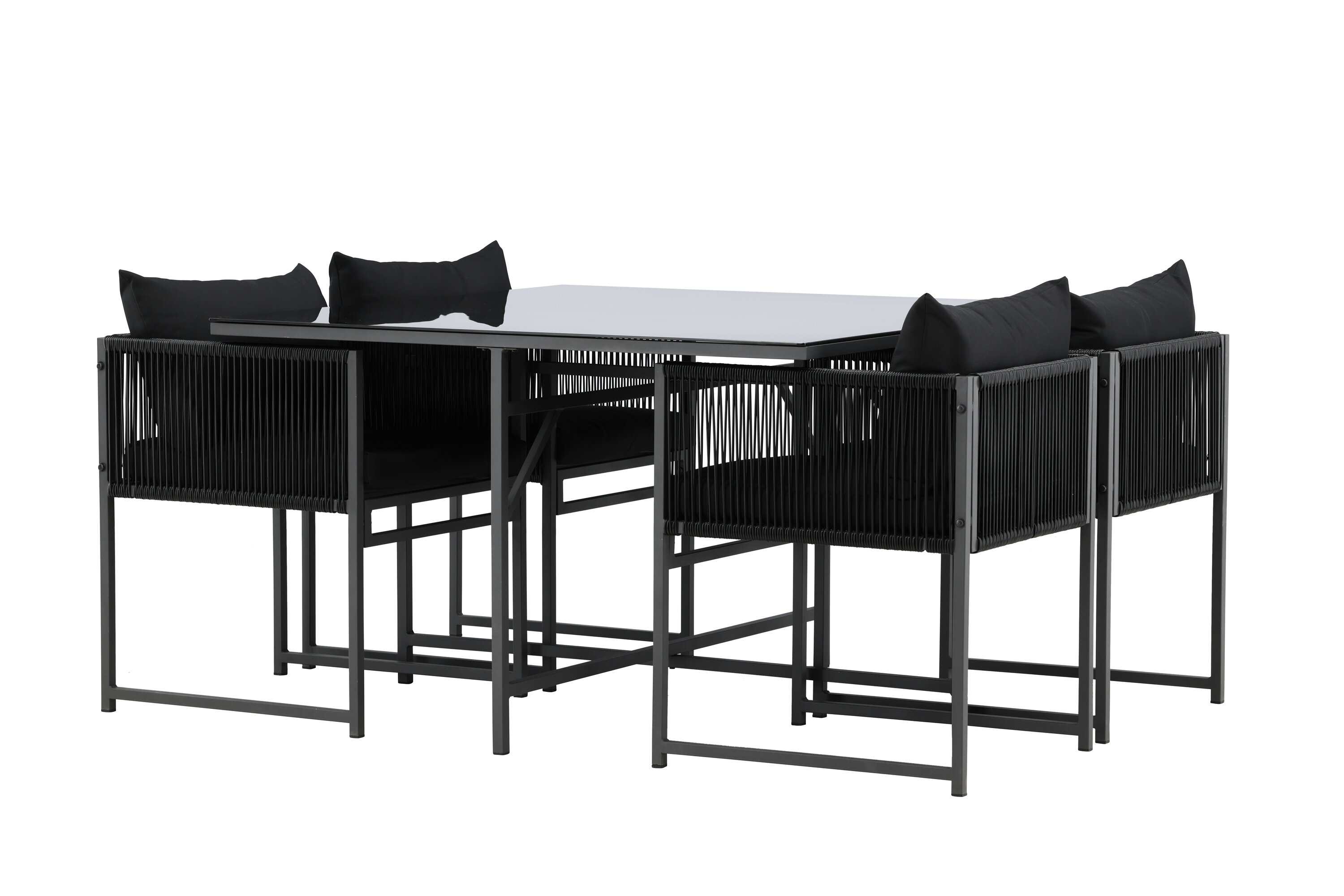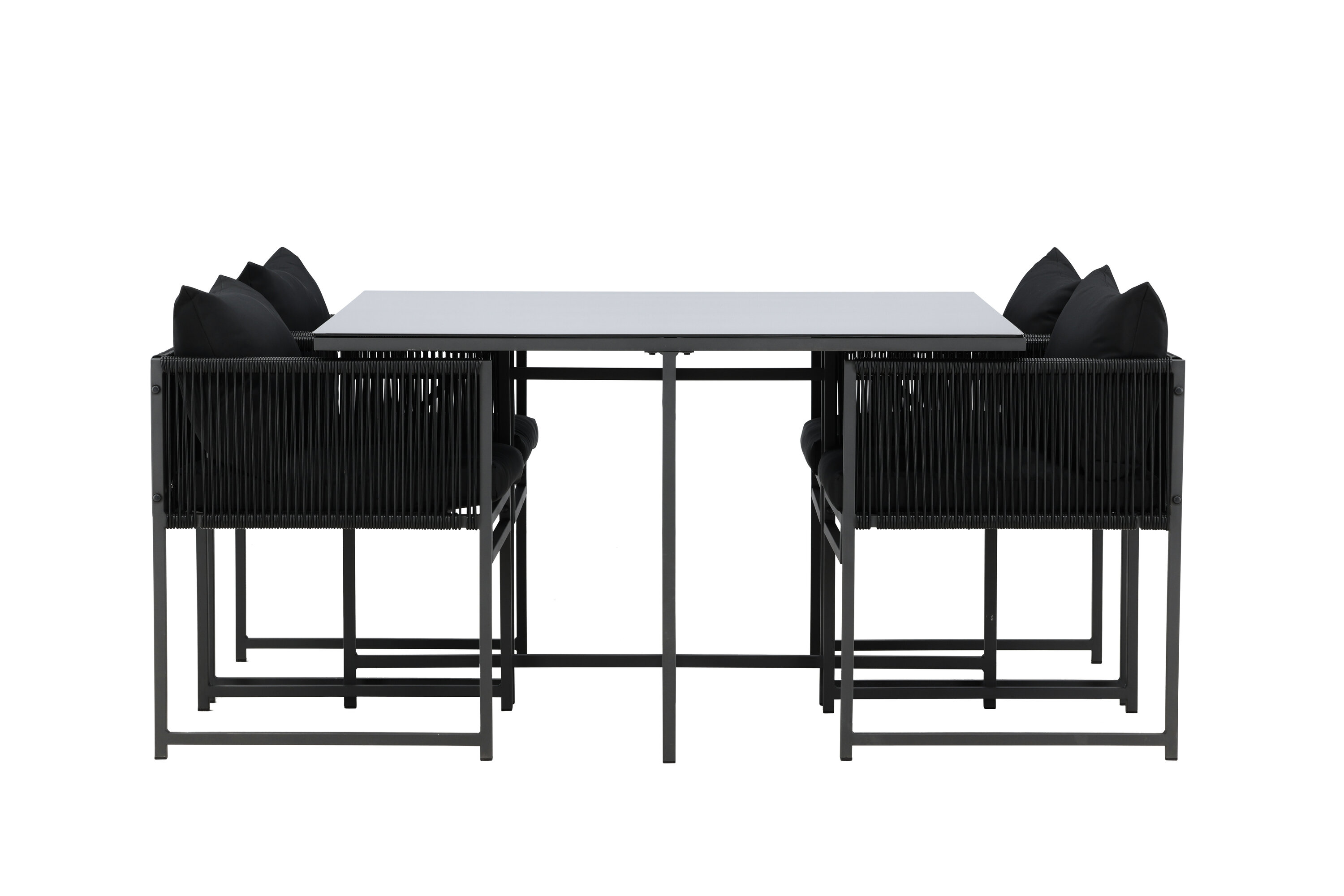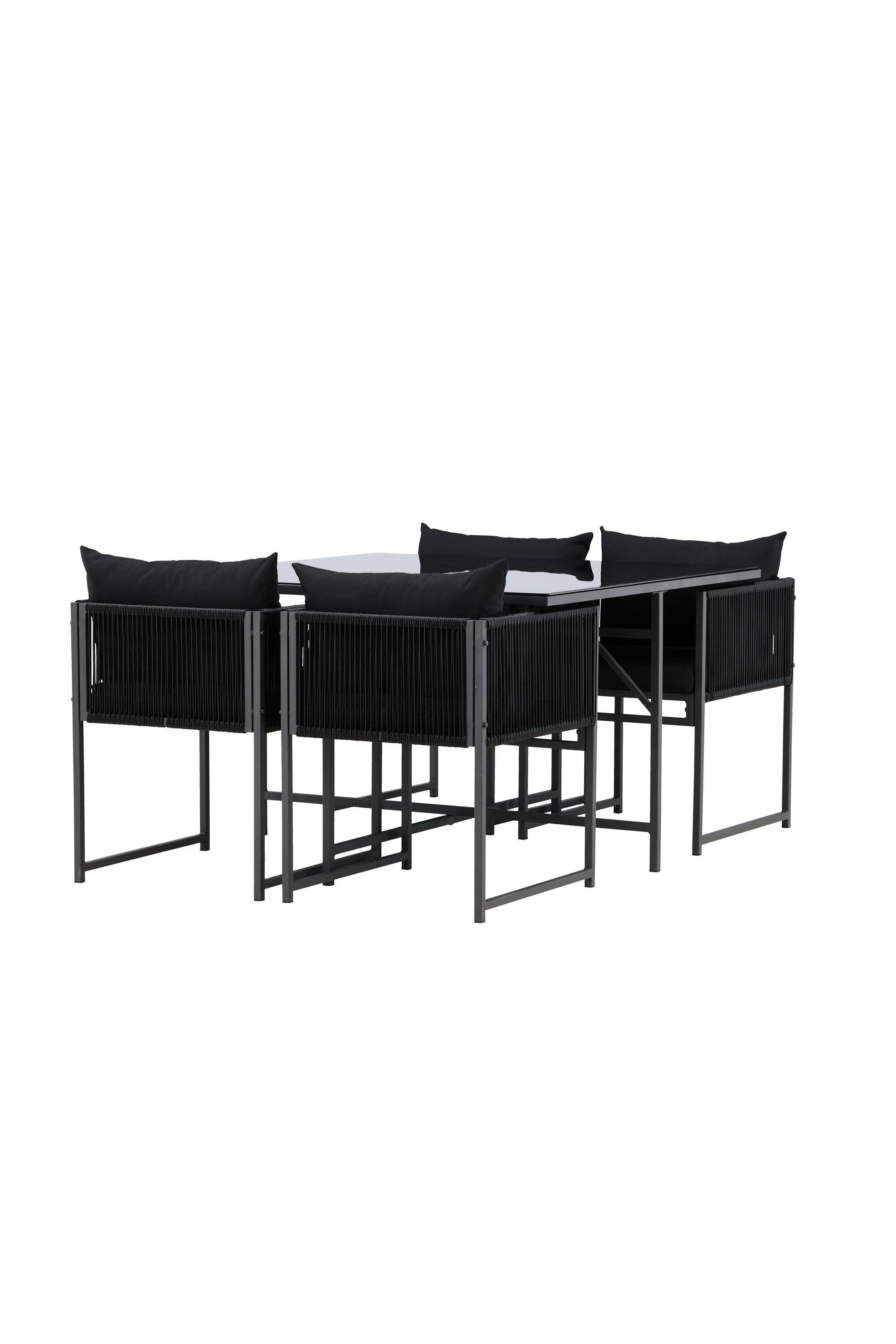 Noto on söögikomplekt, mis lisab teie terrassile elegantset hõngu ja loob ideaalse koha nauditavateks õhtusöökideks. See elegantne must komplekt koosneb suurest klaasist lauast ja neljast mugavast söögitoolist, mis ühendavad esteetika ja funktsionaalsuse. Toolidel on tugev terasraam ning käetugede külgedel on stiilsed trossidetailid, mis lisavad unikaalset ja kaasaegset iseloomu.