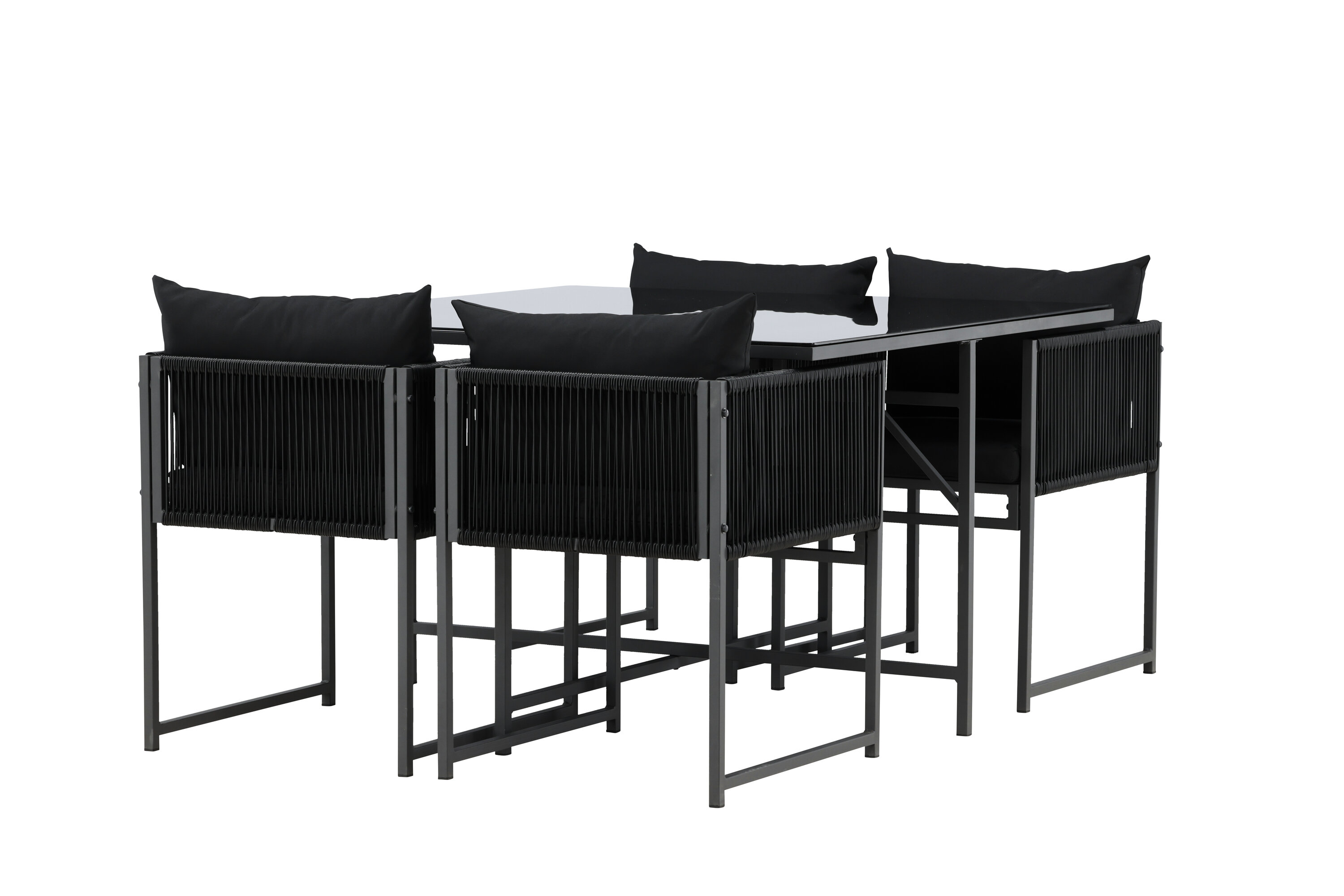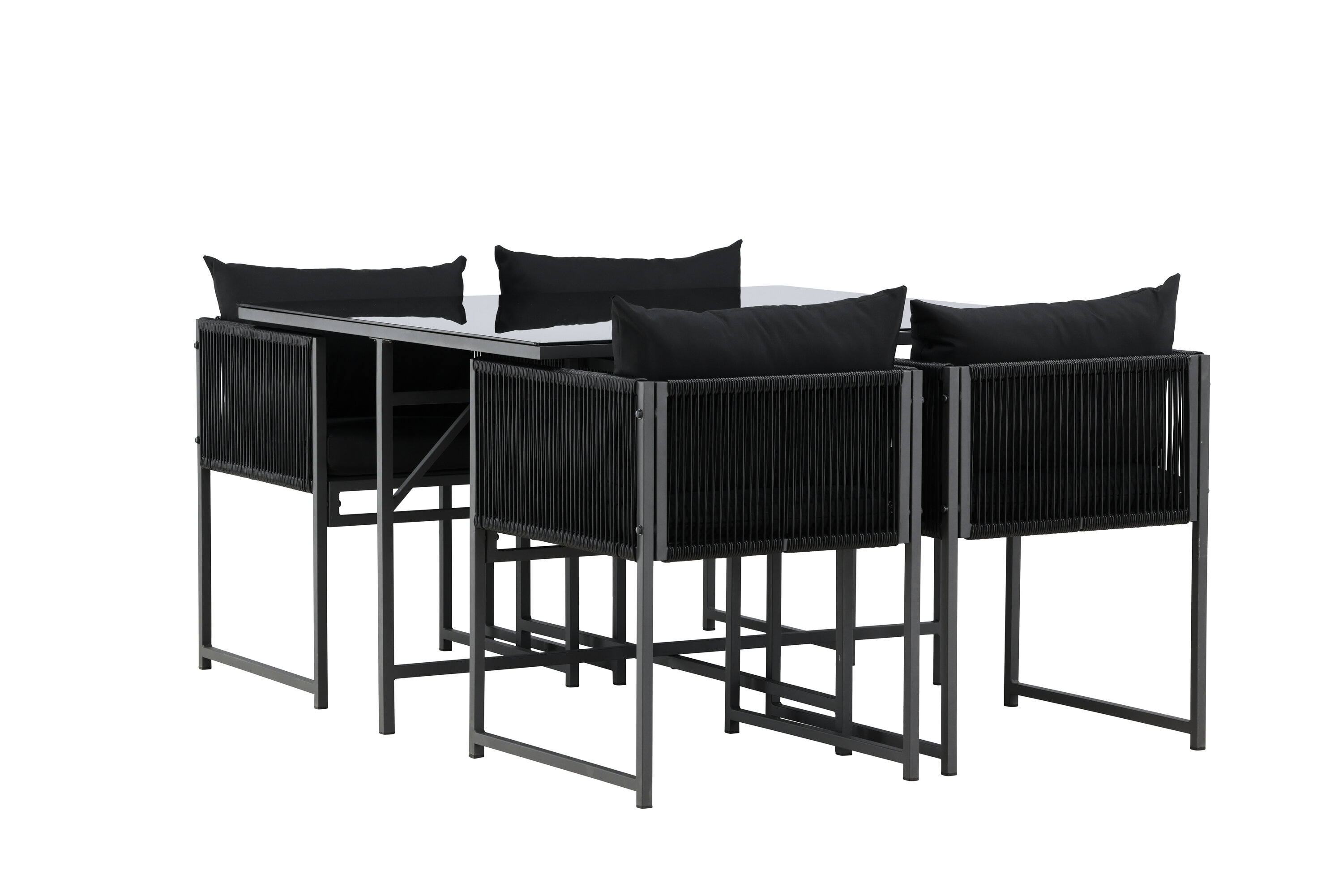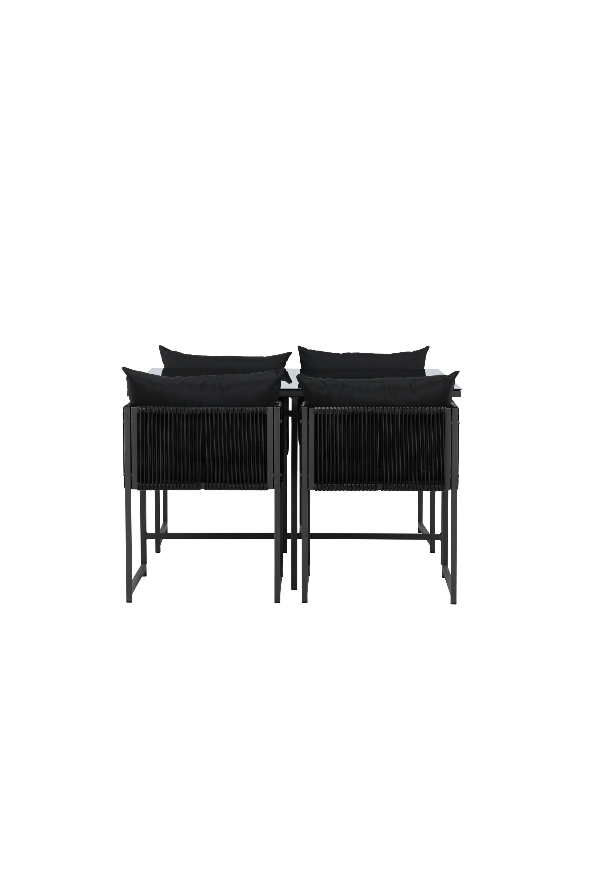 Noto on söögikomplekt, mis lisab teie terrassile elegantset hõngu ja loob ideaalse koha nauditavateks õhtusöökideks. See elegantne must komplekt koosneb suurest klaasist lauast ja neljast mugavast söögitoolist, mis ühendavad esteetika ja funktsionaalsuse. Toolidel on tugev terasraam ning käetugede külgedel on stiilsed trossidetailid, mis lisavad unikaalset ja kaasaegset iseloomu.