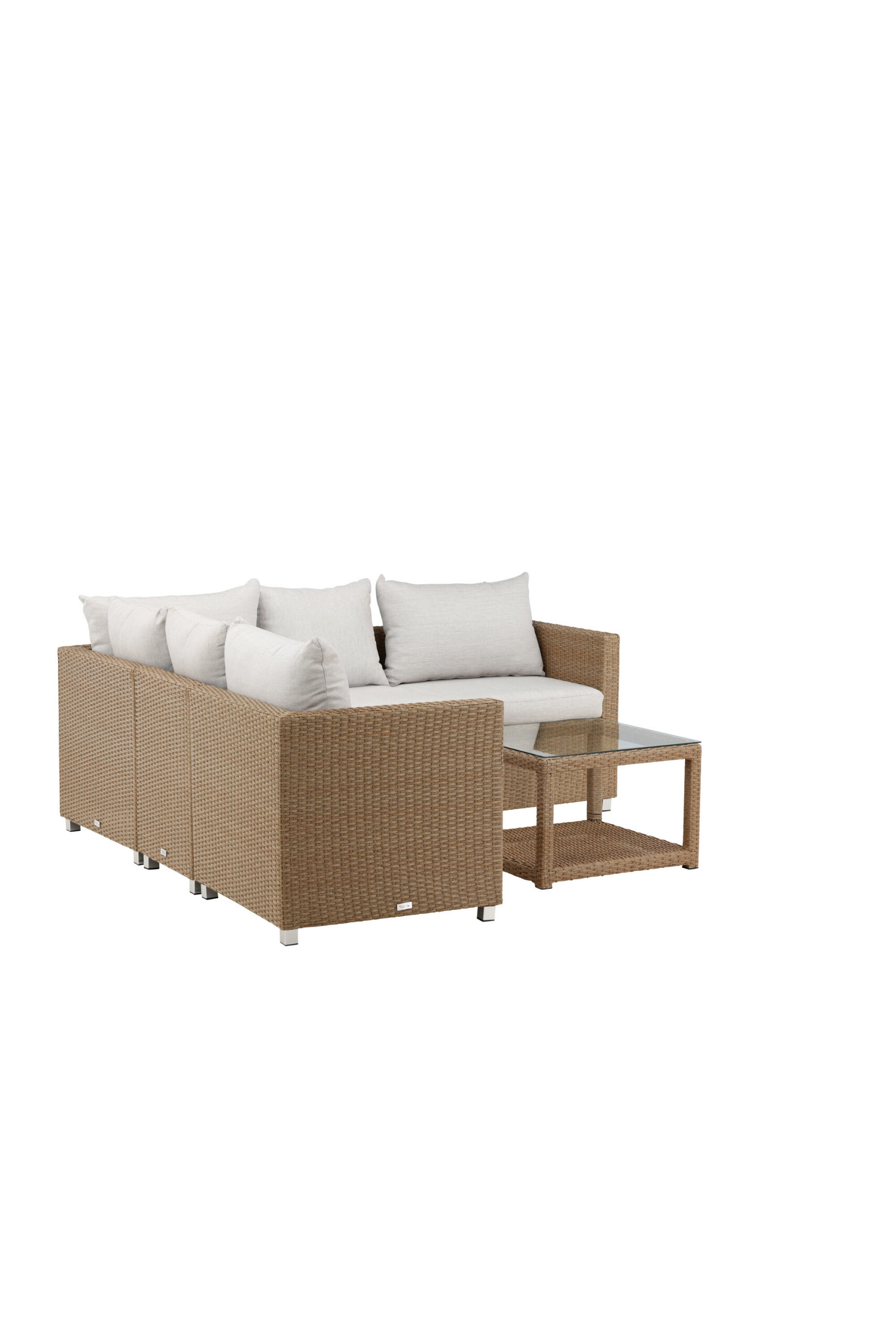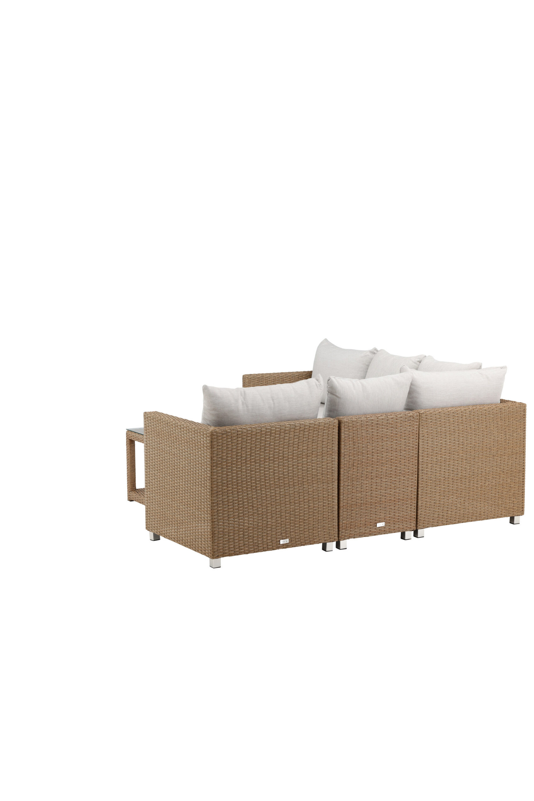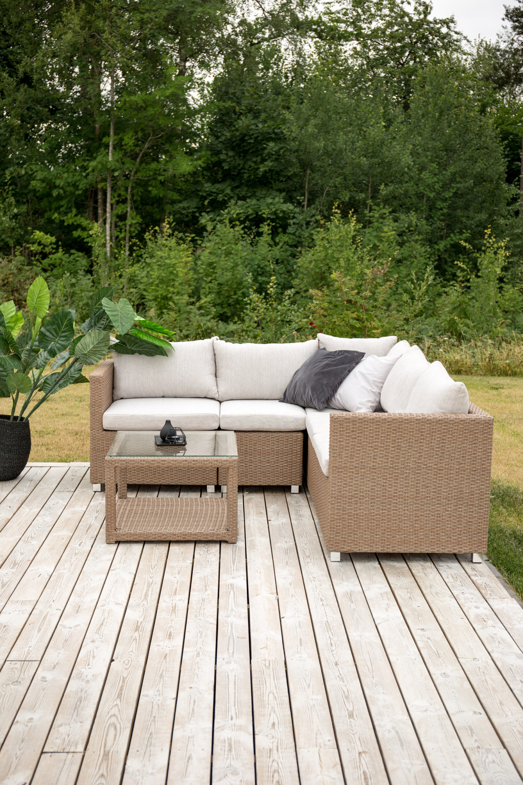 Vamos LoungeSet avaldab muljet oma luksusliku, pingevaba disaini ja sirgete põhjamaiste vormidega. See moodsa disainiga diivanirühm keskendub teie siseõue või terrassi heale mugavusele. Diivanigrupp koosneb nelja istmega nurgadiivanist ja nurgaosast. Sealhulgas valged pehmed padjad ja alumine diivanilaud koos reljeefse riiuli ja stiilse klaasist lauaplaadiga. Salongikomplekt on valmistatud metallraamist ja naturaalsest värvilisest kunstrotangist. Moodulid on saadaval ostmiseks. Olge sel suvel valmis silmapaistvaks ööeluks!