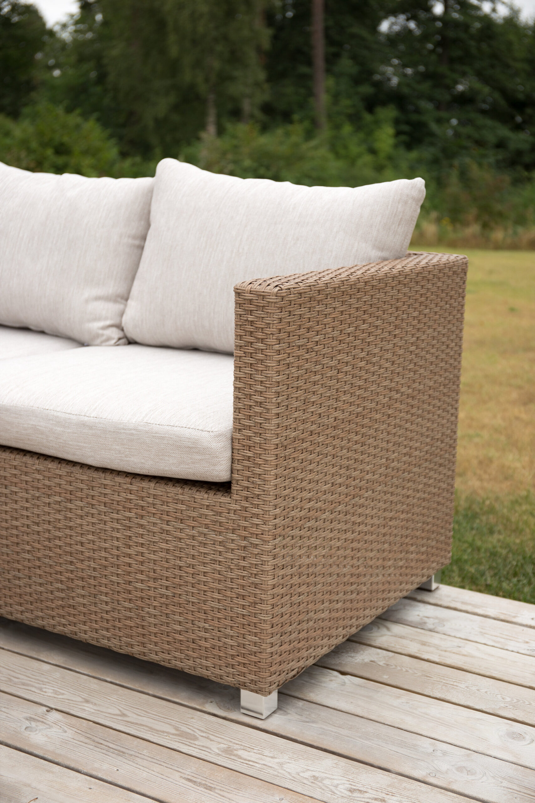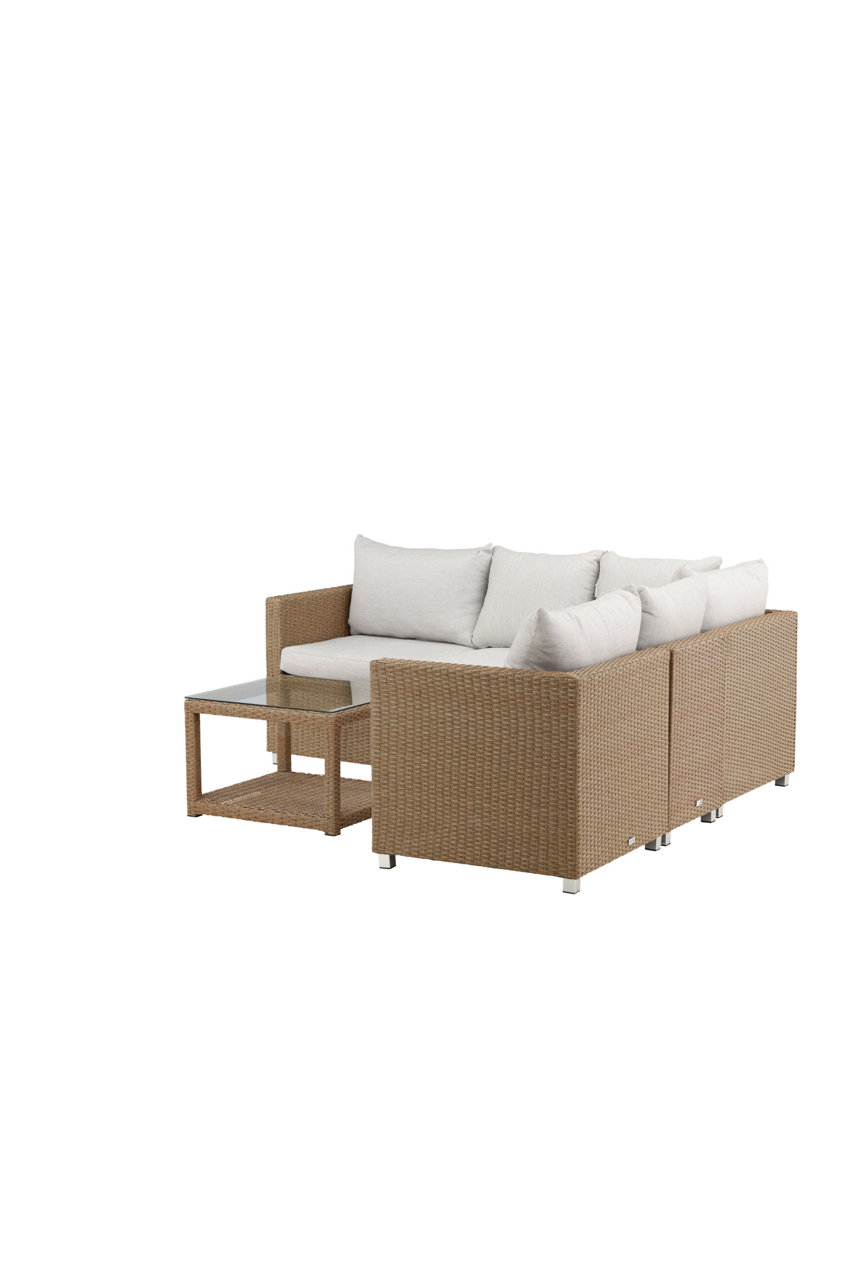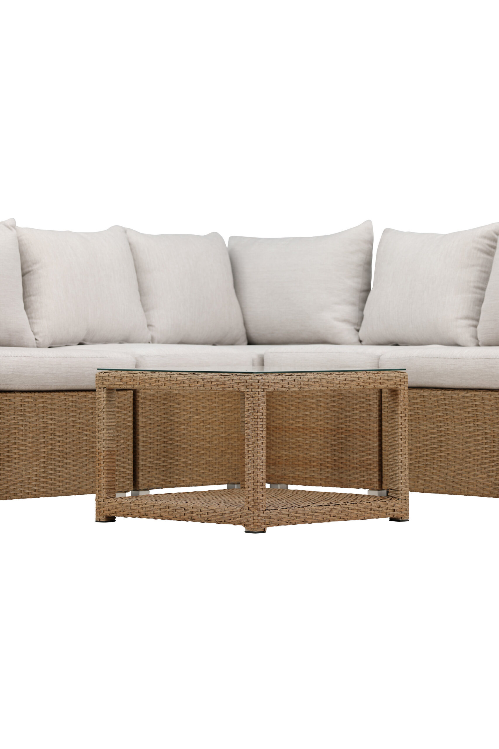 Vamos LoungeSet avaldab muljet oma luksusliku, pingevaba disaini ja sirgete põhjamaiste vormidega. See moodsa disainiga diivanirühm keskendub teie siseõue või terrassi heale mugavusele. Diivanigrupp koosneb nelja istmega nurgadiivanist ja nurgaosast. Sealhulgas valged pehmed padjad ja alumine diivanilaud koos reljeefse riiuli ja stiilse klaasist lauaplaadiga. Salongikomplekt on valmistatud metallraamist ja naturaalsest värvilisest kunstrotangist. Moodulid on saadaval ostmiseks. Olge sel suvel valmis silmapaistvaks ööeluks!