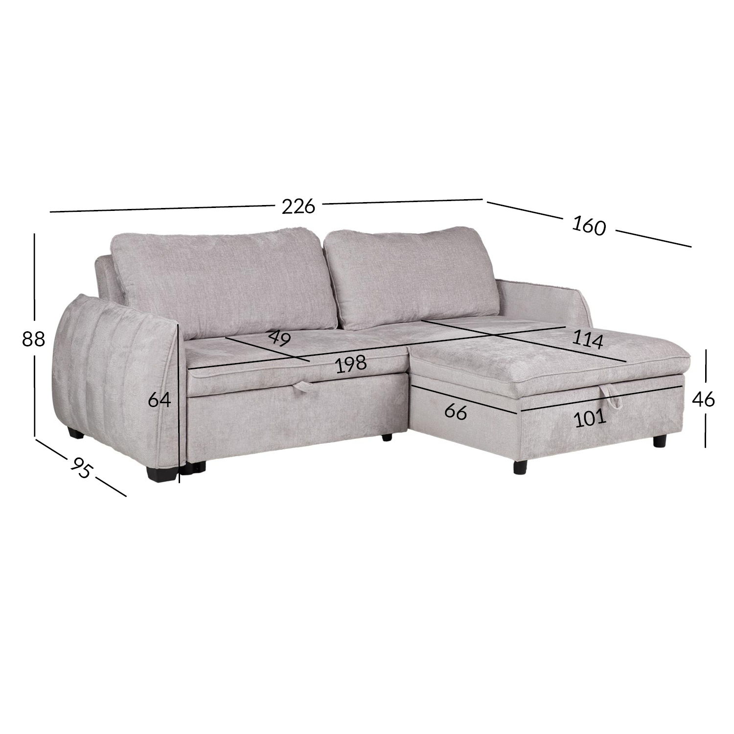 Diivani üldmõõdud: 226×95/160x88cm. Istme laius 198cm, istme sügavus 49(67)/114(132)cm. Istme kõrgus 46cm. Käetoe kõrgus maast 64cm.