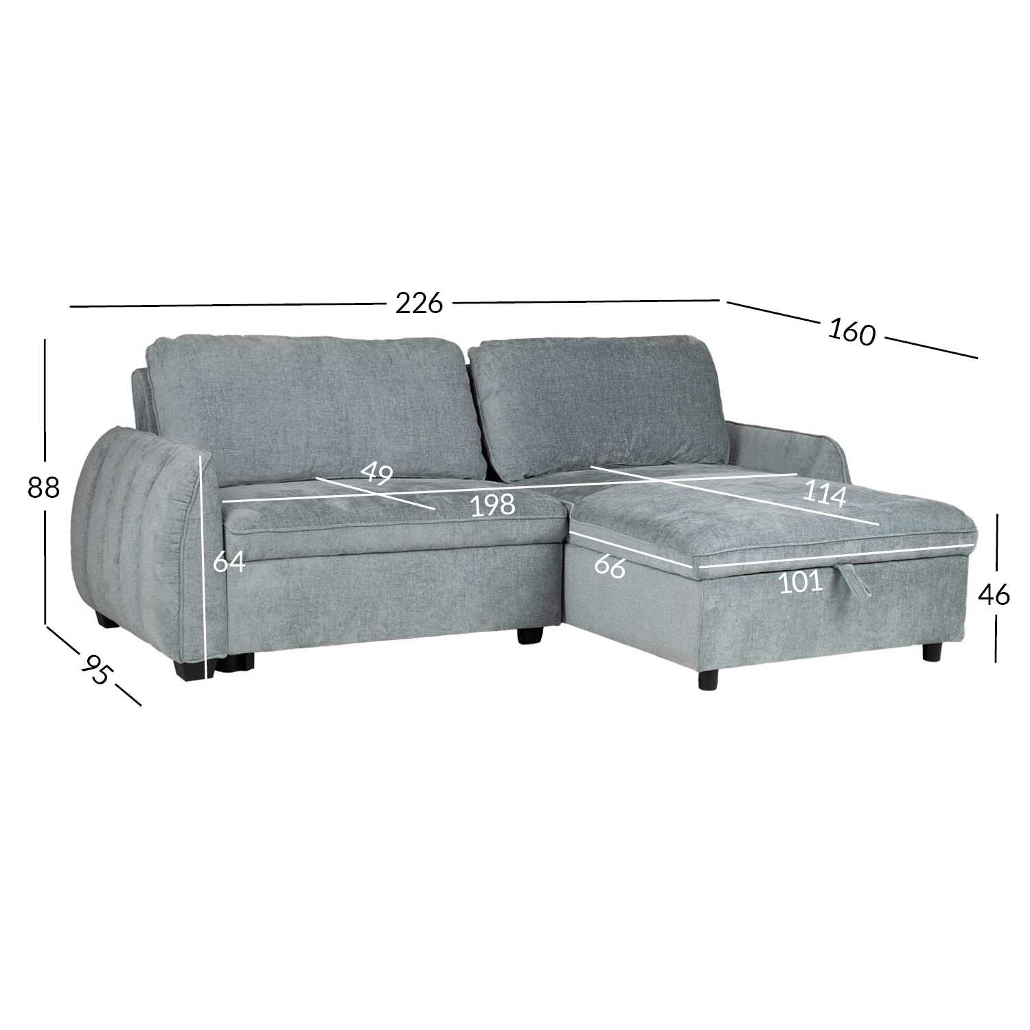 Diivani üldmõõdud: 226×95/160x88cm. Istme laius 198cm, istme sügavus 49(67)/114(132)cm. Istme kõrgus 46cm. Käetoe kõrgus maast 64cm.