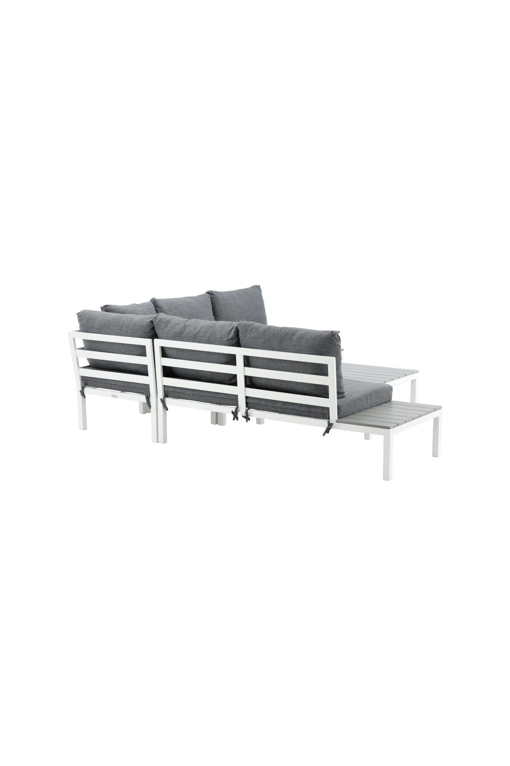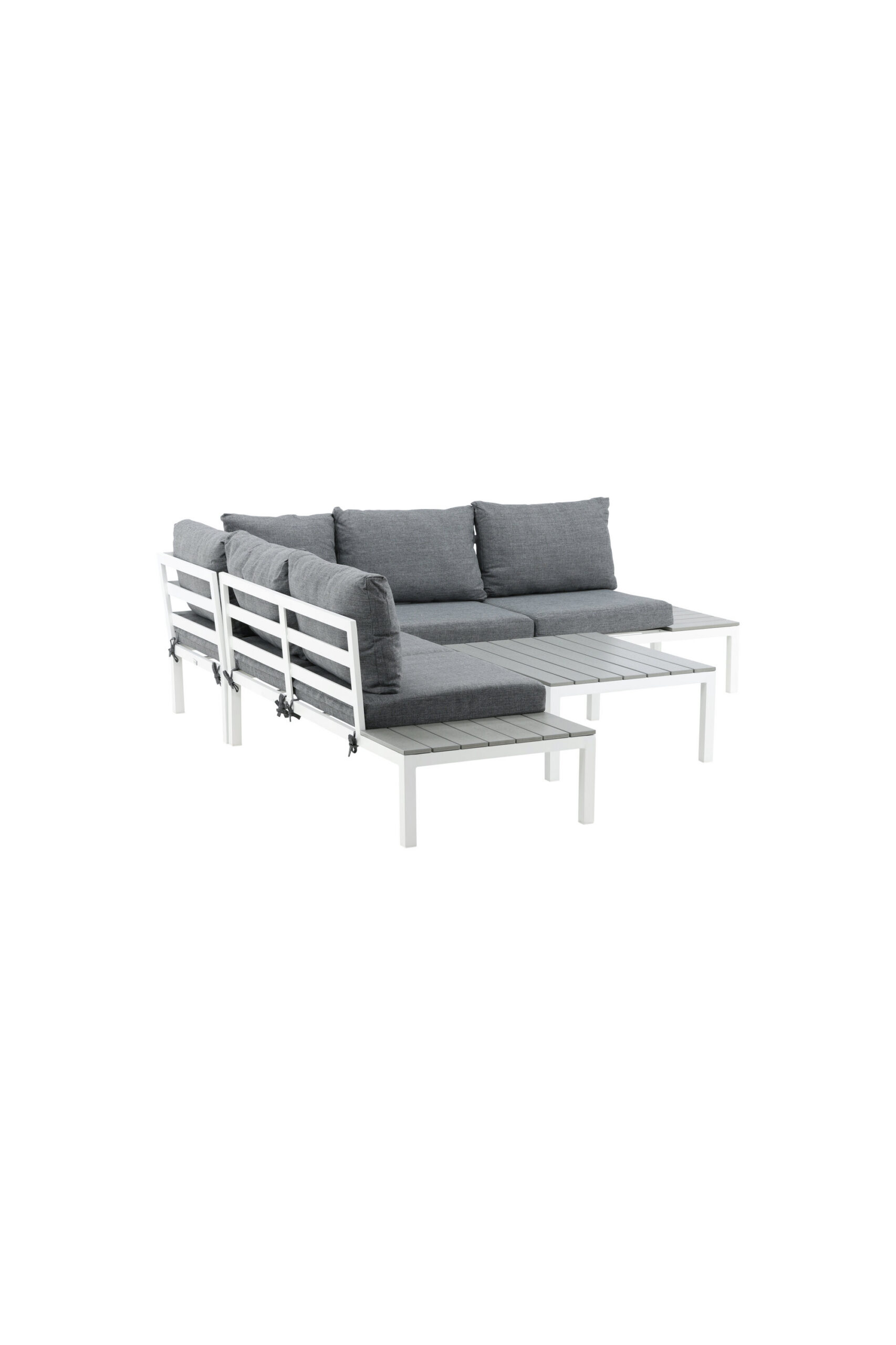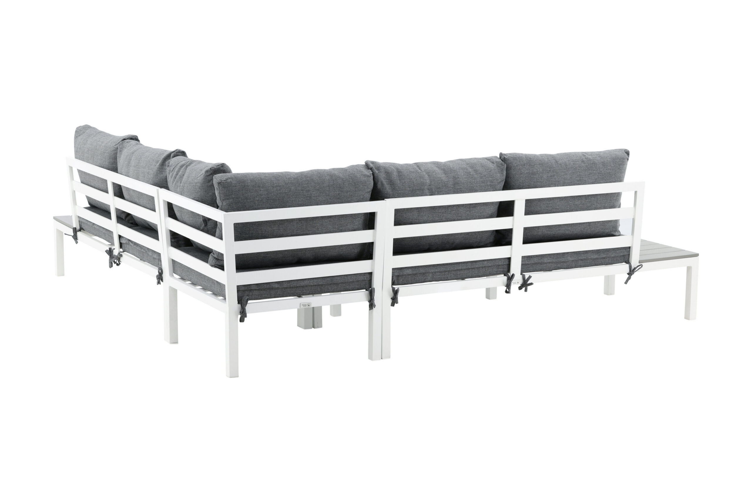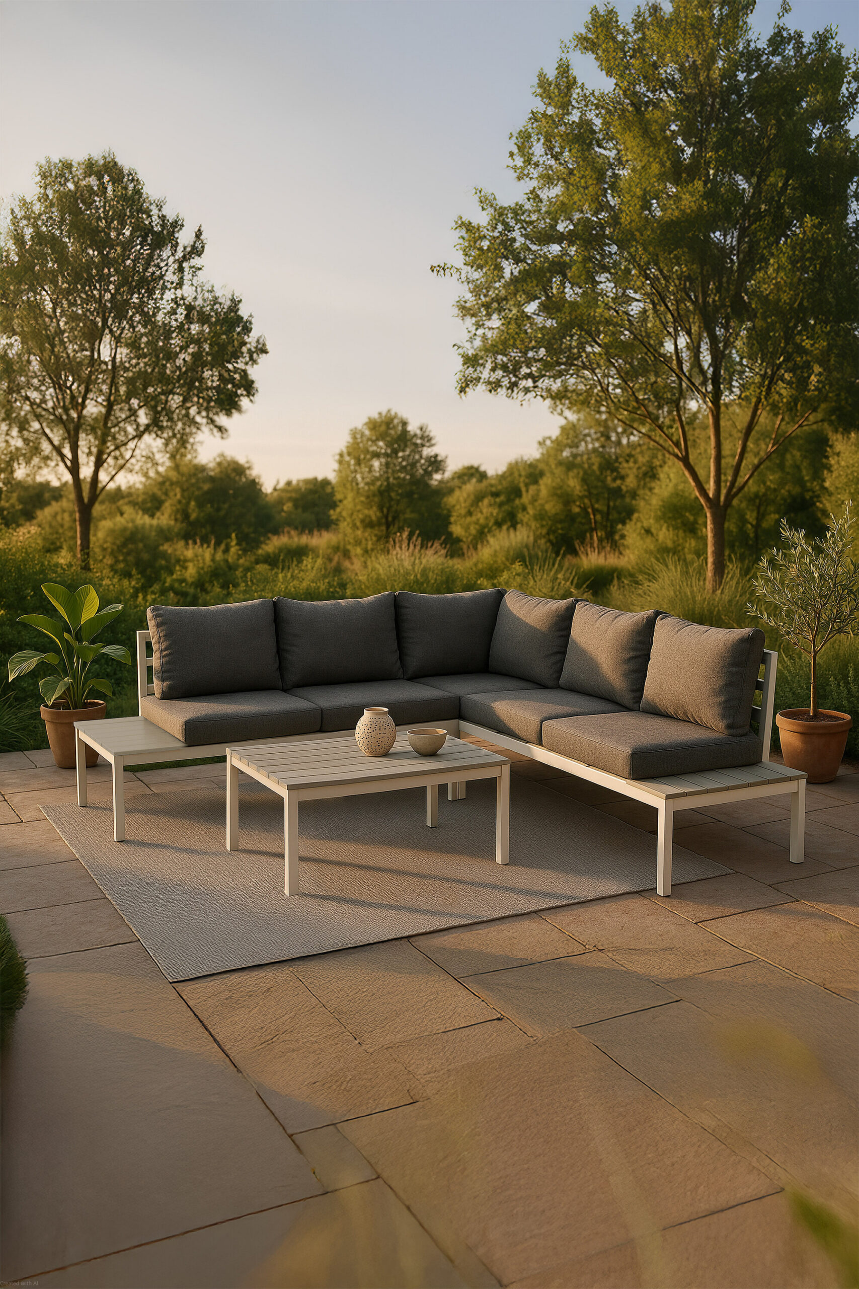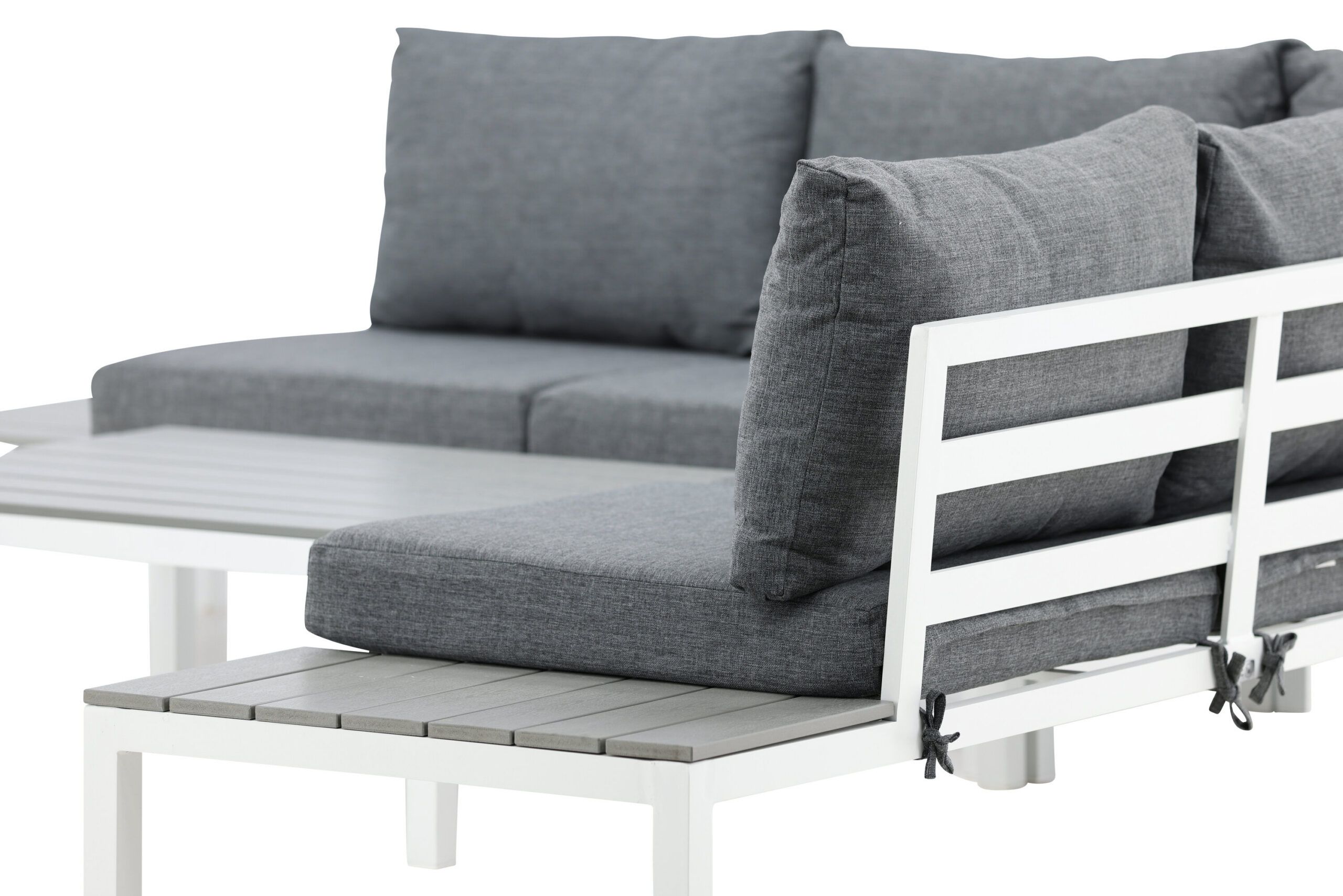 Stiilne, nutikas ja vastupidav – ideaalne diivanirühm terrassile sel suvel! Odense on klassikaline ja lihtne nurgagrupp maitsvas salongikujunduses valge alumiiniumraami ja halli polüpuidust pinnaga. Diivani mõlemal küljel on väikesed abilauad, mis sobivad ideaalselt täiendavaks reljeefseks pinnaks. Diivanigrupp sobib kasutamiseks õues ja sobib nii aeda kui ka rõdu nurka. Kaasas on hallid padjad, mis muudavad rühma stiilseks ja mugavaks!