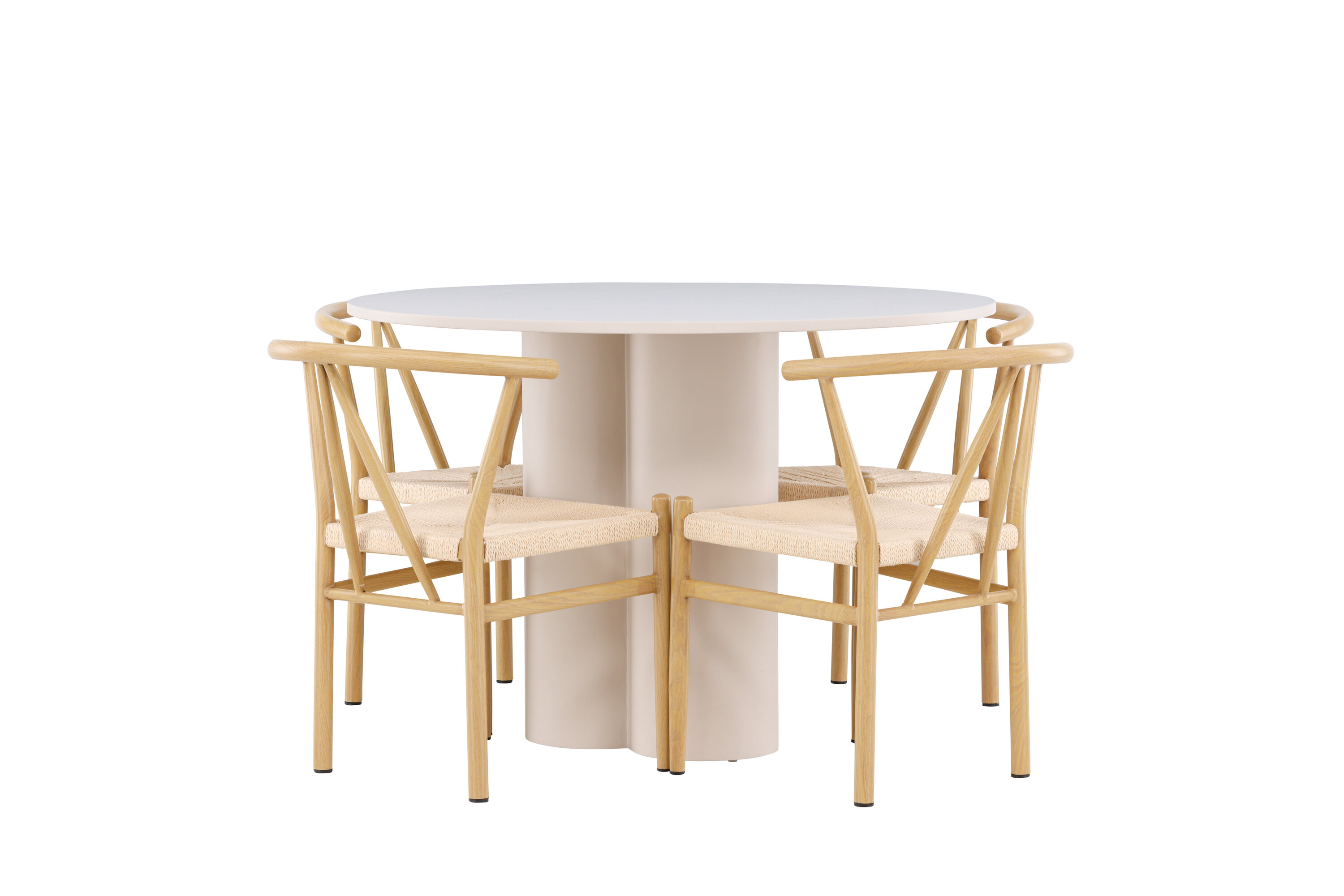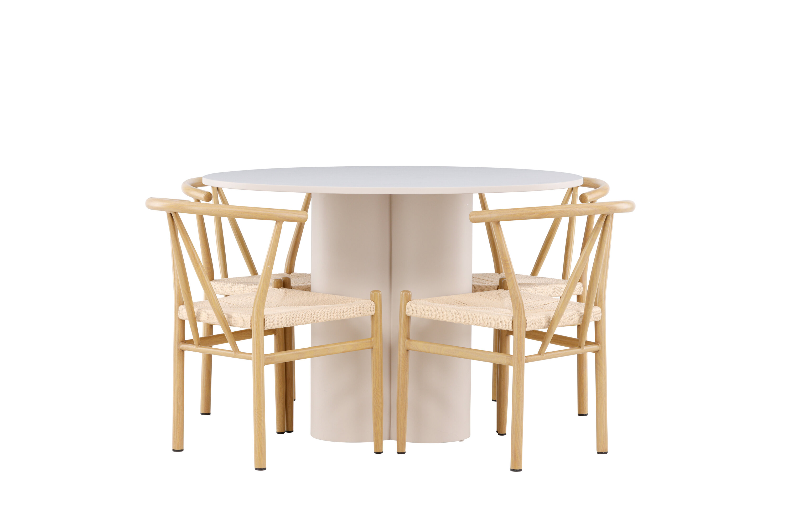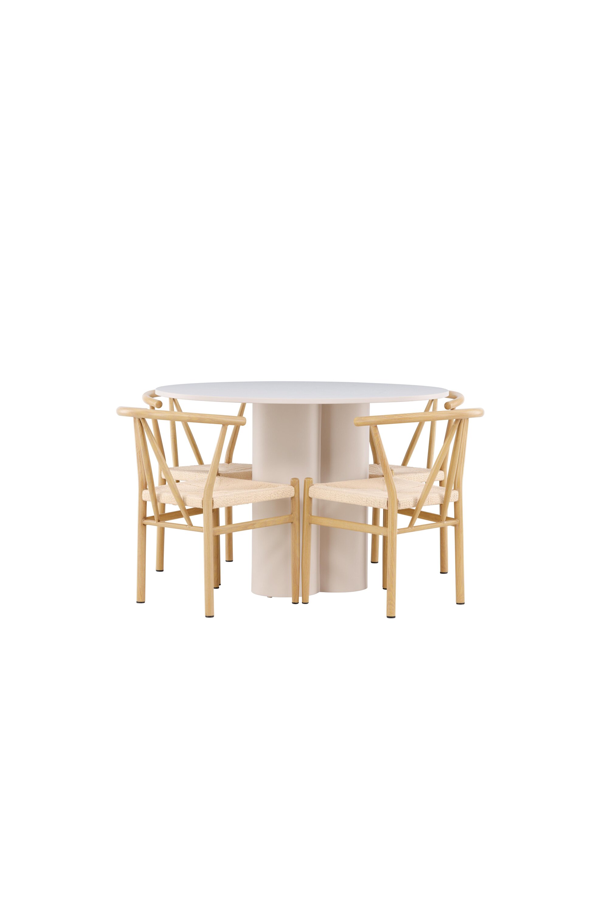 Looge elegantne ja kutsuv söögituba meie elegantse söögikomplektiga, mis ühendab Olivia laua võluvate Alfonsi toolidega. See söögikomplekt, mis sobib ideaalselt nii igapäevaseks õhtusöögiks kui ka pidulikuks sündmuseks, loob teie söögitoale kaasaegse ja harmoonilise atmosfääri. MDF-st valmistatud Olivia laual on helebeež värv, mis lisab teie söögitoale sooja ja kutsuva tunde. 110 cm läbimõõduga laud pakub rohkelt ruumi söögiks ja vestlusteks, ümar kuju loob aga tasakaalustatud ja sotsiaalse keskkonna. Laua vastupidav konstruktsioon tagab pikaajalise kasutuse ja stabiilsuse. Neli Alfonsi tooli täiendavad lauda suurepäraselt oma elegantsete beeži rotangist istmete ja klanitud beeži metalljalgadega. Need toolid pakuvad nii mugavust kui ka stiili, muutes need ideaalseks pikaks ja nauditavaks õhtusöögiks pere ja sõpradega. Nende kaasaegne disain koos kõrgete seljatugede ja naturaalsete materjalidega annab teie söögitoale rafineeritud ja kaasaegse ilme. See söögikomplekt on täiuslik kombinatsioon esteetikast ja funktsionaalsusest, mistõttu on see suurepärane valik neile, kes otsivad elegantset ja mugavat söögituba. Täiustage oma söögituba Olivia laua ja Alfonsi toolide kombinatsiooniga ning looge koht, kus jagatakse mälestusi ja rõõmu.