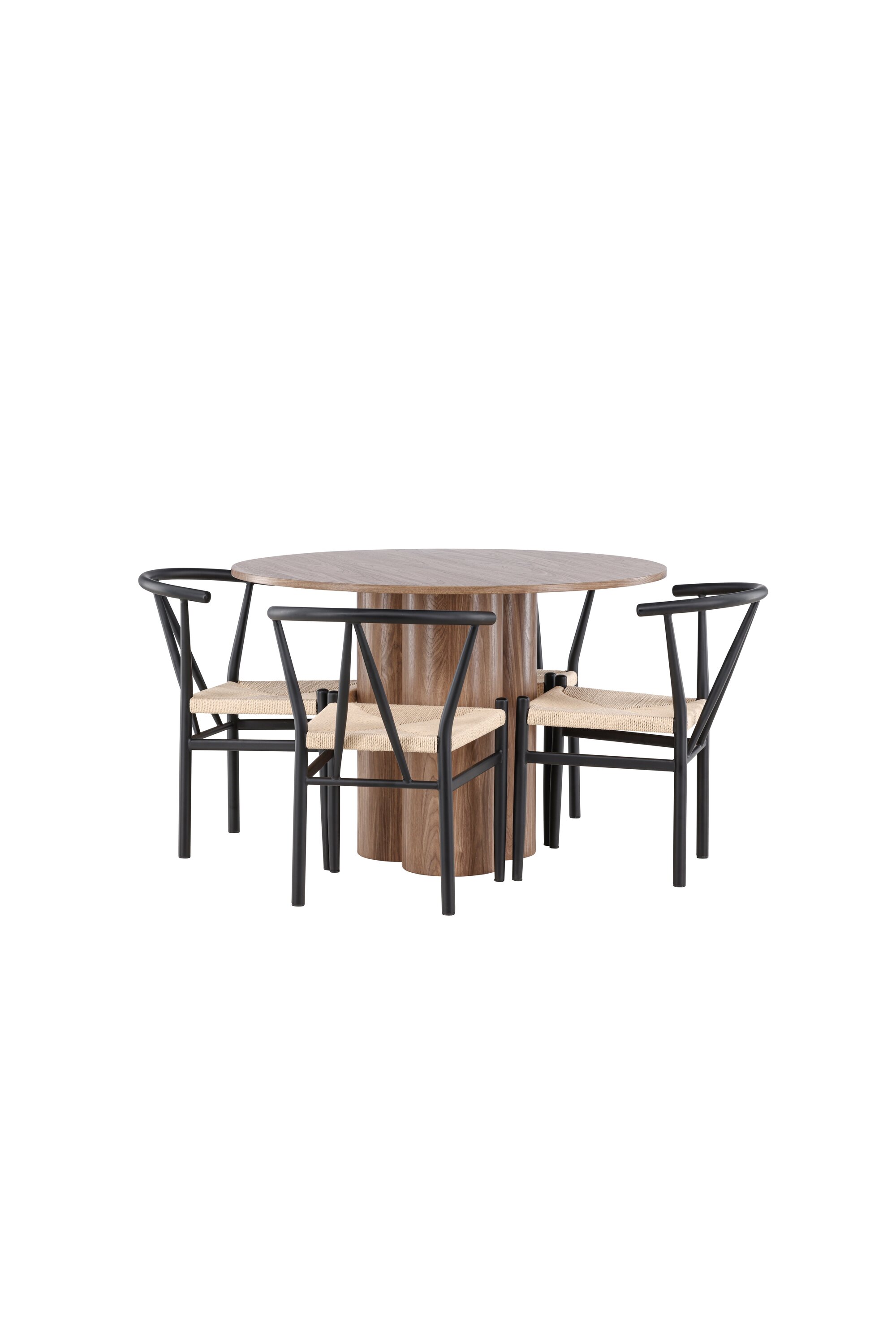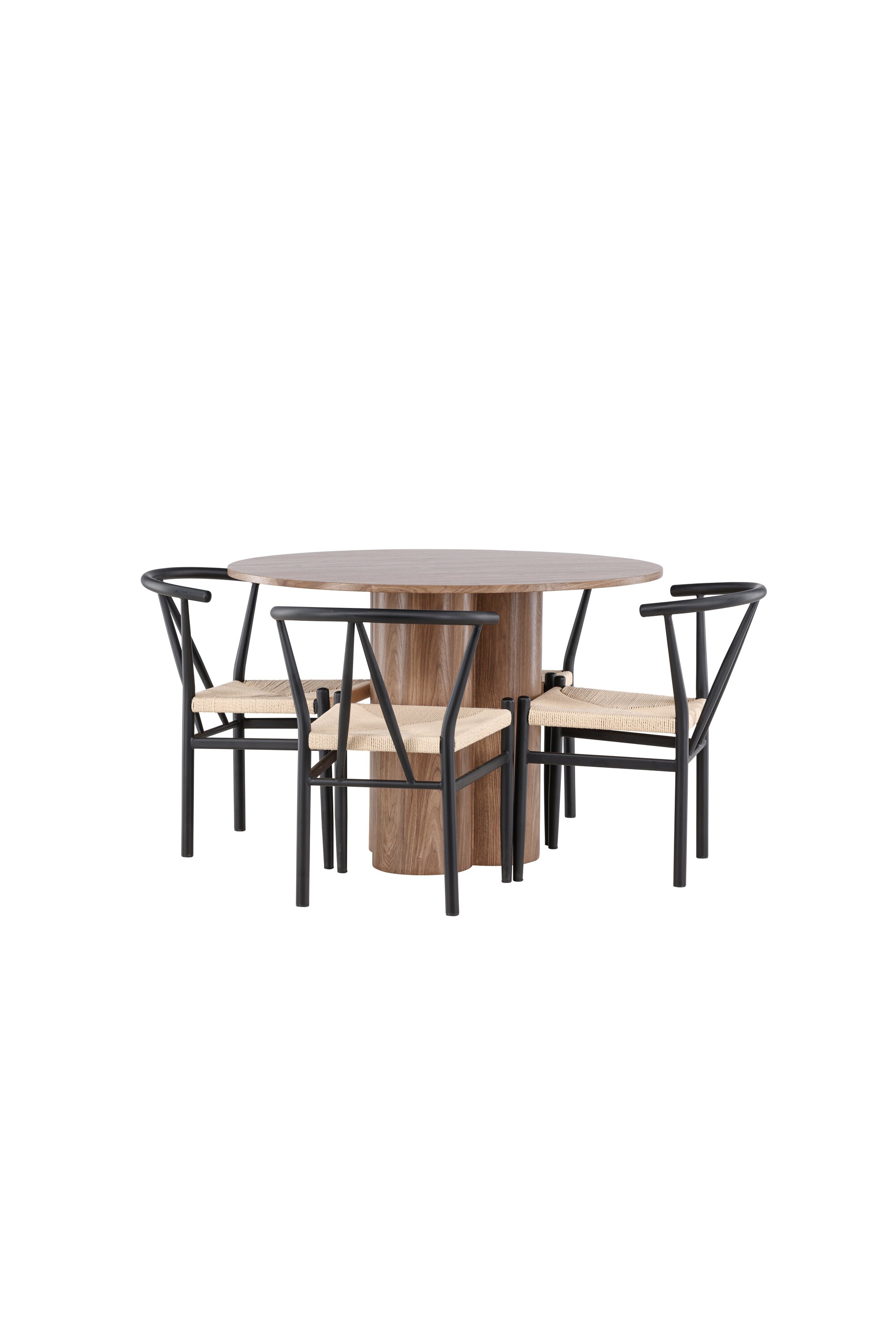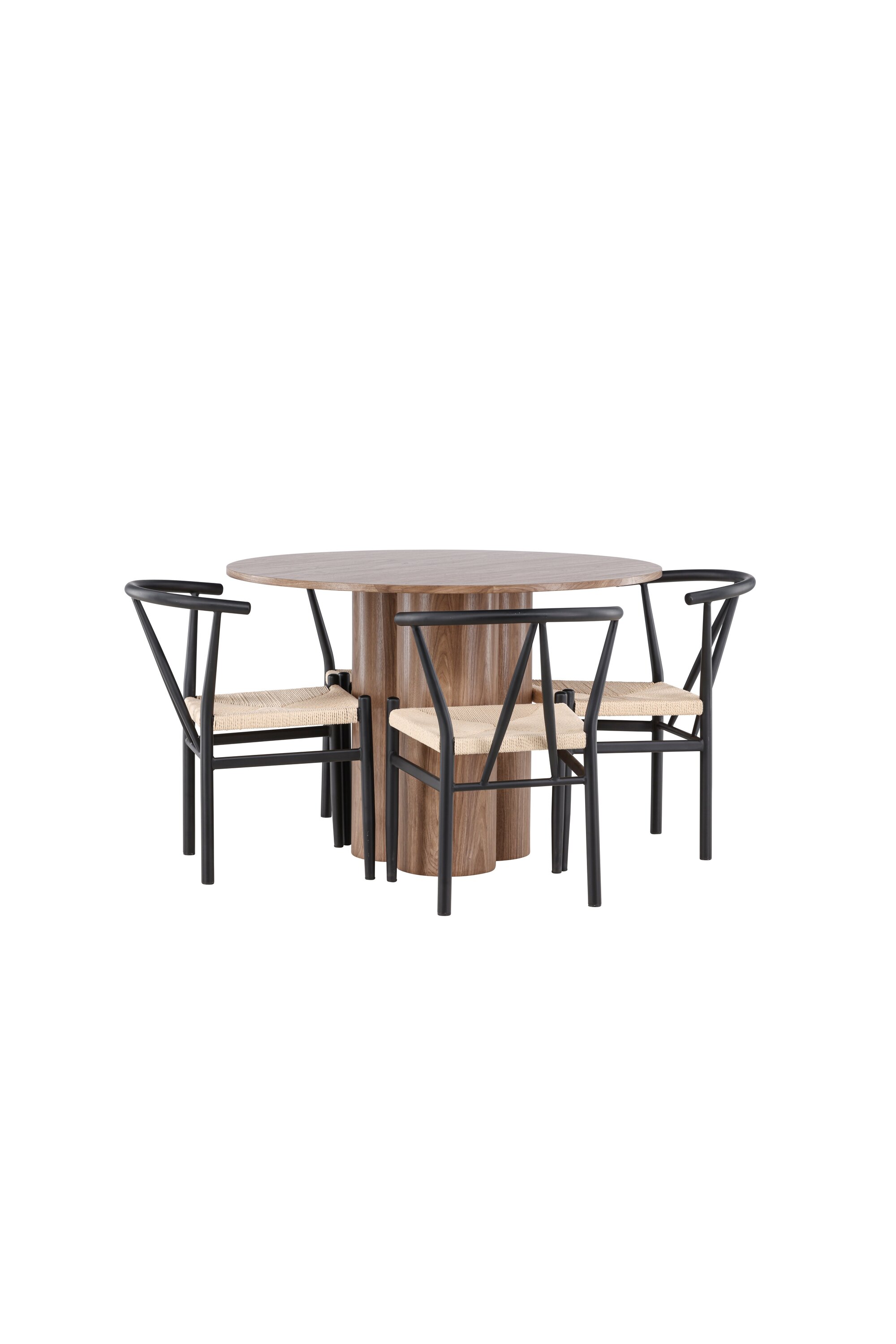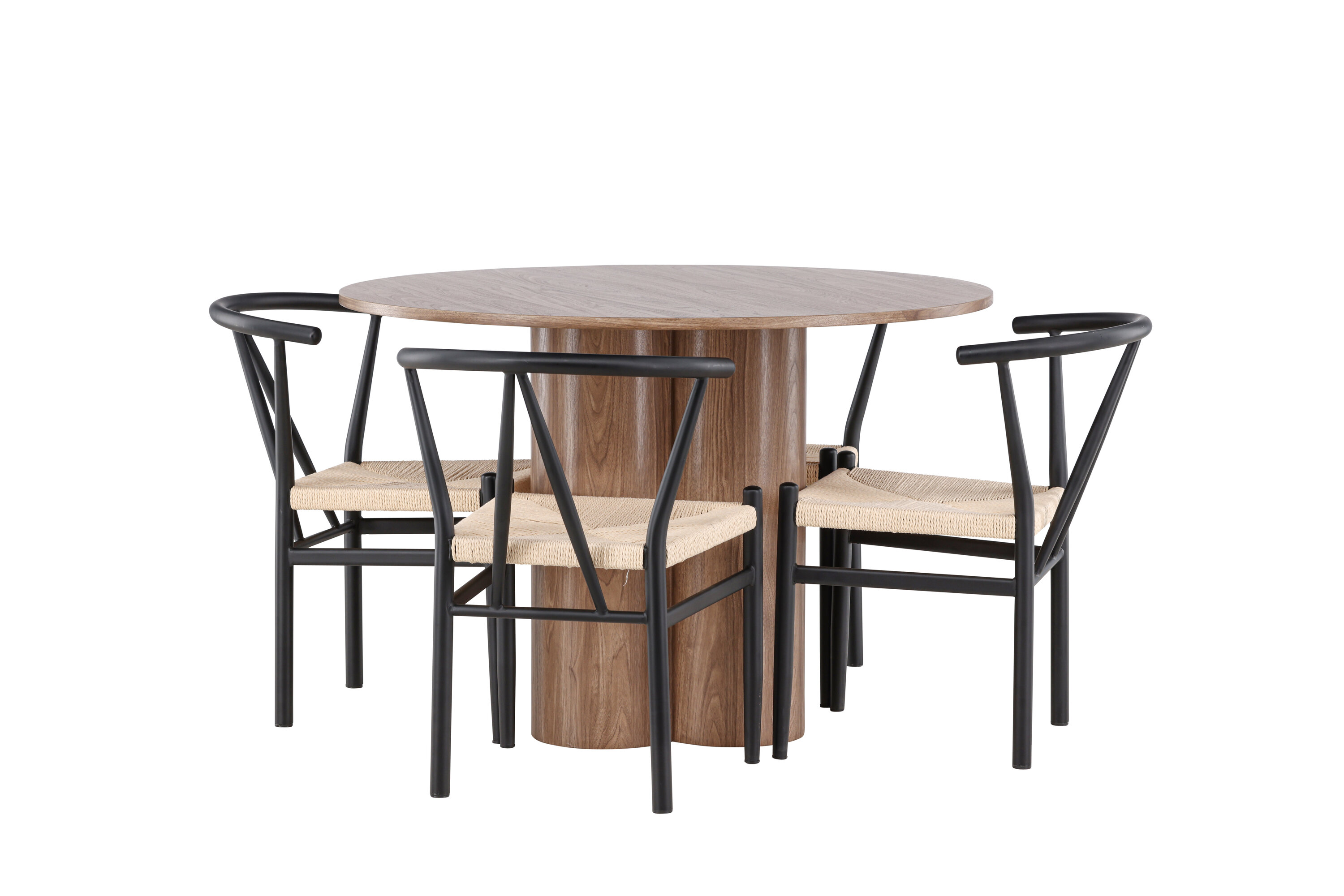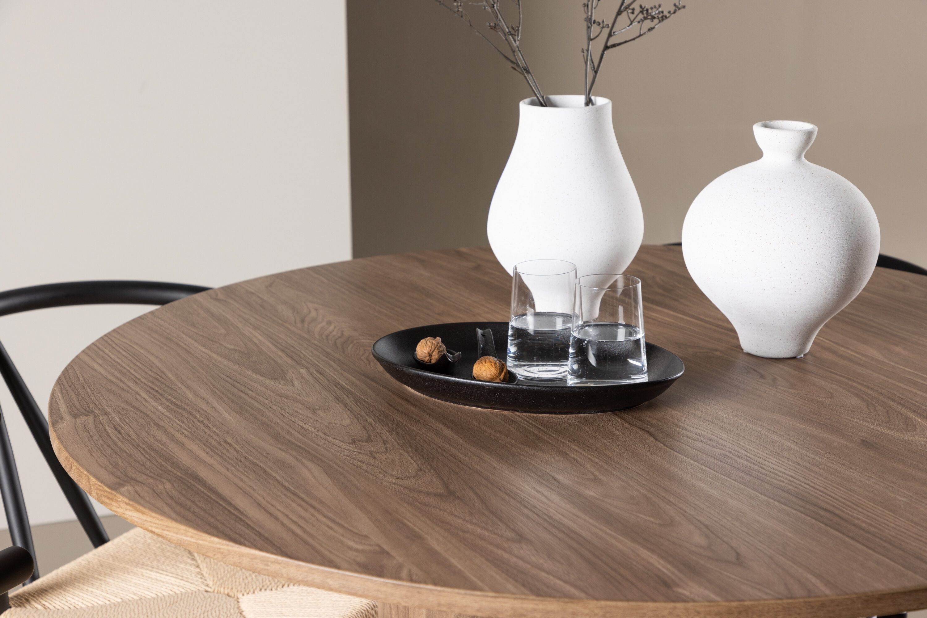 Looge stiilne ja kutsuv söögituba meie elegantse söögikomplektiga, mis sisaldab Olivia lauda ja Alfonsi toole. See söögikomplekt on täiuslik segu moodsast disainist ja ajatust elegantsist, muutes selle ideaalseks nii igapäevaseks söömiseks kui ka erilistel puhkudel. Olivia laud on maitsekas ja ajatu lisa sinu kodule. Mocca värvi ja MDF konstruktsiooniga laud jätab sooja ja kutsuva mulje. Lauaplaadi läbimõõt on 110 cm, mistõttu on see piisavalt avar, et mahutada mugavalt neli inimest, samas on see piisavalt kompaktne, et mahutada väiksematesse ruumidesse. Olivia laud seisab kindlalt oma kindlal alusel ja seda on lihtne puhastada, muutes selle nii praktiliseks kui ka elegantseks. Alfonsi toolid täiendavad oma ainulaadse disainiga suurepäraselt Olivia lauda. Toolidel on beežist rotangist iste, mis pakub nii mugavust kui ka stiili. Mustad jalad loovad kauni kontrasti naturaalsele rotangist ja laua mocca värvile, aidates kaasa harmoonilise ja peene atmosfääri loomisele teie söögitoas. Need toolid on disainitud nii esteetikat kui ka ergonoomikat silmas pidades, mistõttu on neil mugav pikkade õhtusöökide ajal istuda. Olivia söögikomplekti ja Alfonsi toolidega saate tervikliku söögitoa, mis ühendab funktsionaalsuse elegantse disainiga. Sellest söögikomplektist saab kahtlemata teie kodu keskne punkt, kuhu pere ja sõbrad saavad koguneda veetlevate einete ja meeldiva seltskonna nautimiseks.