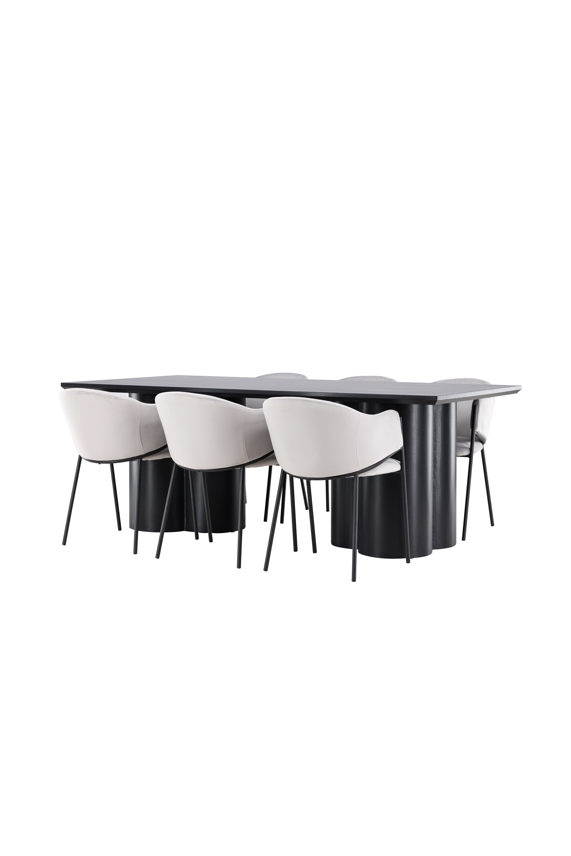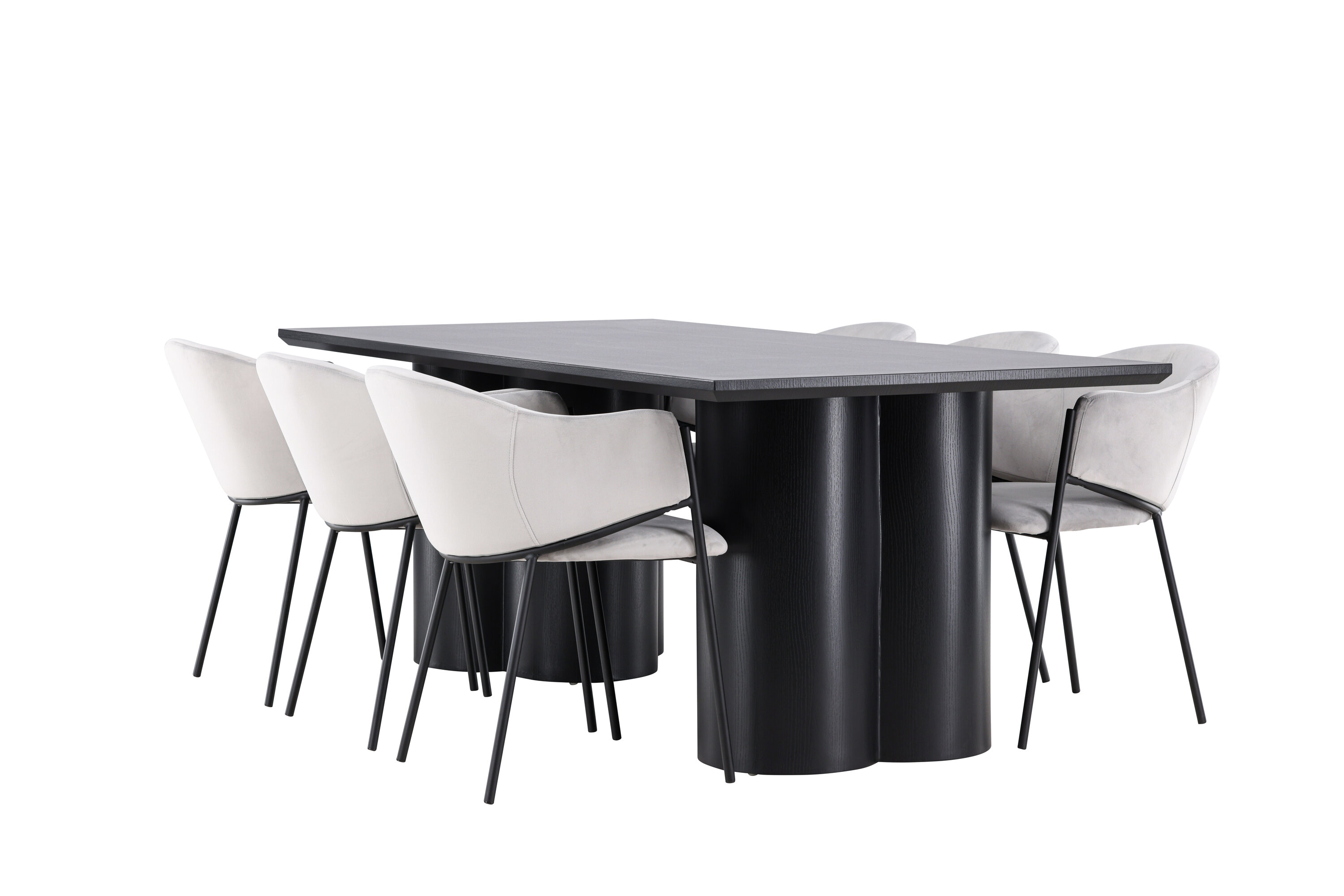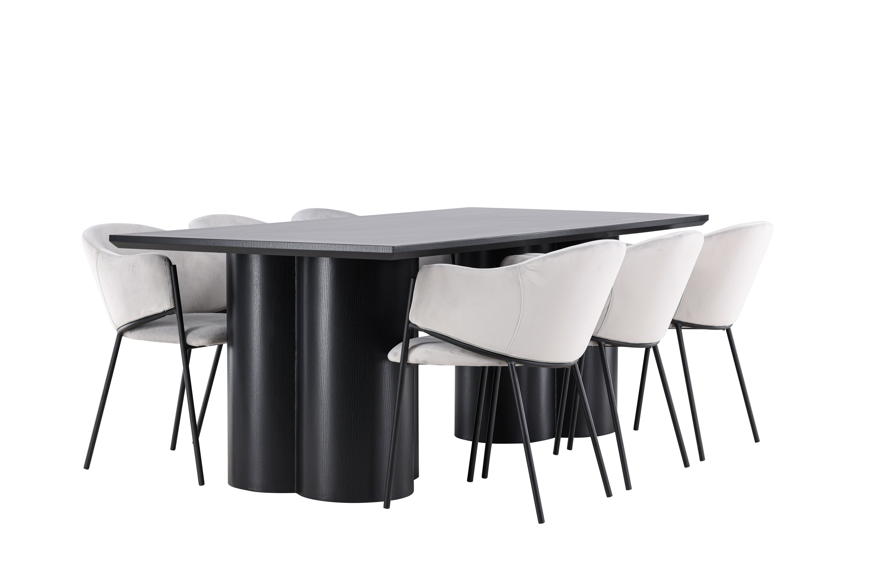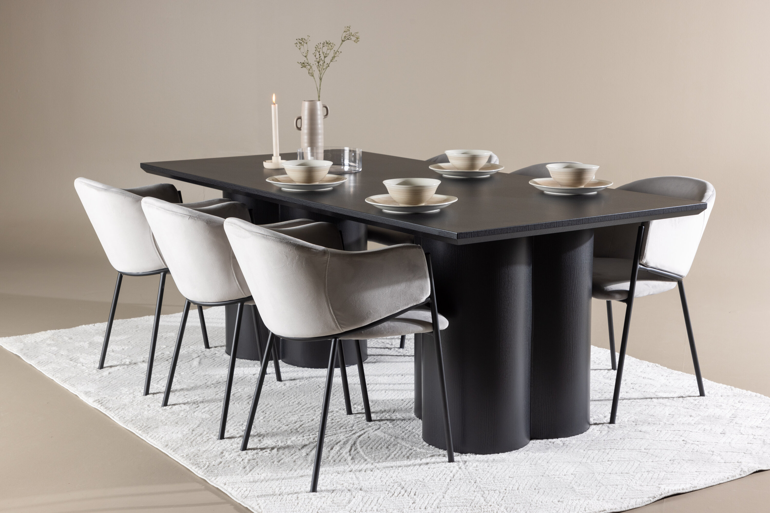 Avasta täiuslik söögikomplekt koos Evelina söögitooli ja Olivia söögilauaga – kombinatsioon, millest õhkub nii elegantsi kui ka funktsionaalsust sinu koju. Evelina söögitool on nostalgilise ilmega ja sama stiilne kui mugav, luues teie söögilaua ümber luksusliku fookuspunkti. Toolil on täielikult polsterdatud iste, millel on helehalli sametist ümar seljatugi ja dekoratiivne, minimalistlik mustast terasest jalaraam. Trendikindel disain avaldab muljet ja on kooskõlas viimaste trendidega. Istuge mugavalt ja nautige oma sööki nendes elegantsetes söögitoolides! Olivia söögilaud, mille mõõtmed on 210×100 cm, on ideaalne sõprade ja pere tervitamiseks ühistele einetele ja koosviibimistele. Viimistletud musta varjundiga laud õhkab elegantsi ja modernsust, samas kui selle tugev konstruktsioon tagab pikaajalise stabiilsuse. Andke oma söögitoale luksuse ja modernsuse tunne Evelina söögitooli ja Olivia söögilauaga. See söögikomplekt loob harmoonilise atmosfääri ja jätab püsiva mulje. See kombinatsioon sobib suurepäraselt nii igapäevasteks õhtusöökideks kui ka pidulikeks sündmusteks ning pakub tasakaalu ajatu disaini ja moodsate detailide vahel, muutes selle ideaalseks valikuks kõikideks seltskondlikeks koosviibimisteks.