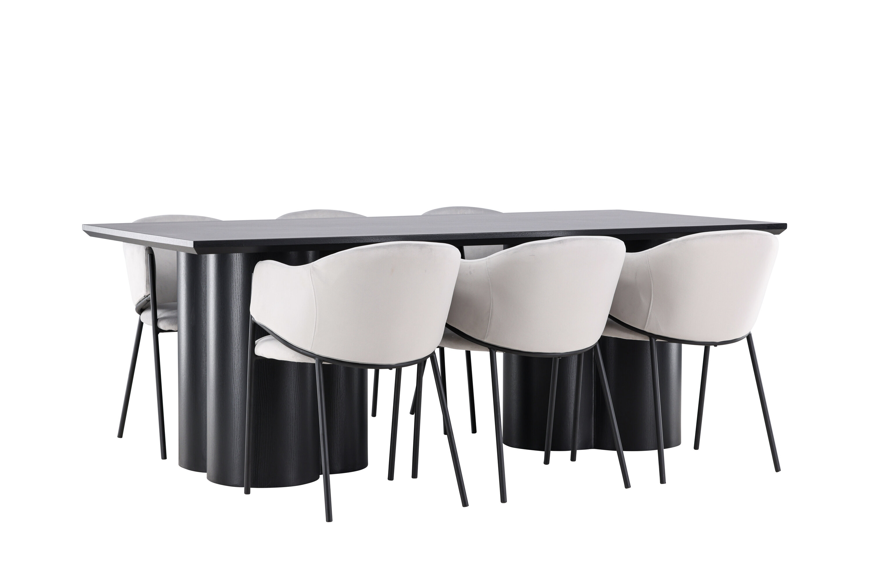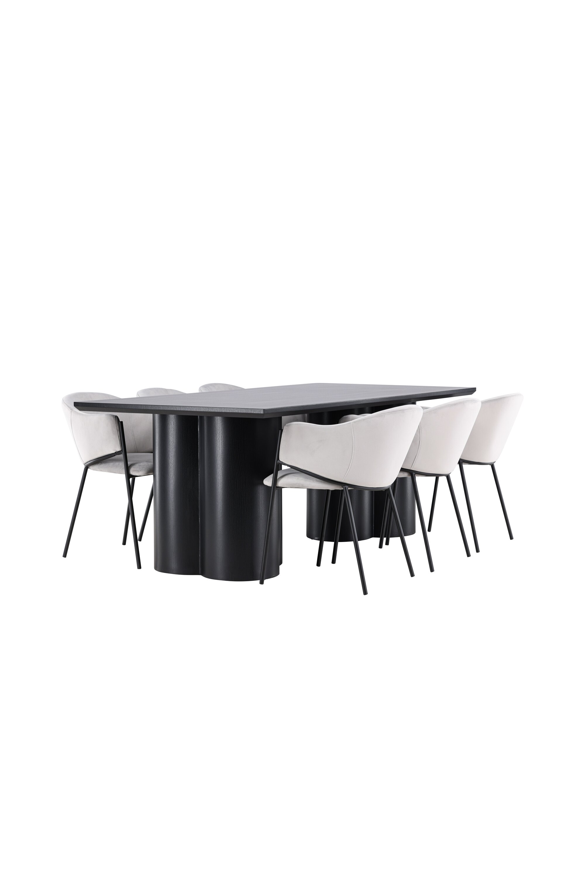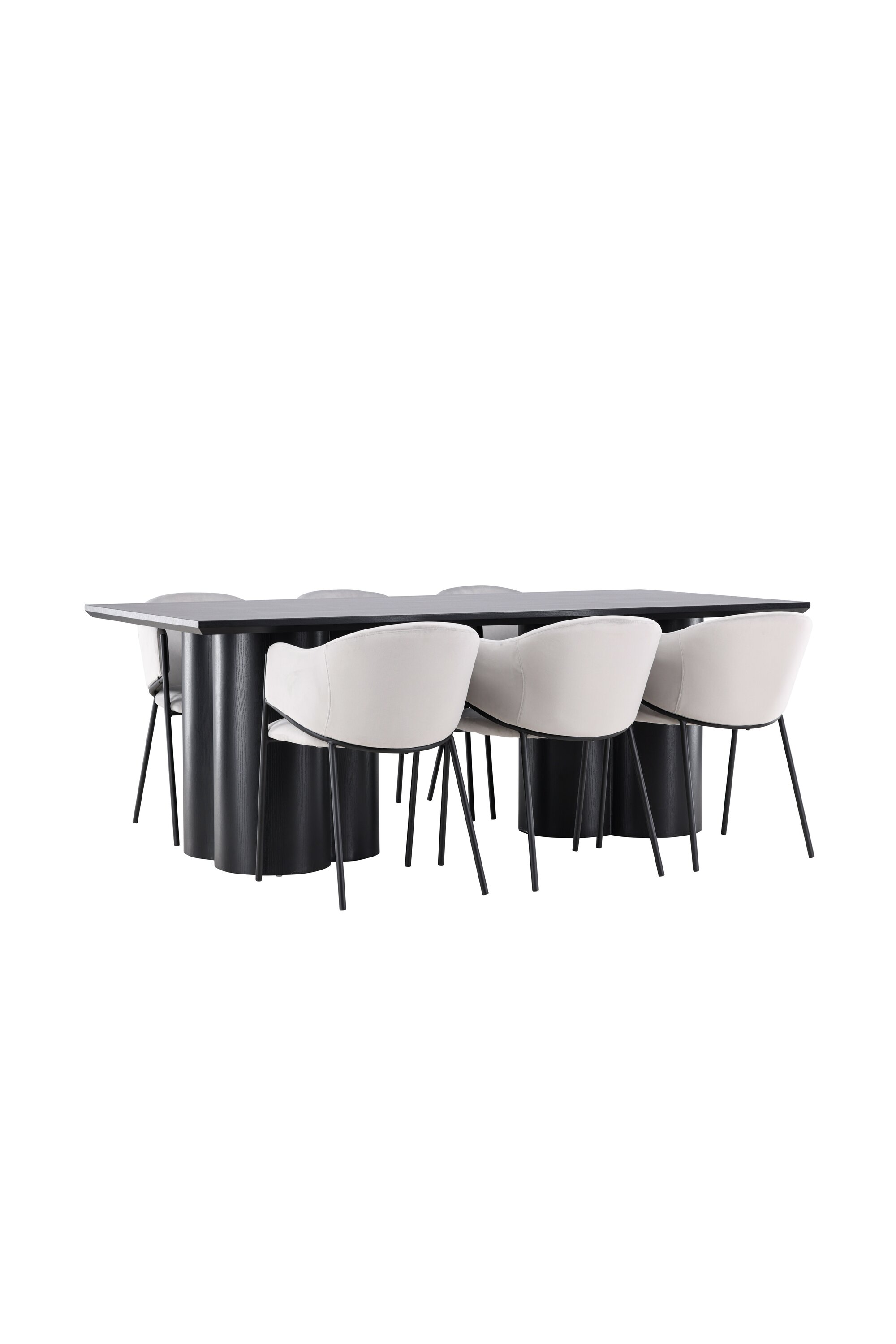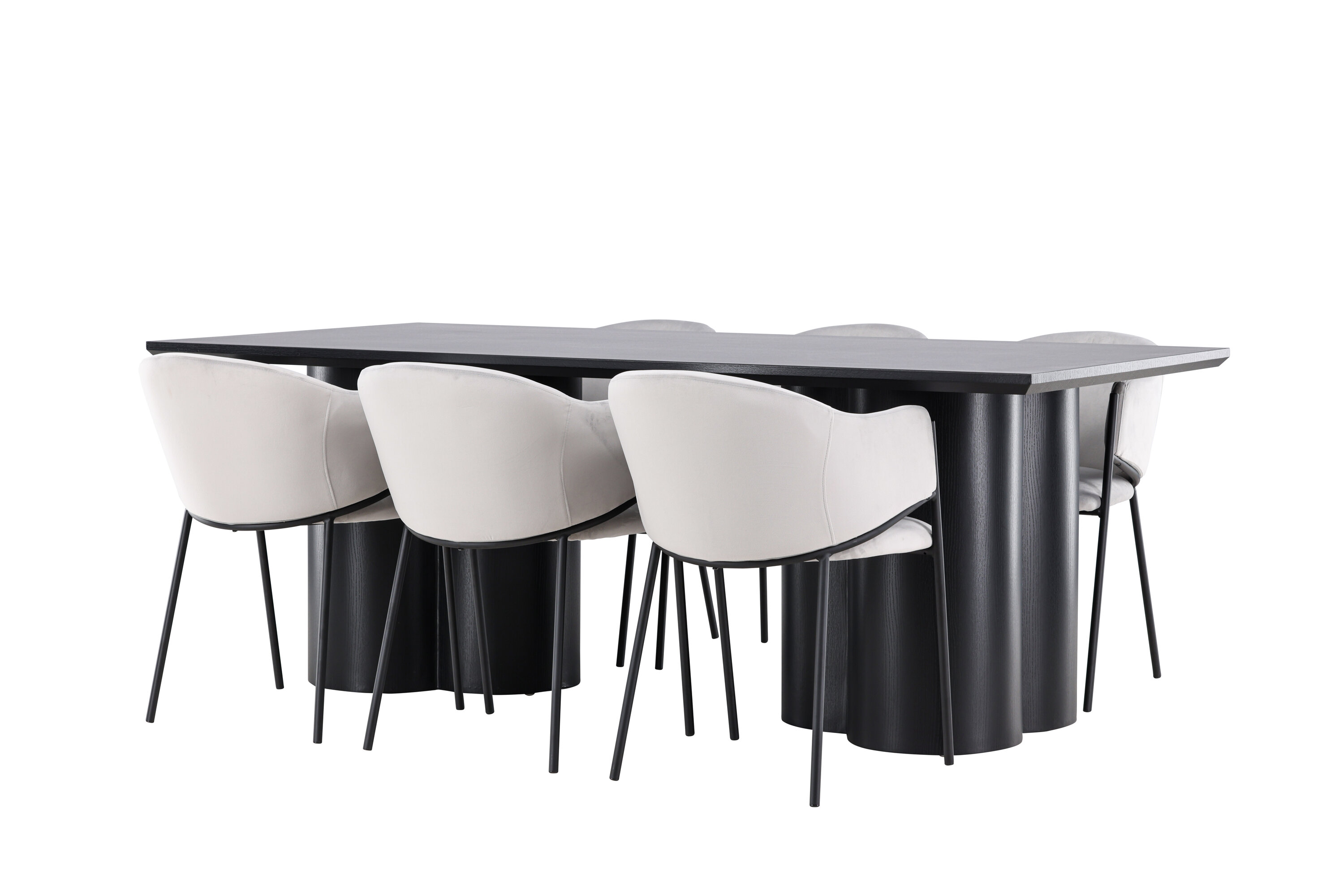 Avasta täiuslik söögikomplekt koos Evelina söögitooli ja Olivia söögilauaga – kombinatsioon, millest õhkub nii elegantsi kui ka funktsionaalsust sinu koju. Evelina söögitool on nostalgilise ilmega ja sama stiilne kui mugav, luues teie söögilaua ümber luksusliku fookuspunkti. Toolil on täielikult polsterdatud iste, millel on helehalli sametist ümar seljatugi ja dekoratiivne, minimalistlik mustast terasest jalaraam. Trendikindel disain avaldab muljet ja on kooskõlas viimaste trendidega. Istuge mugavalt ja nautige oma sööki nendes elegantsetes söögitoolides! Olivia söögilaud, mille mõõtmed on 210×100 cm, on ideaalne sõprade ja pere tervitamiseks ühistele einetele ja koosviibimistele. Viimistletud musta varjundiga laud õhkab elegantsi ja modernsust, samas kui selle tugev konstruktsioon tagab pikaajalise stabiilsuse. Andke oma söögitoale luksuse ja modernsuse tunne Evelina söögitooli ja Olivia söögilauaga. See söögikomplekt loob harmoonilise atmosfääri ja jätab püsiva mulje. See kombinatsioon sobib suurepäraselt nii igapäevasteks õhtusöökideks kui ka pidulikeks sündmusteks ning pakub tasakaalu ajatu disaini ja moodsate detailide vahel, muutes selle ideaalseks valikuks kõikideks seltskondlikeks koosviibimisteks.