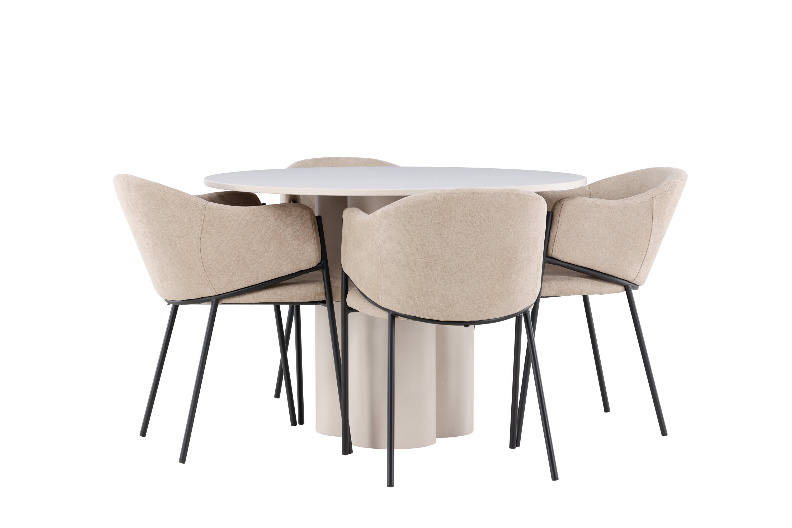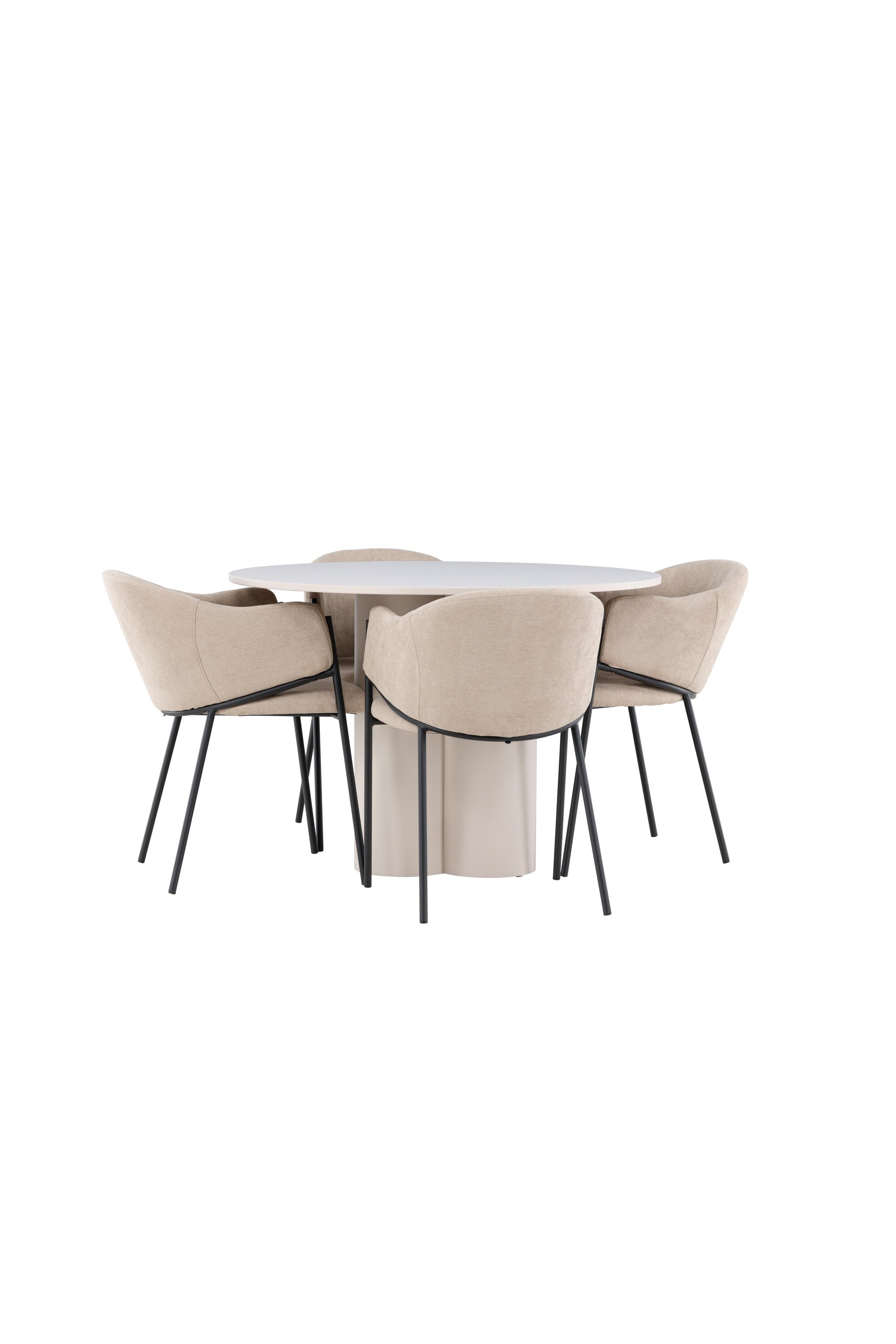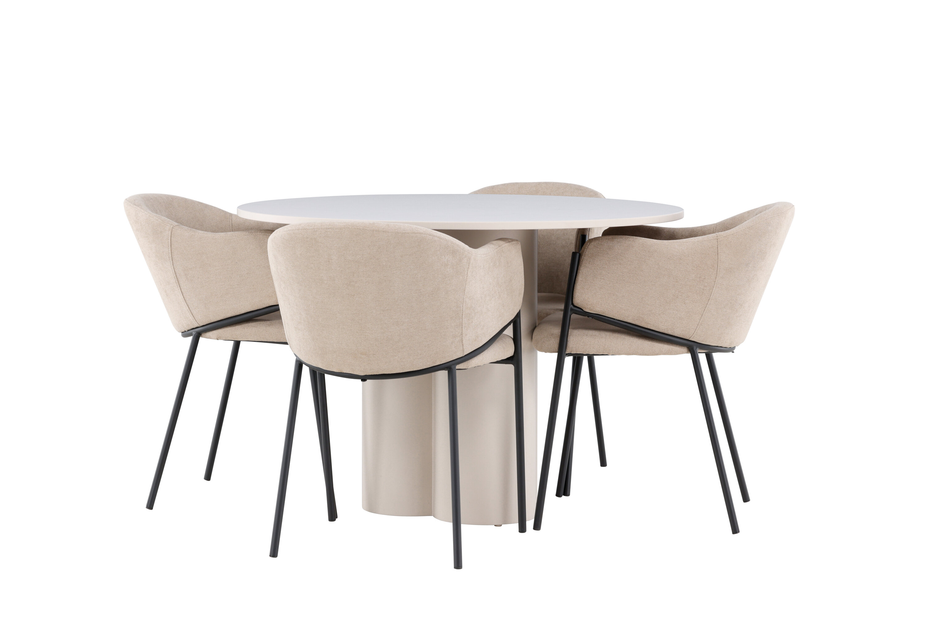 Looge elegantne ja kutsuv söögituba meie stiilse söögigrupiga, mis ühendab Olivia laua mugavate Evelina toolidega. See söögituba, mis sobib ideaalselt nii igapäevasteks õhtusöökideks kui ka pidulikeks sündmusteks, loob teie söögitoale kaasaegse ja harmoonilise atmosfääri. MDF-st valmistatud Olivia laual on helebeež värv, mis lisab teie söögitoale sooja ja kutsuva tunde. 110 cm läbimõõduga laud pakub rohkelt ruumi söögiks ja vestlusteks, ümar kuju loob aga tasakaalustatud ja sotsiaalse keskkonna. Laua vastupidav konstruktsioon tagab pikaajalise kasutuse ja stabiilsuse. Neli Evelina tooli täiendavad lauda suurepäraselt oma elegantsete beeži linaga kaetud istmetega. Need toolid pakuvad nii mugavust kui ka stiili, muutes need ideaalseks pikaks ja nauditavaks õhtusöögiks pere ja sõpradega. Nende kaasaegne disain koos kõrgete seljatugede ja pehmete istmetega annab teie söögitoale rafineeritud ja kaasaegse ilme. See söögituba on ideaalne kombinatsioon esteetikast ja funktsionaalsusest, mistõttu on see suurepärane valik neile, kes otsivad elegantset ja mugavat söögituba. Täiustage oma söögituba Olivia laua ja Evelina toolide kombinatsiooniga ning looge koht, kus jagatakse mälestusi ja rõõmu.