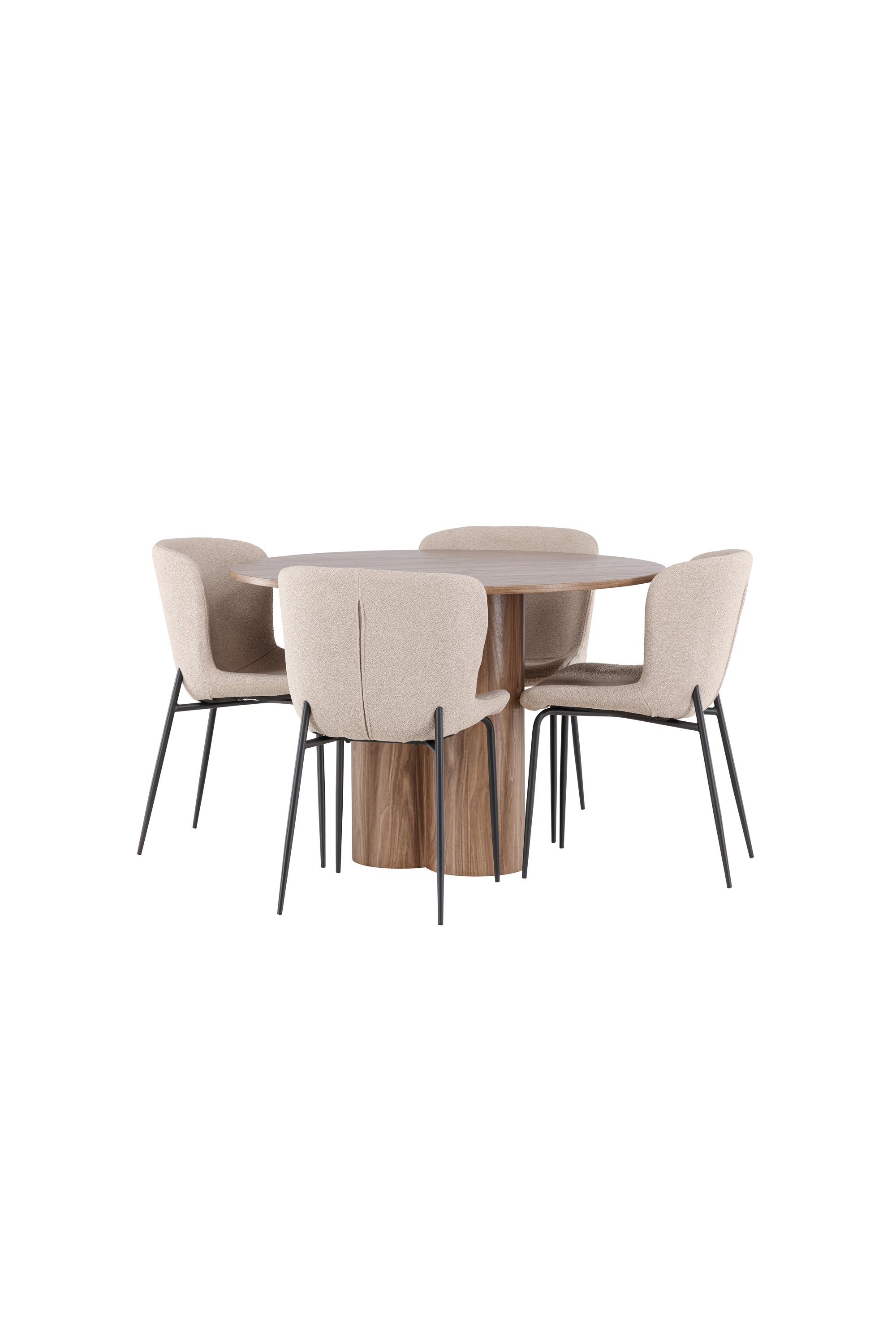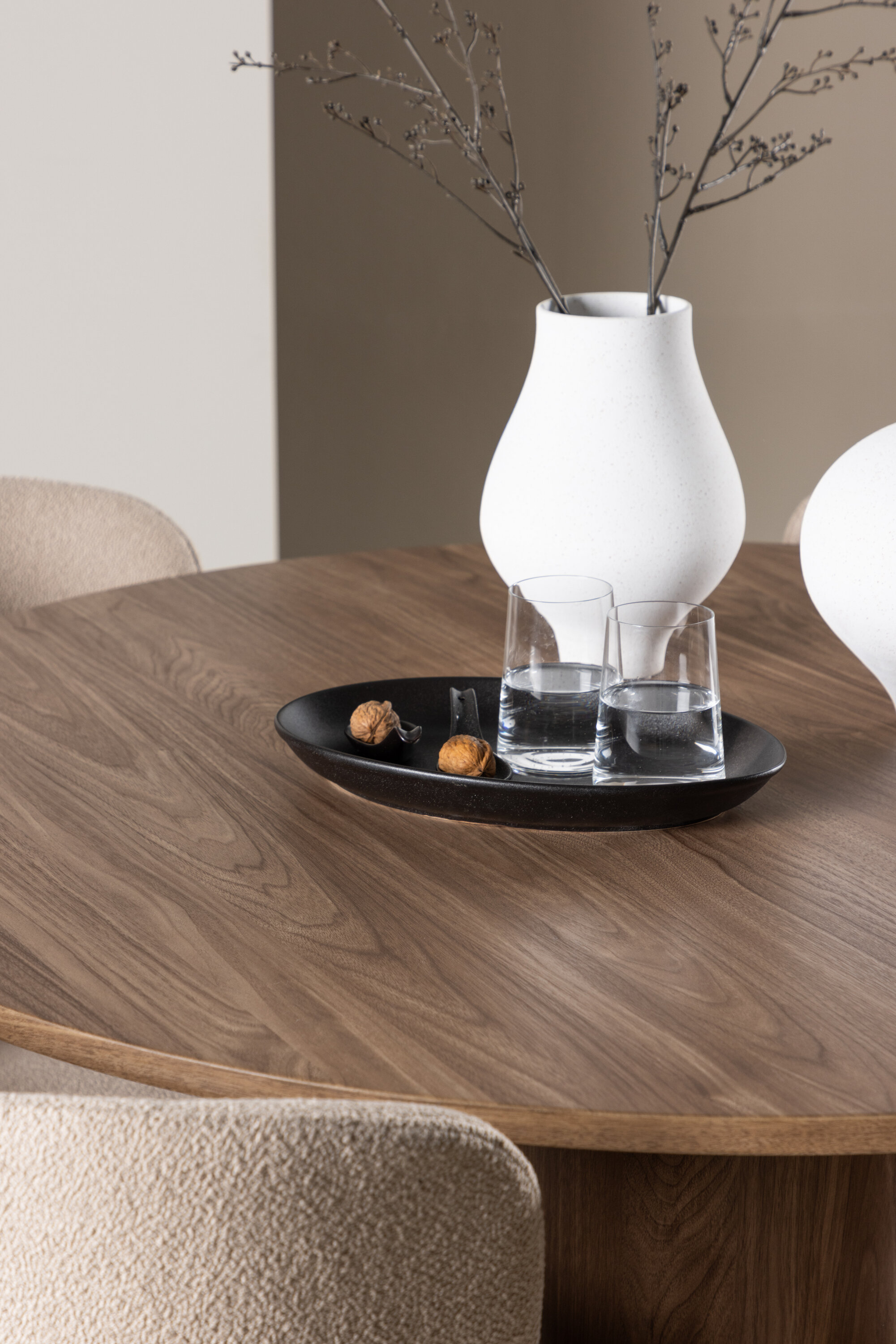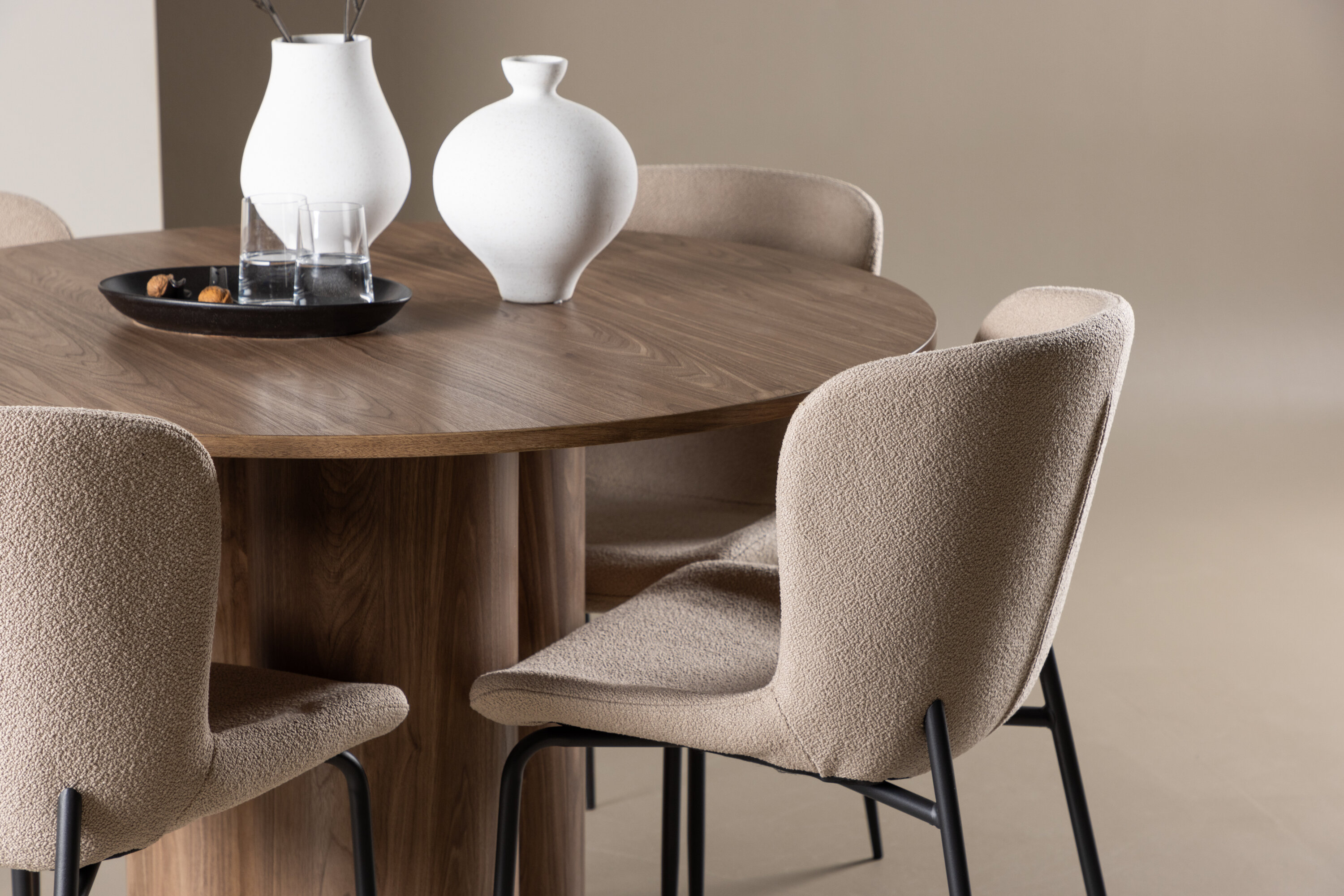 Avastage oma koju täiuslik söögikomplekt Olivia söögilaua ja Modesto toolidega. Olivia söögilaud on kutsuv ja elegantne mööbliese, mis oma 110 cm läbimõõduga sobib suurepäraselt sõprade ja pere kokkusaamiseks, et veeta mõnusaid eineid ja mõnusaid hetki. Oma lummava mokavärvi ja skandinaavialiku disainiga ühendab see lihtsuse ja stiili, muutes selle ajatuks valikuks igasse ruumi. Olgu selleks siis lõõgastav hiline hommikueine või pidulik õhtusöök, Olivia söögilaud on garanteeritud pilgupüüdja. Täiendage söögilauda meie populaarsete Modesto toolidega, mis on nii trendikad kui ka mugavad. Looge nende Skandinaavia disainiga pehmete toolidega kodu südames kutsuv atmosfäär. Toolid on üleni polsterdatud beežist pulstunud bouclé-kangast ning neil on elegantsed ja õhukesed mustast metallist toolijalad. Kergelt ümardatud seljatugi ja polsterdatud istmepadi pakuvad lisamugavust ja pikendavad meeldivaid eineid söögilaua ümber. Hea eine jaoks maha istudes peaks olema hea tunne!
