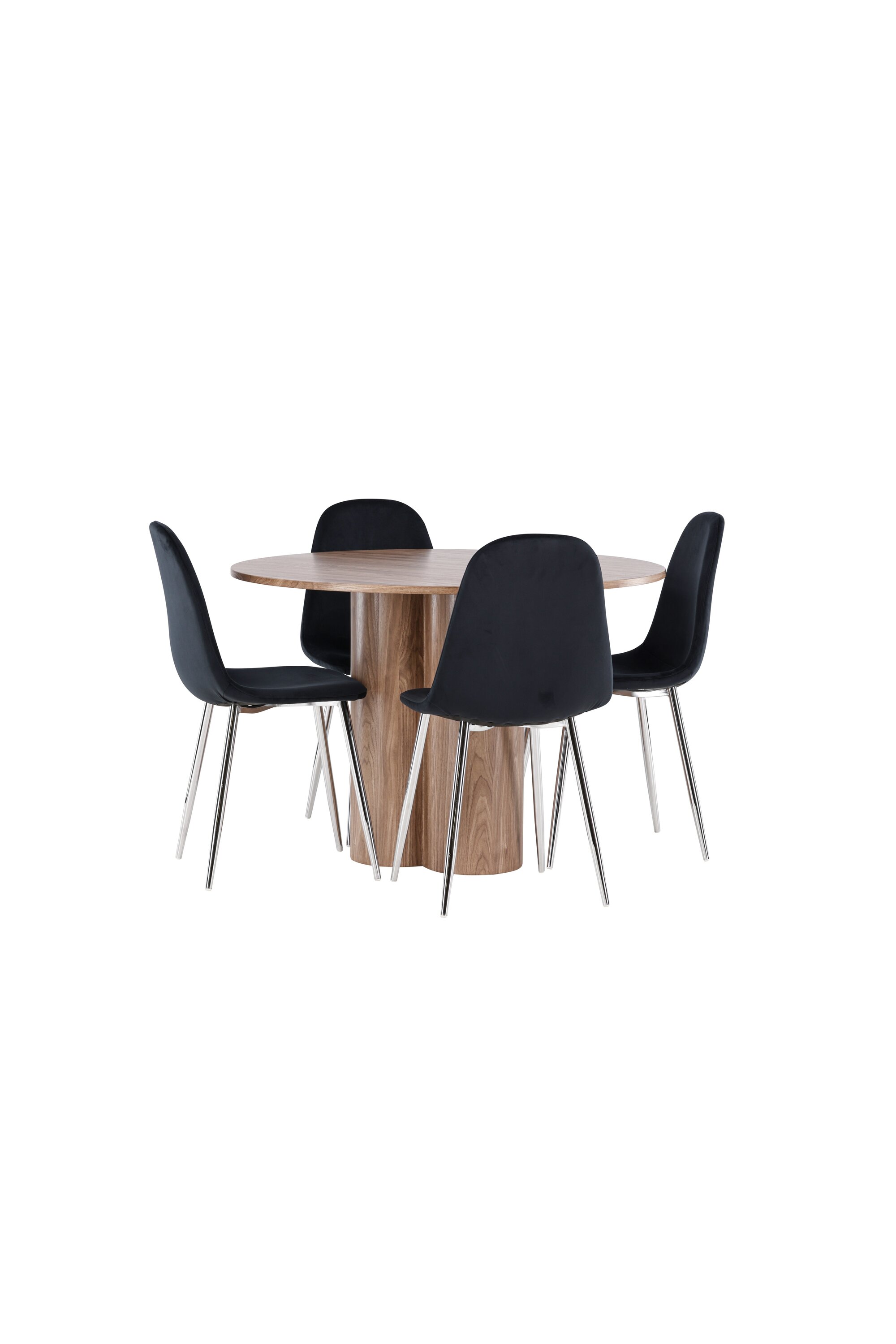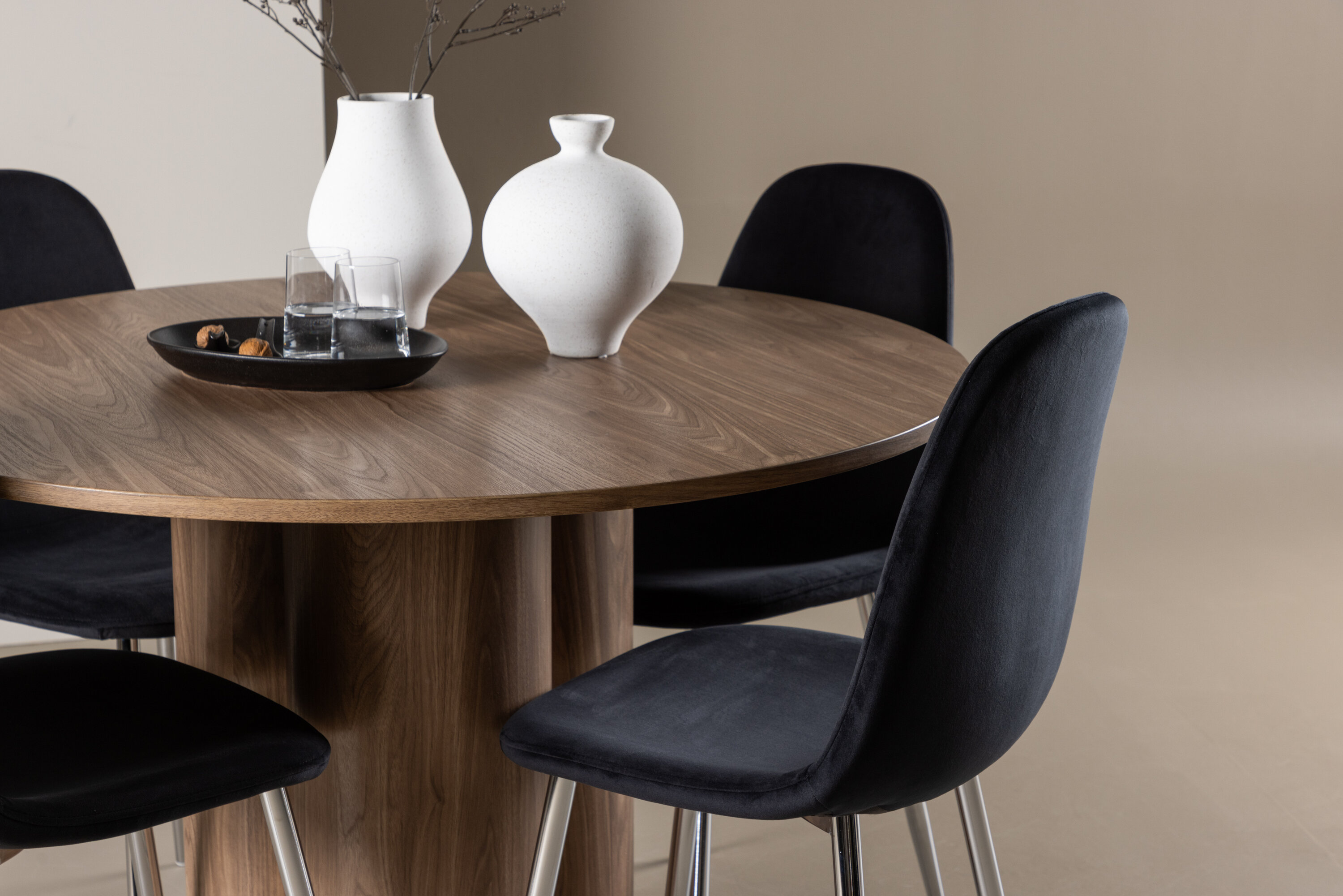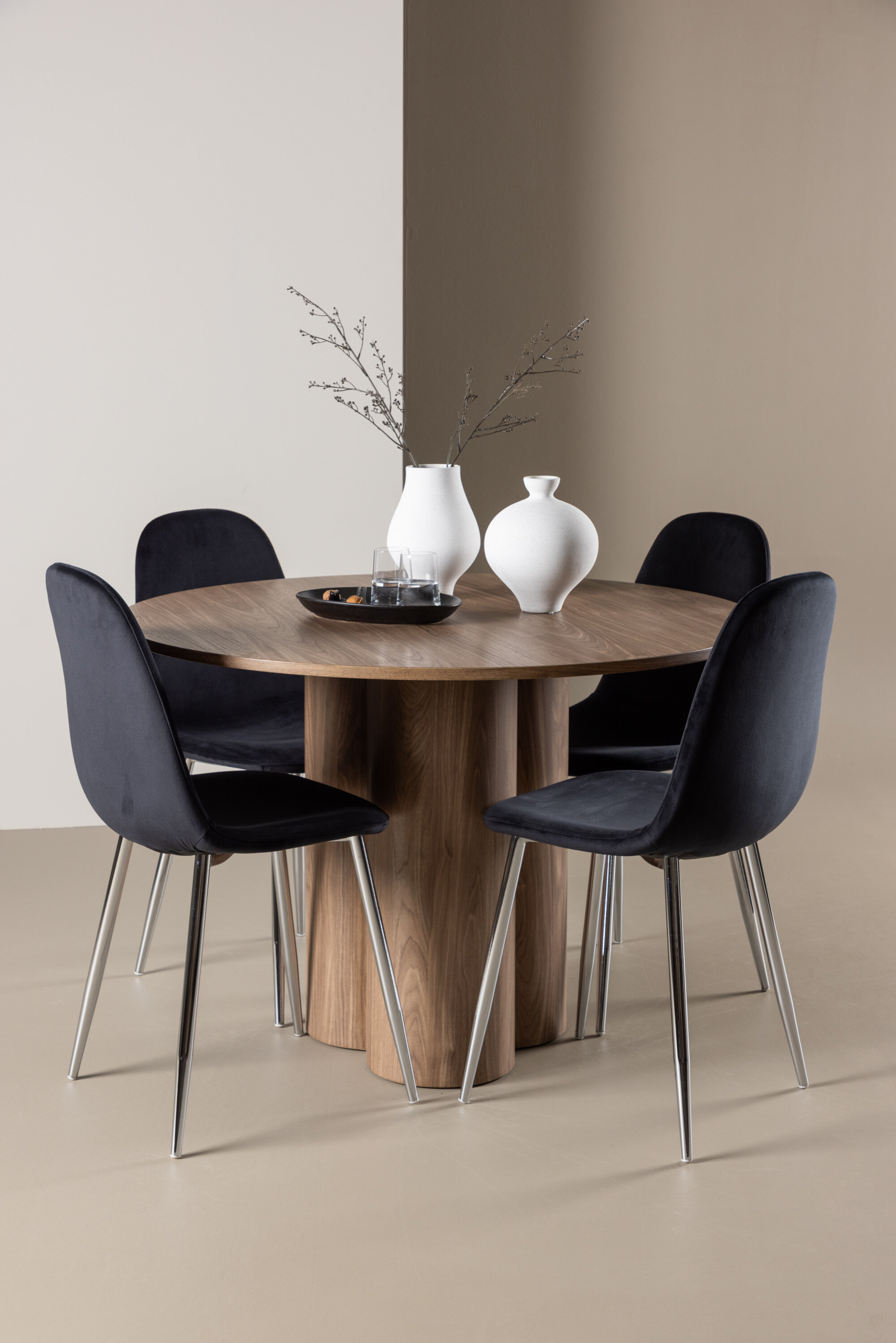 Avastage oma koju täiuslik söögikomplekt koos Olivia söögilaua ja Polari toolidega. Olivia söögilaud on kutsuv ja elegantne mööbliese, mis oma 110 cm läbimõõduga sobib suurepäraselt sõprade ja pere kokkusaamiseks, et veeta mõnusaid eineid ja mõnusaid hetki. Oma lummava mokavärvi ja skandinaavialiku disainiga ühendab see lihtsuse ja stiili, muutes selle ajatuks valikuks igasse ruumi. Olgu siis lõdvestunud hiline hommikueine või pidulik õhtusöök – Olivia söögilaud on garanteeritud pilgupüüdja. Täiendage söögilauda meie elegantsete Polari toolidega, mis pakuvad luksust ja mugavust. Nendel toolidel on täielikult polsterdatud disain, kroomitud metallist jalad, veidi ümar seljatugi ja klanitud must sametist iste, millel on pehme polster, mis lisab mugavust. Siin ei pea te mugavuse ja disaini vahel järeleandmisi tegema. Luksuslik tunne ja kaasaegne esteetika muudavad Polari toolid suurepäraseks täienduseks Olivia söögilauale. Looge oma kodu südames kutsuv õhkkond ja nautige koos mõnusaid eineid.