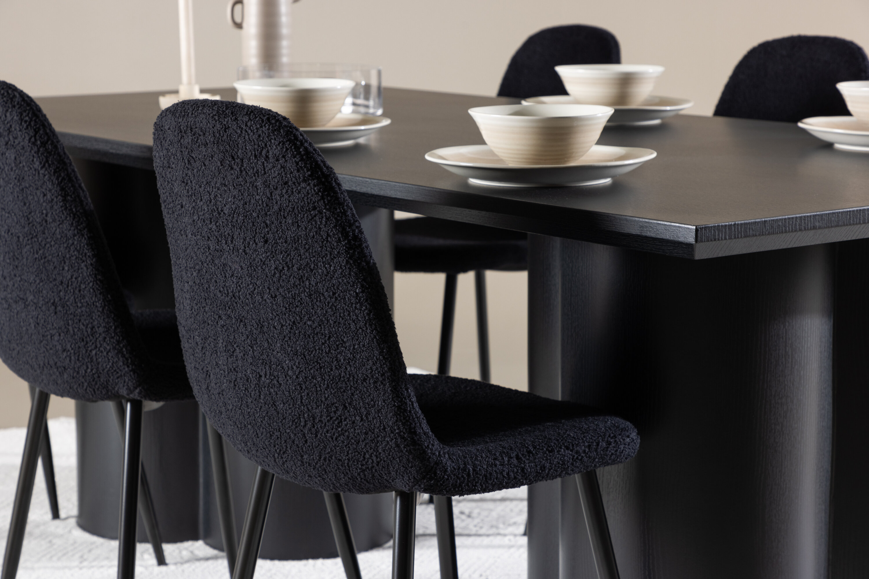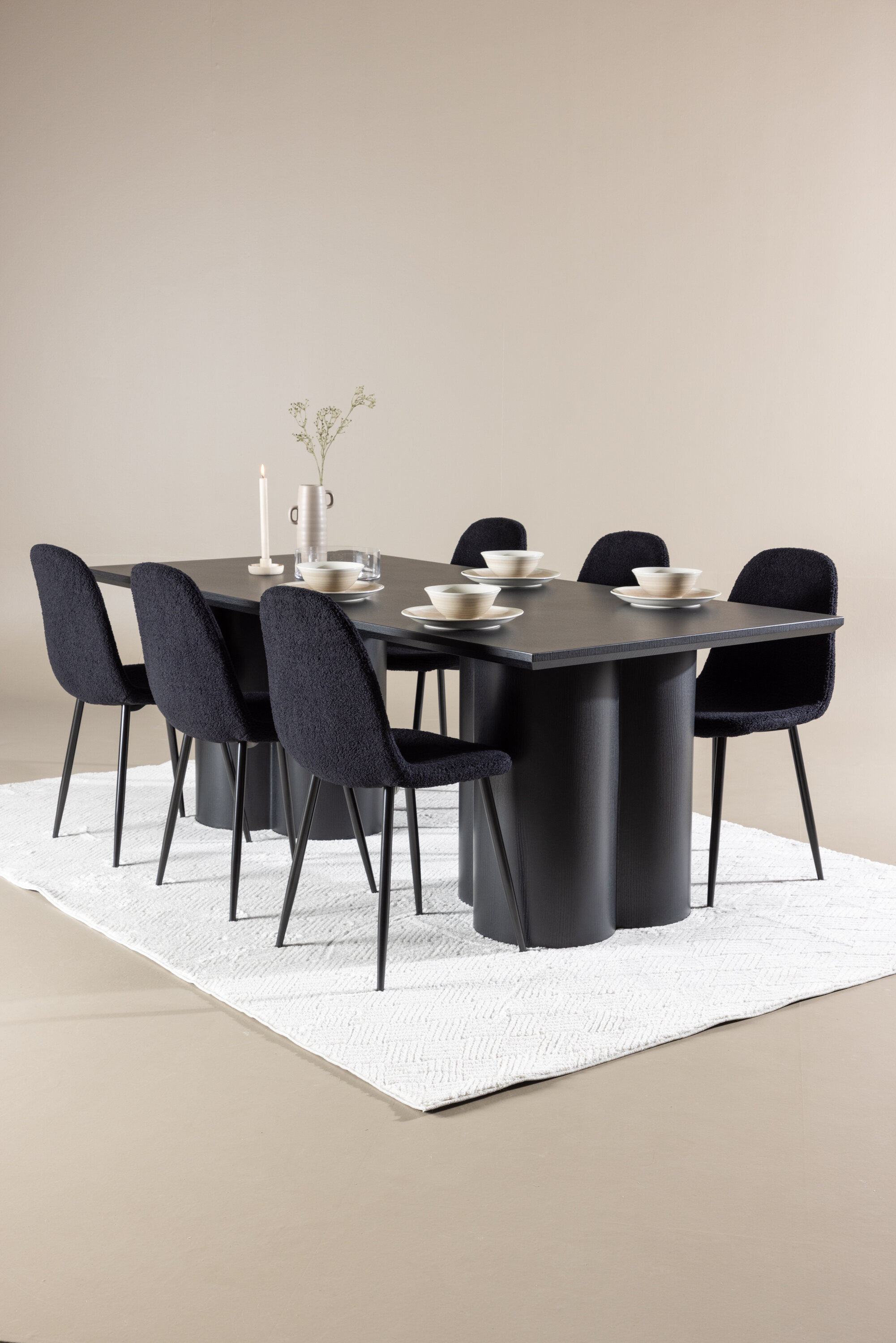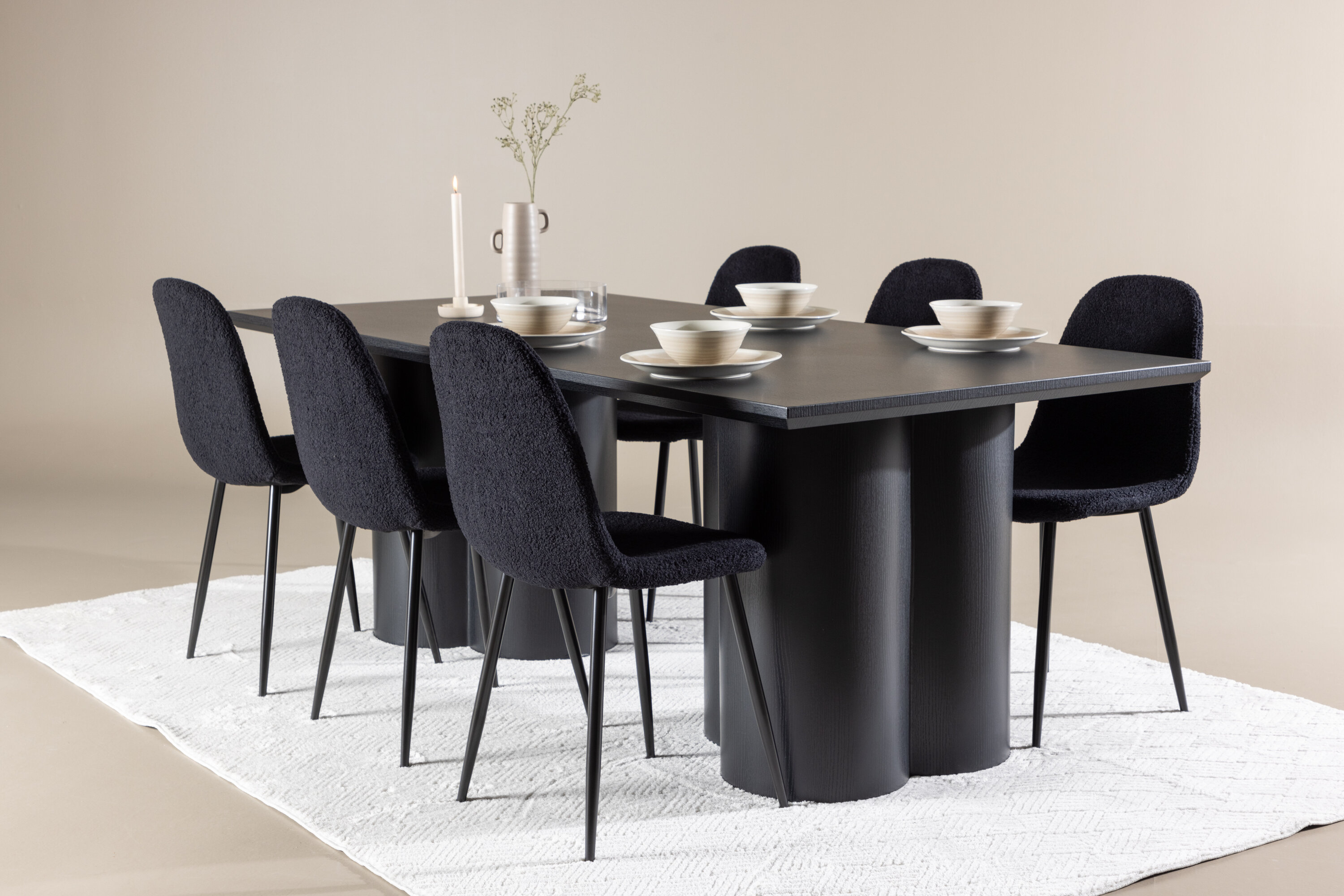 Avastage täiuslik elegantsi ja funktsionaalsuse kombinatsioon söögikomplektiga, mis sisaldab Polari söögitooli ja Olivia söögilauda. Üheskoos loovad need moodsa ja kutsuva atmosfääri kõikideks teie söögikordadeks ja seltskondlikeks koosviibimisteks. Tool on FSC®-sertifikaadiga (FSC®C177288), mis tähendab, et see koosneb vastutustundlikust metsandusest, inimeste ja keskkonnaga arvestavast metsandusest pärit puidust. Polari söögitool on ideaalne kombinatsioon moodsast elegantsist ja lihtsusest teie einestamiskorralduses. Tooli sügavmust värv ja polüester teddy materjal annavad eksklusiivse tunde ja pakuvad mugavat istumiskogemust kõikidel õhtusöökidel ja koosviibimistel. Selle kaasaegne disain ja puhtad jooned pakuvad ajatut esteetikat, mis täiendab kõiki interjööri stiile. Polari söögitooli jalad on valmistatud mustast terasest, pakkudes tugevat ja tugevat konstruktsiooni, aidates samal ajal kaasa selle elegantsele välimusele. Oma lihtsuse ja mitmekülgsusega on Polar teie kodu teretulnud täiendus. Kogege elegantsust ja funktsionaalsust söögilauaga Olivia. See laud on oma suurte mõõtmetega 210×100 cm ideaalne sõprade ja pere tervitamiseks ühisteks eineteks ja koosviibimisteks. Keerulises mustas toonis Olivia söögilaud õhkab elegantsi ja modernsust. Selle tugev konstruktsioon tagab stabiilsuse paljudeks aastateks. Loo Olivia söögilauaga oma kodus trendikas atmosfäär. Selle elegantne disain ja ajatu värvitoon sobivad ideaalselt erinevate interjööristiilidega. Laske Olivia söögilaual luua teie seltskondlikke koosviibimisi ja mälestusi, kui jagate oma lähedastega eineid ja vestlusi. Selle muljetavaldava ja funktsionaalse lauaga saate oma kodule elegantsi ja seltskondlikkust anda.