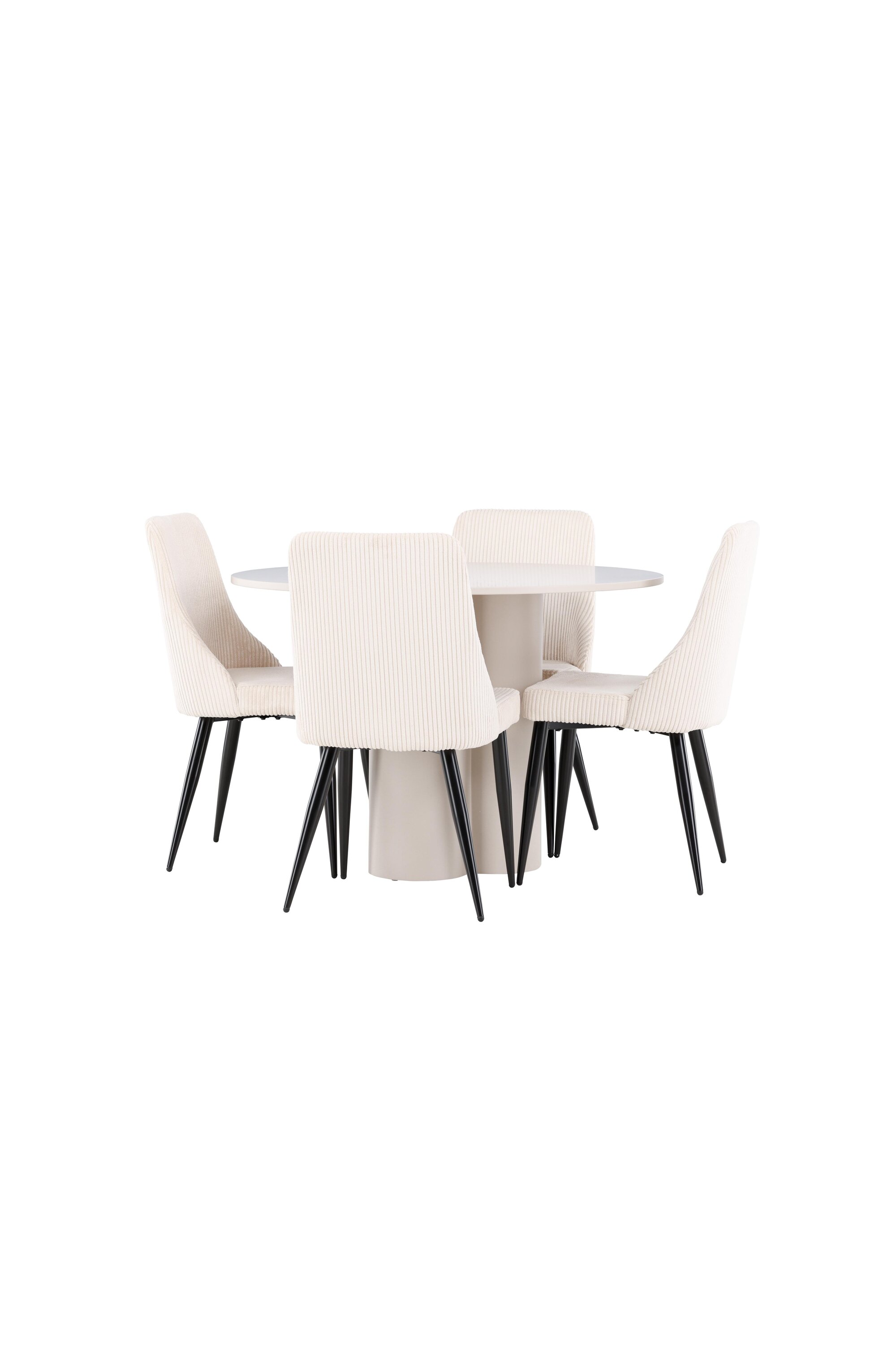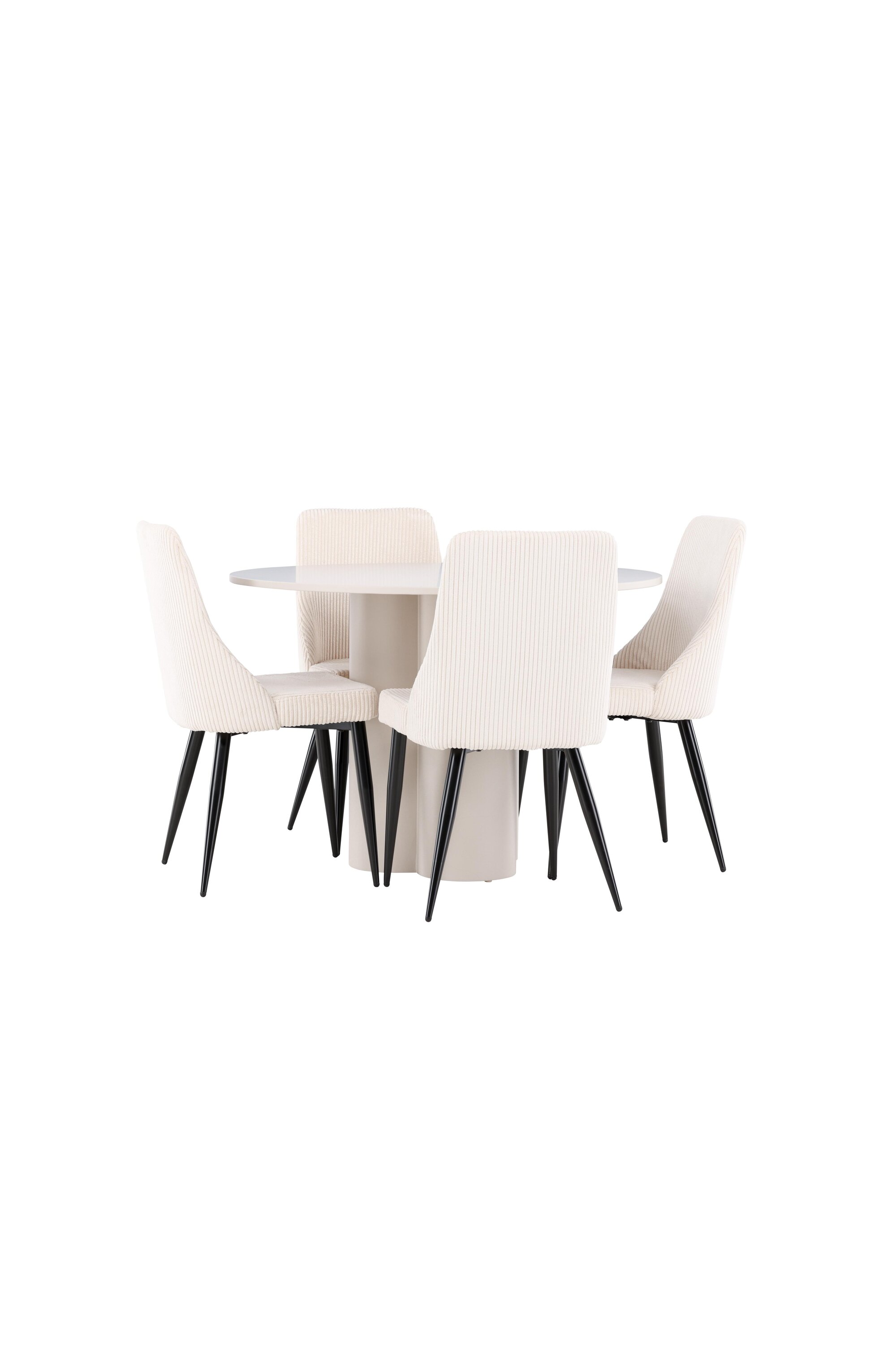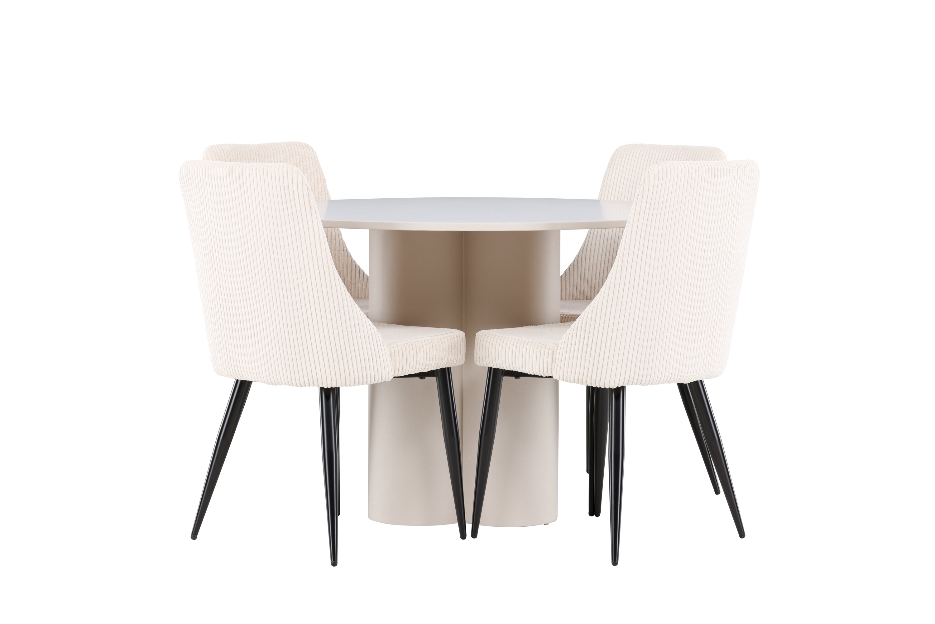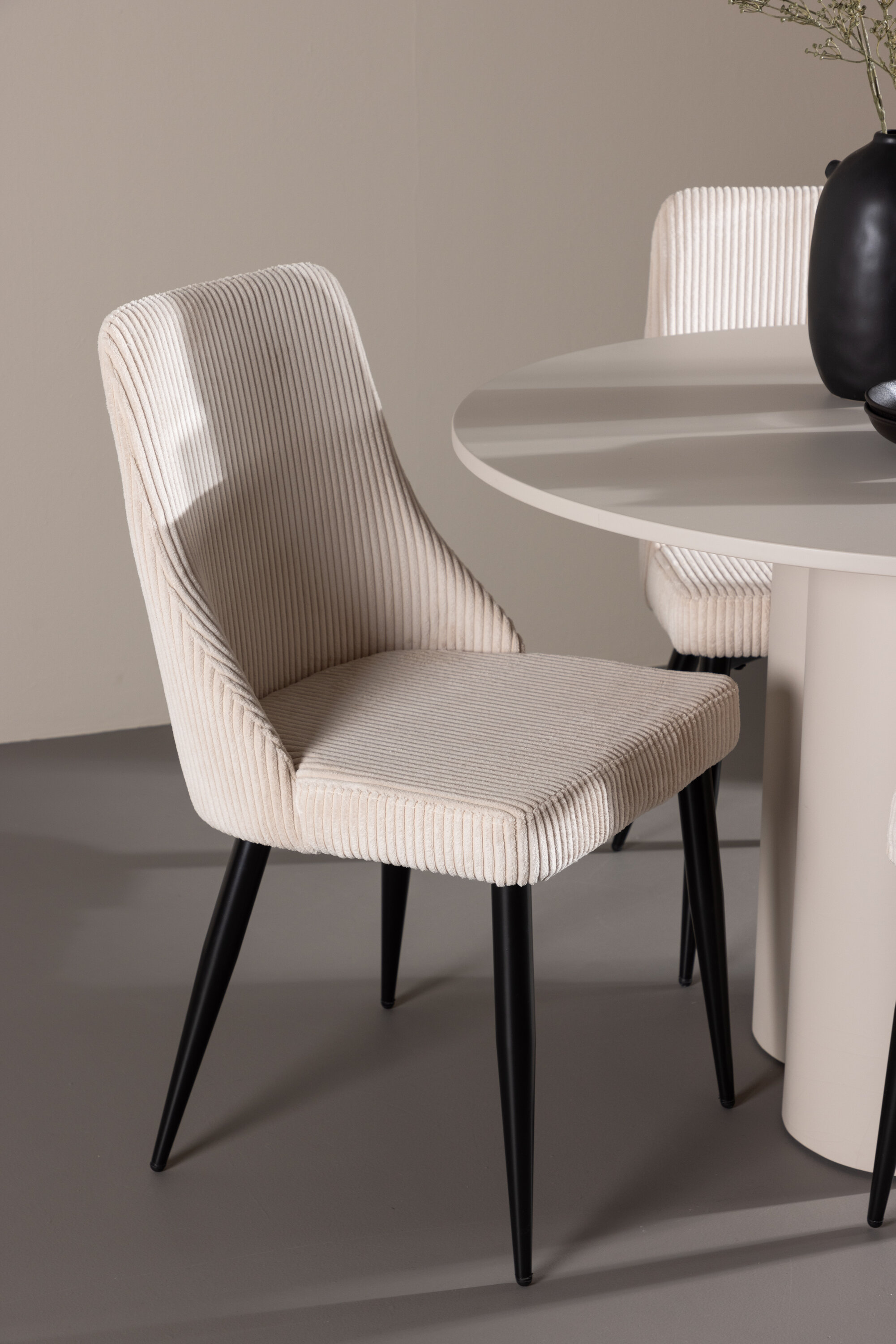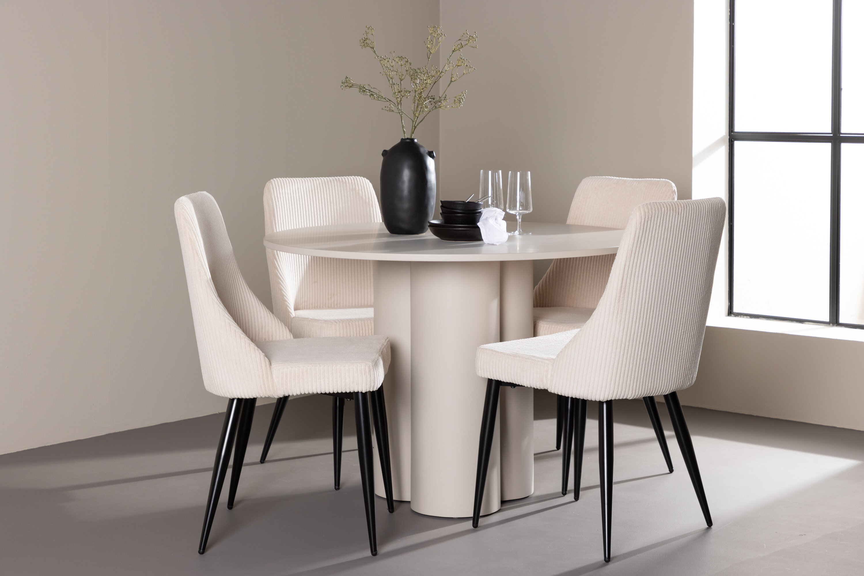 Looge elegantne ja kutsuv söögituba meie stiilse söögigrupiga, mis ühendab Olivia laua ja keerukate Leone toolidega. See söögituba, mis sobib ideaalselt nii igapäevasteks õhtusöökideks kui ka pidulikeks sündmusteks, loob teie söögitoale kaasaegse ja harmoonilise atmosfääri. MDF-st valmistatud Olivia laual on helebeež värv, mis lisab teie söögitoale sooja ja kutsuva tunde. 110 cm läbimõõduga laud pakub rohkelt ruumi söögiks ja vestlusteks, ümar kuju loob aga tasakaalustatud ja sotsiaalse keskkonna. Laua vastupidav konstruktsioon tagab pikaajalise kasutuse ja stabiilsuse. Neli Leone tooli täiendavad lauda suurepäraselt oma elegantsete beeži velvetiga kaetud istmetega. Need toolid pakuvad nii mugavust kui ka stiili, muutes need ideaalseks pikaks ja nauditavaks õhtusöögiks pere ja sõpradega. Nende kaasaegne disain koos kõrgete seljatugede ja pehmete istmetega annab teie söögitoale rafineeritud ja kaasaegse ilme. See söögituba on ideaalne kombinatsioon esteetikast ja funktsionaalsusest, mistõttu on see suurepärane valik neile, kes otsivad elegantset ja mugavat söögituba. Täiustage oma söögituba Olivia laua ja Leone toolide kombinatsiooniga ning looge koht, kus jagatakse mälestusi ja rõõmu.