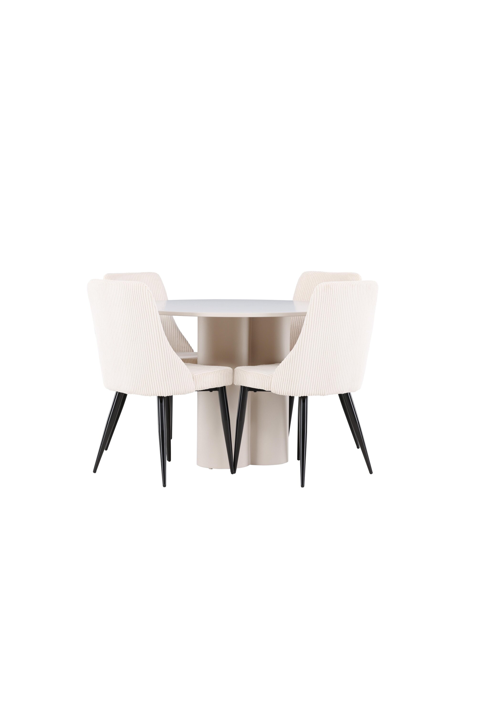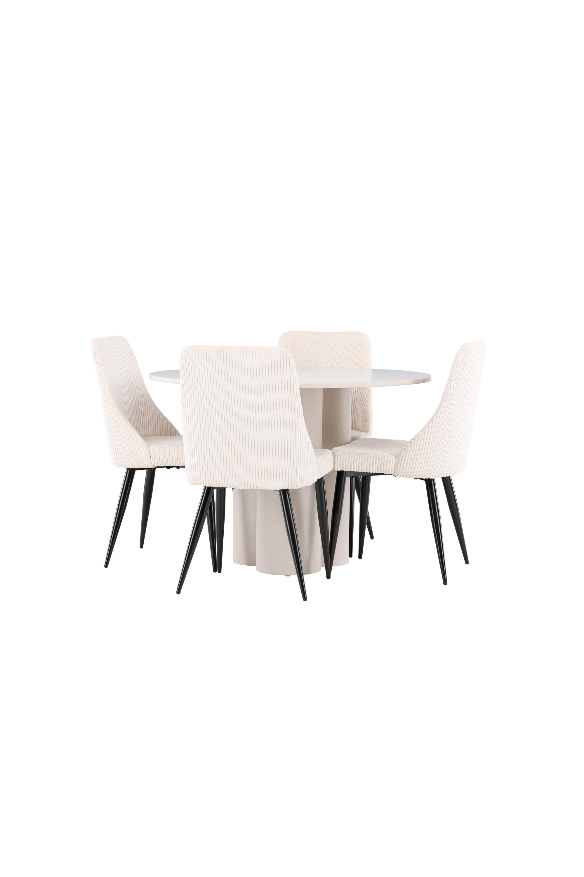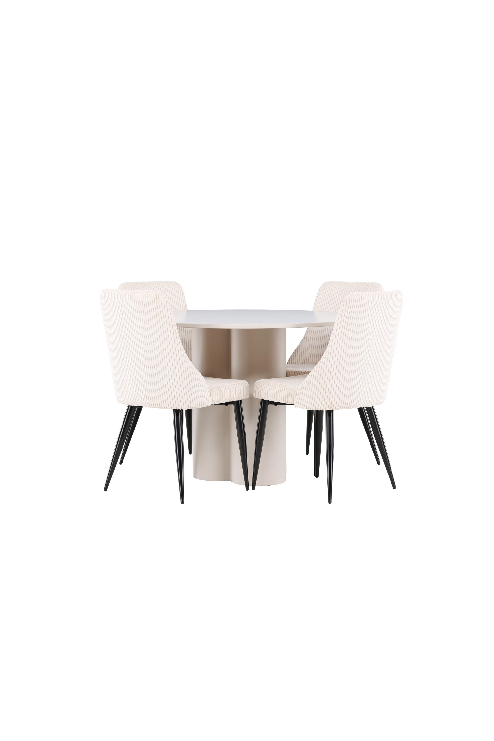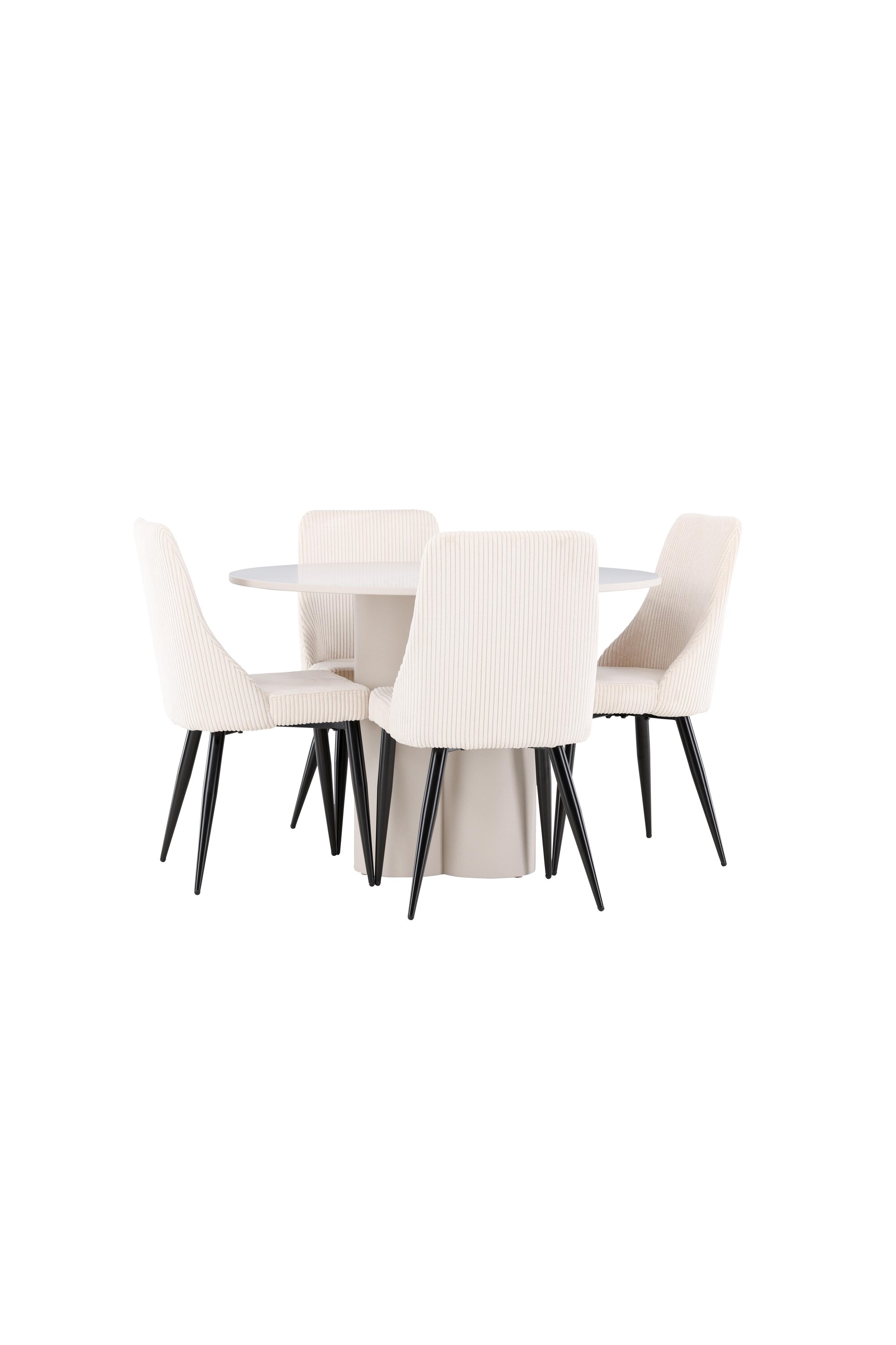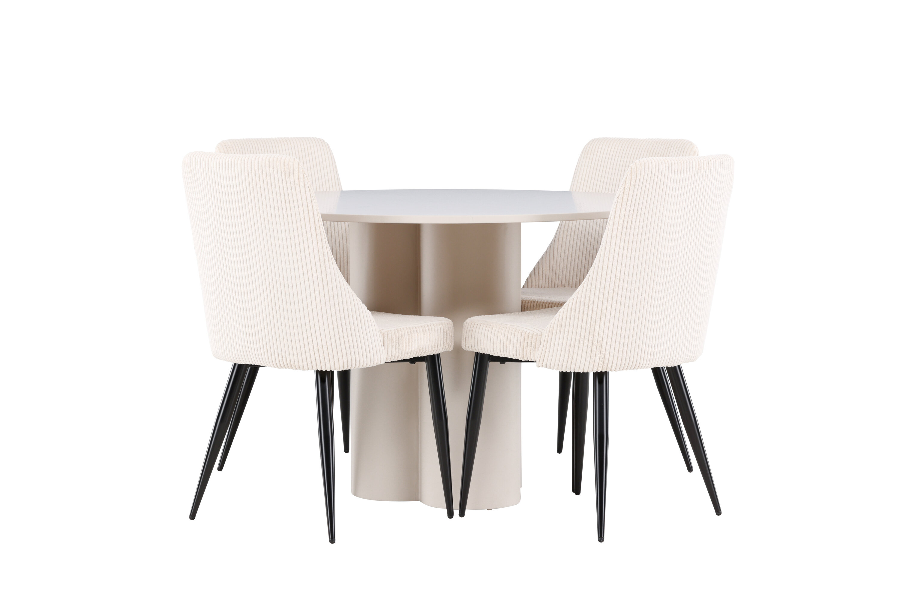 Looge elegantne ja kutsuv söögituba meie stiilse söögigrupiga, mis ühendab Olivia laua ja keerukate Leone toolidega. See söögituba, mis sobib ideaalselt nii igapäevasteks õhtusöökideks kui ka pidulikeks sündmusteks, loob teie söögitoale kaasaegse ja harmoonilise atmosfääri. MDF-st valmistatud Olivia laual on helebeež värv, mis lisab teie söögitoale sooja ja kutsuva tunde. 110 cm läbimõõduga laud pakub rohkelt ruumi söögiks ja vestlusteks, ümar kuju loob aga tasakaalustatud ja sotsiaalse keskkonna. Laua vastupidav konstruktsioon tagab pikaajalise kasutuse ja stabiilsuse. Neli Leone tooli täiendavad lauda suurepäraselt oma elegantsete beeži velvetiga kaetud istmetega. Need toolid pakuvad nii mugavust kui ka stiili, muutes need ideaalseks pikaks ja nauditavaks õhtusöögiks pere ja sõpradega. Nende kaasaegne disain koos kõrgete seljatugede ja pehmete istmetega annab teie söögitoale rafineeritud ja kaasaegse ilme. See söögituba on ideaalne kombinatsioon esteetikast ja funktsionaalsusest, mistõttu on see suurepärane valik neile, kes otsivad elegantset ja mugavat söögituba. Täiustage oma söögituba Olivia laua ja Leone toolide kombinatsiooniga ning looge koht, kus jagatakse mälestusi ja rõõmu.