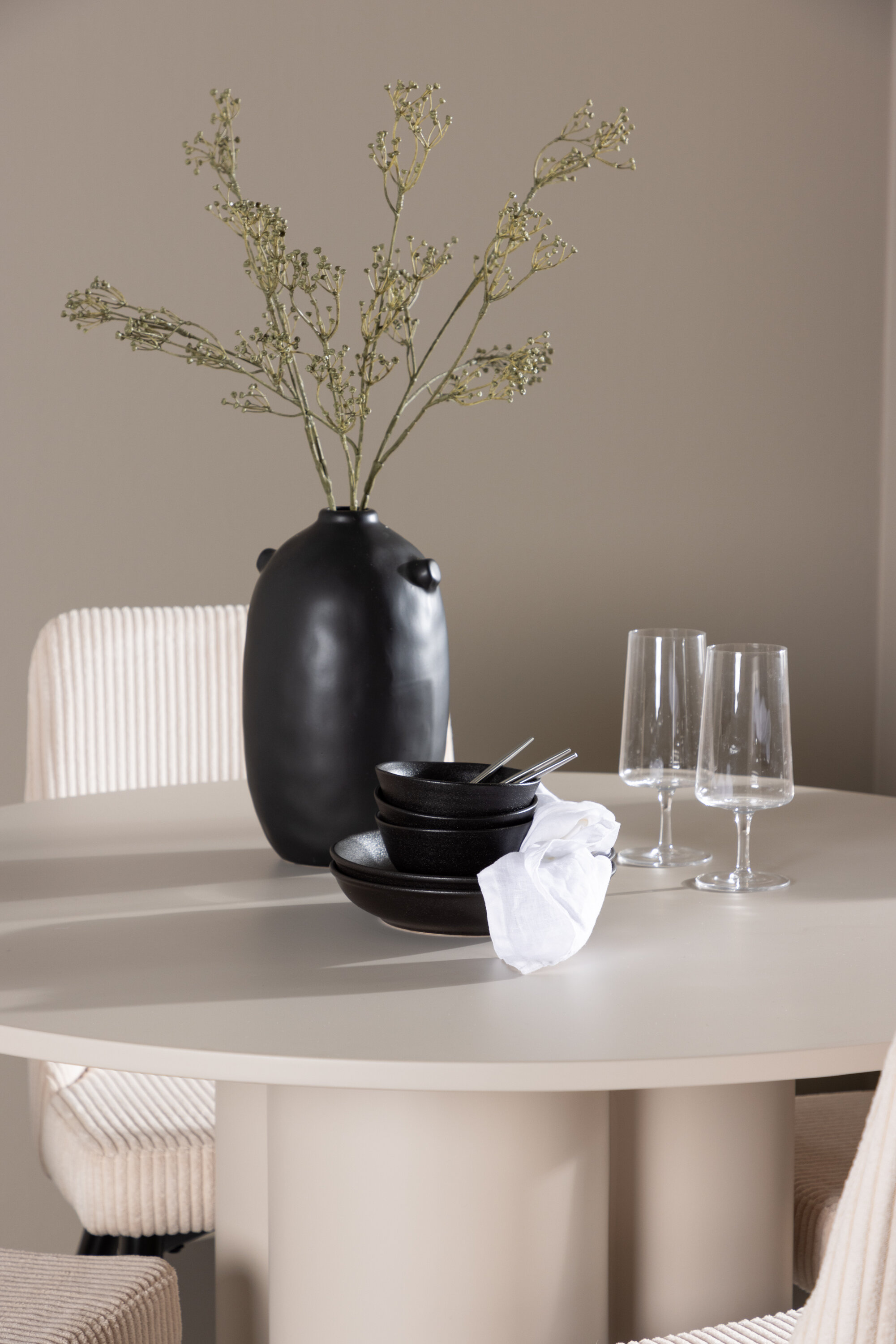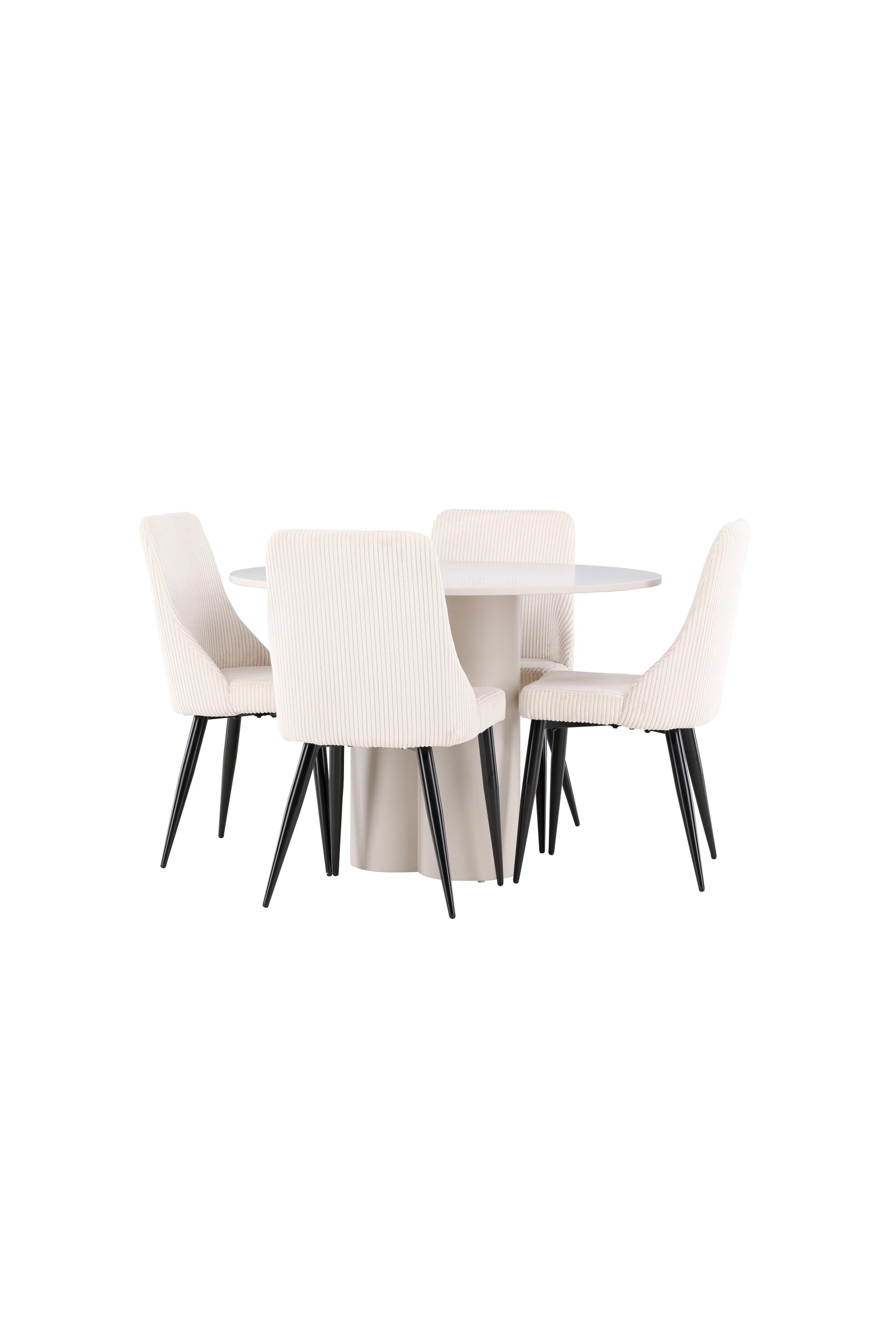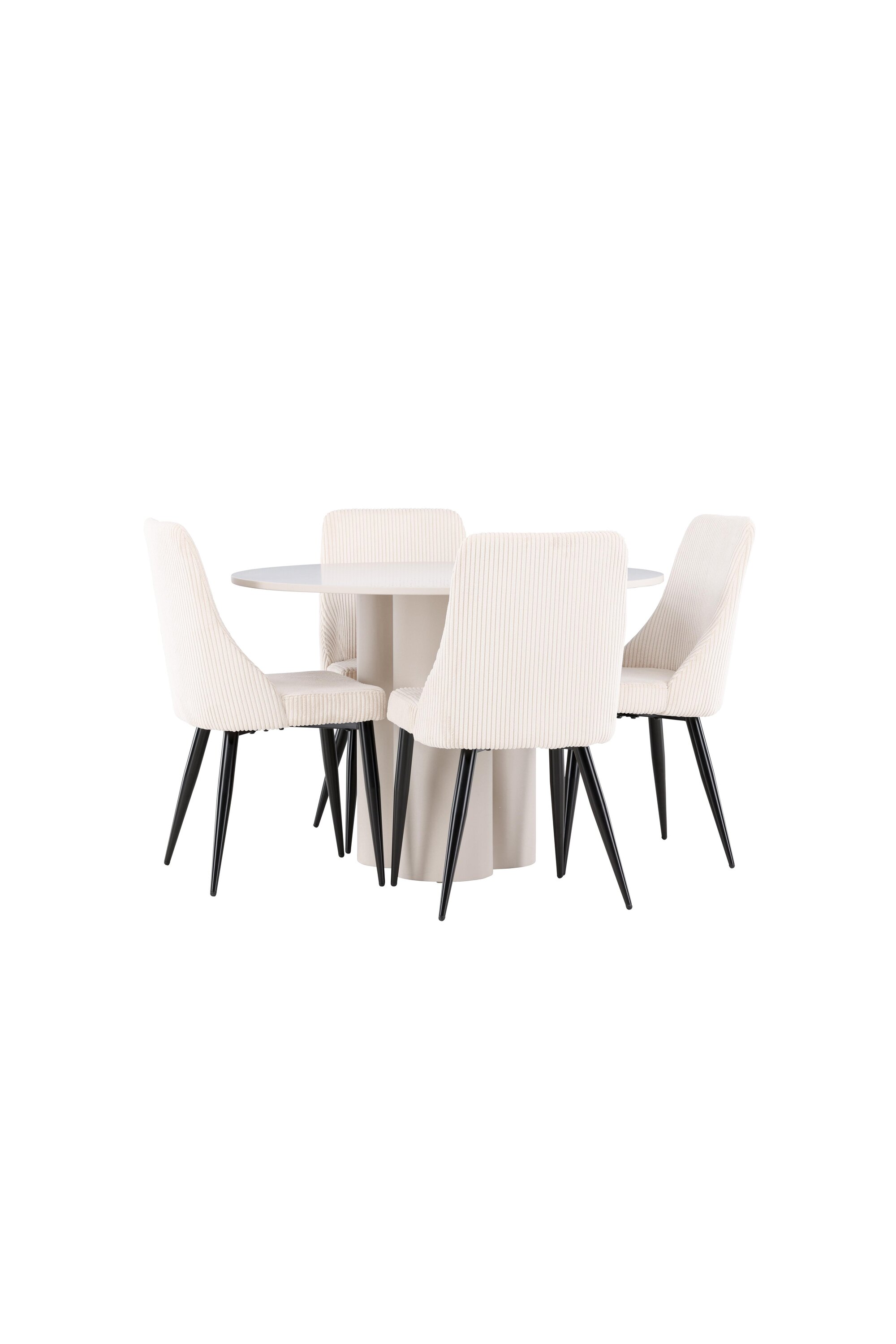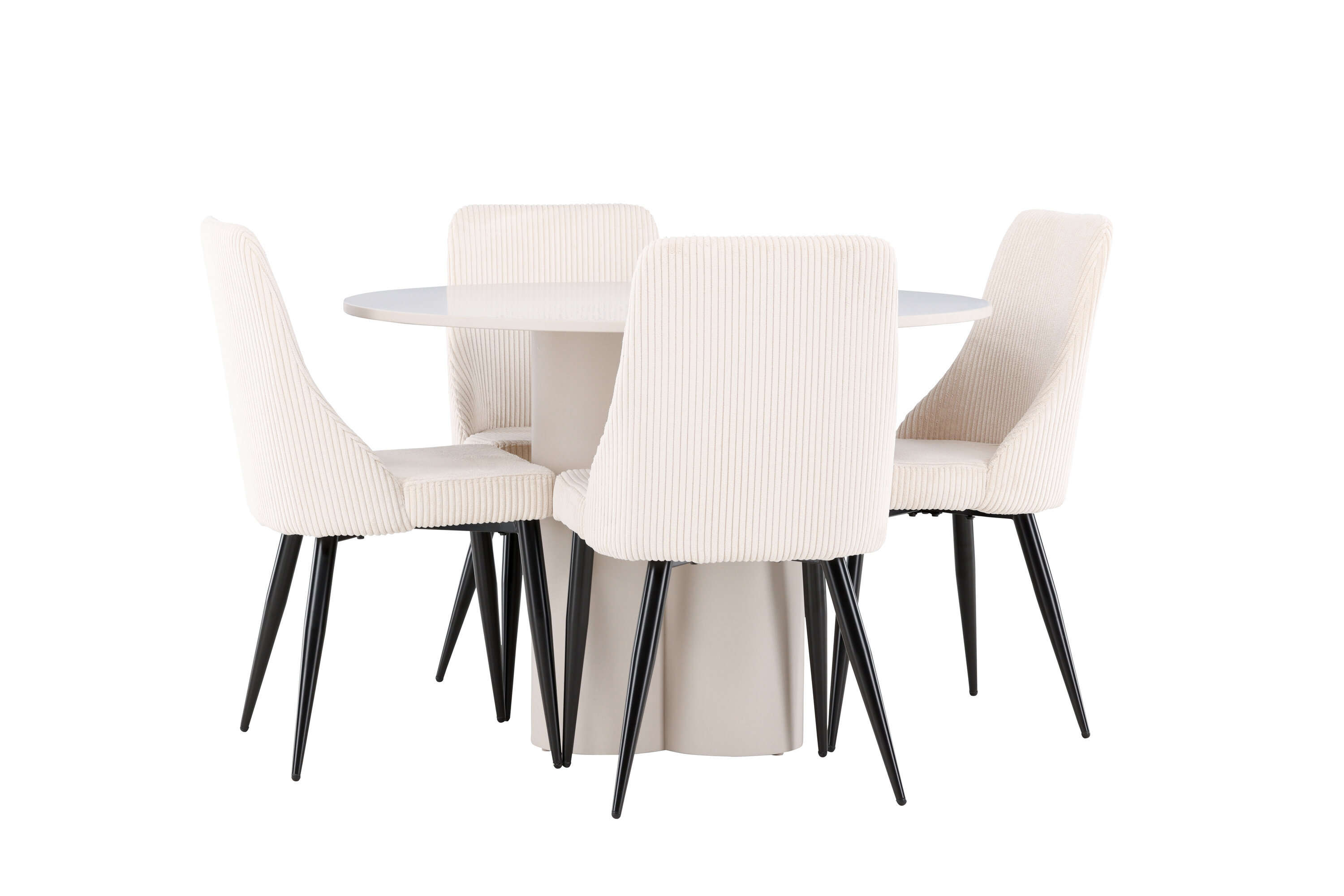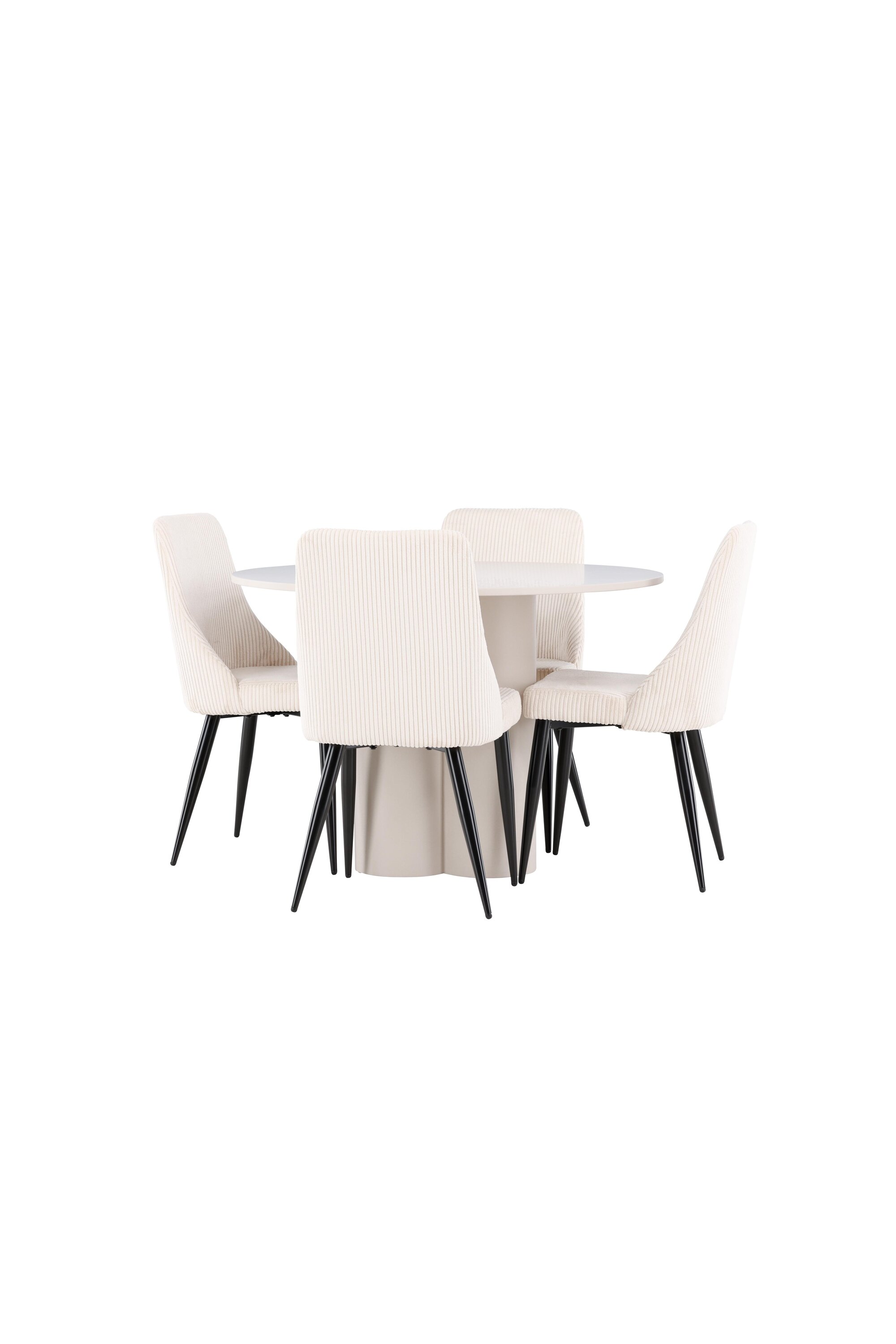 Looge elegantne ja kutsuv söögituba meie stiilse söögigrupiga, mis ühendab Olivia laua ja keerukate Leone toolidega. See söögituba, mis sobib ideaalselt nii igapäevasteks õhtusöökideks kui ka pidulikeks sündmusteks, loob teie söögitoale kaasaegse ja harmoonilise atmosfääri. MDF-st valmistatud Olivia laual on helebeež värv, mis lisab teie söögitoale sooja ja kutsuva tunde. 110 cm läbimõõduga laud pakub rohkelt ruumi söögiks ja vestlusteks, ümar kuju loob aga tasakaalustatud ja sotsiaalse keskkonna. Laua vastupidav konstruktsioon tagab pikaajalise kasutuse ja stabiilsuse. Neli Leone tooli täiendavad lauda suurepäraselt oma elegantsete beeži velvetiga kaetud istmetega. Need toolid pakuvad nii mugavust kui ka stiili, muutes need ideaalseks pikaks ja nauditavaks õhtusöögiks pere ja sõpradega. Nende kaasaegne disain koos kõrgete seljatugede ja pehmete istmetega annab teie söögitoale rafineeritud ja kaasaegse ilme. See söögituba on ideaalne kombinatsioon esteetikast ja funktsionaalsusest, mistõttu on see suurepärane valik neile, kes otsivad elegantset ja mugavat söögituba. Täiustage oma söögituba Olivia laua ja Leone toolide kombinatsiooniga ning looge koht, kus jagatakse mälestusi ja rõõmu.
