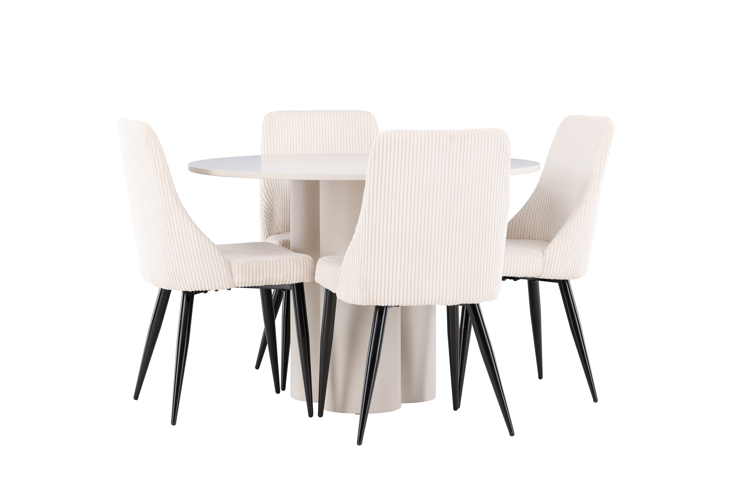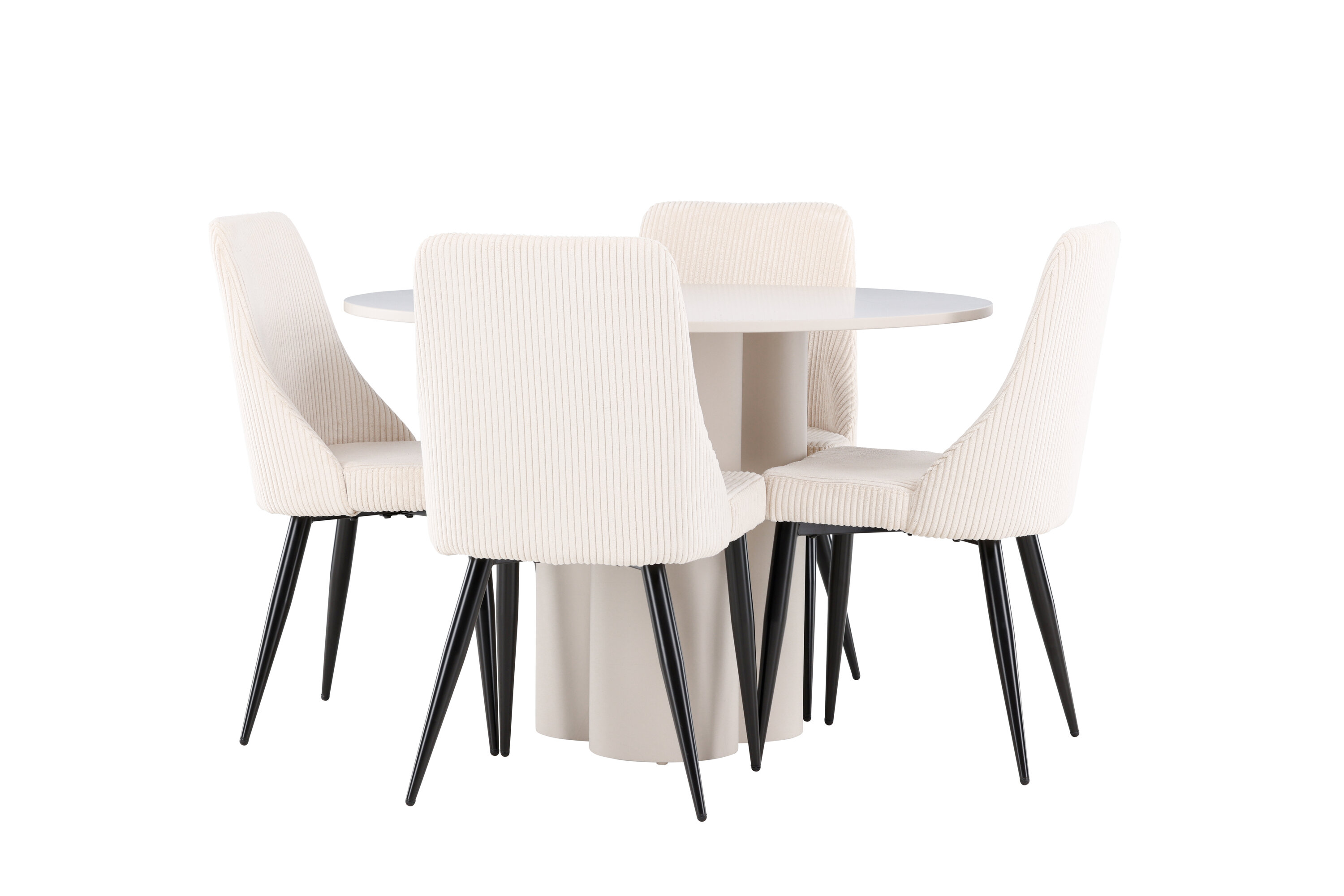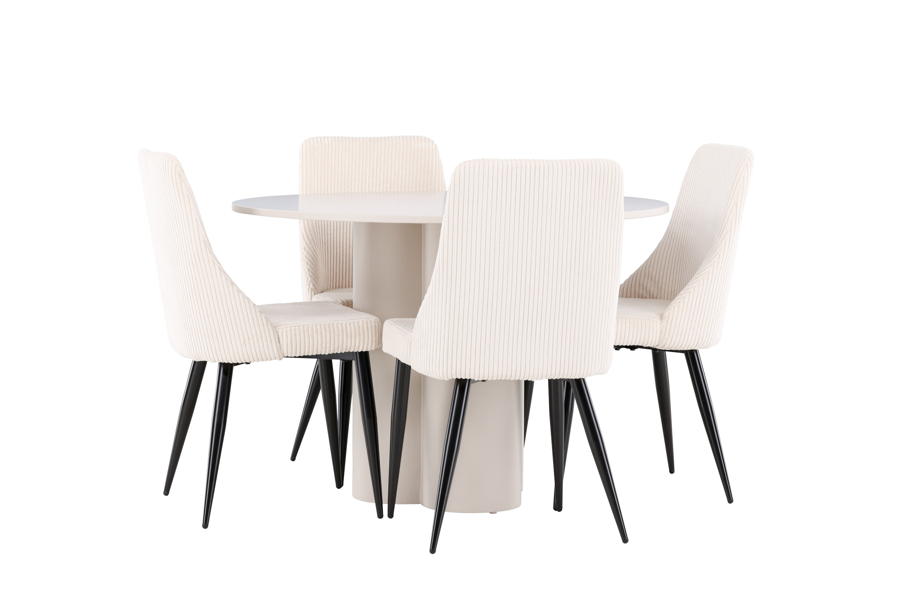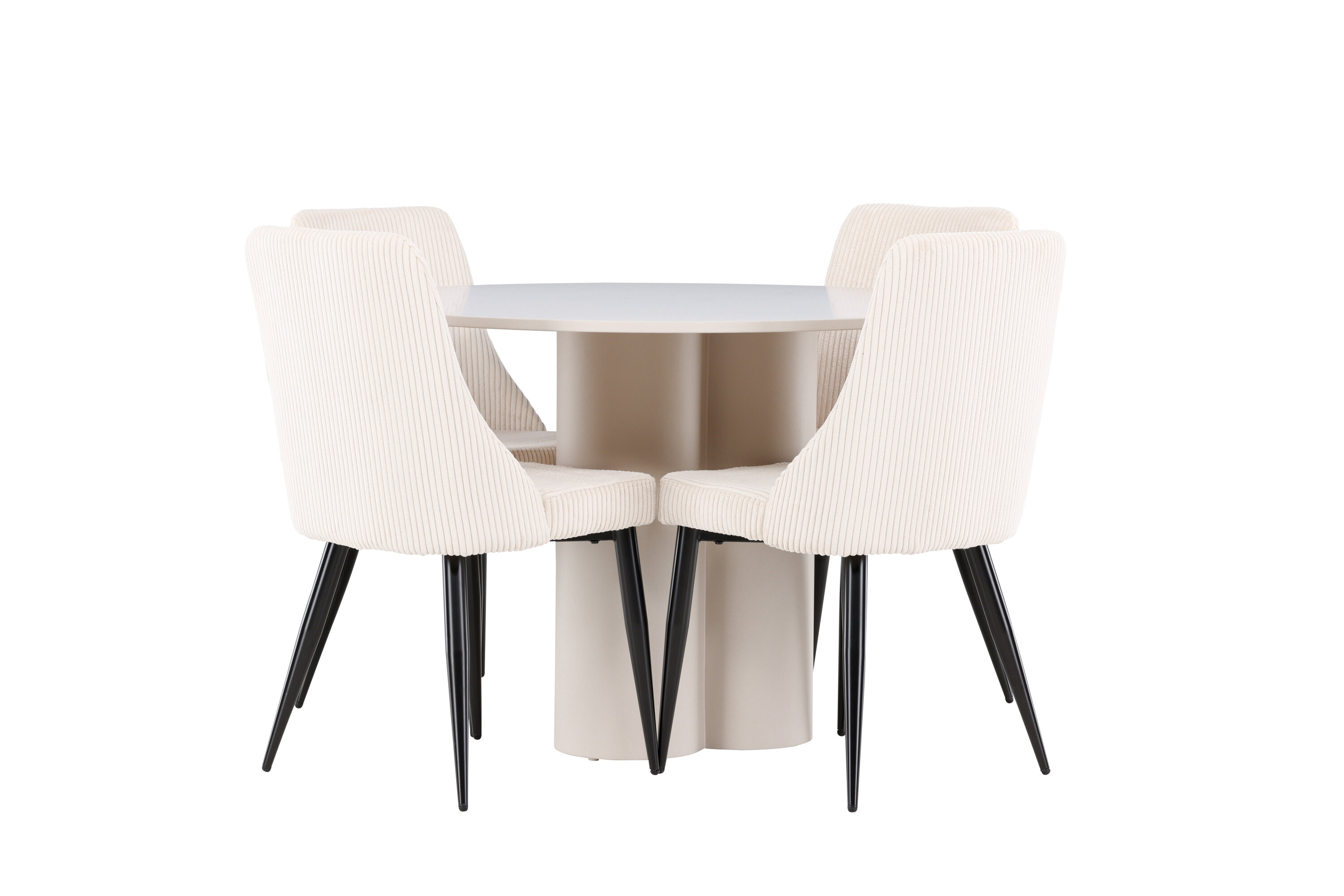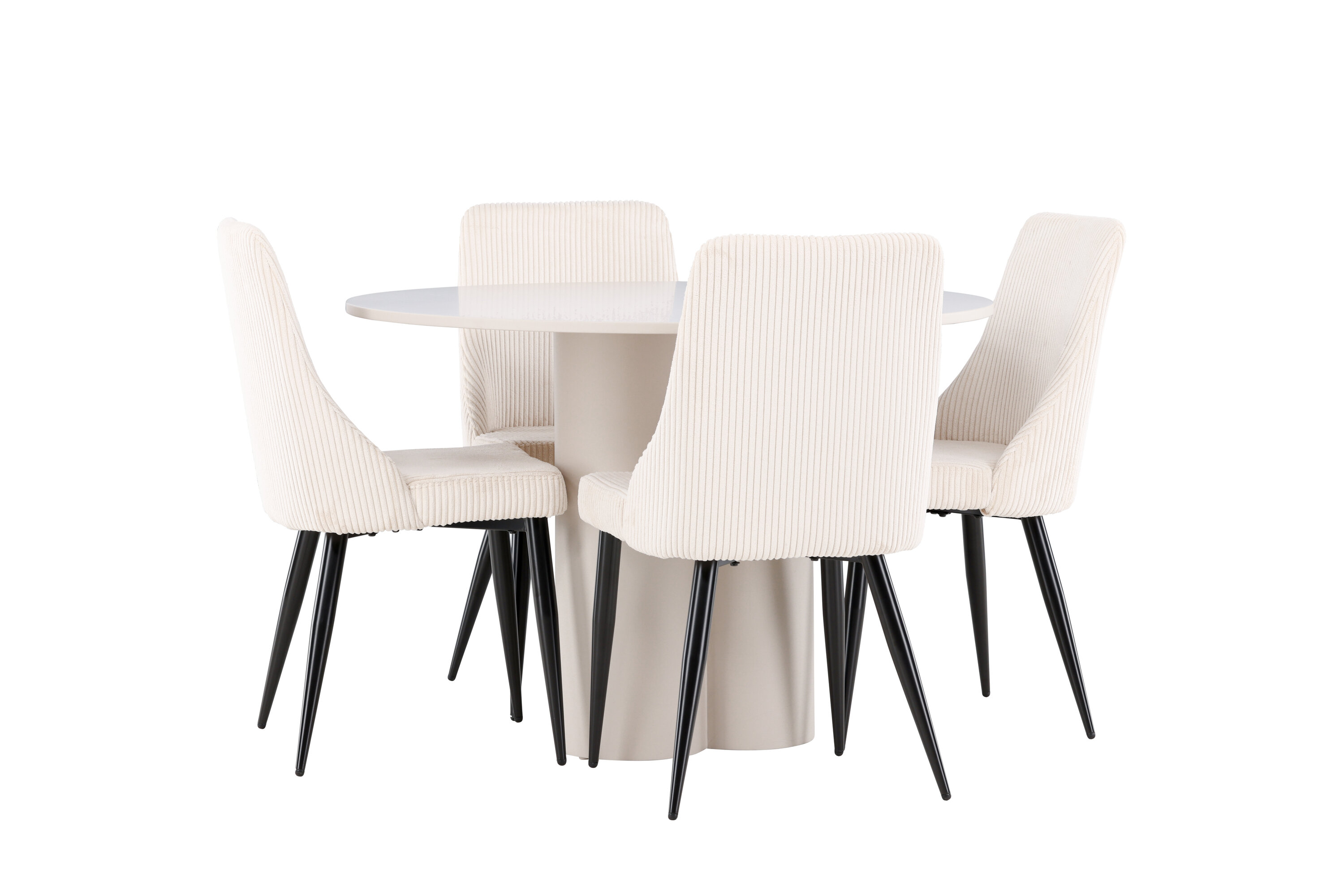 Looge elegantne ja kutsuv söögituba meie stiilse söögigrupiga, mis ühendab Olivia laua ja keerukate Leone toolidega. See söögituba, mis sobib ideaalselt nii igapäevasteks õhtusöökideks kui ka pidulikeks sündmusteks, loob teie söögitoale kaasaegse ja harmoonilise atmosfääri. MDF-st valmistatud Olivia laual on helebeež värv, mis lisab teie söögitoale sooja ja kutsuva tunde. 110 cm läbimõõduga laud pakub rohkelt ruumi söögiks ja vestlusteks, ümar kuju loob aga tasakaalustatud ja sotsiaalse keskkonna. Laua vastupidav konstruktsioon tagab pikaajalise kasutuse ja stabiilsuse. Neli Leone tooli täiendavad lauda suurepäraselt oma elegantsete beeži velvetiga kaetud istmetega. Need toolid pakuvad nii mugavust kui ka stiili, muutes need ideaalseks pikaks ja nauditavaks õhtusöögiks pere ja sõpradega. Nende kaasaegne disain koos kõrgete seljatugede ja pehmete istmetega annab teie söögitoale rafineeritud ja kaasaegse ilme. See söögituba on ideaalne kombinatsioon esteetikast ja funktsionaalsusest, mistõttu on see suurepärane valik neile, kes otsivad elegantset ja mugavat söögituba. Täiustage oma söögituba Olivia laua ja Leone toolide kombinatsiooniga ning looge koht, kus jagatakse mälestusi ja rõõmu.