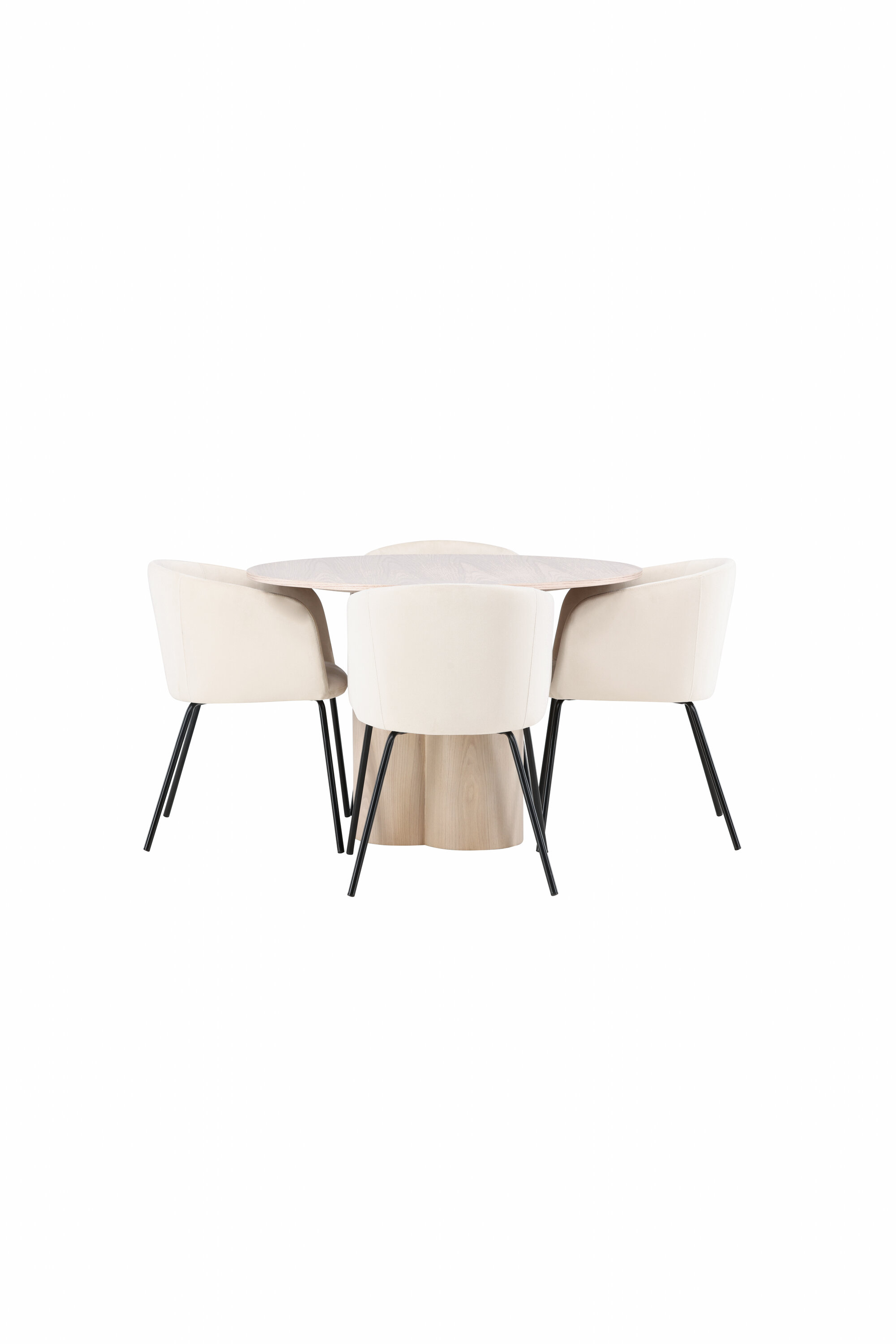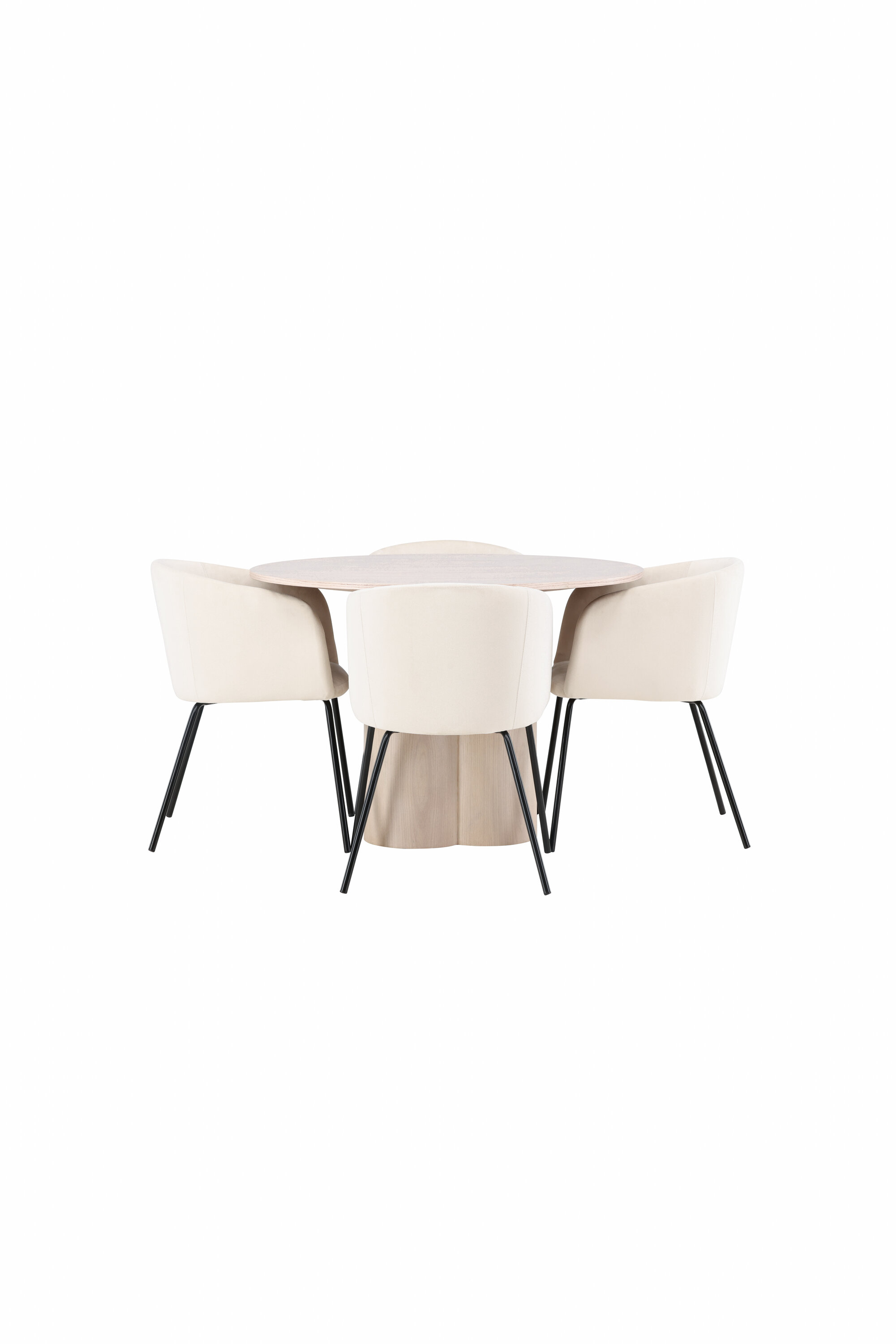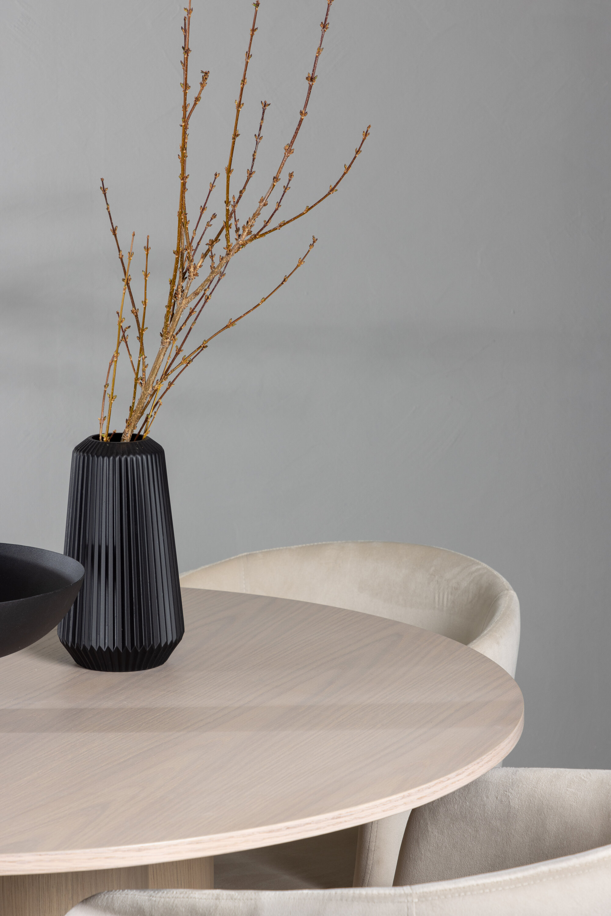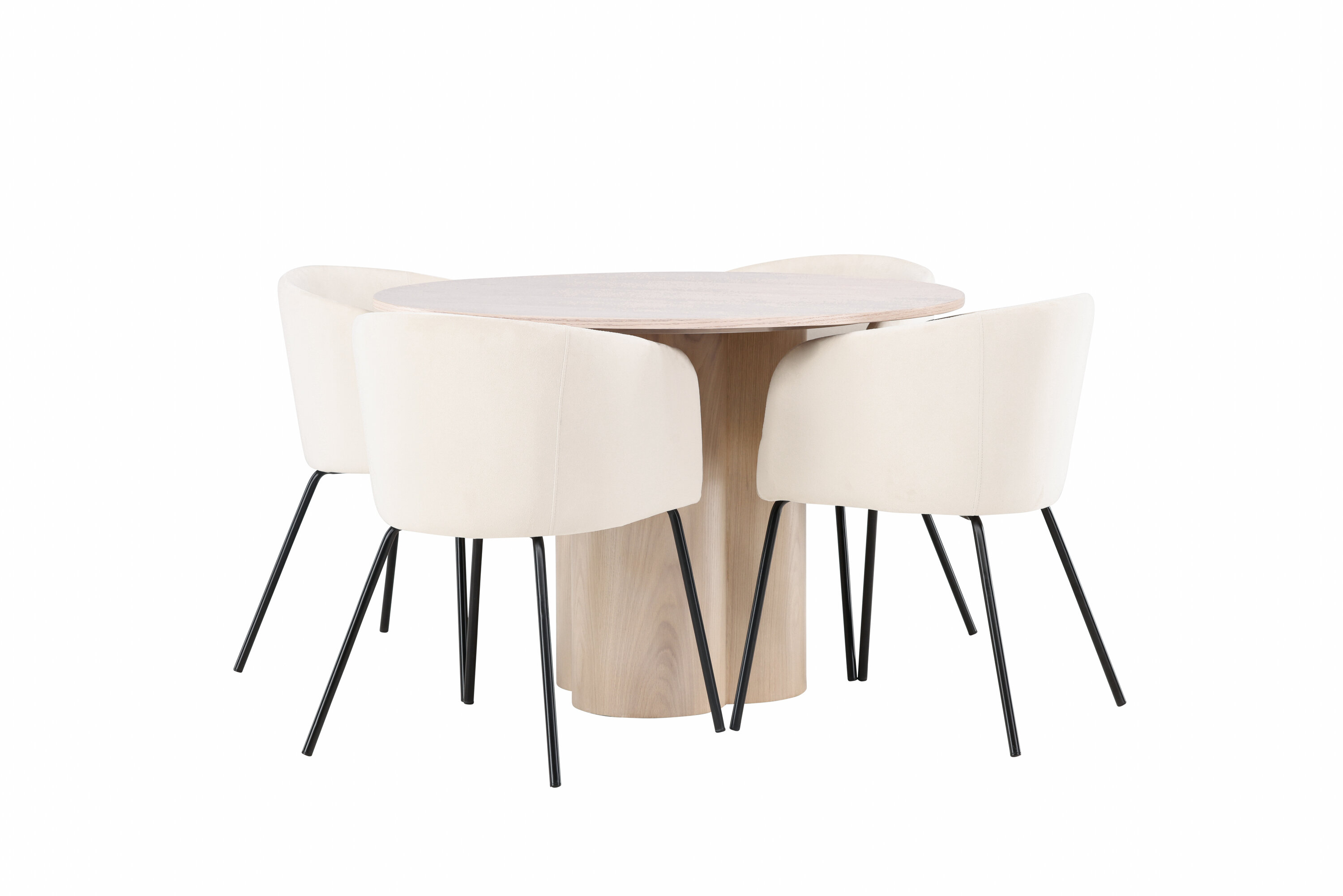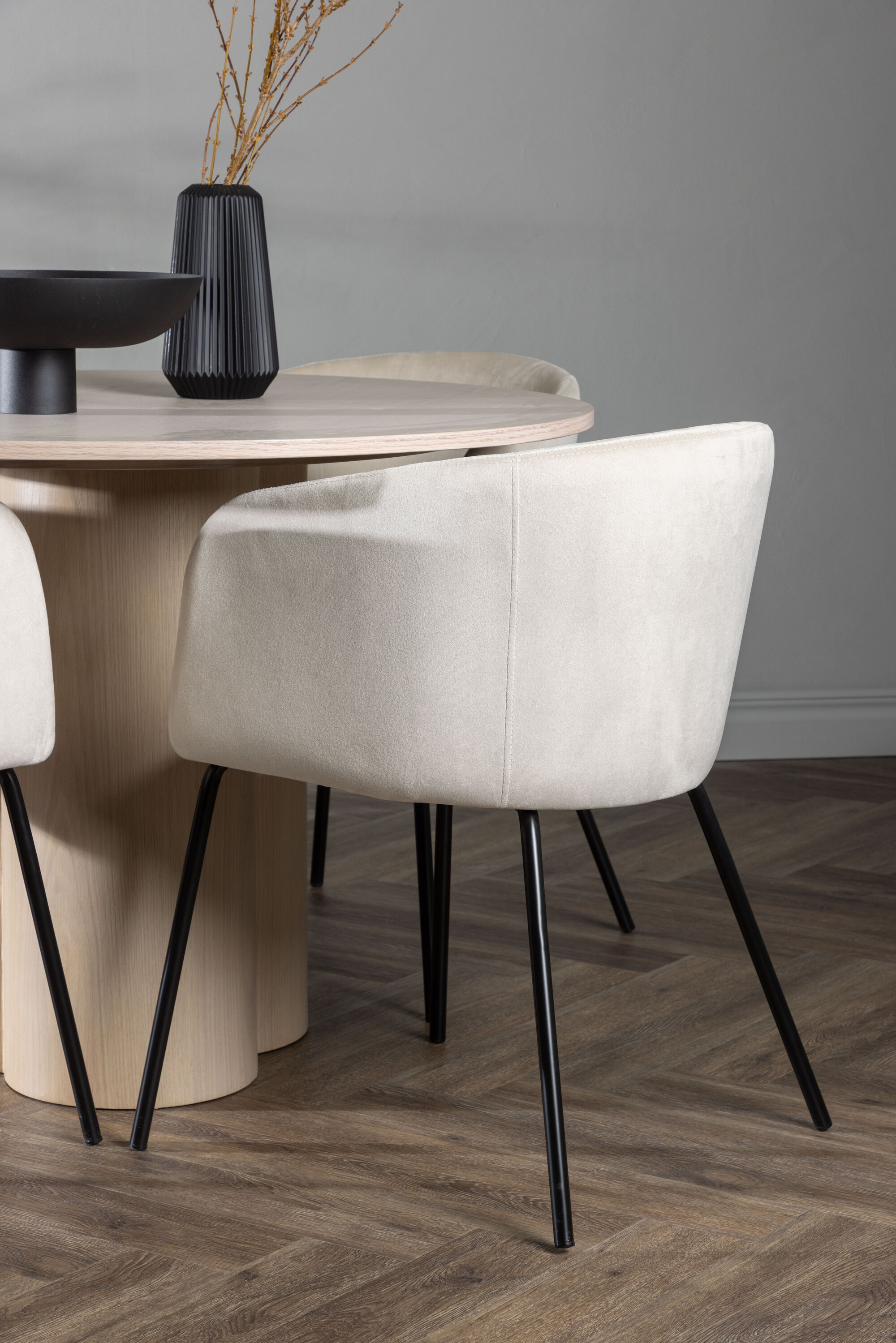 Särav söögiseltskond, mis tõstab kodus mõnusat õhkkonda! Ümmargune söögilaud Olivia avaldab muljet oma skandinaavialiku disainiga. Laual on valgeks lubjatud MDF-plaadist terviklik disain, õhuke ümar ülaosa ja kolm silindrikujulist jalga, mis on koondatud laua keskosa alla. Siin koos meie suurepäraste söögitoolidega Berit. Toolil on täielikult polsterdatud disain, mille seljatugi ja iste on sametkangast ning kitsad mustast rauast jalad. Lihtsalt, imeline kooslus! Laua mõõdud: 110 cm.