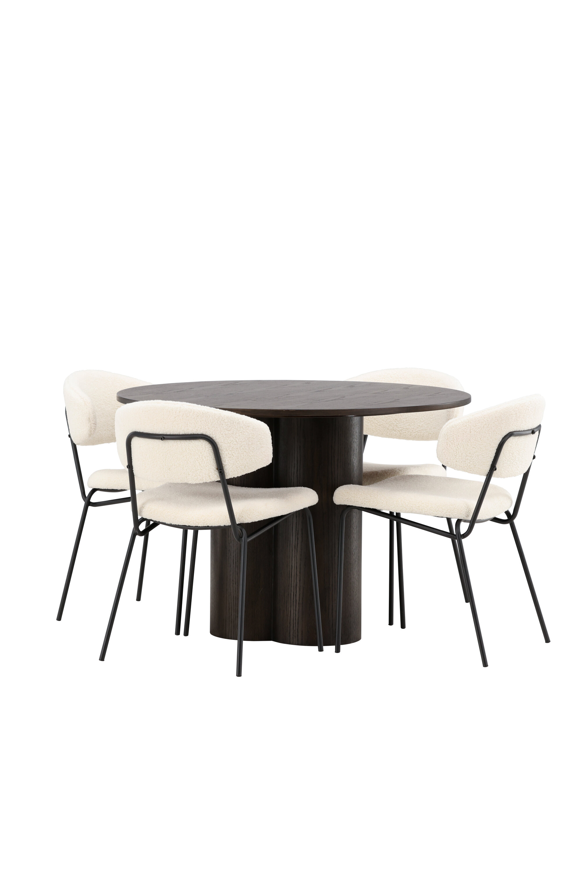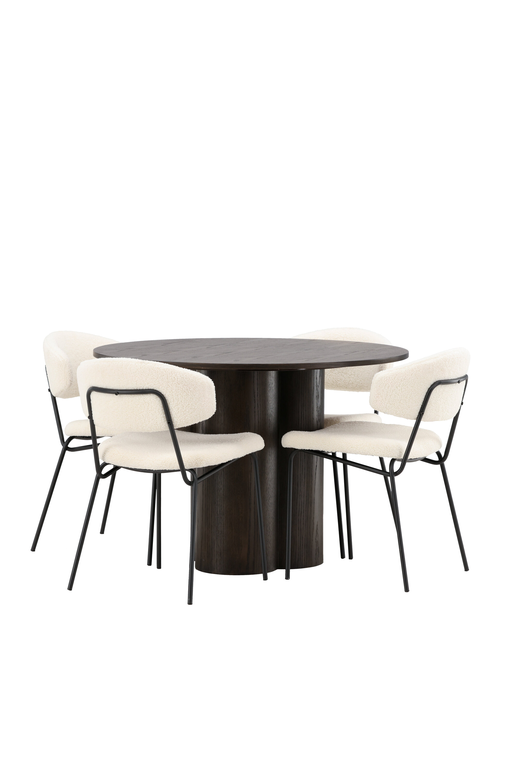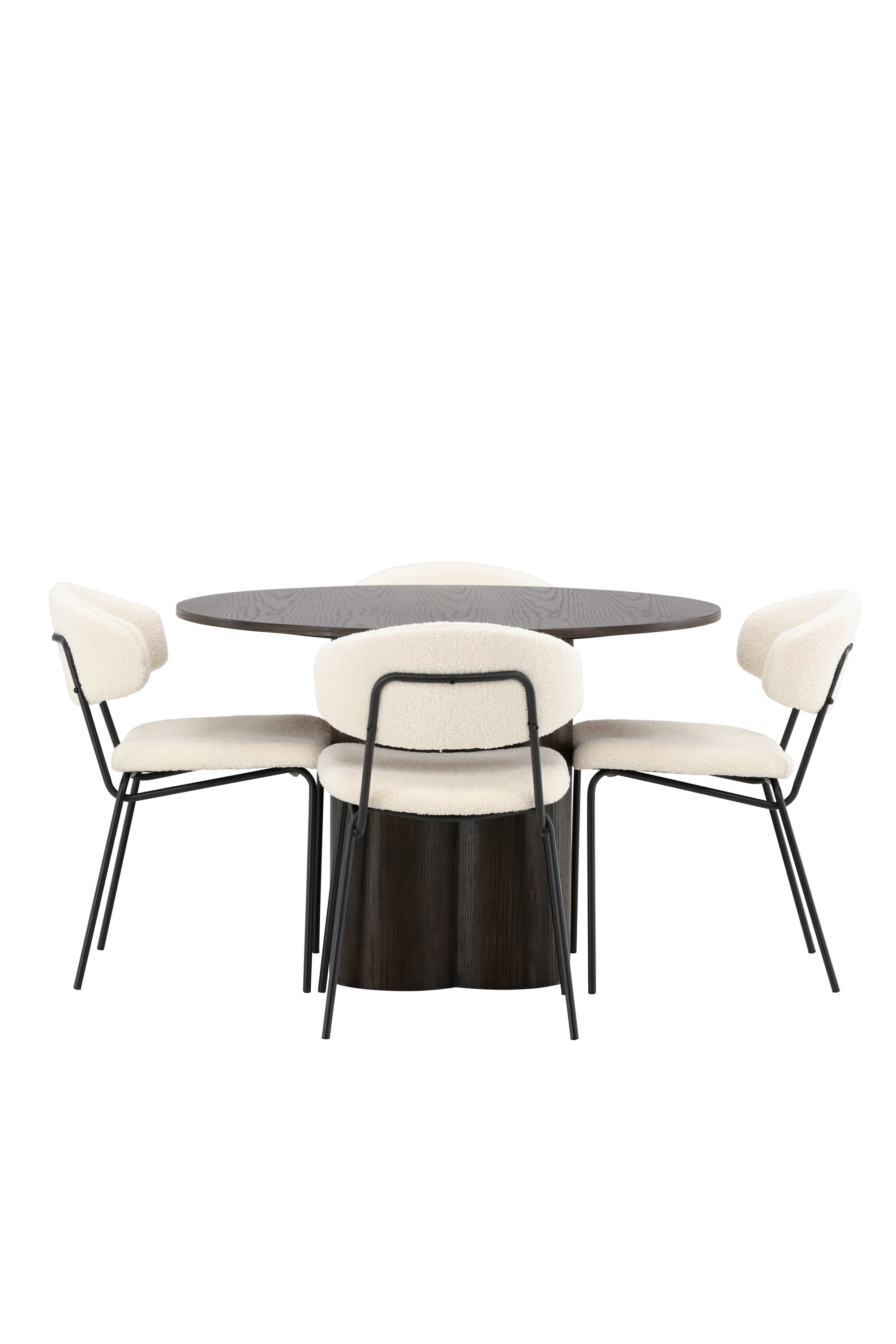 Ideaalne sobivus – see toidugrupp avaldab muljet! Söögilaud Olivia avaldab muljet oma skandinaavialiku disaini ja maitseka disainiga. Laud on maitsekas MDF-plaadist mokavärvi, õhukese ümara ülaosa ja kolme silindrikujulise jalaga, mis on koondatud laua keskosa alla. Siin koos meie trendikate söögitoolidega Chico sarjast. Toolid on minimalistliku ja mugava disainiga, mille seljatugi ja iste on valgest boucle kangast ning kitsas mustast terasest raam. Siit saad oma koju hubase pilgupüüdja!