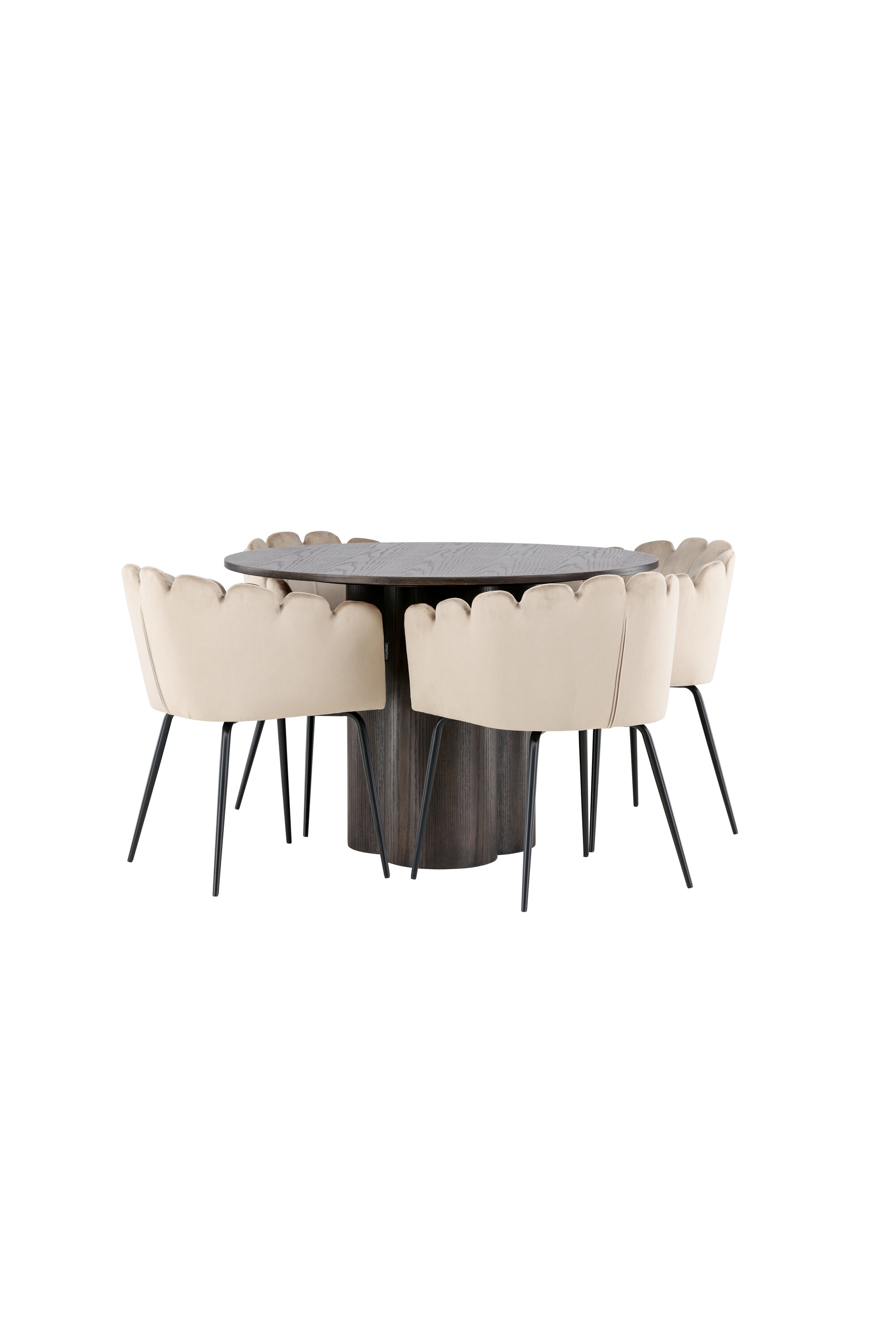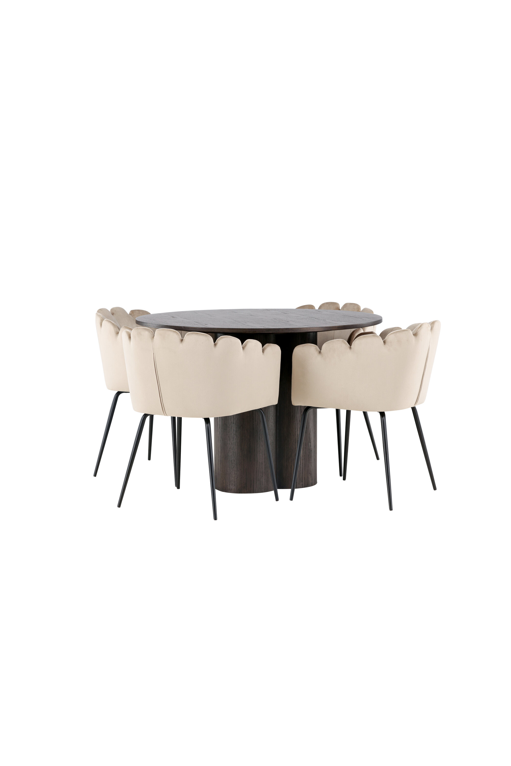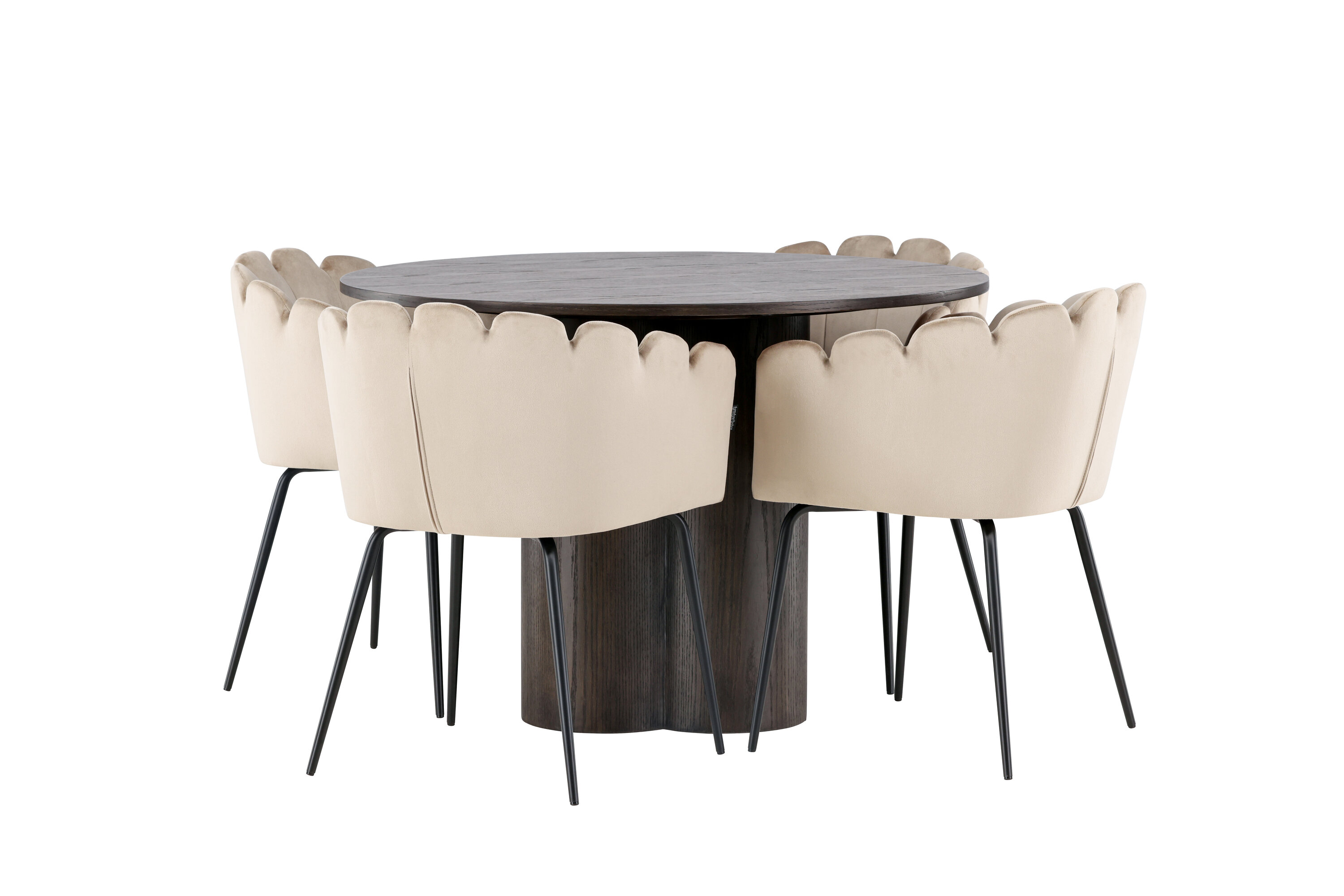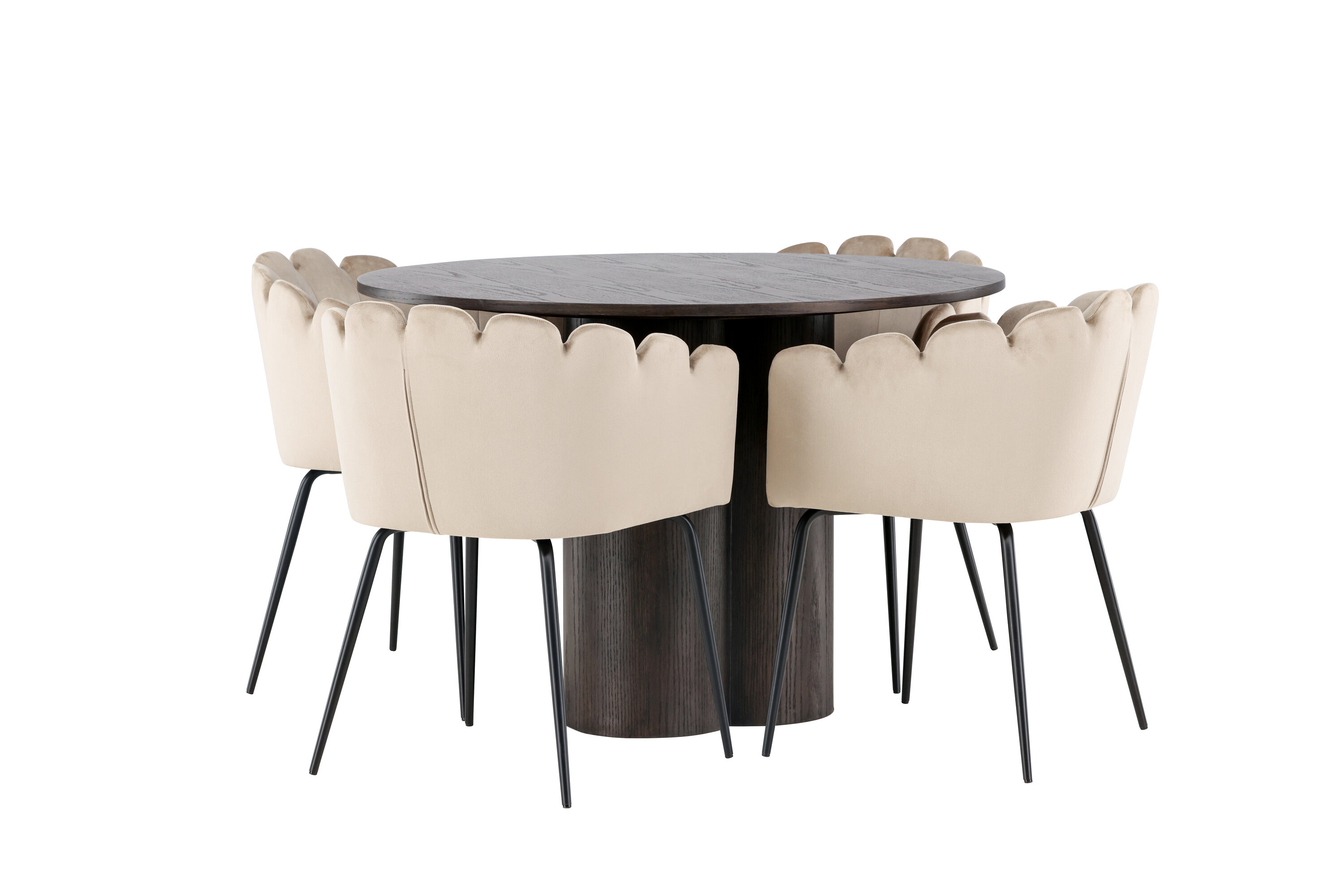 Maalähedased värvid ja pehmed vormid – võluv söögigrupp igaks juhuks! Ümmargune söögilaud Olivia on skandinaavialiku ülddisainiga moodsas mokavärvis. Laual on õhuke MDF lauaplaat ja kolm silindrikujulist jalga, mis on koondatud laua keskosa alla. Värvil on hele kate, mis teeb materjali mustri nähtavaks. Siin koos meie populaarsete Limhamni söögitoolidega. Toolil on kutsuv disain dekoratiivse kestakujulise dekoratiivõmblustega seljatoe ja maitsekalt beežist sametkangast ümara istmega. Jalad on musta pulbervärvitud metallist. Laua mõõdud: 110 cm.