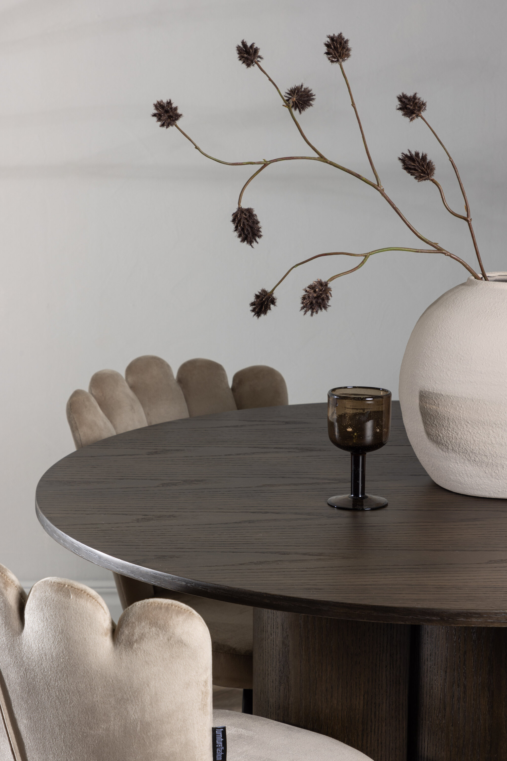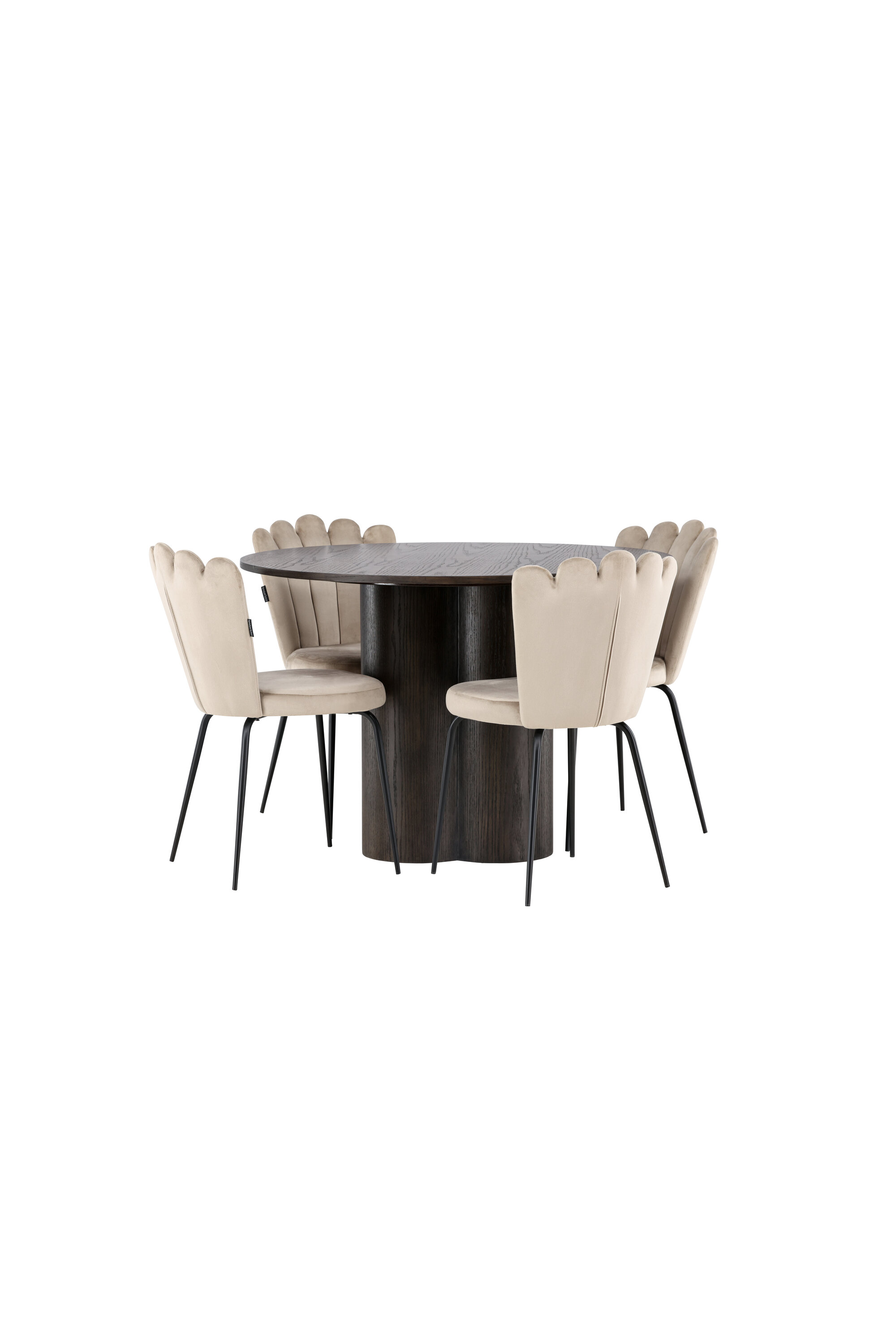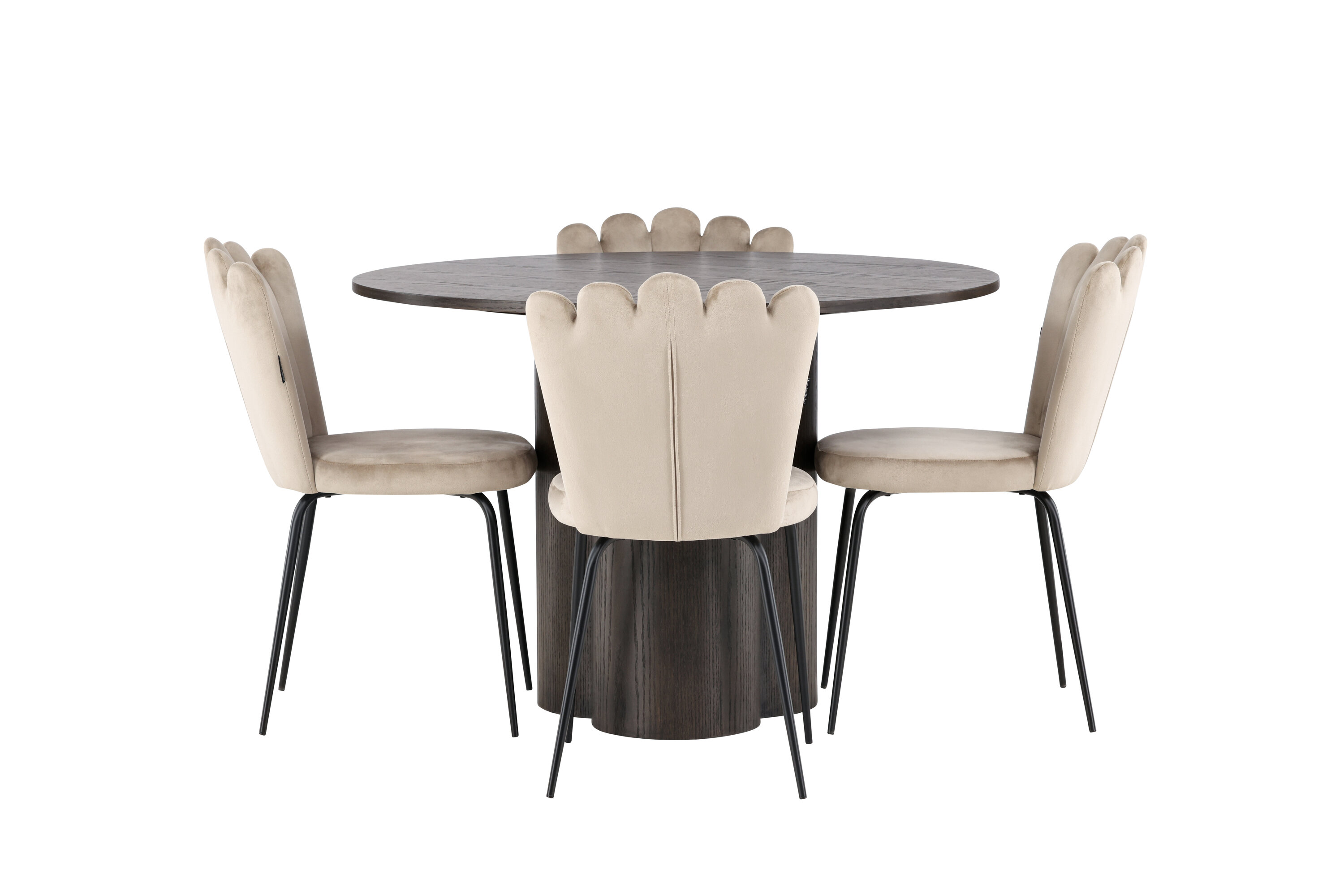 Sära ja võluga söögigrupp! Ümmargune söögilaud Olivia on skandinaavialiku ülddisainiga moodsas mokavärvis. Laual on õhuke MDF lauaplaat ja kolm silindrikujulist jalga, mis on koondatud laua keskosa alla. Värvil on hele kate, mis teeb materjali mustri nähtavaks. Siin moodsas kombinatsioonis Limhamni sarja beežide söögitoolidega. Toolil on kutsuv disain dekoratiivse kestakujulise dekoratiivõmblustega seljatoe ja maitsekalt beežist sametkangast ümara istmega. Jalad on musta pulbervärvitud metallist. Siin ei satu keegi äärele! Laua mõõdud: 110 cm.