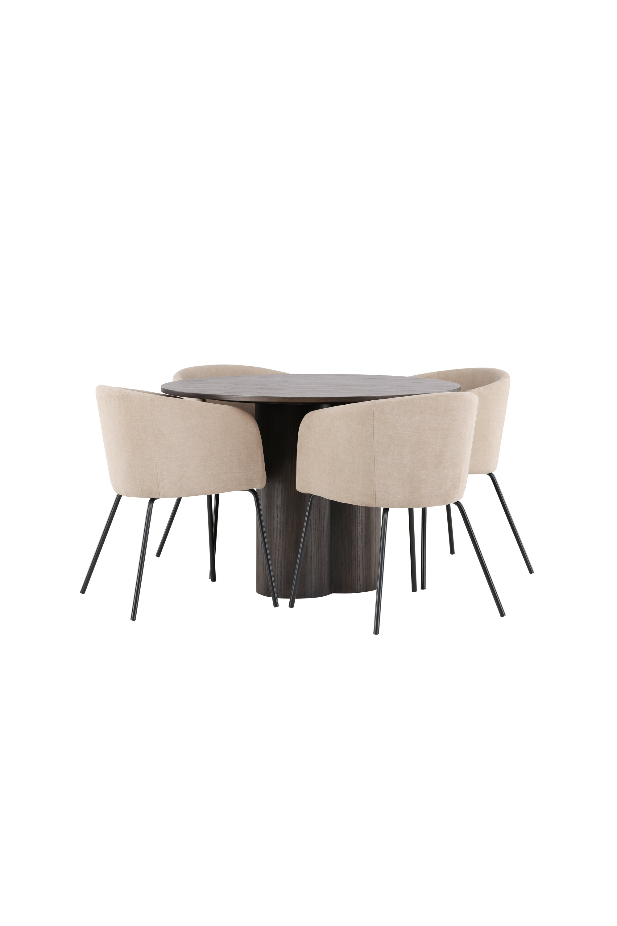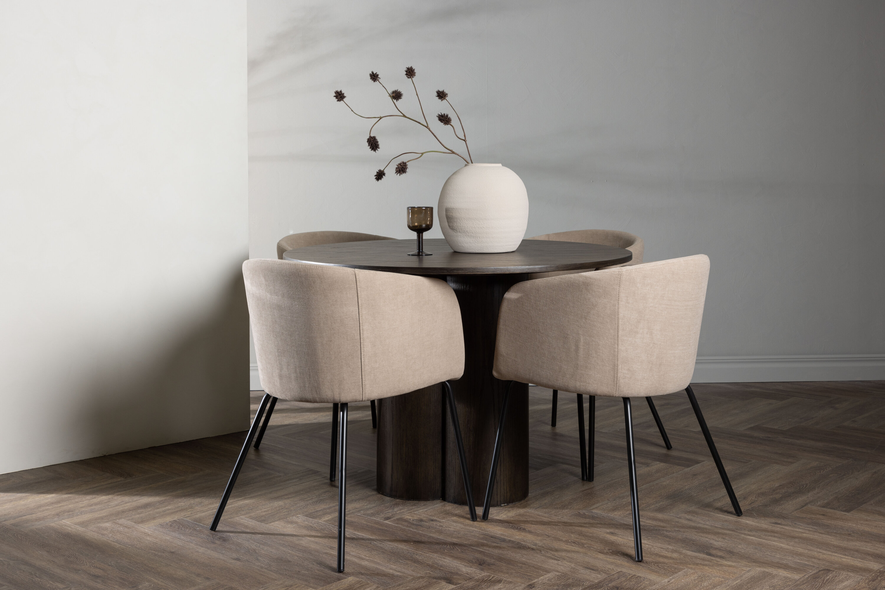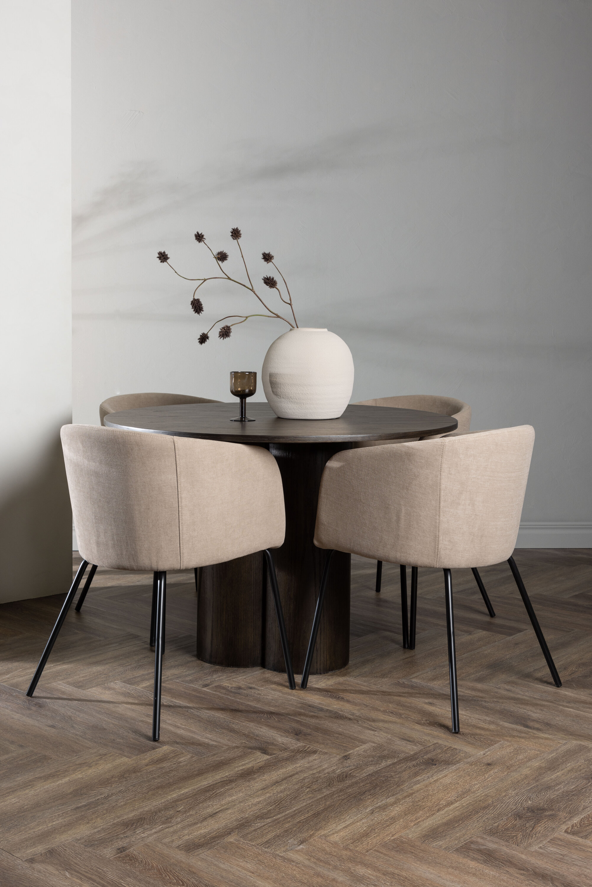Maalähedased värvid soojendavad teie kodu atmosfääri! Ümmargune söögilaud Olivia on skandinaavialiku ülddisainiga moodsas mokavärvis. Laual on õhuke MDF lauaplaat ja kolm silindrikujulist jalga, mis on koondatud laua keskosa alla. Värvil on hele kate, mis teeb materjali mustri nähtavaks. Siin koos meie mugavate söögitoolidega Berit. Toolil on täielikult polsterdatud disain, kergelt ümardatud seljatugi ja iste polüesterlinast ning kitsad mustast rauast jalad. Siin peaks olema hea end sisse seada! Laua mõõdud: 110 cm.