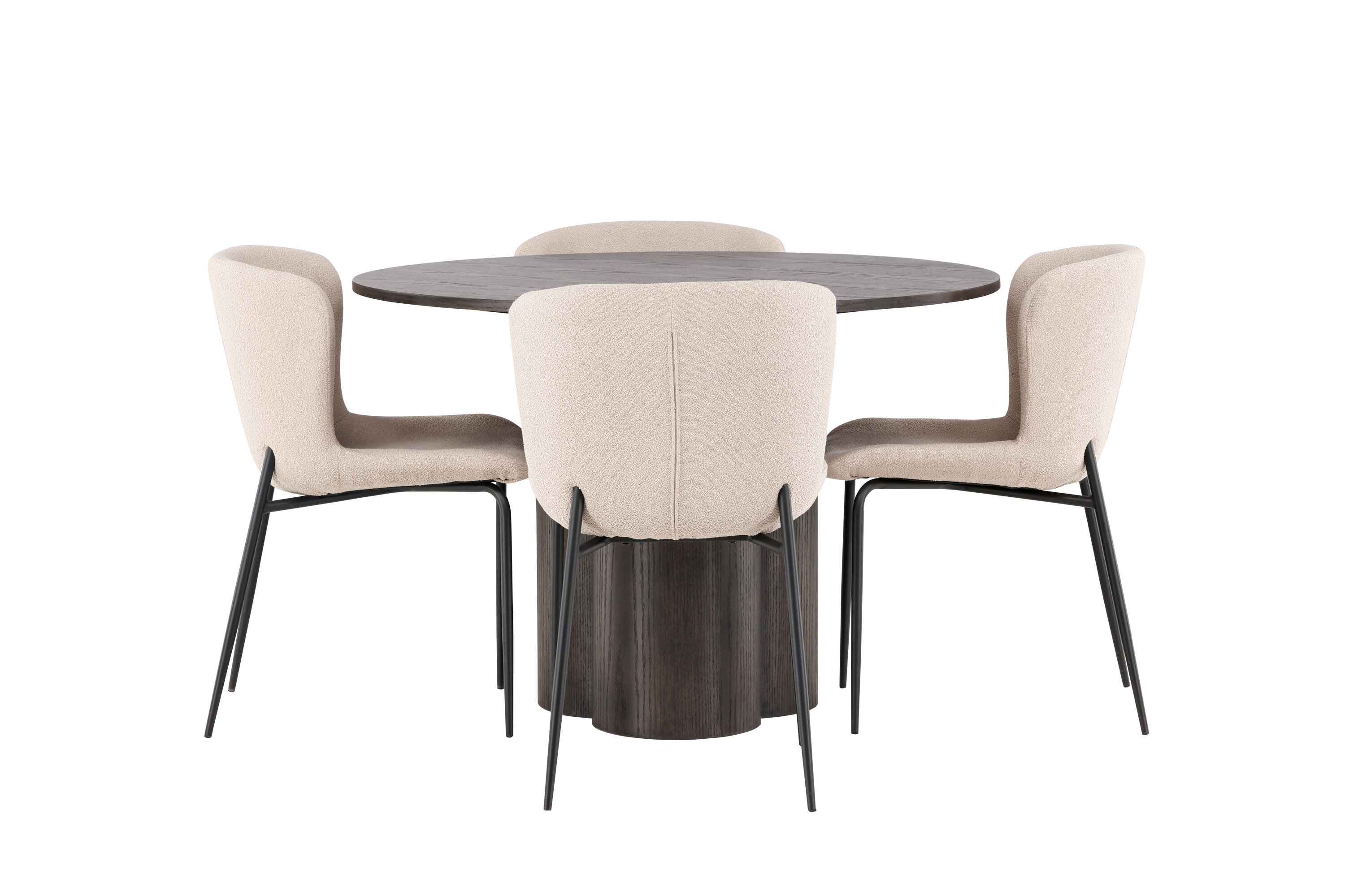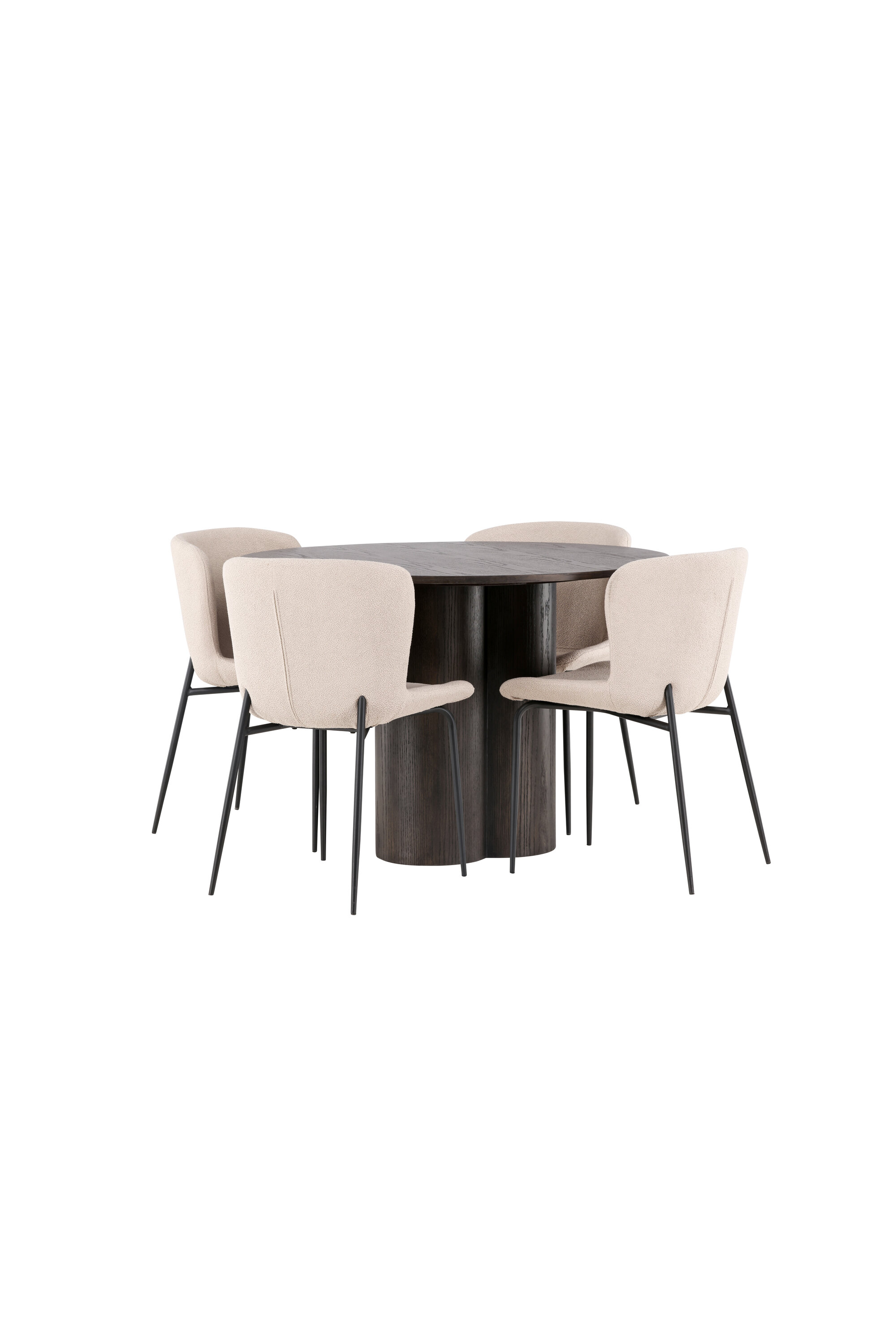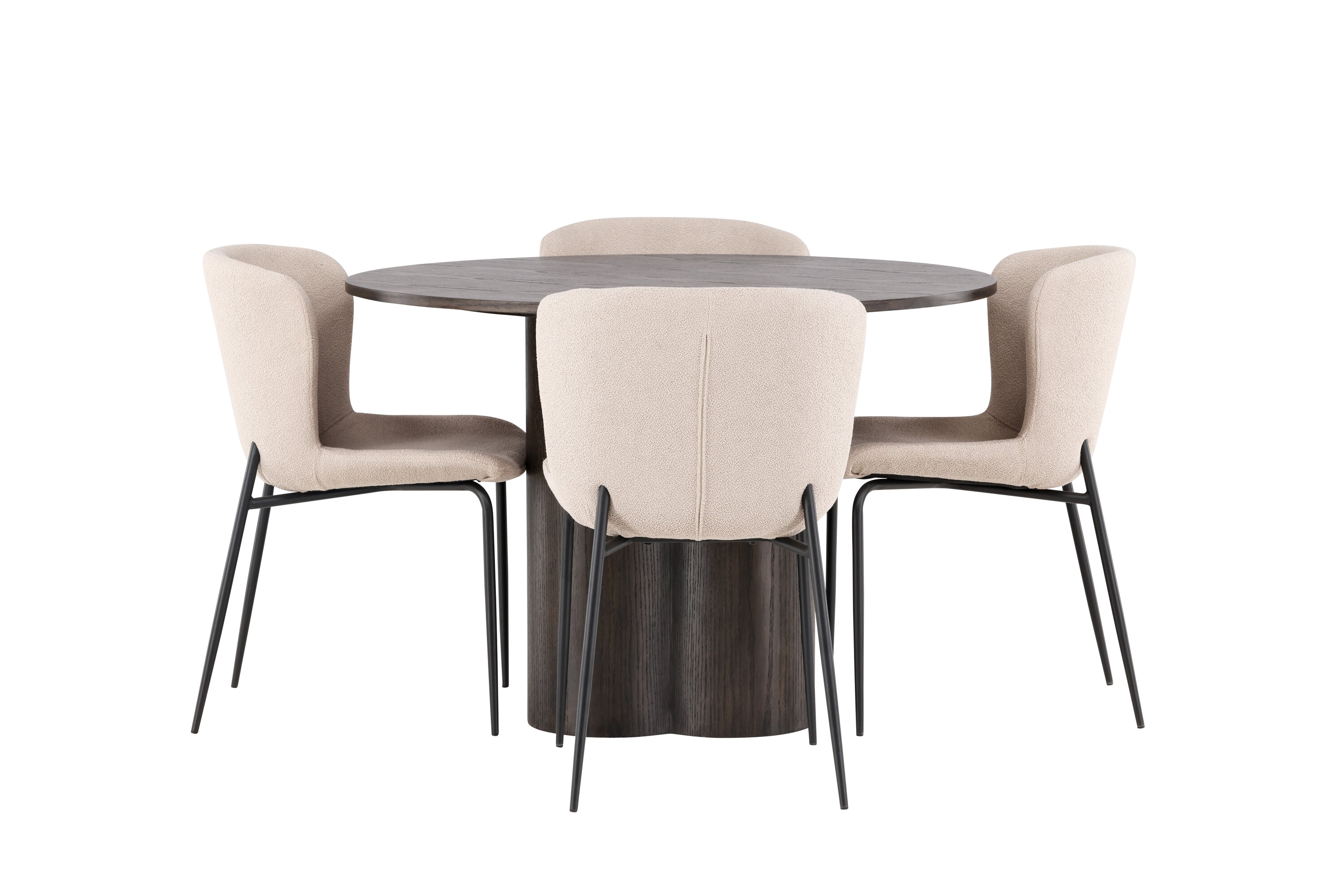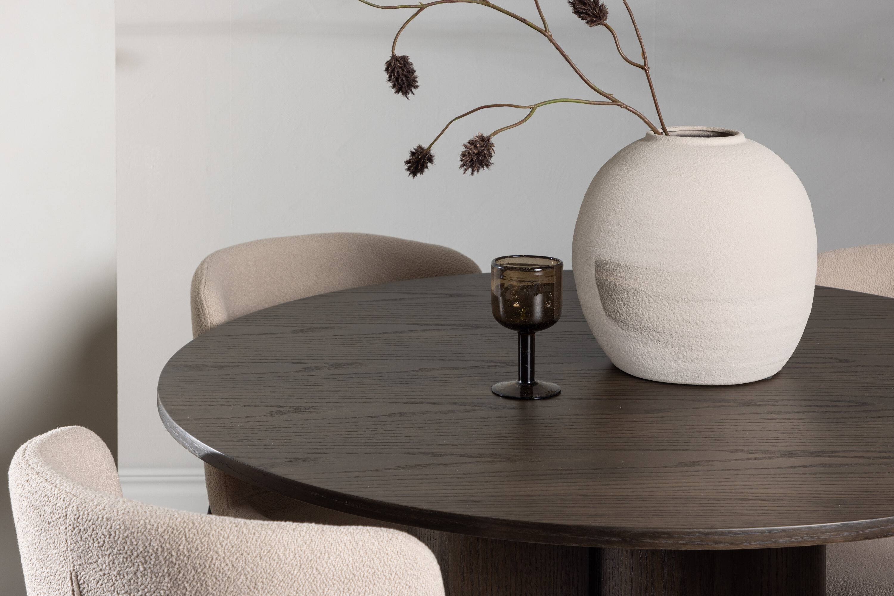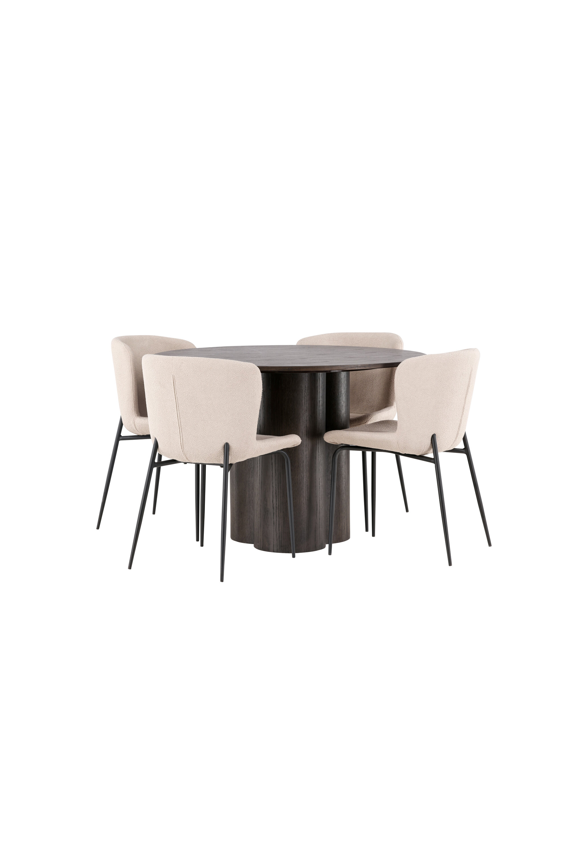 Siin ei satu keegi äärele! Ümmargune söögilaud Olivia on skandinaavialiku ülddisainiga moodsas mokavärvis. Laual on õhuke MDF lauaplaat ja kolm silindrikujulist jalga, mis on koondatud laua keskosa alla. Värvil on hele kate, mis teeb materjali mustri nähtavaks. Siin koos Modesto sarja moeteadlike söögitoolidega. Tool on täielikult polsterdatud beeži karvase kangaga ja stiilsed kitsad mustast metallist jalad. Kergelt ümar seljatugi ja polsterdatud istmepadi pakuvad lisamugavust ja pikendavad söögilaua ümber mõnusaid eineid. Luksuslik, stiilne ja mugav! Laua mõõdud: 110 cm.