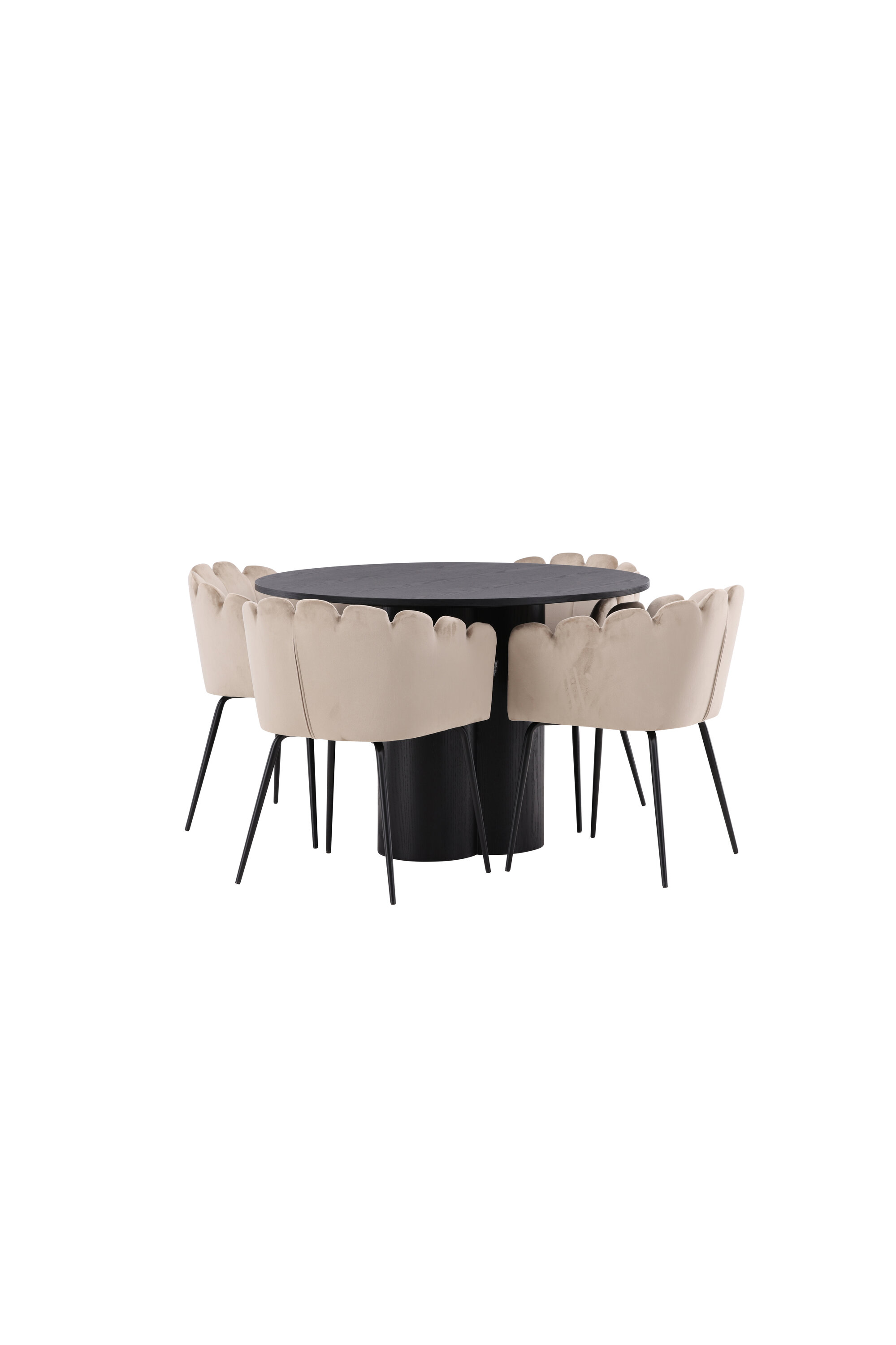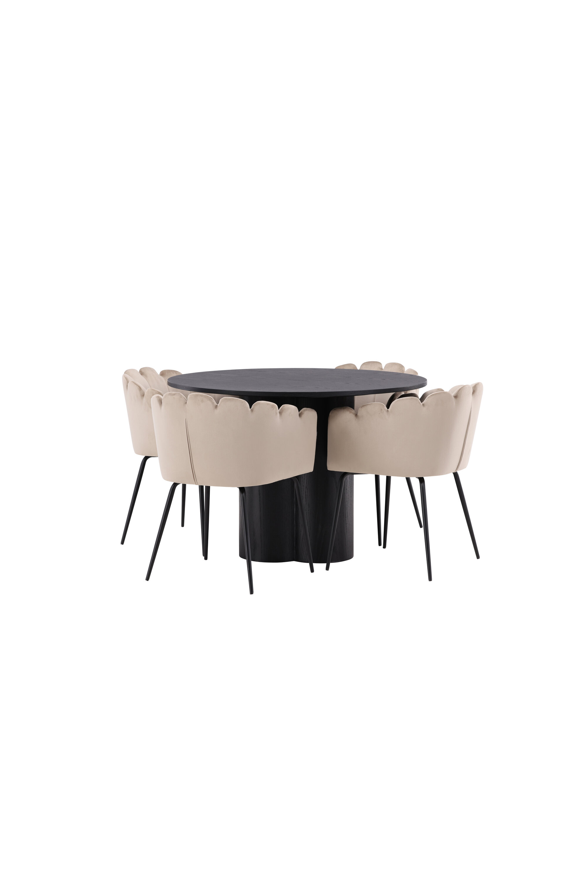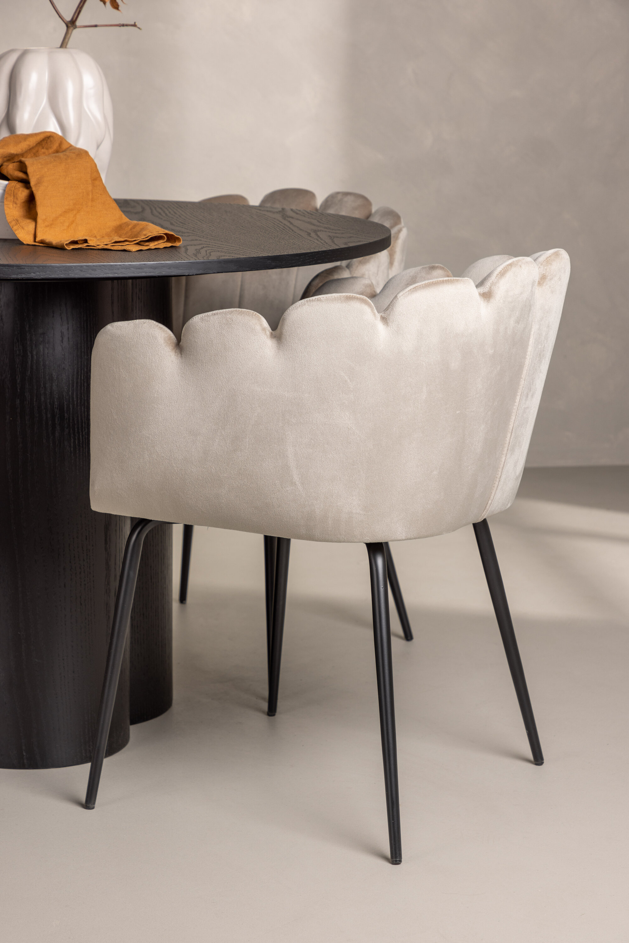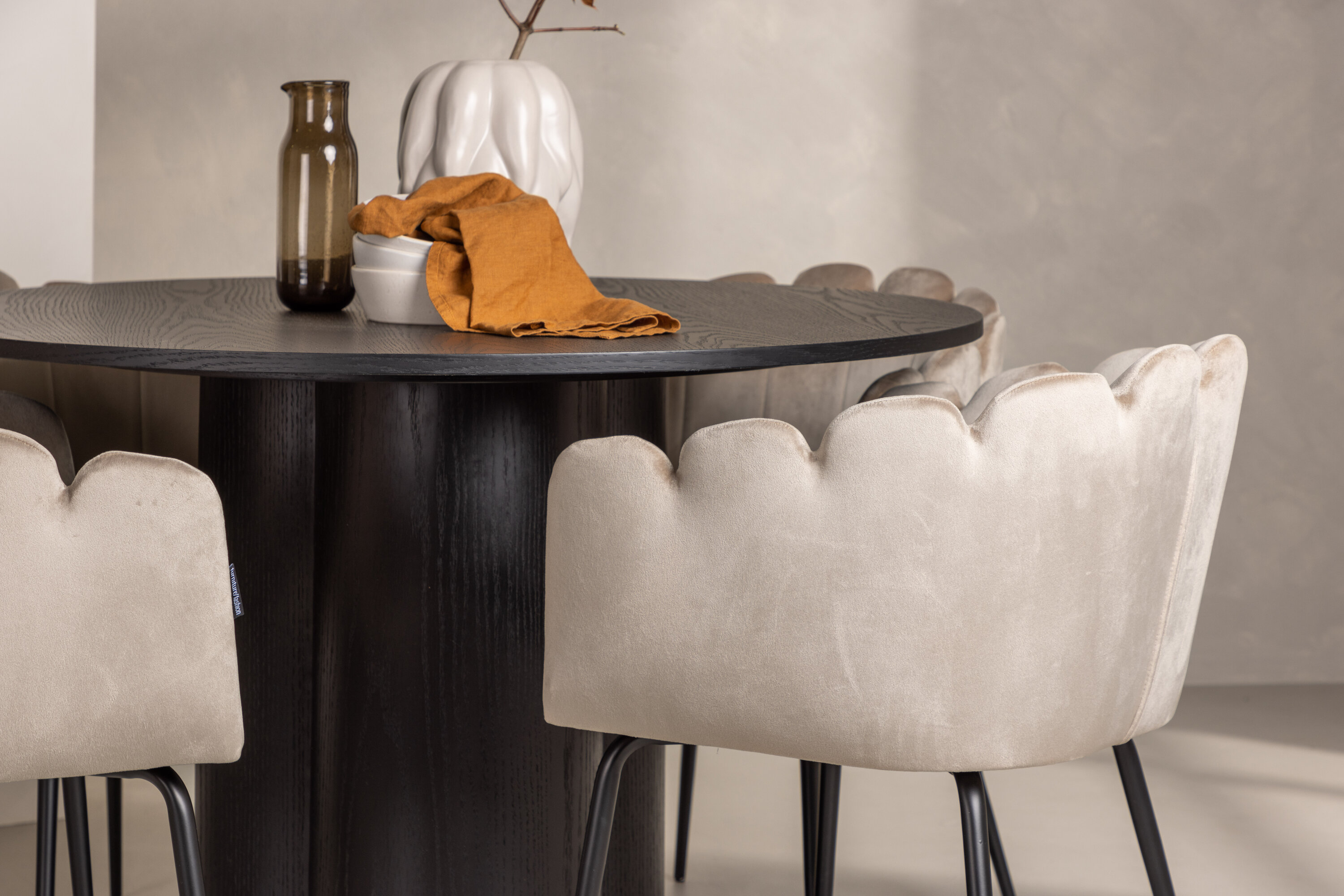Istuge mugavalt ja kutsuge edaspidi seltskondlikule einele – siin ei satu keegi äärepealt. Söögilaud Olivia avaldab muljet oma skandinaavialiku ja maitseka disainiga. Laual on kõikehõlmav terviklik disain populaarses mokavärvitoonis. Ümmargune plaat on MDF-ist ja raam koosneb kolmest silindrikujulisest jalast, mis on koondatud laua keskosa alla. See sobib ideaalselt meie Limhamni seeria luksuslike toolidega. Toolil on kutsuv disain dekoratiivse kestakujulise dekoratiivse õmblusega seljatoe ja ümmarguse ilusast beežist sametkangast istmega. Jalad on musta pulbervärvitud metallist. Moodsa välimusega täiuslik söögigrupp!