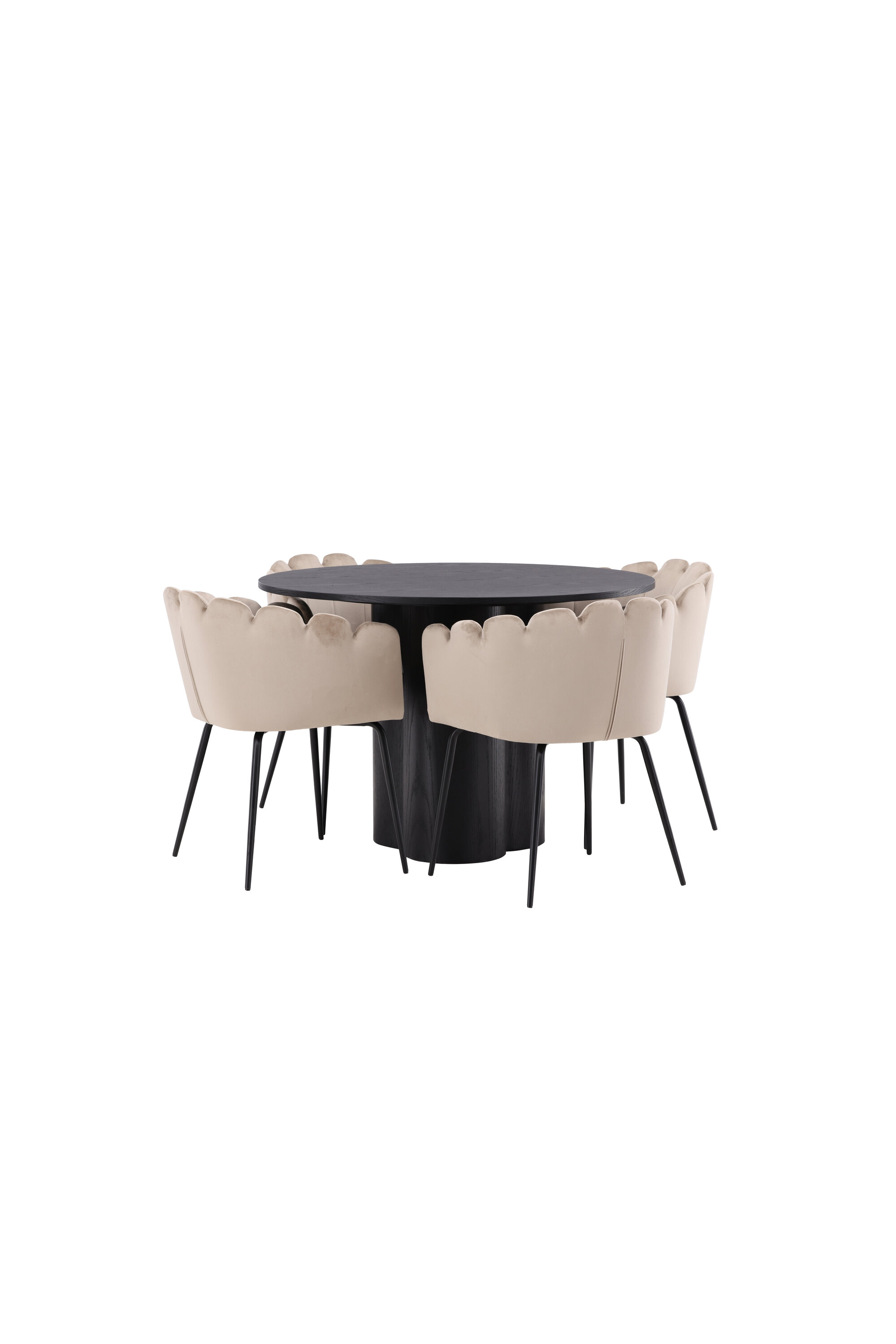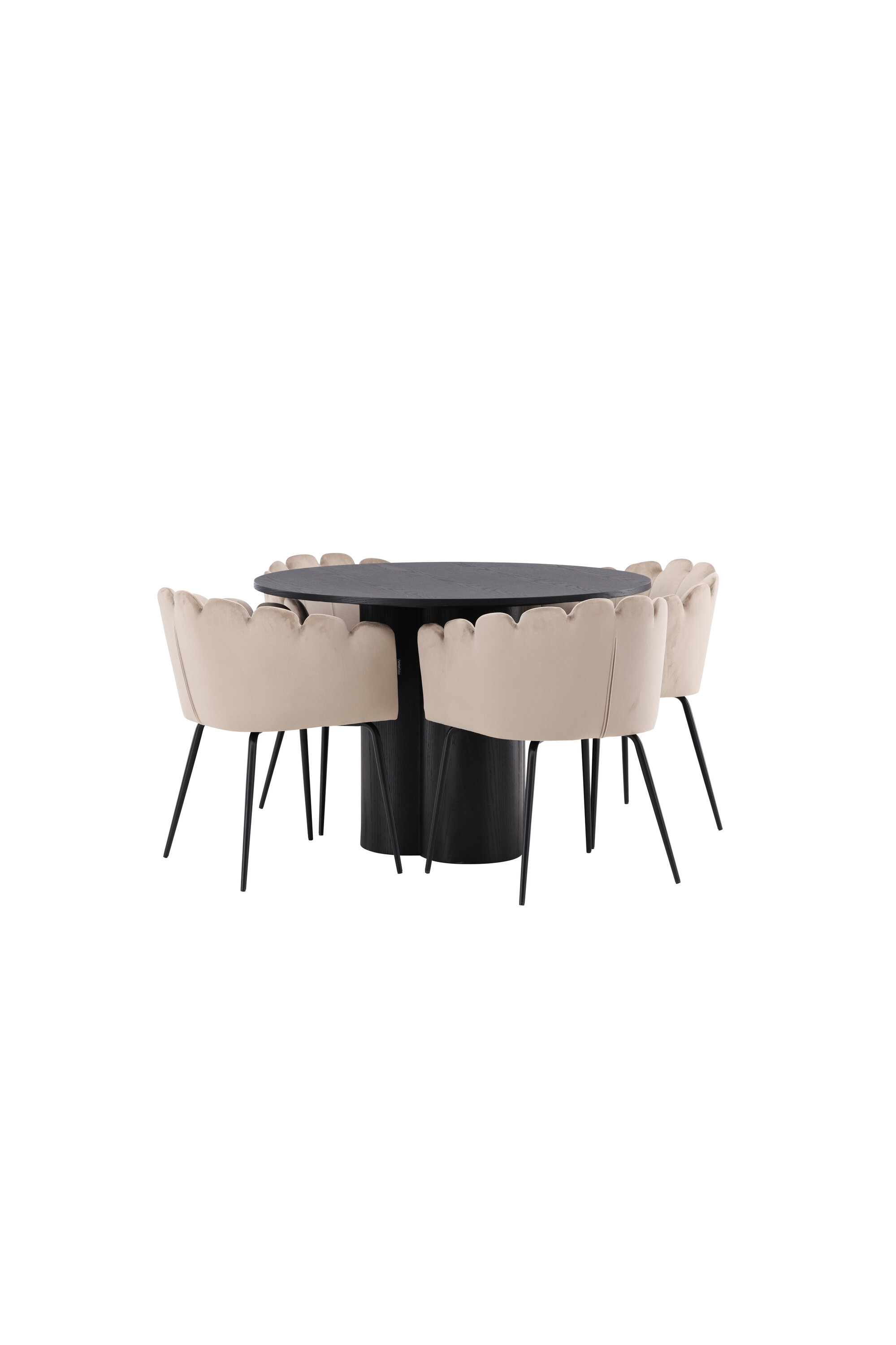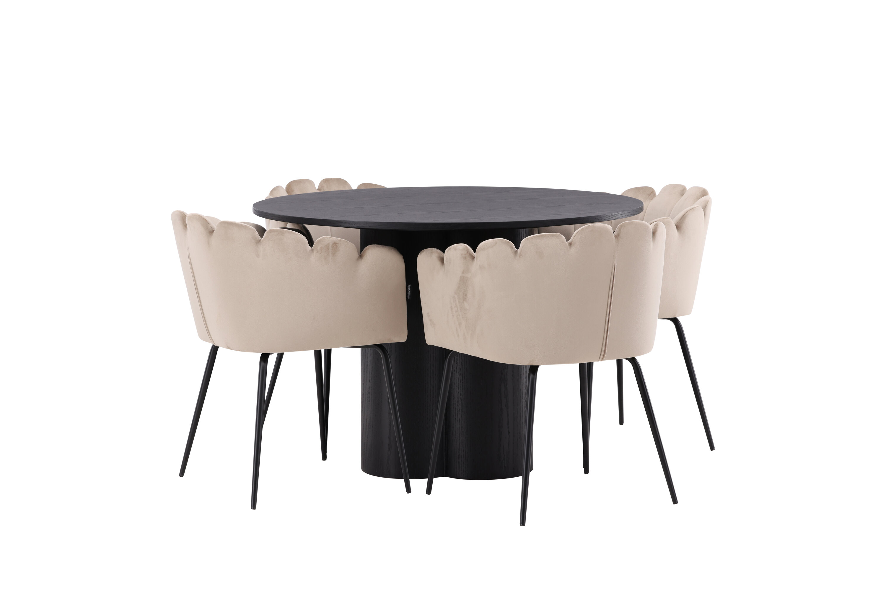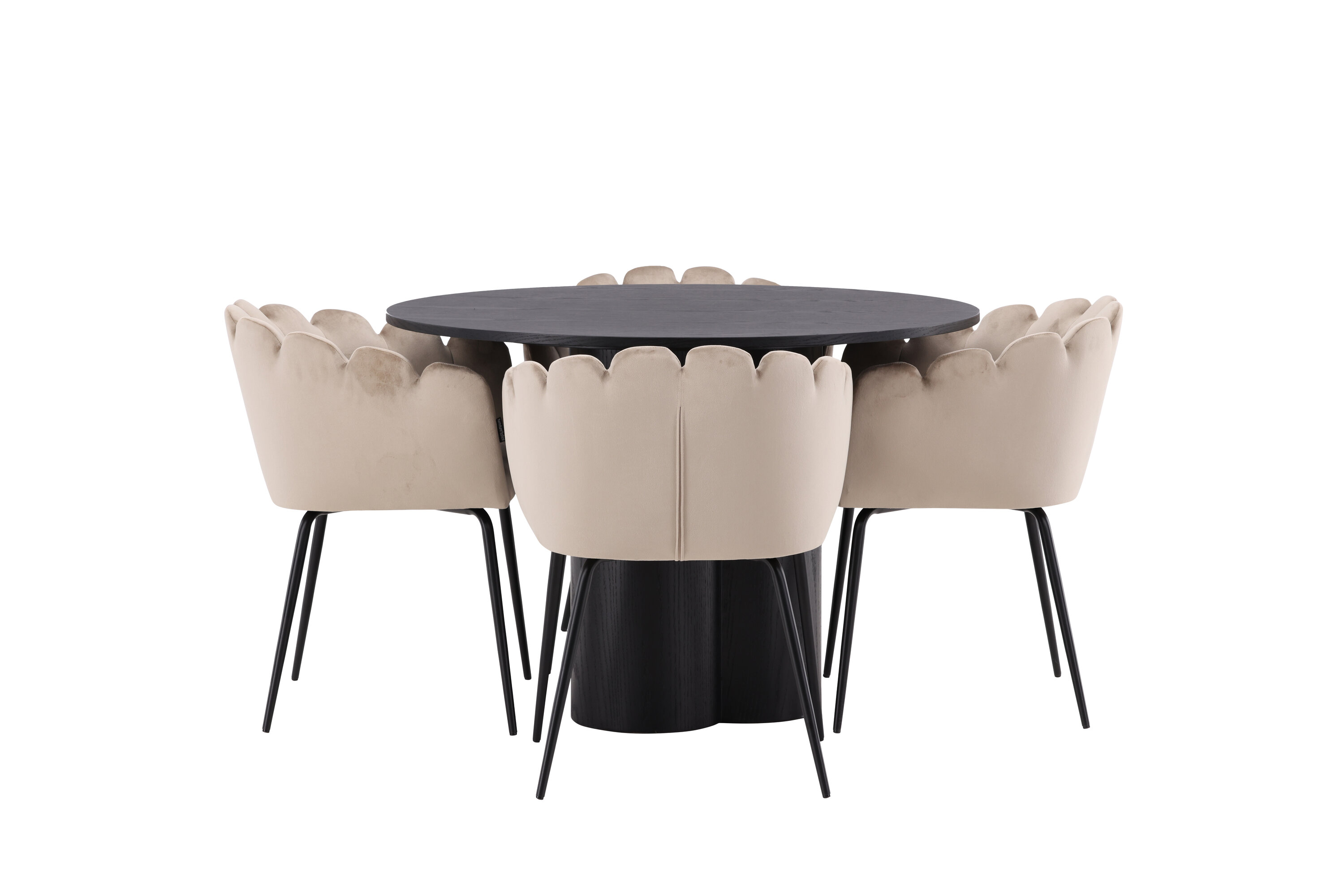 Istuge mugavalt ja kutsuge edaspidi seltskondlikule einele – siin ei satu keegi äärepealt. Söögilaud Olivia avaldab muljet oma skandinaavialiku ja maitseka disainiga. Laual on kõikehõlmav terviklik disain populaarses mokavärvitoonis. Ümmargune plaat on MDF-ist ja raam koosneb kolmest silindrikujulisest jalast, mis on koondatud laua keskosa alla. See sobib ideaalselt meie Limhamni seeria luksuslike toolidega. Toolil on kutsuv disain dekoratiivse kestakujulise dekoratiivse õmblusega seljatoe ja ümmarguse ilusast beežist sametkangast istmega. Jalad on musta pulbervärvitud metallist. Moodsa välimusega täiuslik söögigrupp!