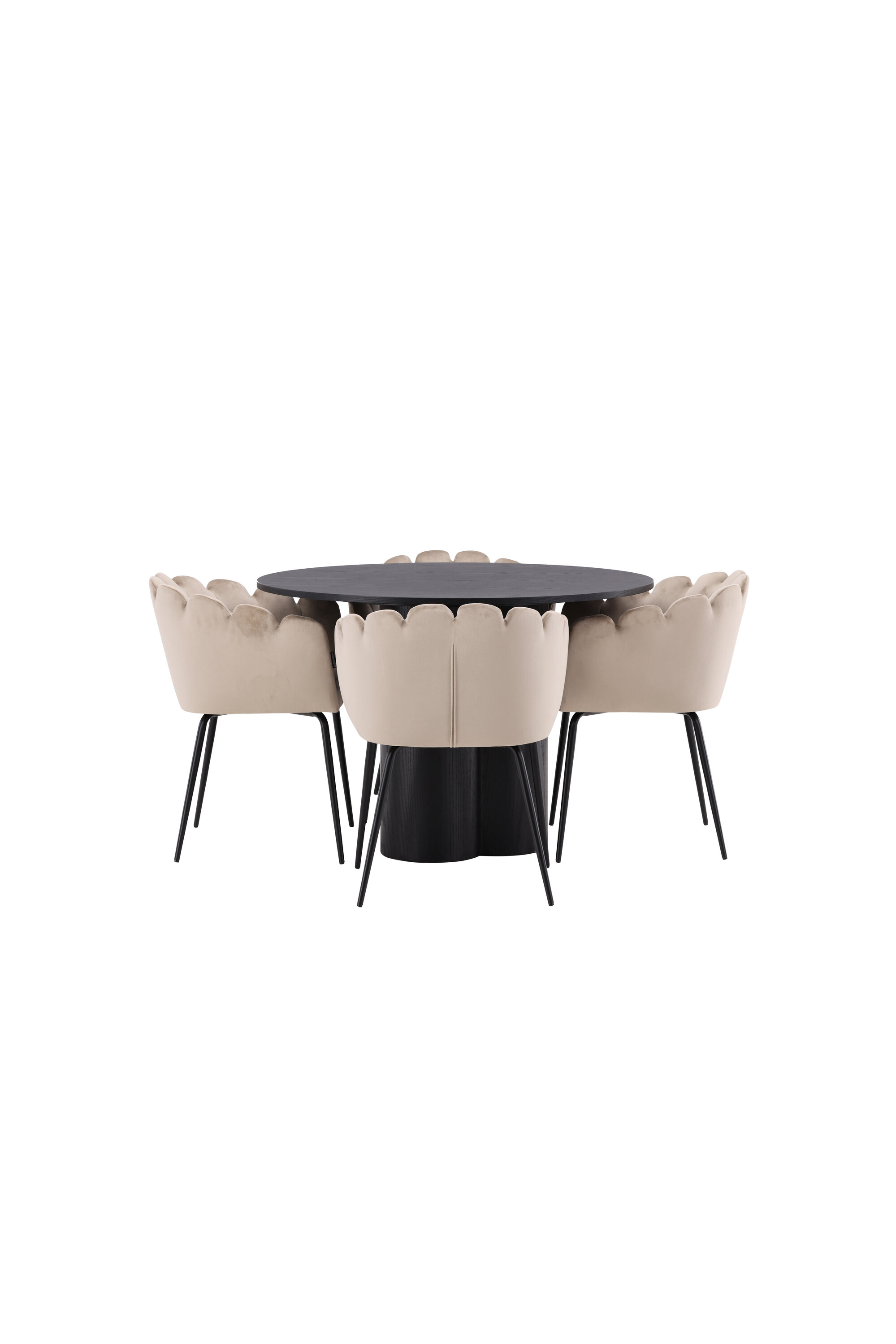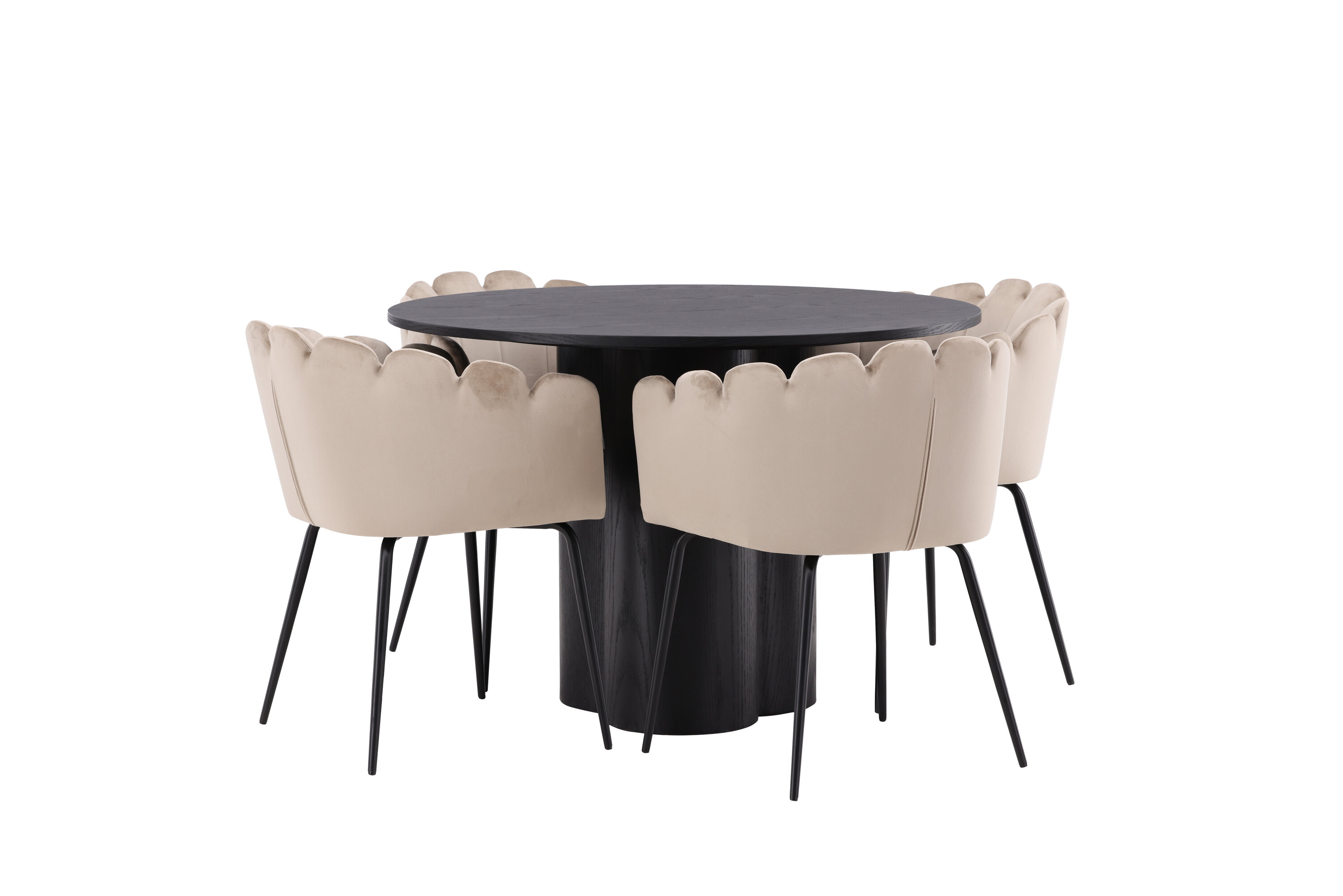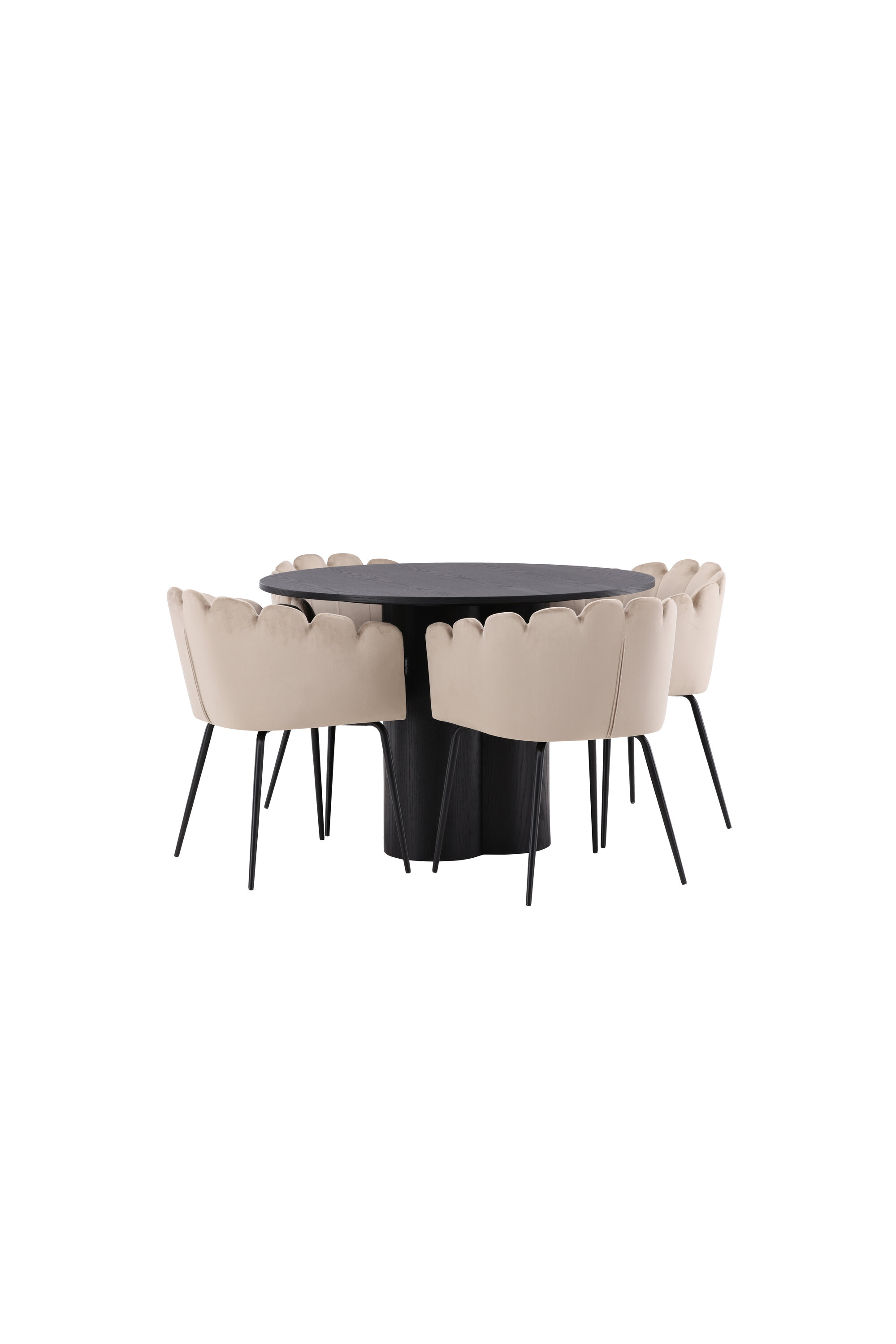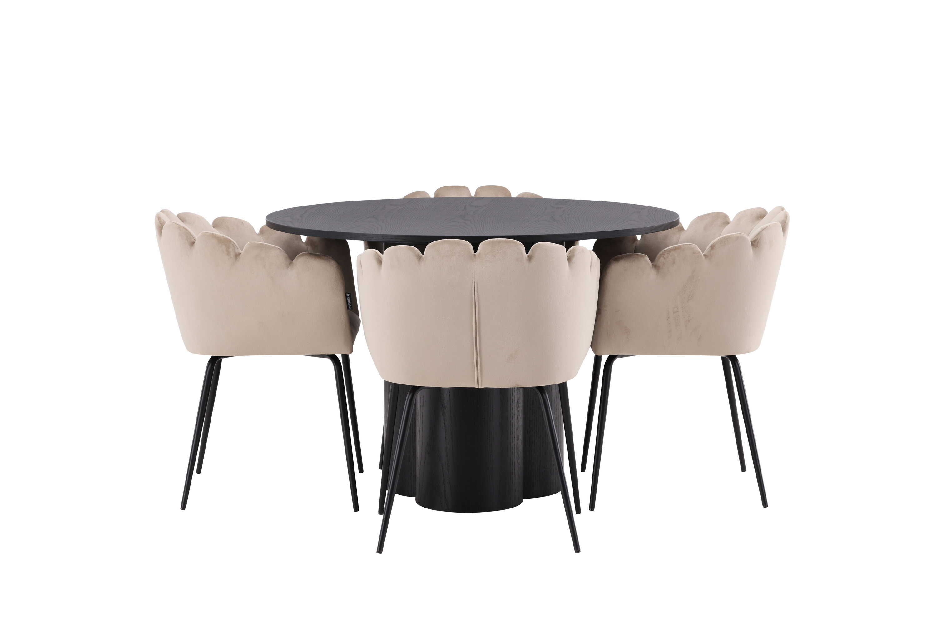 Istuge mugavalt ja kutsuge edaspidi seltskondlikule einele – siin ei satu keegi äärepealt. Söögilaud Olivia avaldab muljet oma skandinaavialiku ja maitseka disainiga. Laual on kõikehõlmav terviklik disain populaarses mokavärvitoonis. Ümmargune plaat on MDF-ist ja raam koosneb kolmest silindrikujulisest jalast, mis on koondatud laua keskosa alla. See sobib ideaalselt meie Limhamni seeria luksuslike toolidega. Toolil on kutsuv disain dekoratiivse kestakujulise dekoratiivse õmblusega seljatoe ja ümmarguse ilusast beežist sametkangast istmega. Jalad on musta pulbervärvitud metallist. Moodsa välimusega täiuslik söögigrupp!