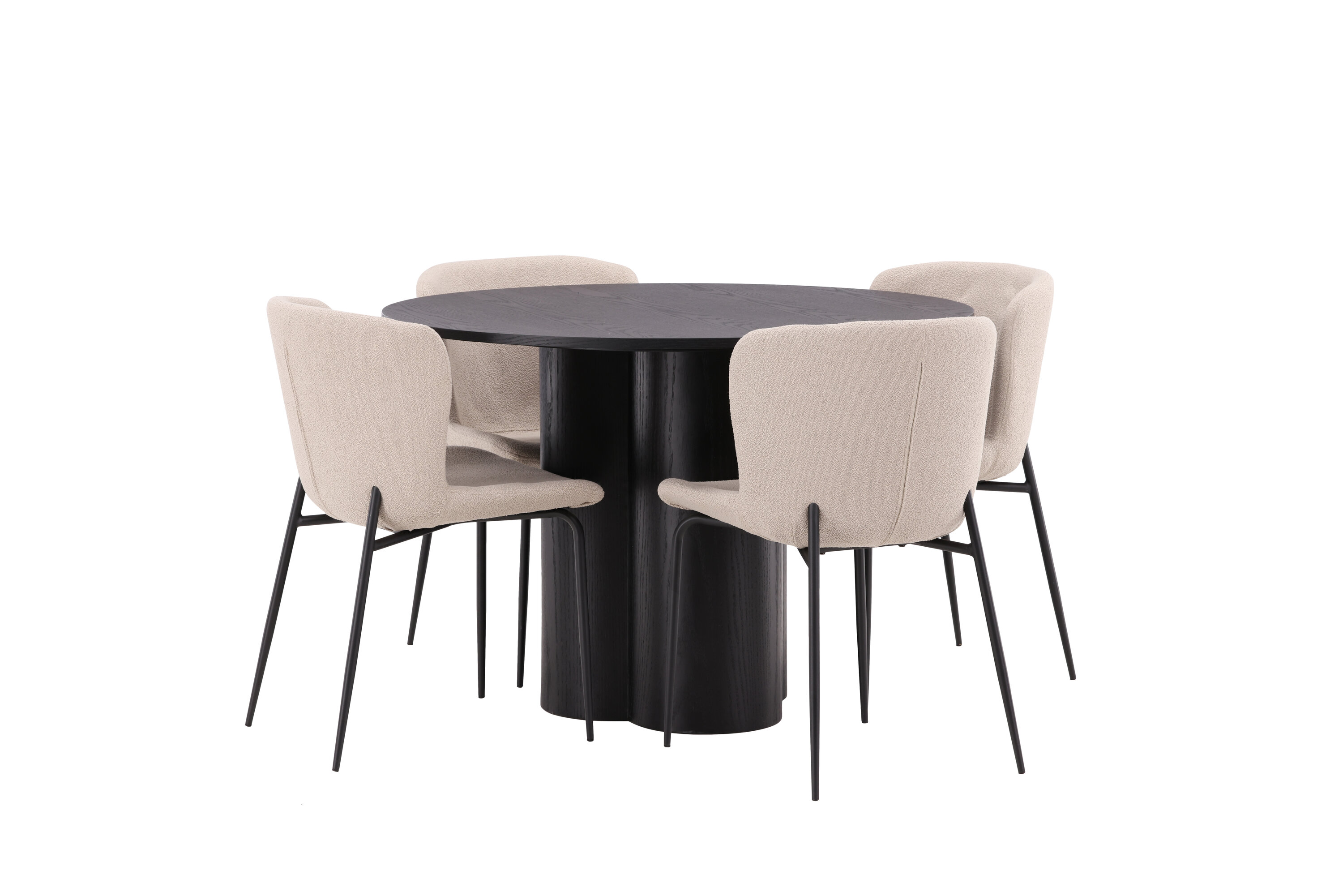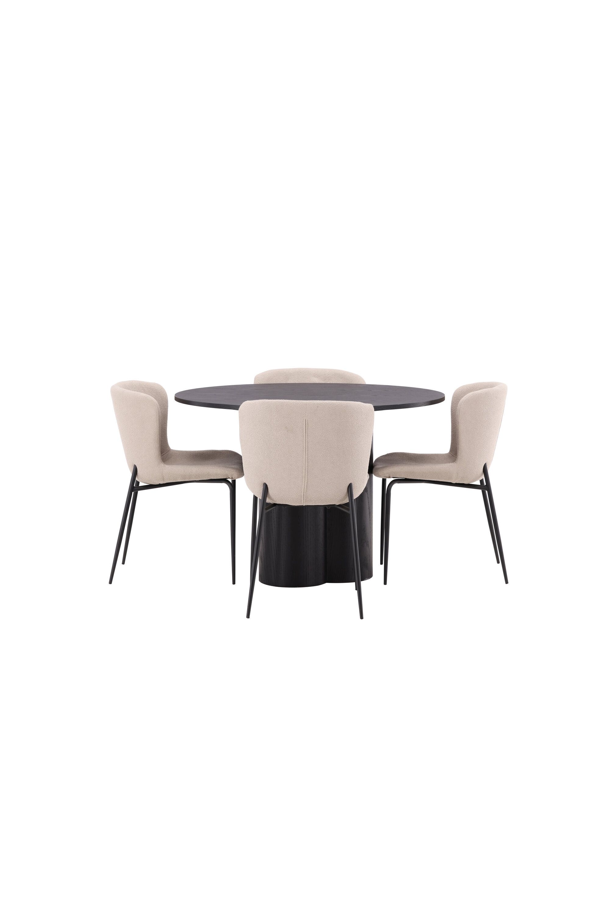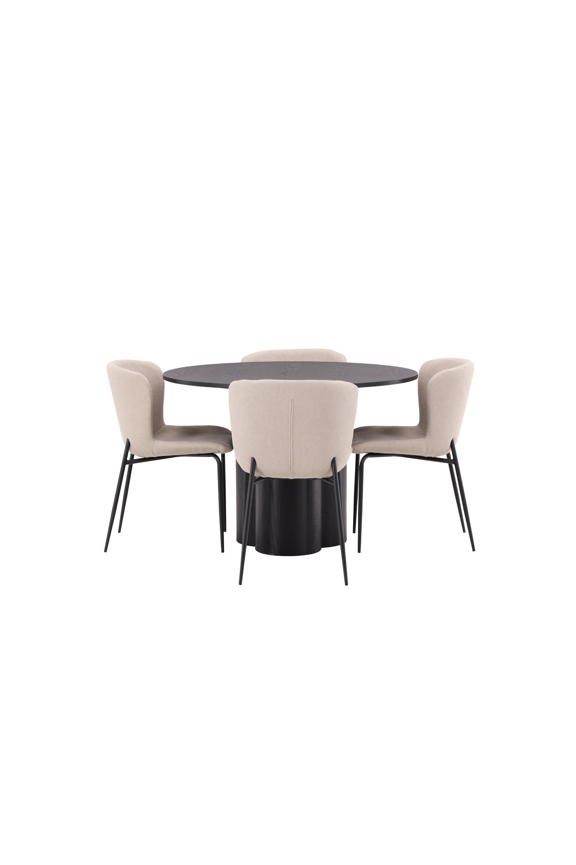 Looge selle stiilse toidugrupiga oma kodu südames kutsuv õhkkond! Toolid on Modesto seeriast ja neil on beežist karvast bouclé-kangast polster ning minimalistlikud jalad mustast metallist. Kergelt ümar seljatugi ja polsterdatud istmepadi pakuvad lisamugavust. Ta sobib suurepäraselt söögilaua Oliviaga. Laual on kõikehõlmav mustast MDF-plaadist terviklik disain, õhuke ümar ülaosa ja kolm silindrikujulist jalga, mis on koondatud laua keskosa alla. Värvil on spoonitud plaadil hele kate, mis teeb materjali mustri nähtavaks. Mõnusat sööki maha istudes peaks olema hea tunne!