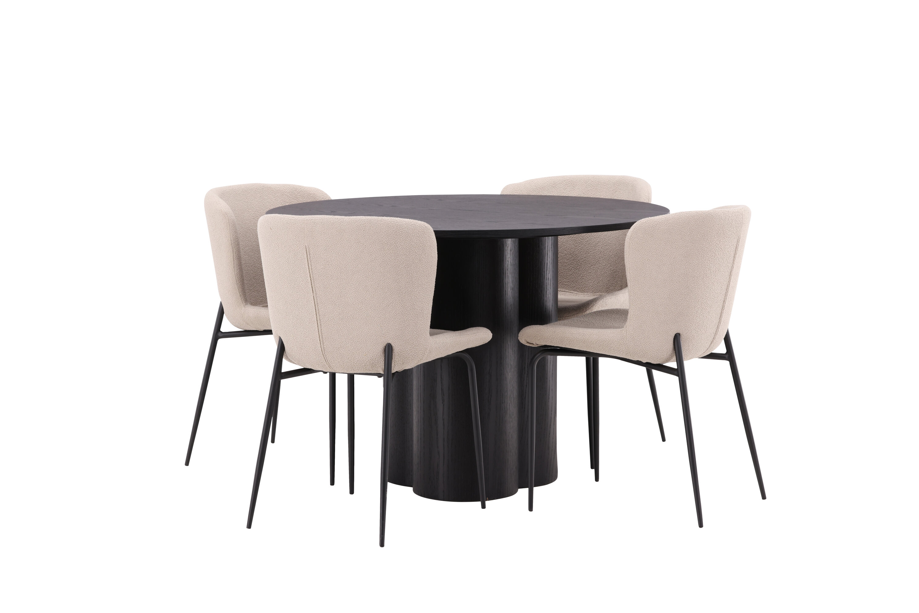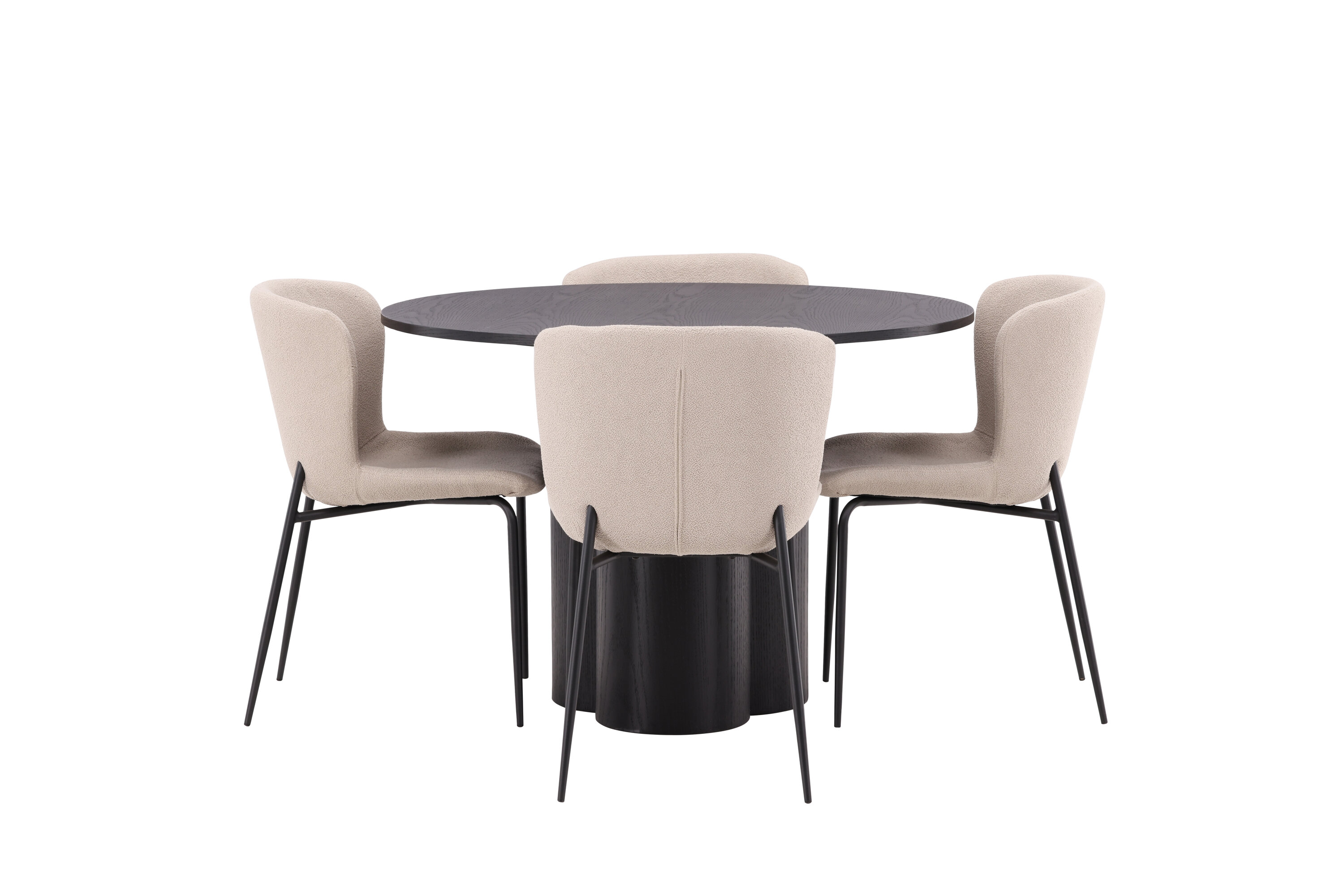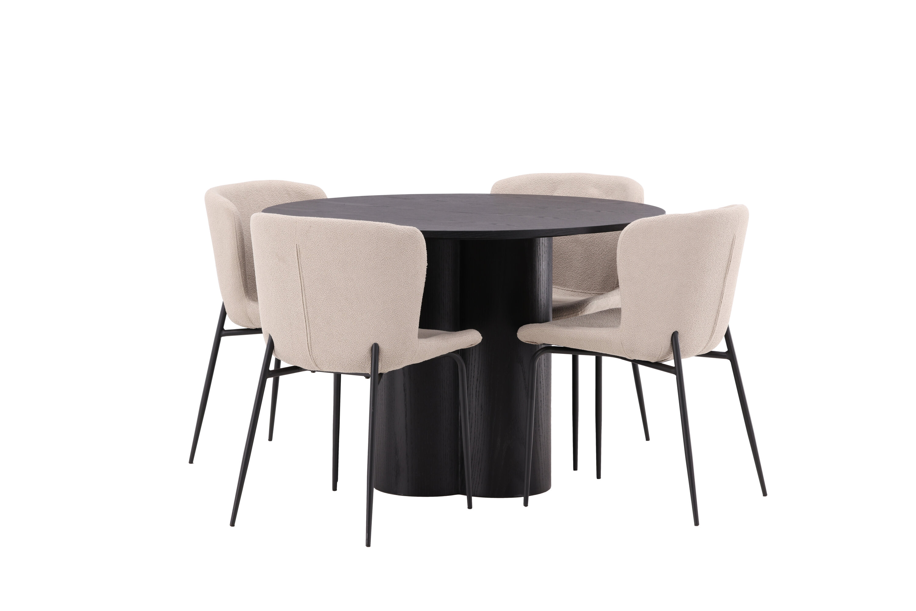 Looge selle stiilse toidugrupiga oma kodu südames kutsuv õhkkond! Toolid on Modesto seeriast ja neil on beežist karvast bouclé-kangast polster ning minimalistlikud jalad mustast metallist. Kergelt ümar seljatugi ja polsterdatud istmepadi pakuvad lisamugavust. Ta sobib suurepäraselt söögilaua Oliviaga. Laual on kõikehõlmav mustast MDF-plaadist terviklik disain, õhuke ümar ülaosa ja kolm silindrikujulist jalga, mis on koondatud laua keskosa alla. Värvil on spoonitud plaadil hele kate, mis teeb materjali mustri nähtavaks. Mõnusat sööki maha istudes peaks olema hea tunne!
