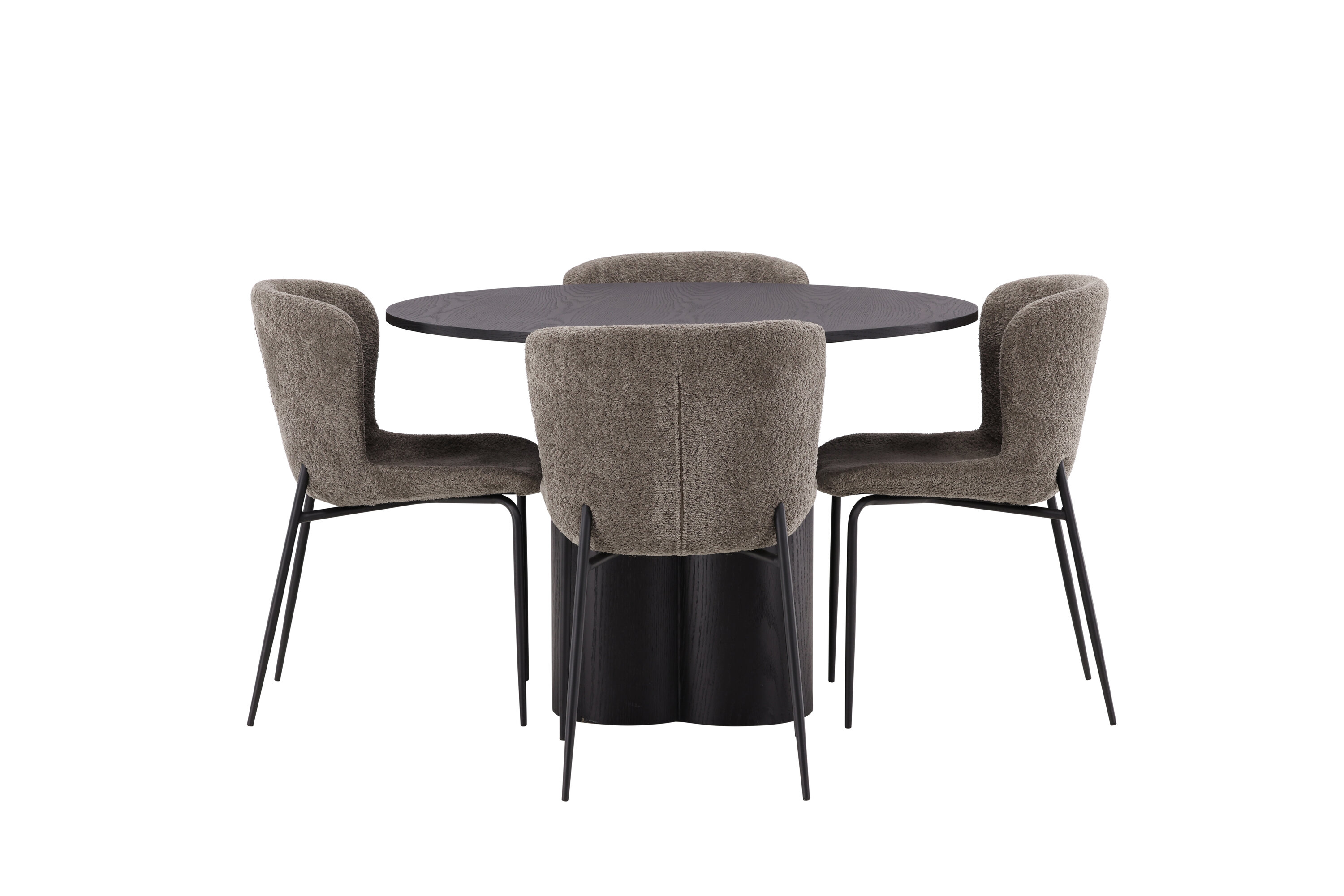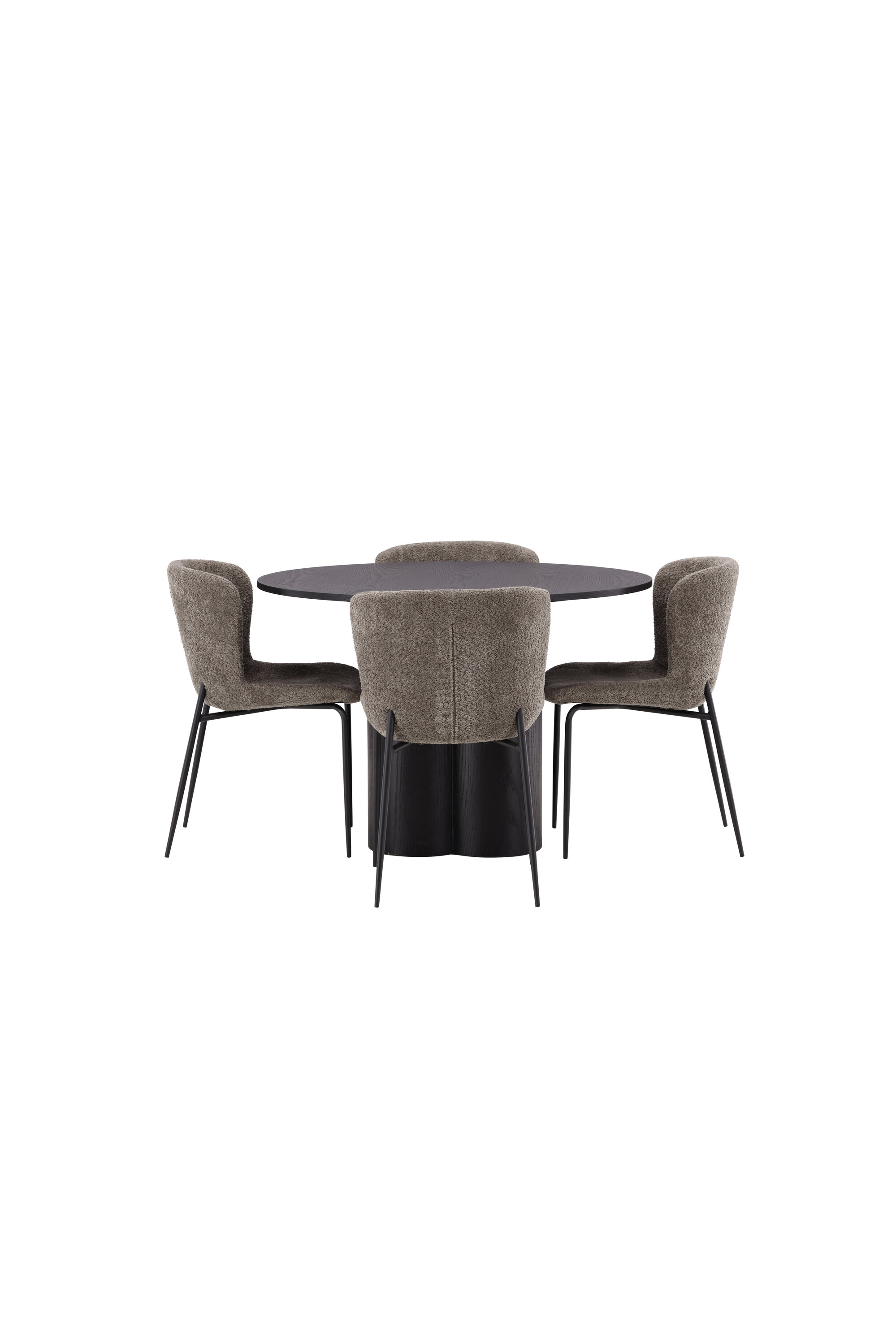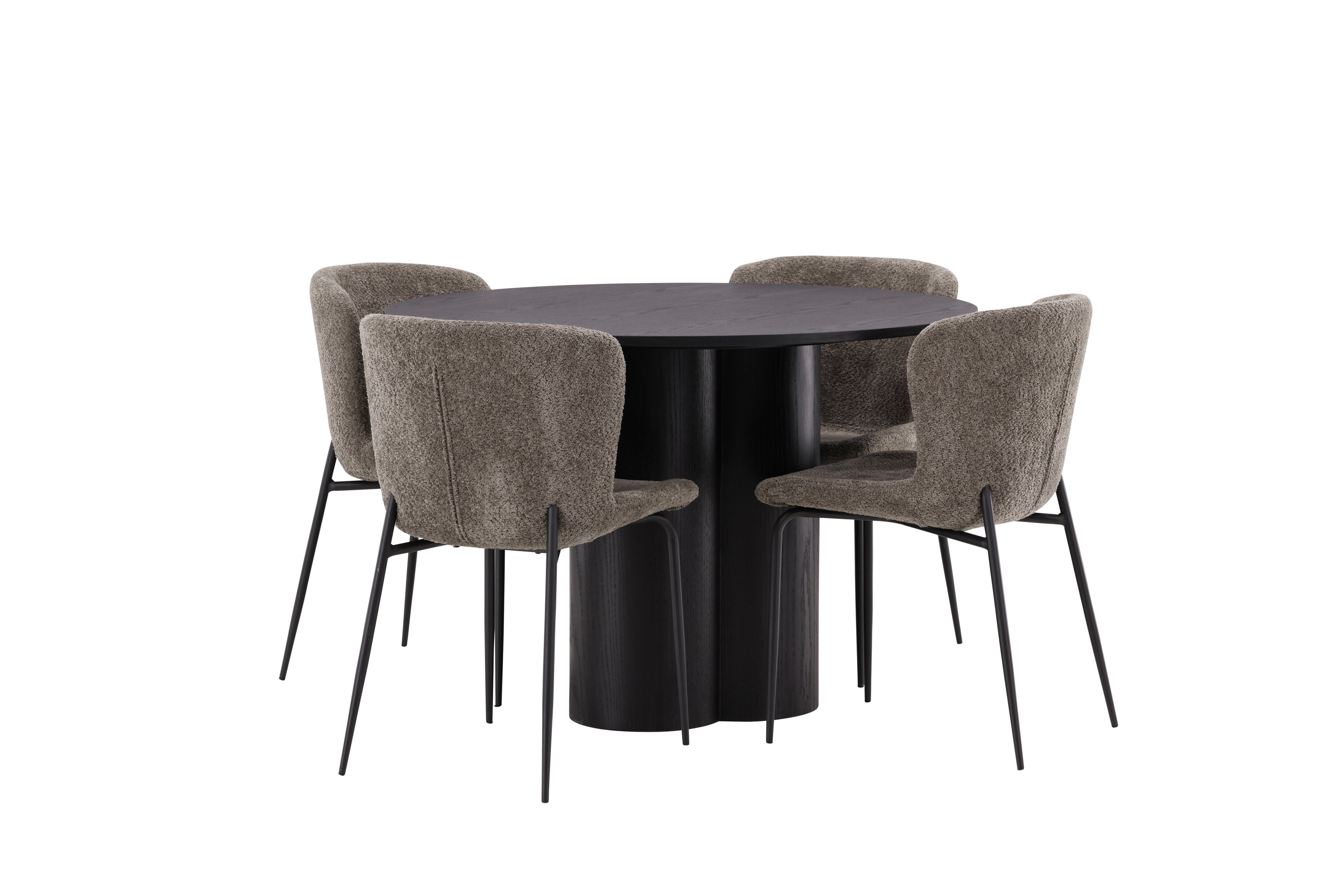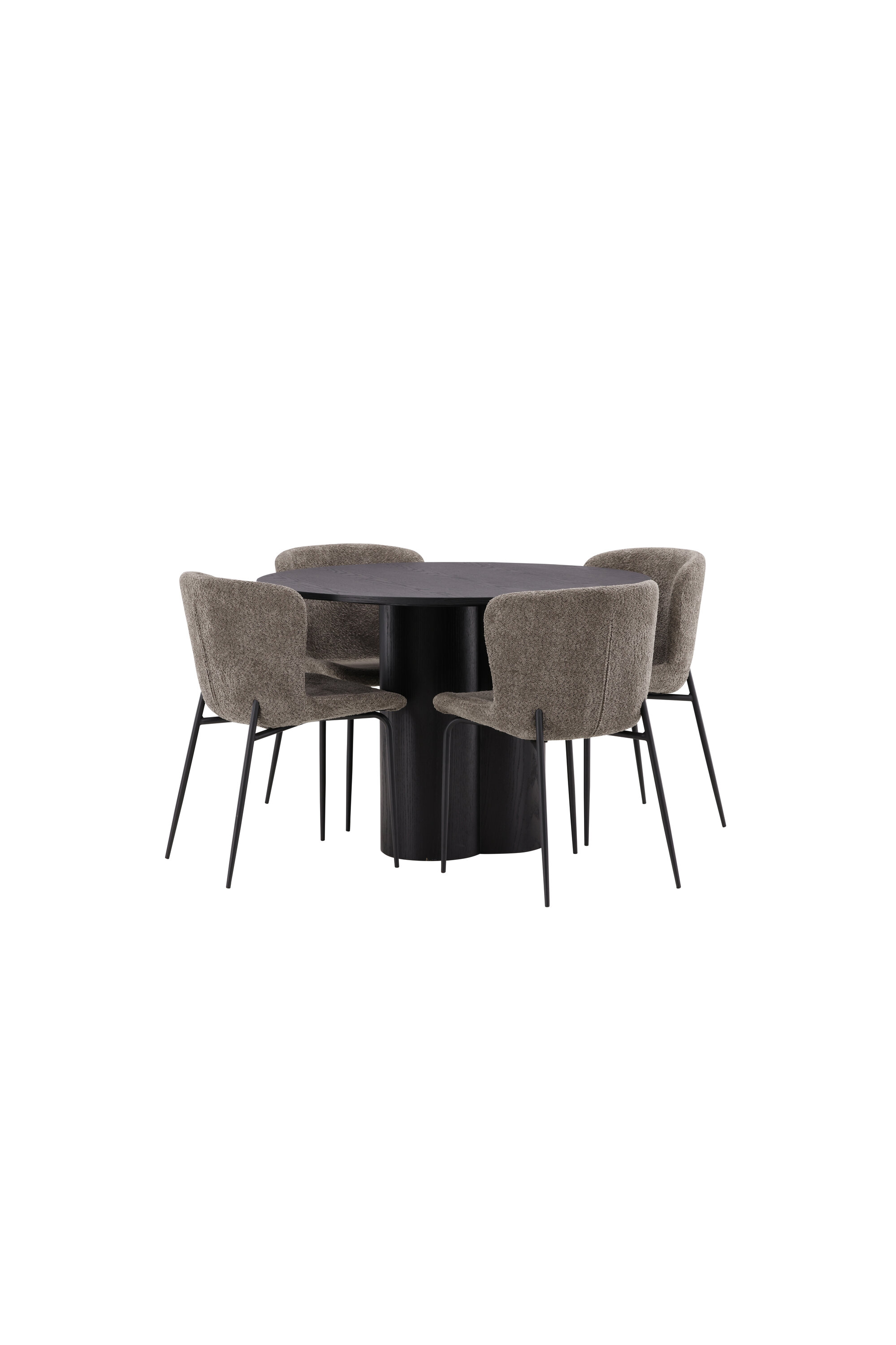 Looge selle stiilse söögigrupiga oma kodu südames kutsuv õhkkond! Toolid on Modesto seeriast ja neil on halli, karvase bouclé-kangaga polster ning stiilsed minimalistlikud jalad mustast metallist. Kergelt ümar seljatugi ja polsterdatud istmepadi pakuvad lisamugavust ja pikendavad söögilaua ümber mõnusaid eineid. Laual on kõikehõlmav mustast MDF-plaadist terviklik disain, õhuke ümar ülaosa ja kolm silindrikujulist jalga, mis on koondatud laua keskosa alla. Värvil on spoonitud plaadil hele kate, mis teeb materjali mustri nähtavaks ja annab mööblile liikumist. Meeldivat einet sööma istudes peaks olema hea tunne!