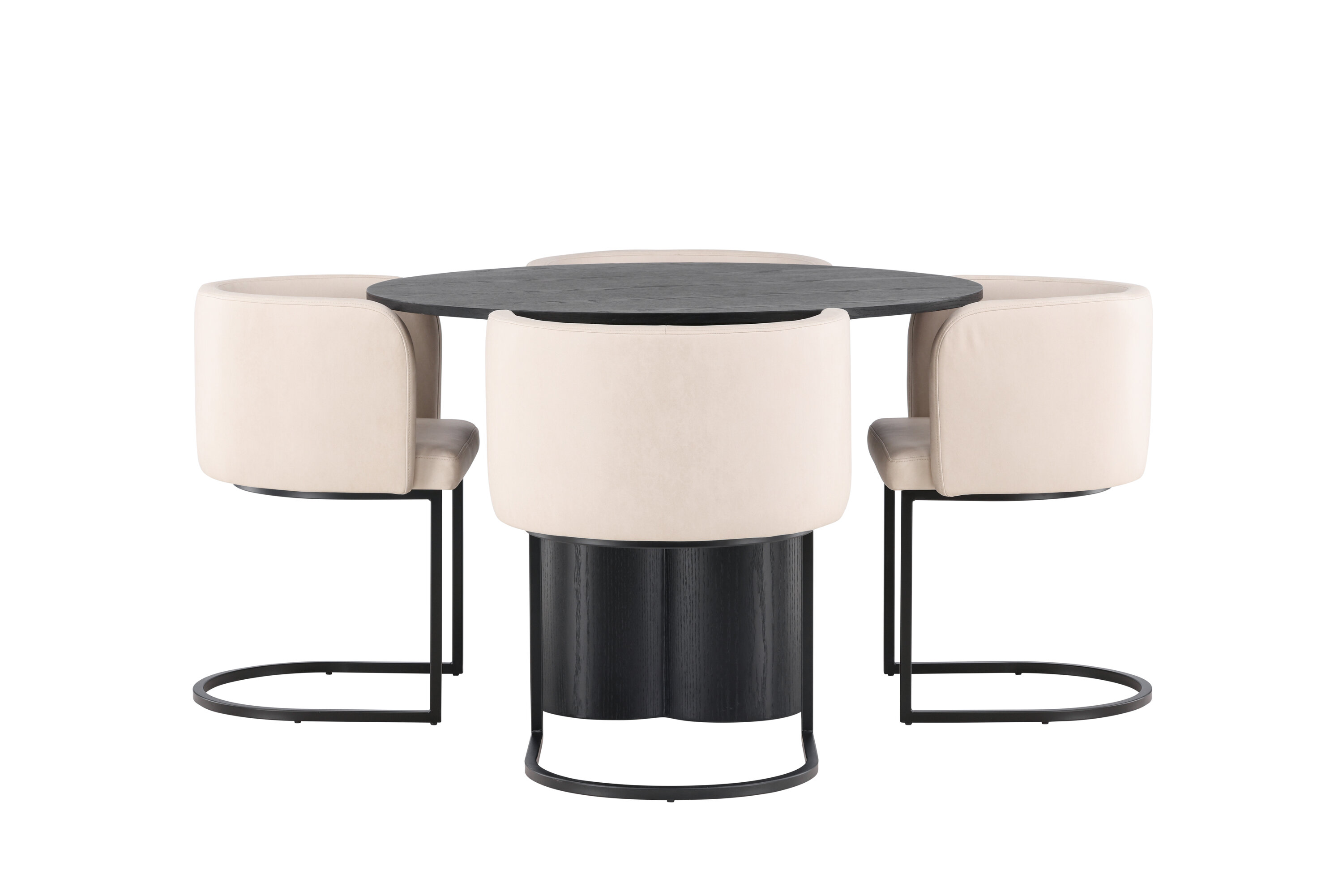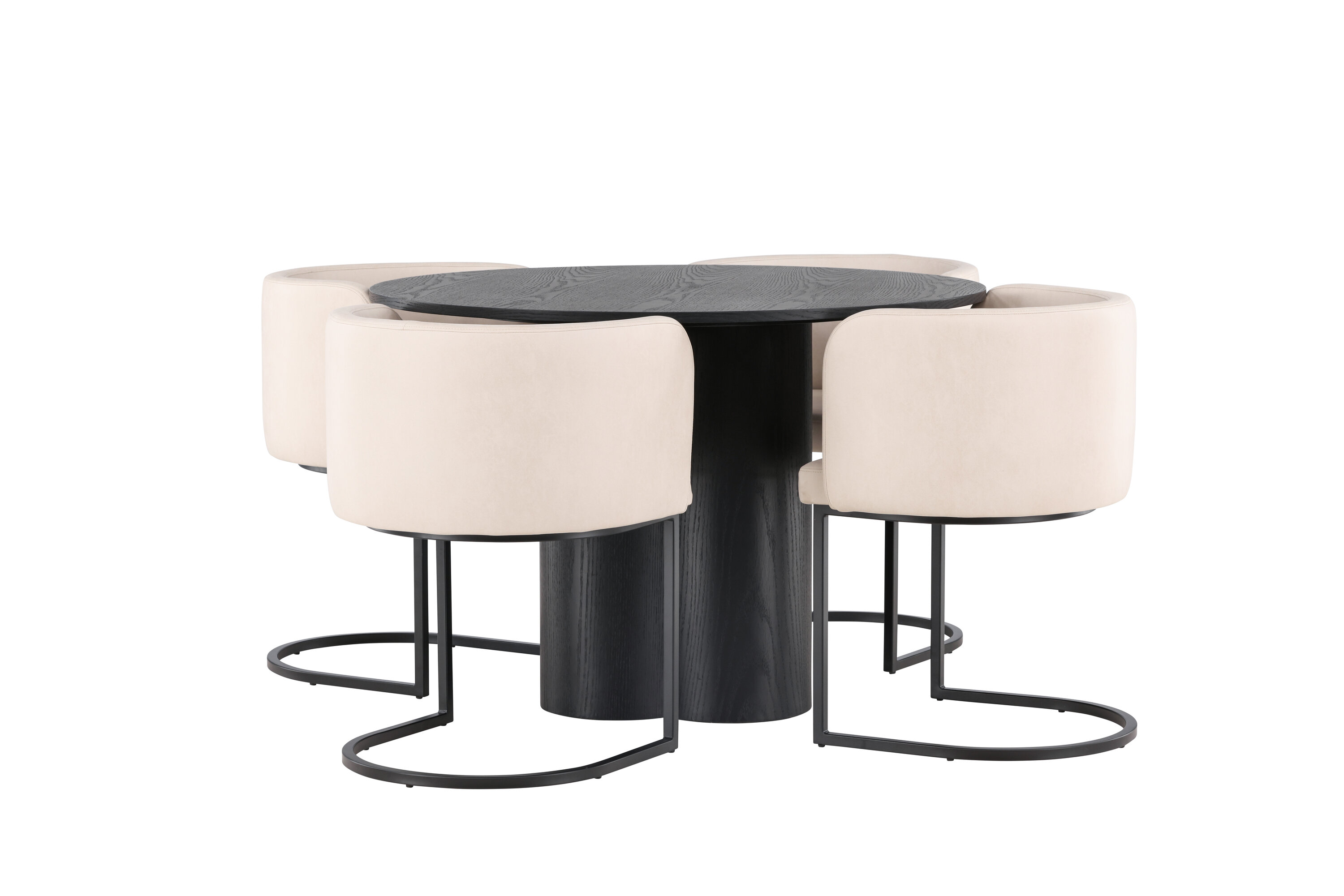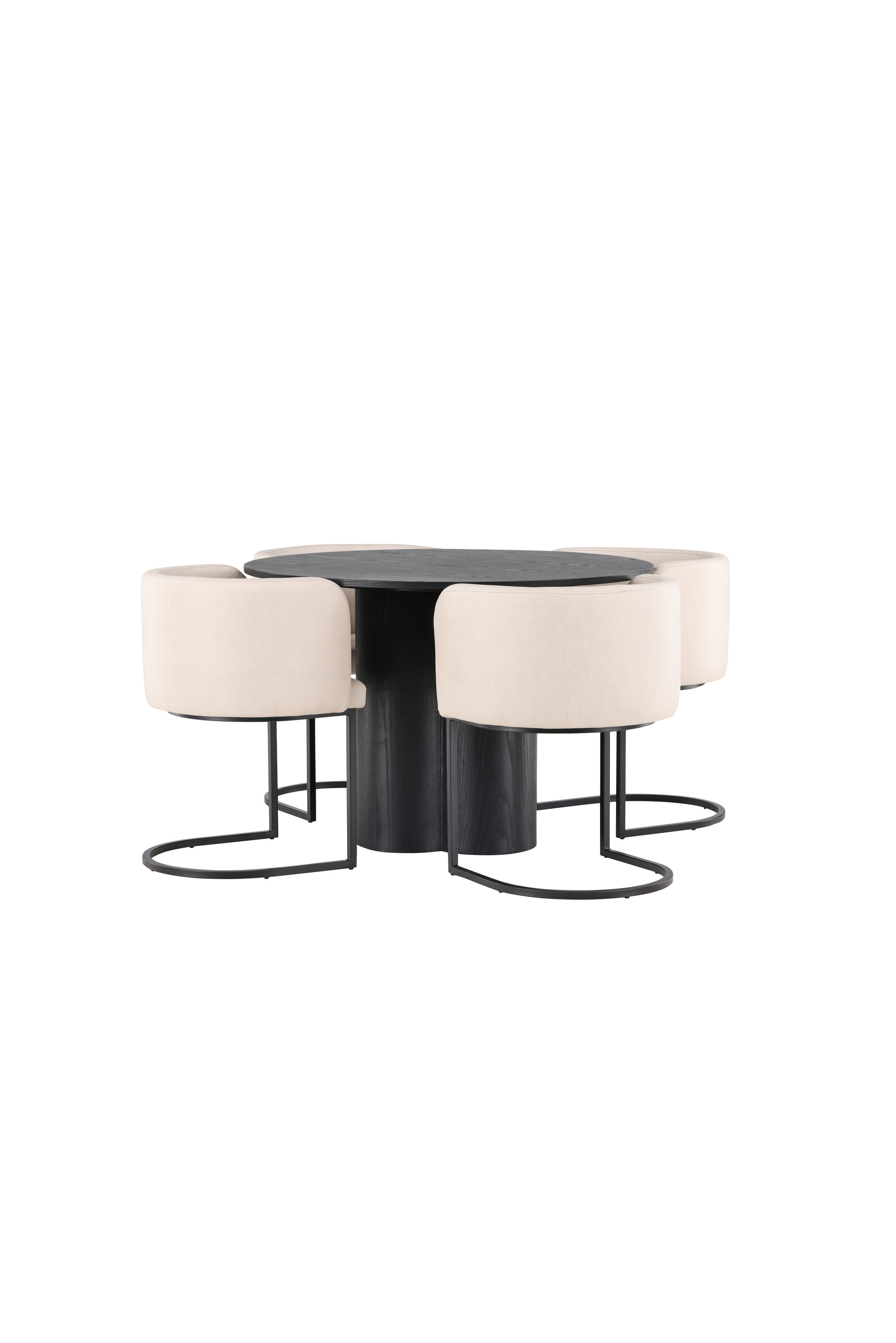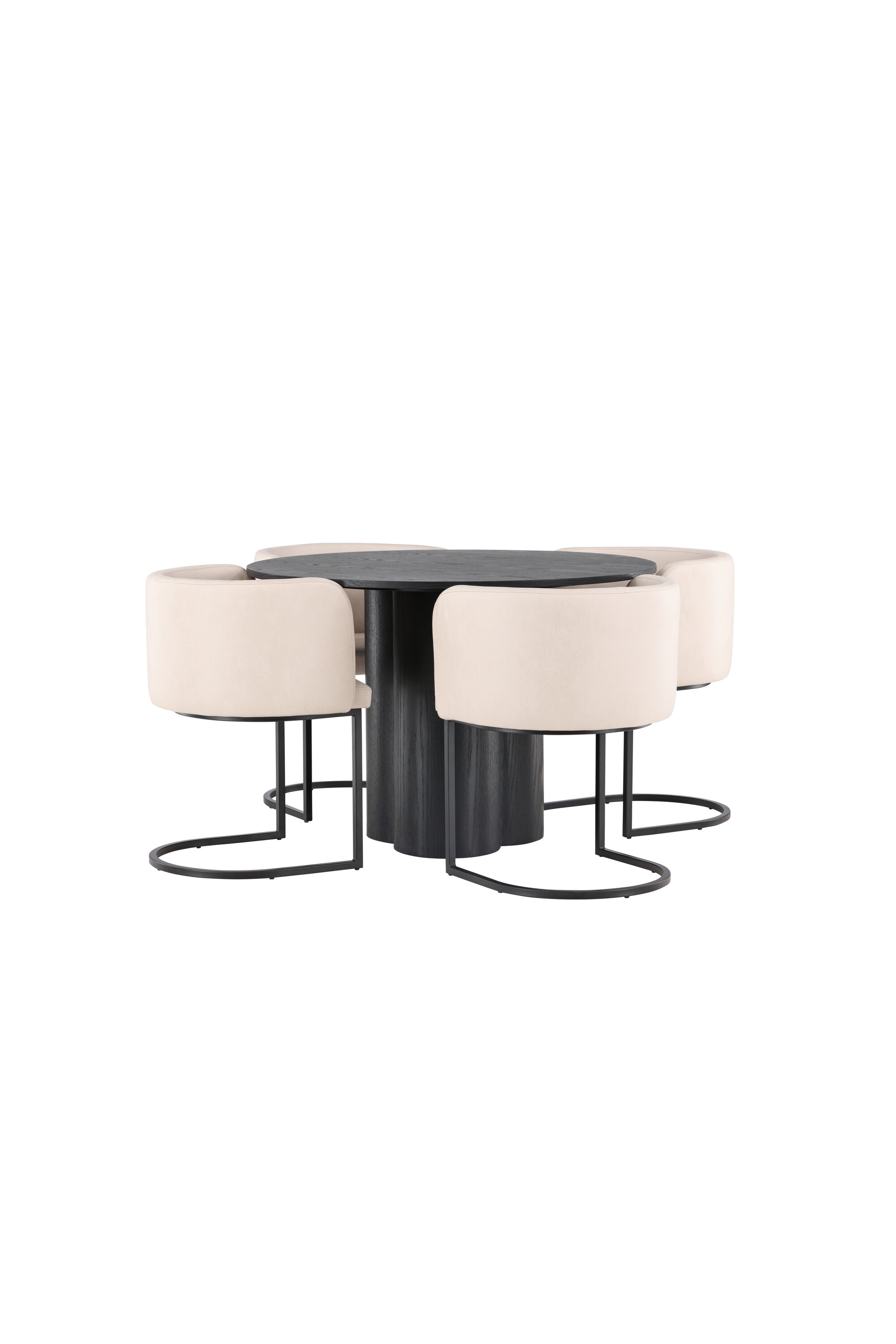 Sisusta luksuslikult ja suurejooneliselt! Ümar söögilaud Olivia on mustast MDF-plaadist tervikliku disainiga õhukese ümara ülaosa ja kolme silindrikujulise jalaga, mis on koondatud laua keskosa alla. Värvil on spoonitud plaadil hele kate, mis teeb materjali mustri nähtavaks. Siin koos meie elegantsete Simrishamni seeria söögitoolidega. Toolil on täielikult polsterdatud iste, millel on ümar beežist TC-kangast seljatugi ja dekoratiivsed, minimalistlikud mustast terasest jalad. Istuge mugavalt ja nautige koos lähedastega! Laua mõõdud: 110 cm.