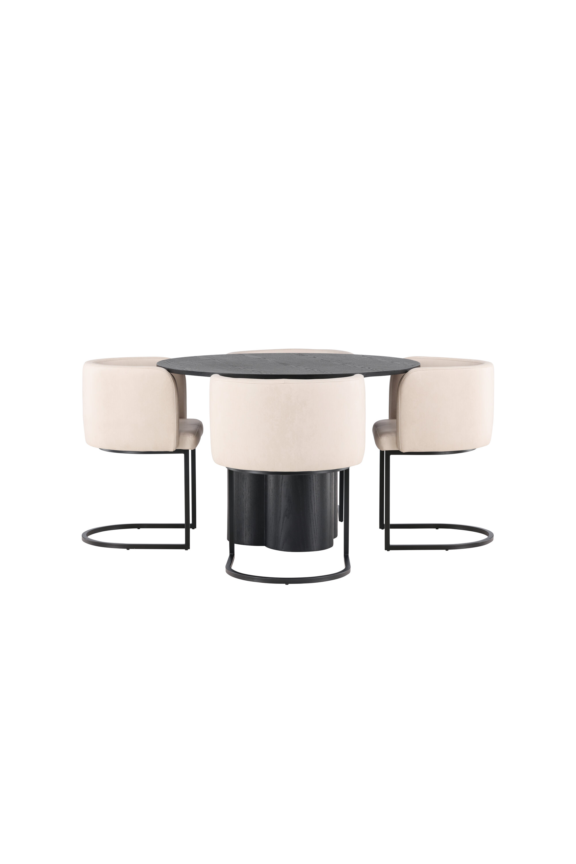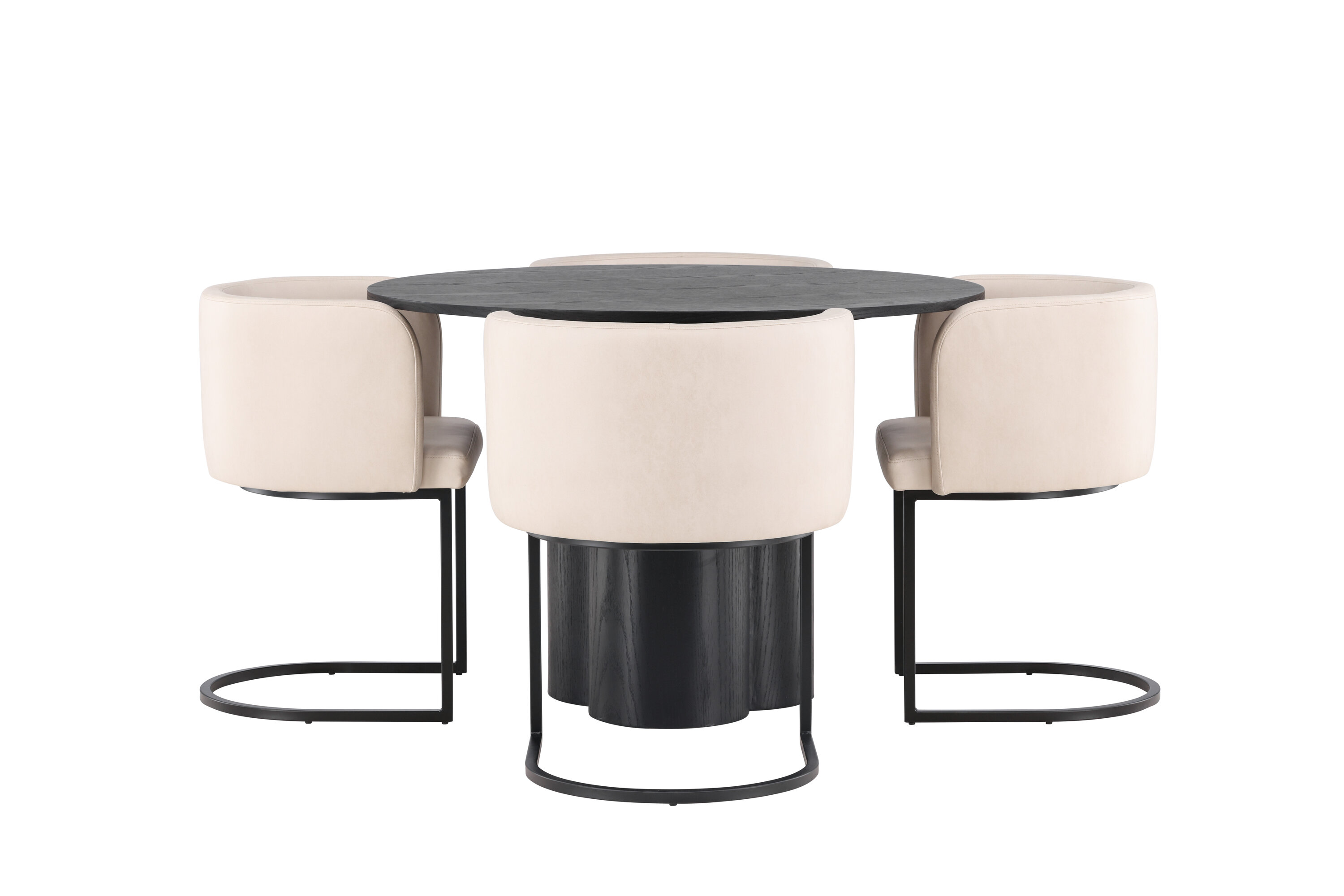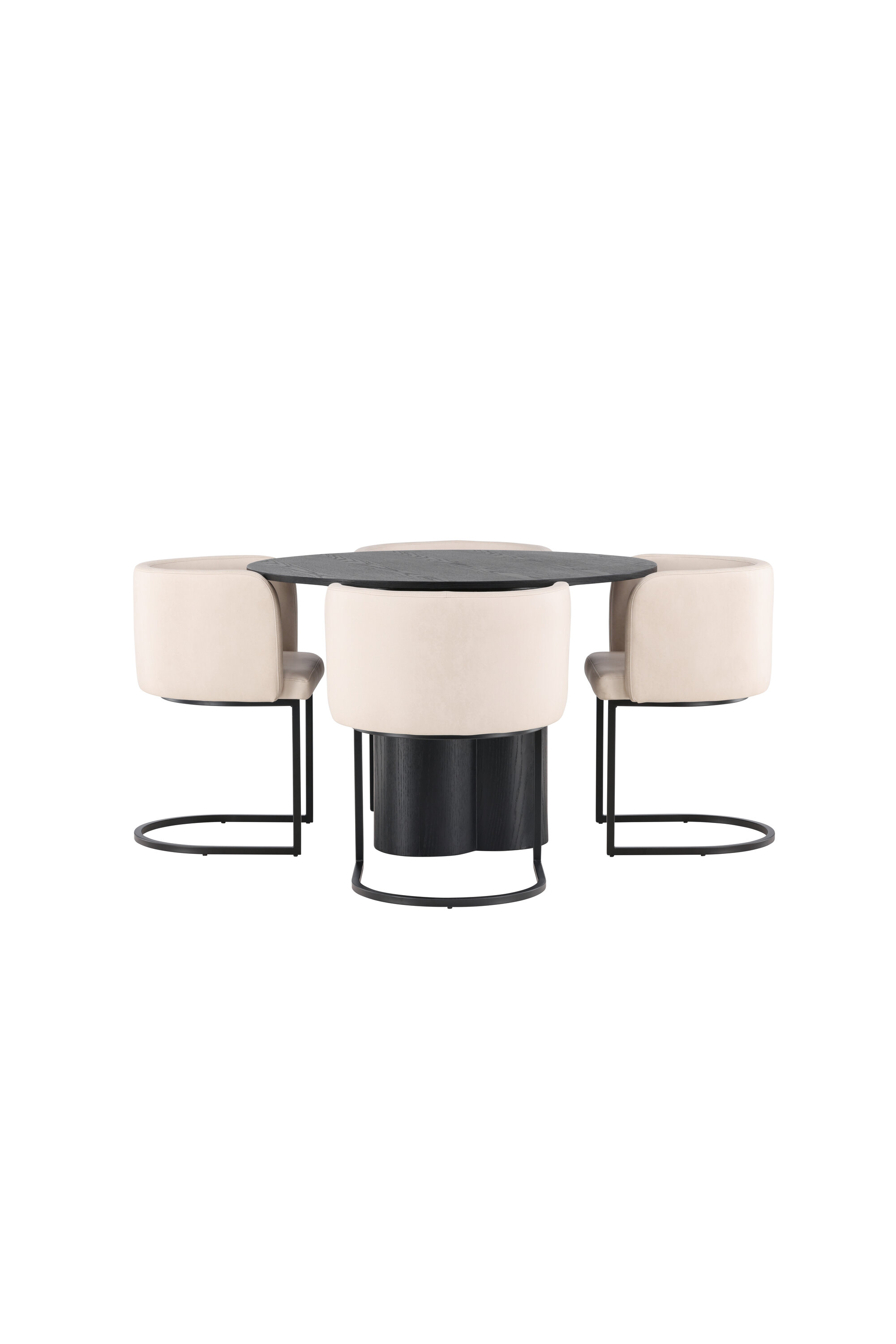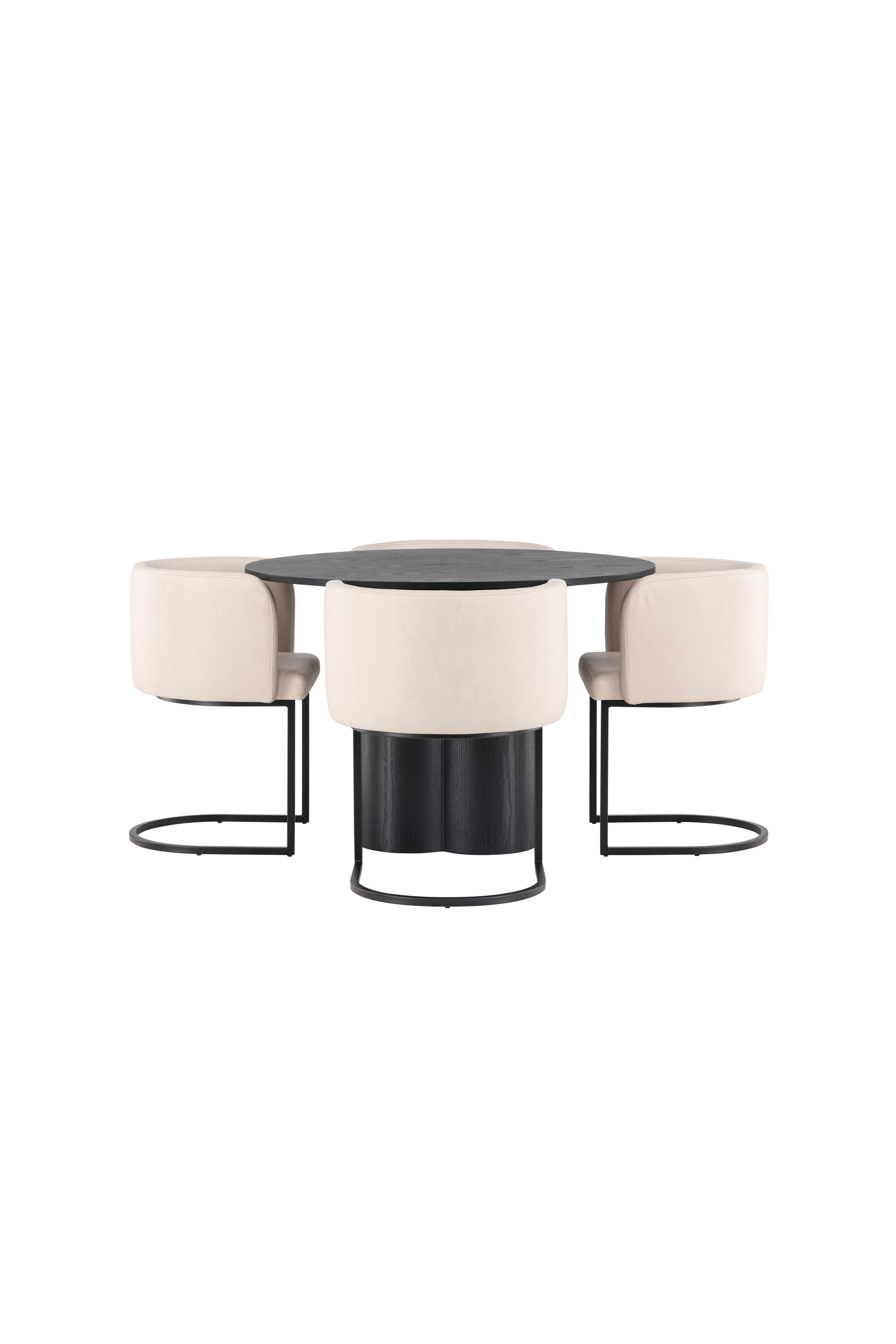 Sisusta luksuslikult ja suurejooneliselt! Ümar söögilaud Olivia on mustast MDF-plaadist tervikliku disainiga õhukese ümara ülaosa ja kolme silindrikujulise jalaga, mis on koondatud laua keskosa alla. Värvil on spoonitud plaadil hele kate, mis teeb materjali mustri nähtavaks. Siin koos meie elegantsete Simrishamni seeria söögitoolidega. Toolil on täielikult polsterdatud iste, millel on ümar beežist TC-kangast seljatugi ja dekoratiivsed, minimalistlikud mustast terasest jalad. Istuge mugavalt ja nautige koos lähedastega! Laua mõõdud: 110 cm.