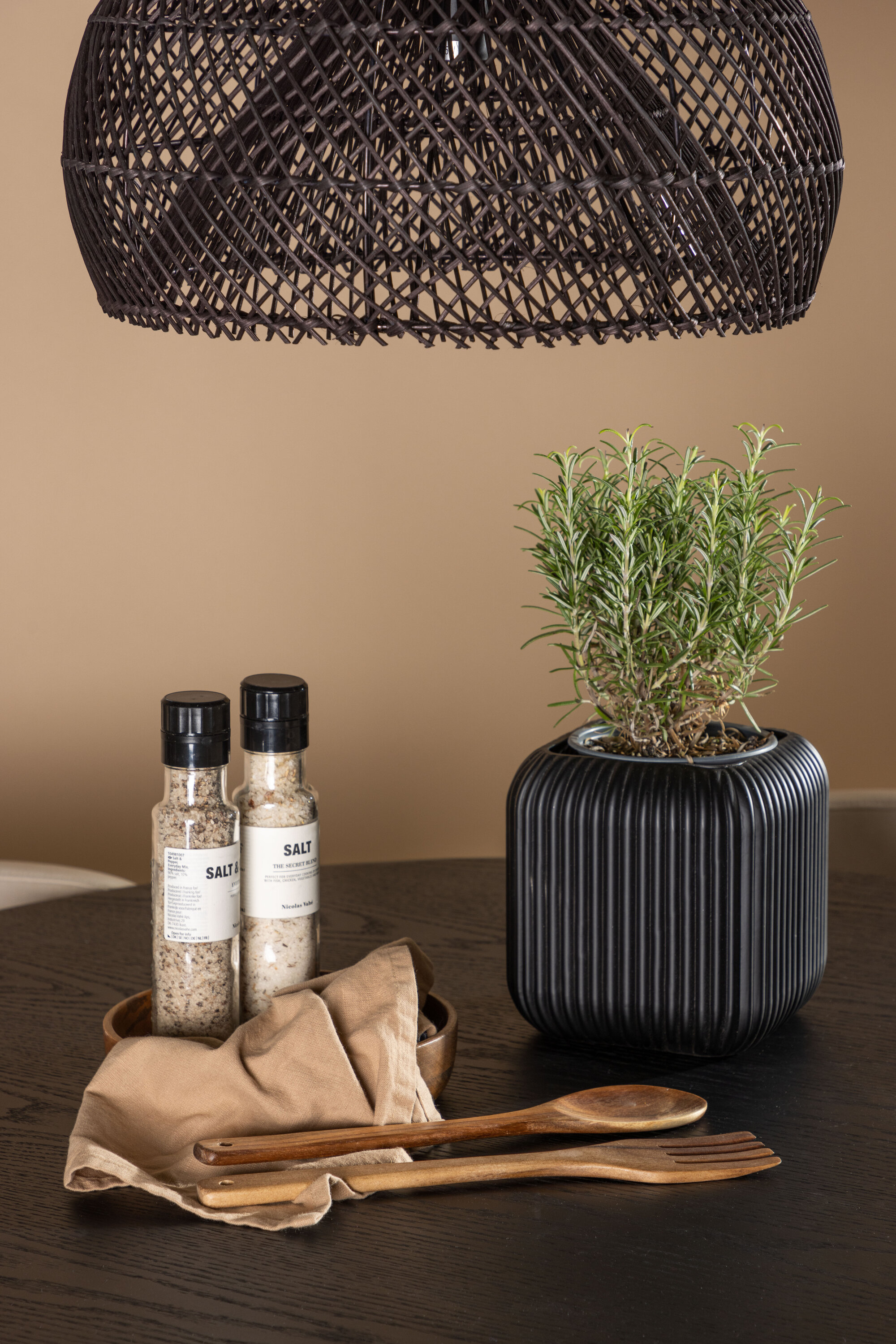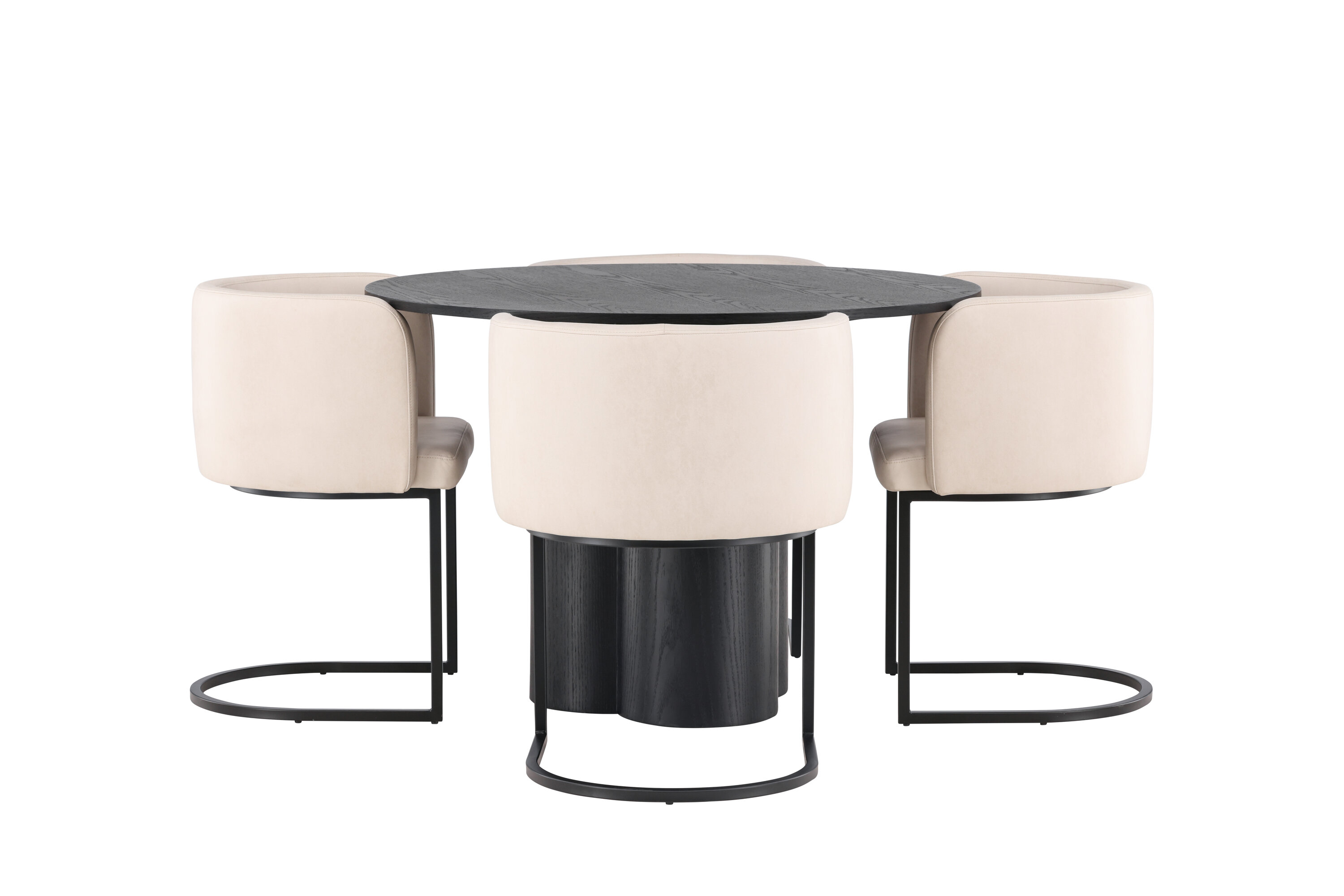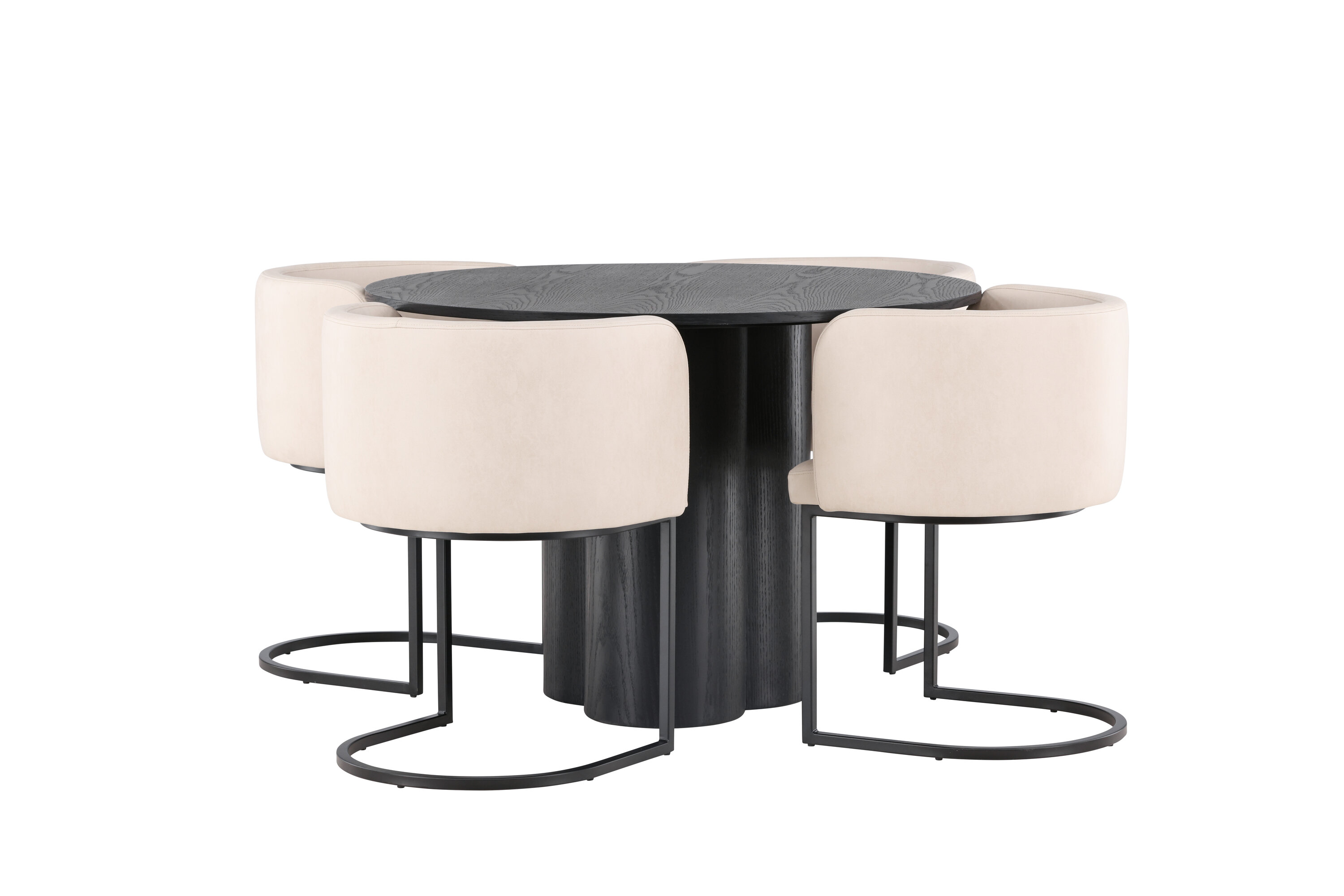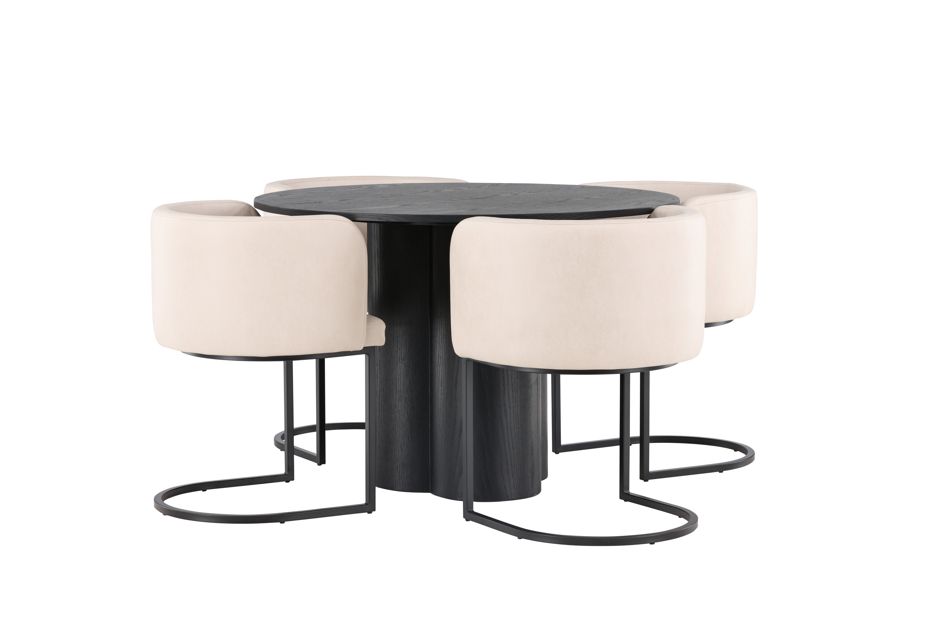 Sisusta luksuslikult ja suurejooneliselt! Ümar söögilaud Olivia on mustast MDF-plaadist tervikliku disainiga õhukese ümara ülaosa ja kolme silindrikujulise jalaga, mis on koondatud laua keskosa alla. Värvil on spoonitud plaadil hele kate, mis teeb materjali mustri nähtavaks. Siin koos meie elegantsete Simrishamni seeria söögitoolidega. Toolil on täielikult polsterdatud iste, millel on ümar beežist TC-kangast seljatugi ja dekoratiivsed, minimalistlikud mustast terasest jalad. Istuge mugavalt ja nautige koos lähedastega! Laua mõõdud: 110 cm.