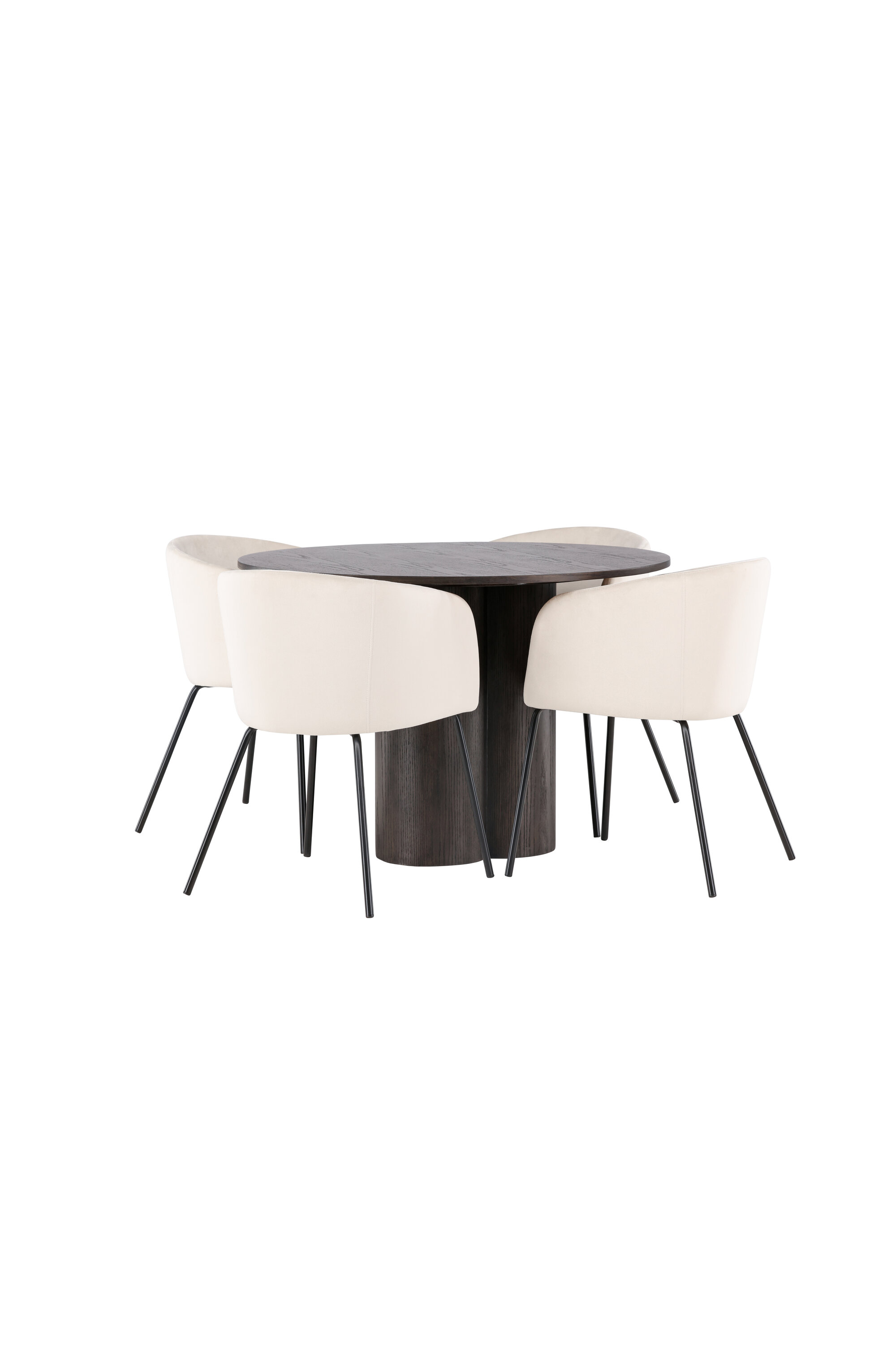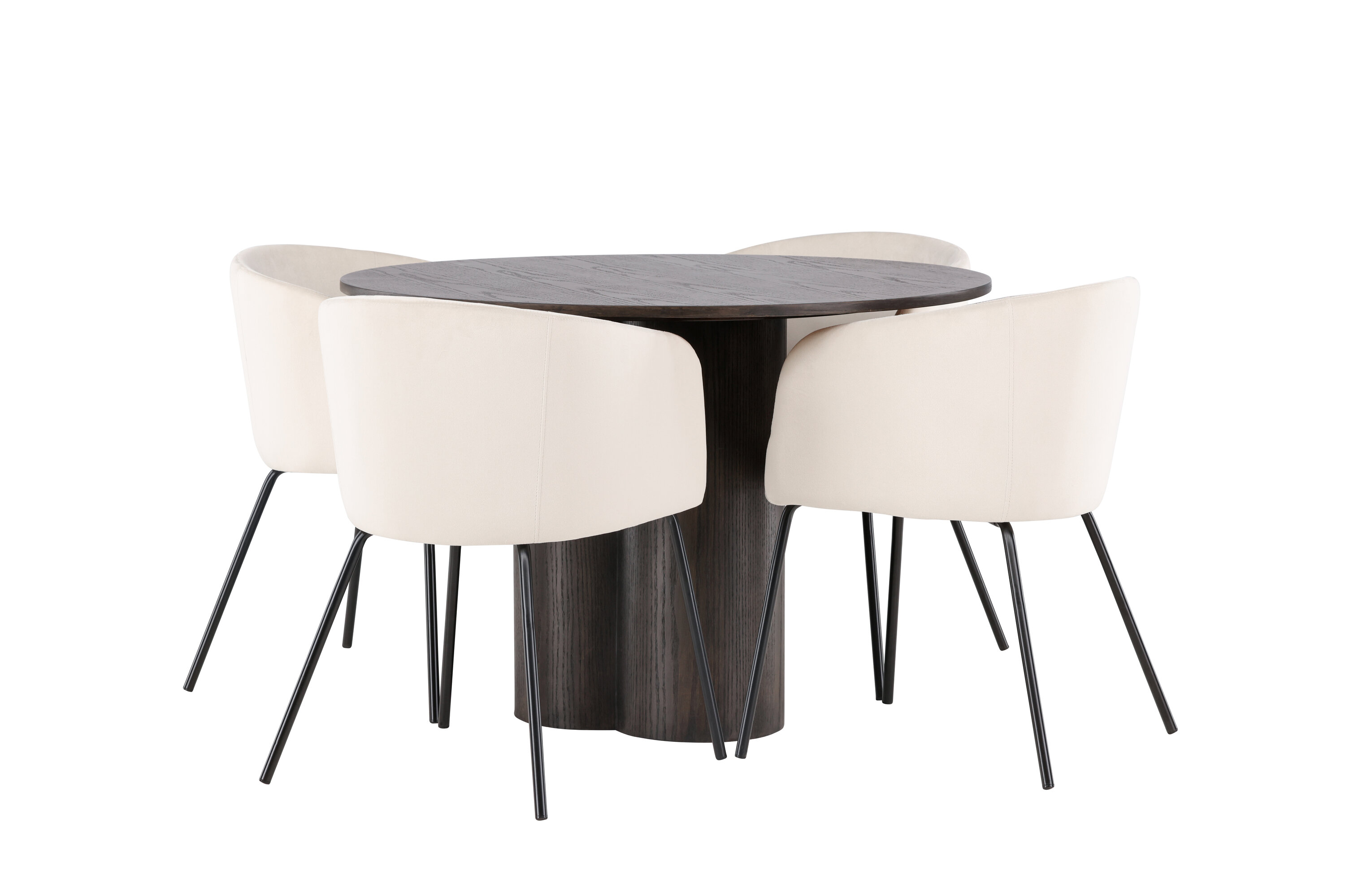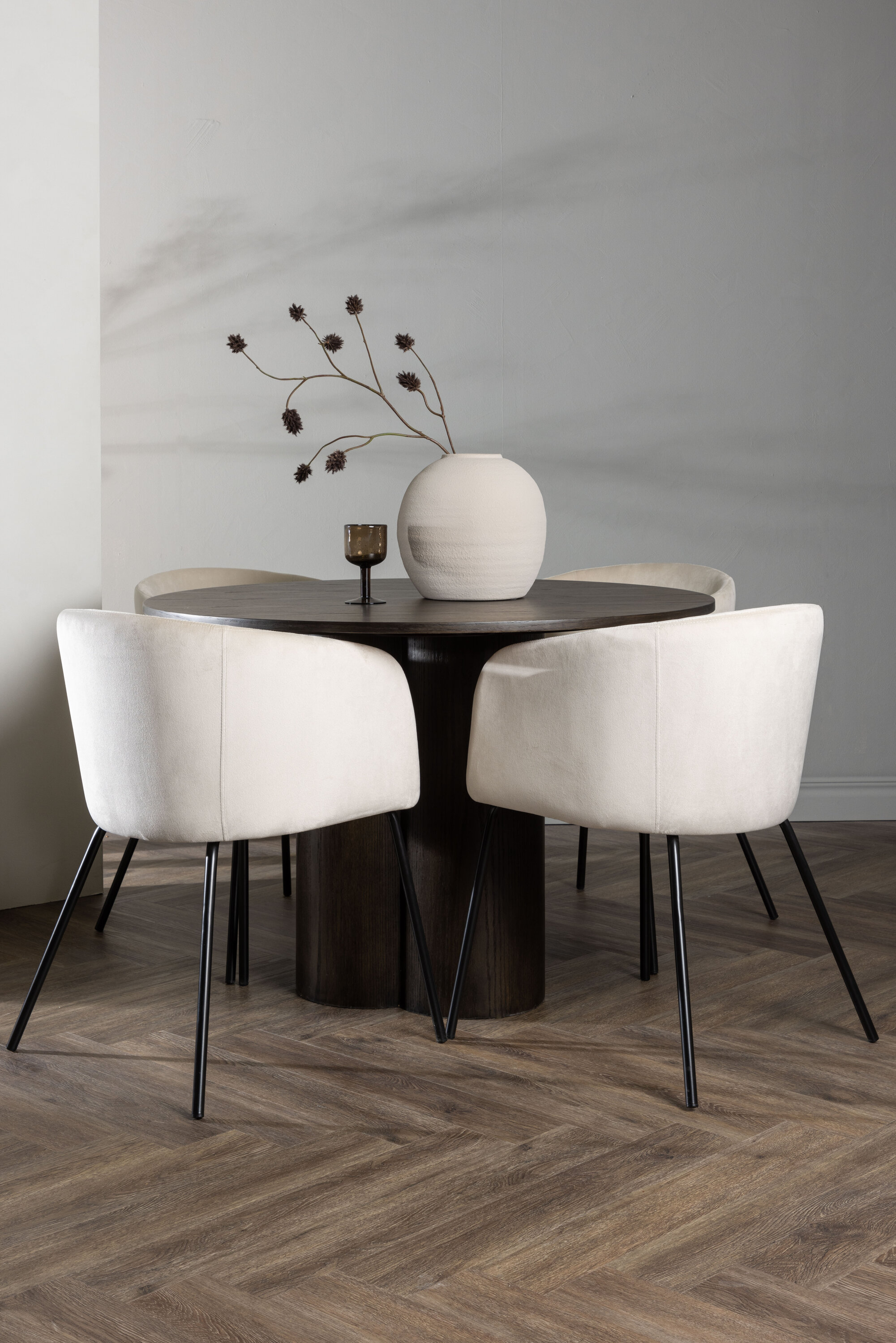 Loo oma elutuppa särav sära! Ümmargune söögilaud Olivia on skandinaavialiku ülddisainiga moodsas mokavärvis. Laual on õhuke MDF lauaplaat ja kolm silindrikujulist jalga, mis on koondatud laua keskosa alla. Värvil on hele kate, mis teeb materjali mustri nähtavaks. Siin koos meie suurepäraste söögitoolidega Berit. Toolil on täielikult polsterdatud disain, mille seljatugi ja iste on kergelt ümardatud sametkangast ning kitsad mustast rauast toolijalad. Trendika tunnetusega soe söögiseltskond! Laua mõõdud: 110 cm.