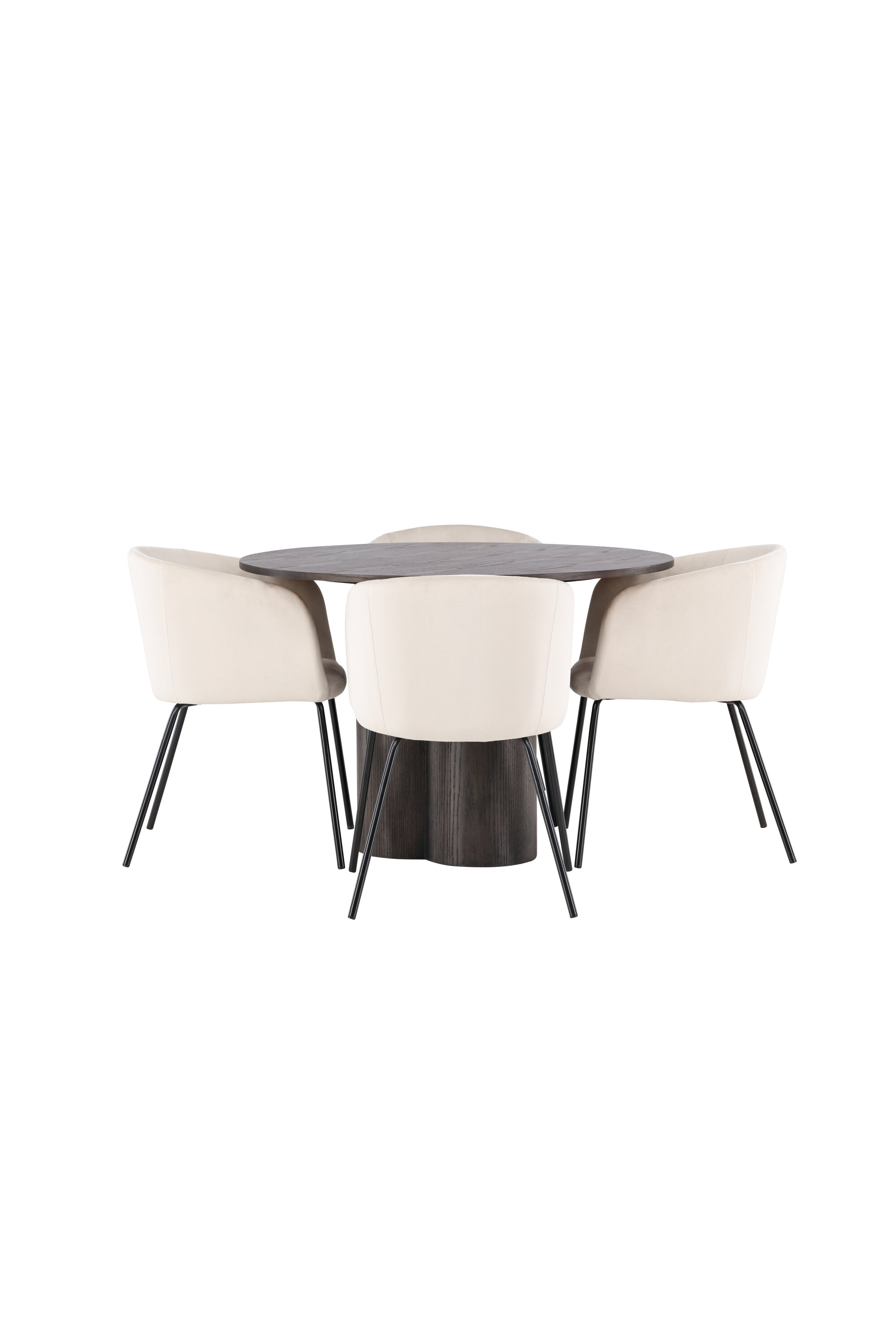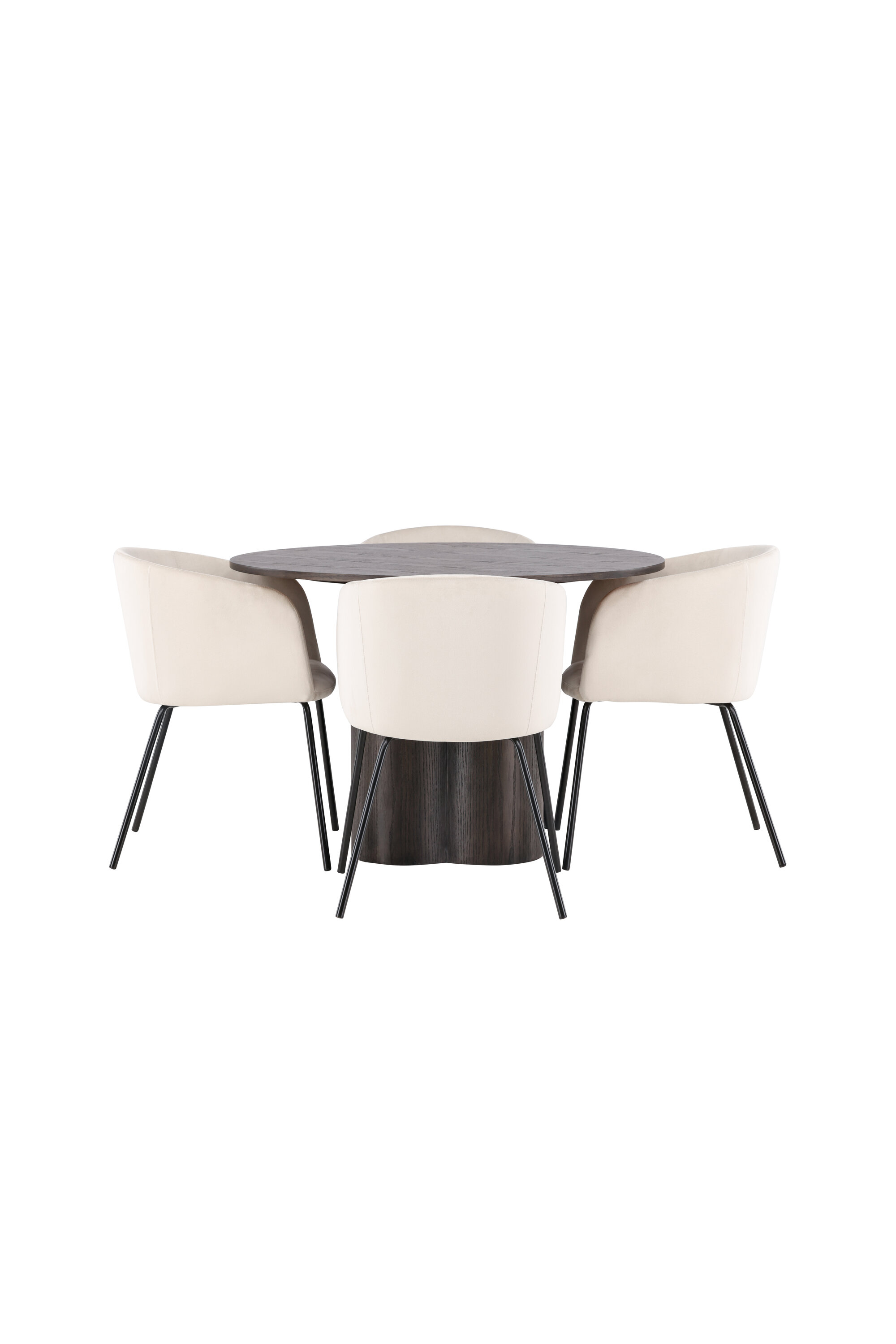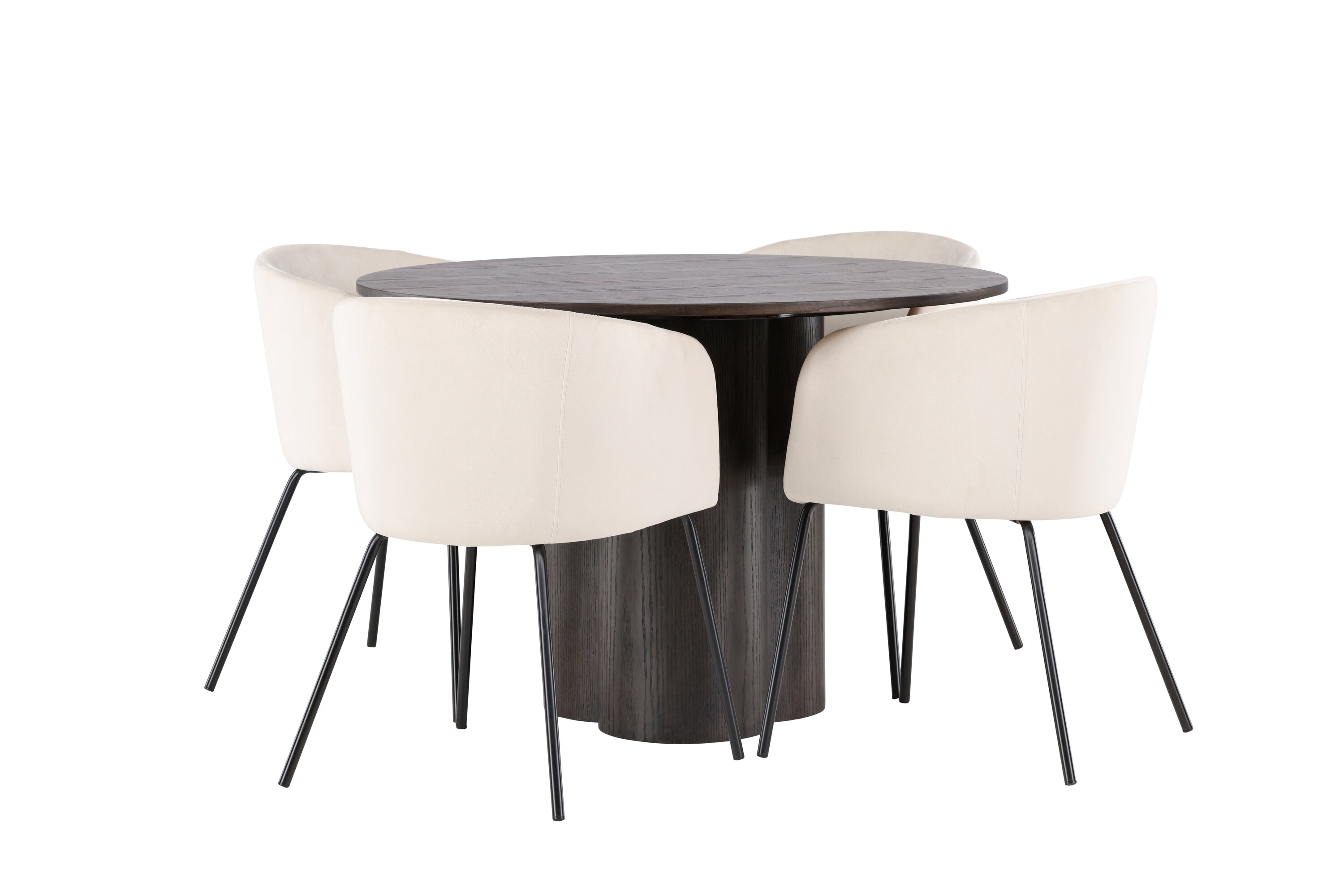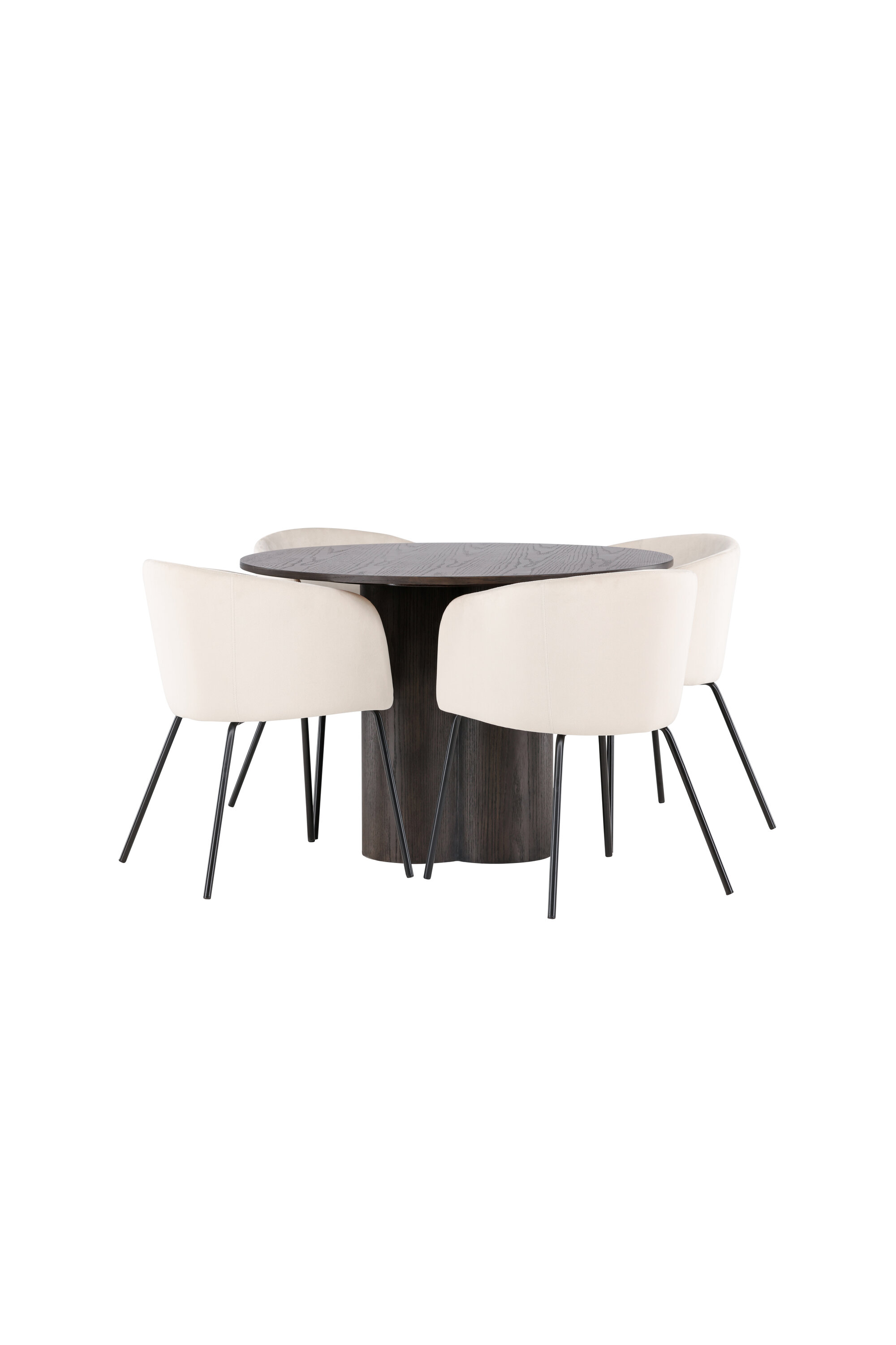 Loo oma elutuppa särav sära! Ümmargune söögilaud Olivia on skandinaavialiku ülddisainiga moodsas mokavärvis. Laual on õhuke MDF lauaplaat ja kolm silindrikujulist jalga, mis on koondatud laua keskosa alla. Värvil on hele kate, mis teeb materjali mustri nähtavaks. Siin koos meie suurepäraste söögitoolidega Berit. Toolil on täielikult polsterdatud disain, mille seljatugi ja iste on kergelt ümardatud sametkangast ning kitsad mustast rauast toolijalad. Trendika tunnetusega soe söögiseltskond! Laua mõõdud: 110 cm.