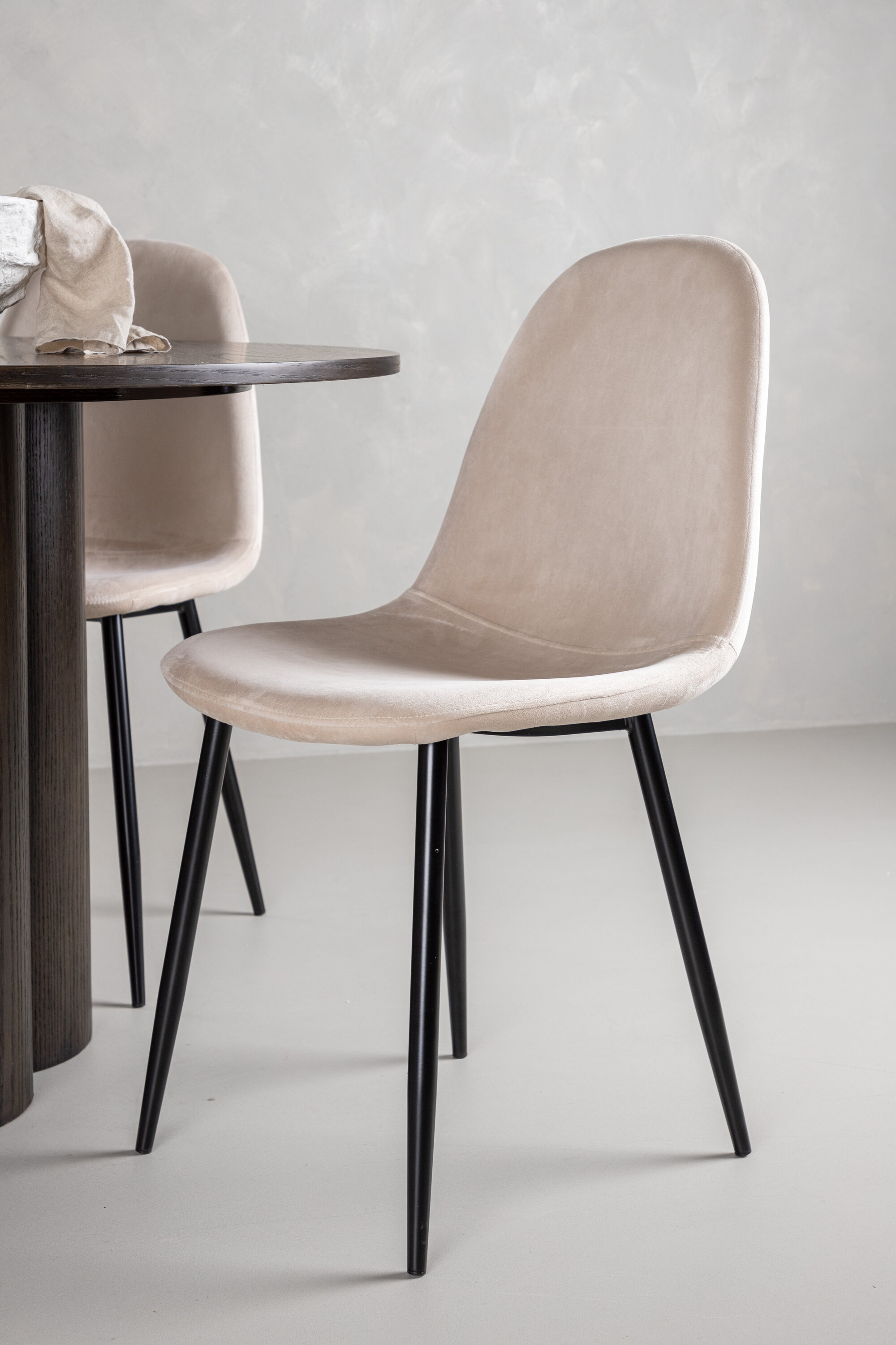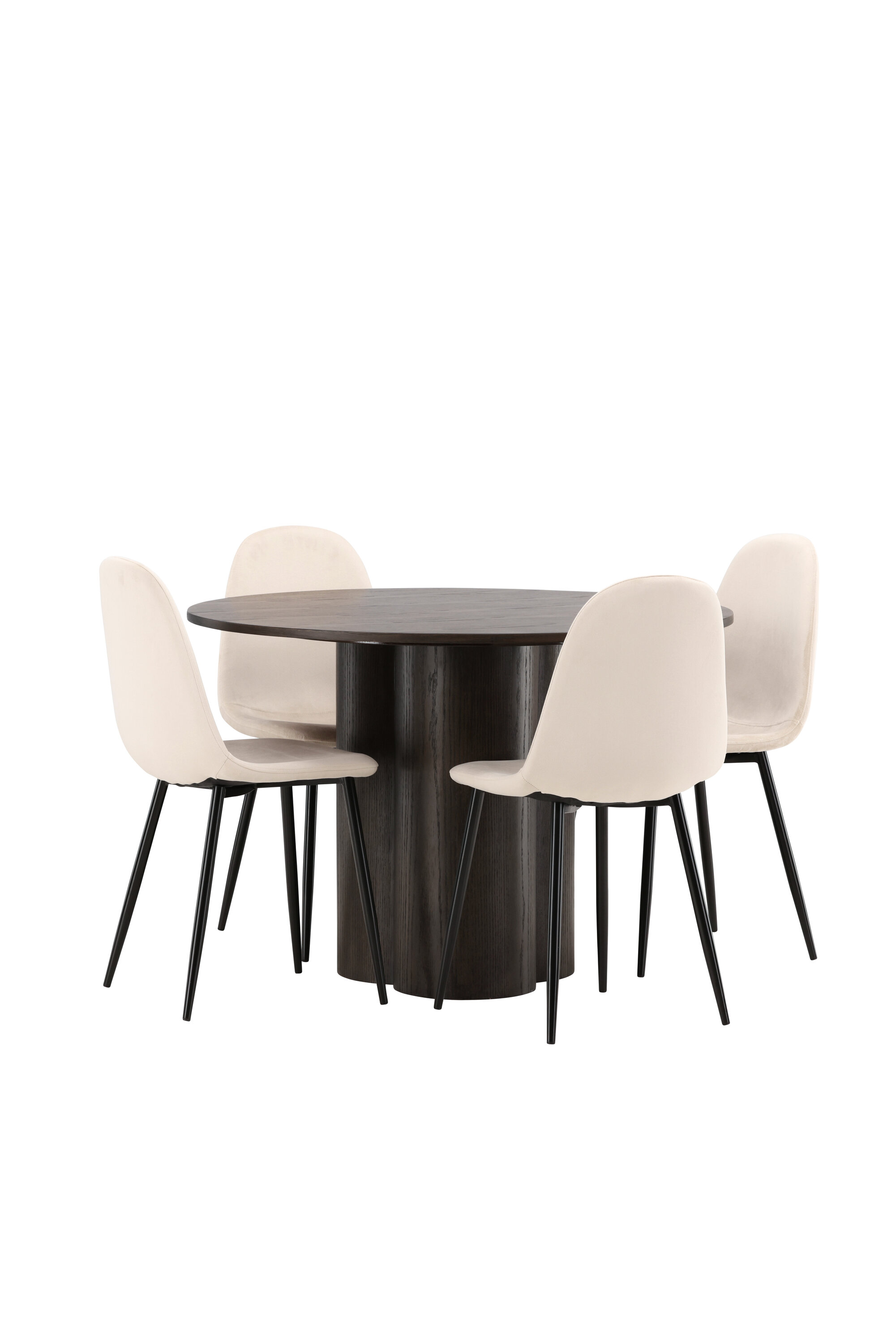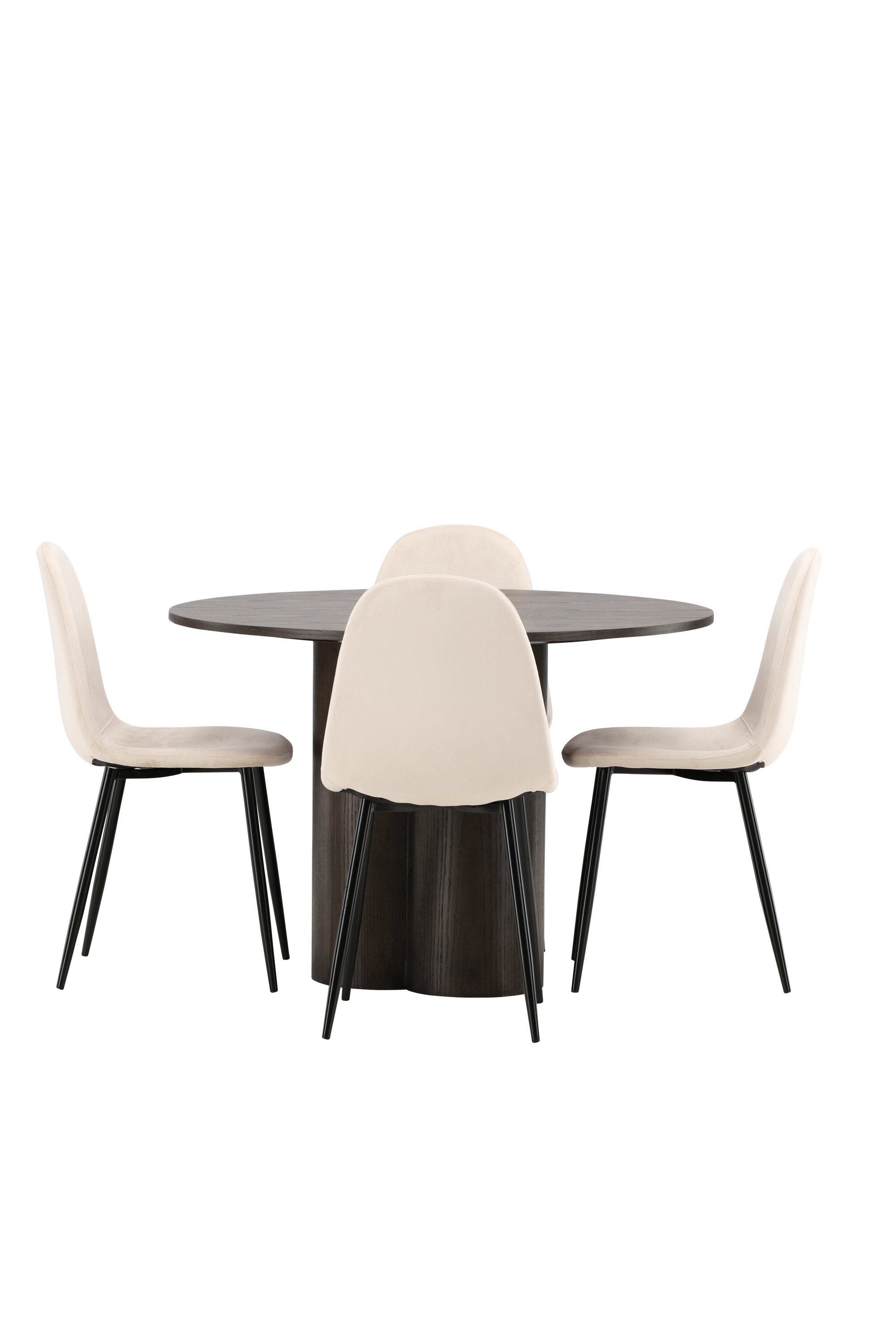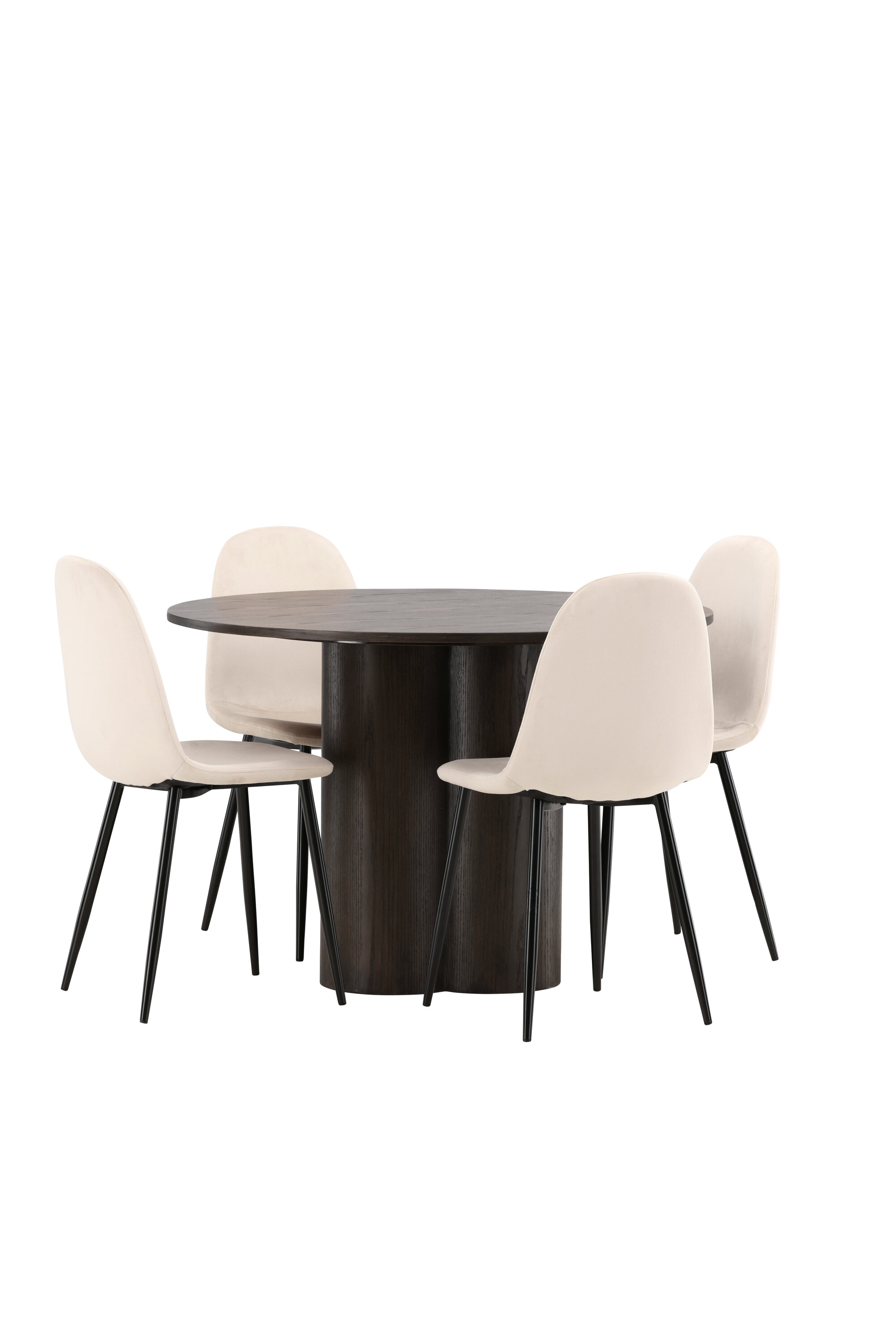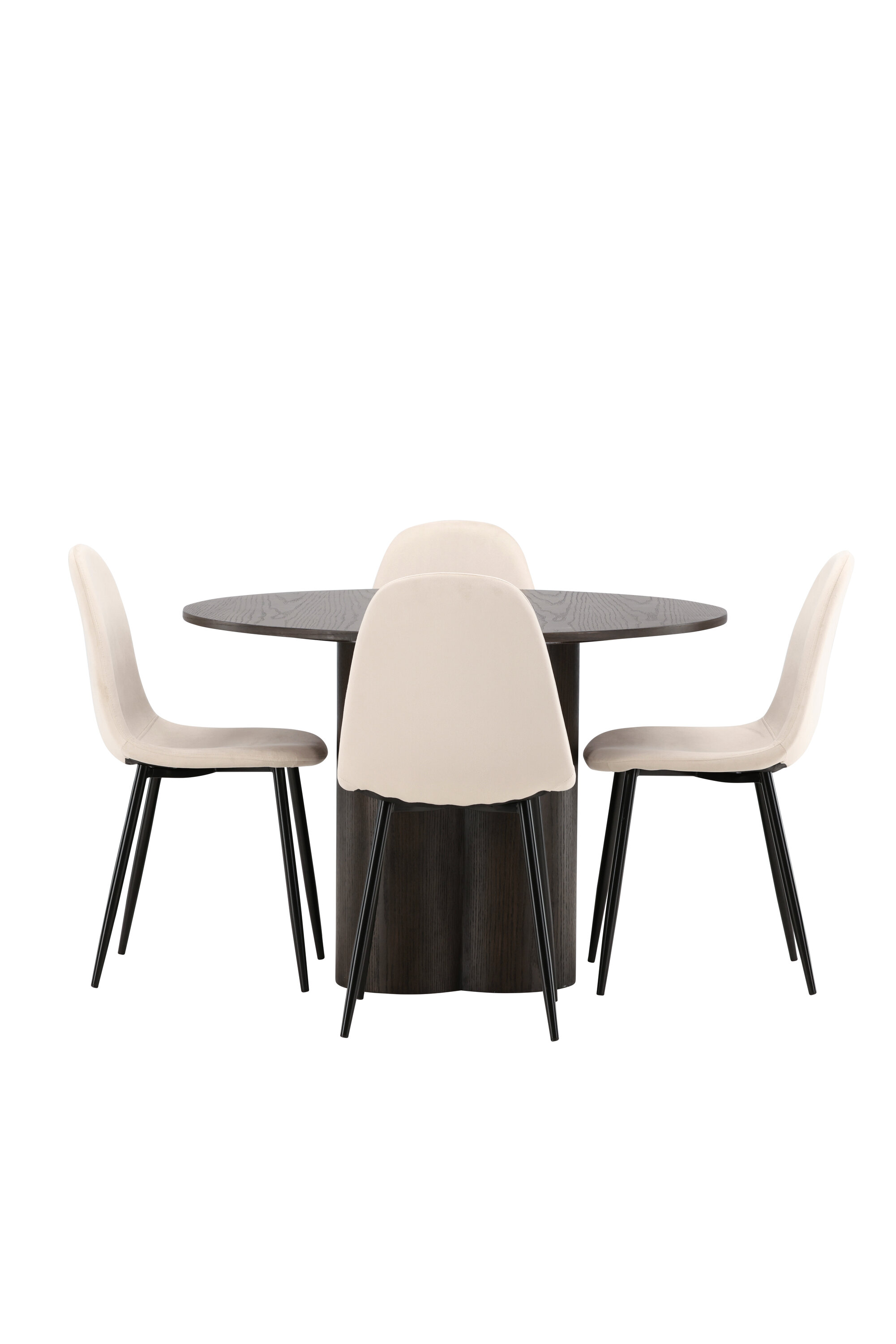 Söögigrupp, millest õhkub luksust ja mugavust! Söögilaud Olivia avaldab muljet oma skandinaavialiku ja maitseka disainiga. Laud on maitsekas MDF-plaadist mokavärvi, õhukese ümara ülaosa ja kolme silindrikujulise jalaga, mis on koondatud laua keskosa alla. Siin koos meie mugavate Polari seeria söögitoolidega. Toolil on täielikult polsterdatud disain, millel on ümar seljatugi ja iste beežist sametkangast, pehme polstriga ning jalad mustast pulbervärvitud metallist. Vältige kompromisse mugavuse ja disaini vahel!