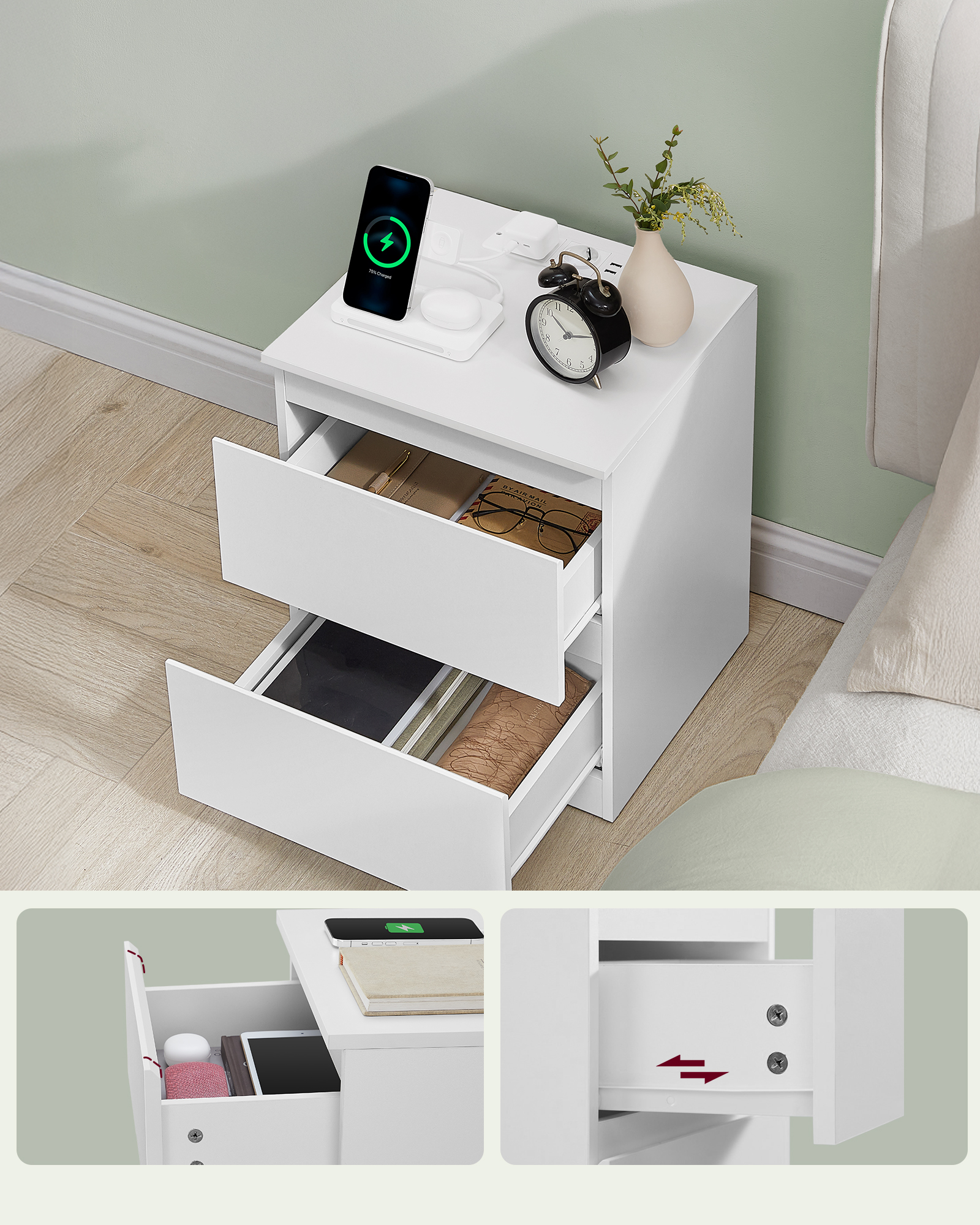 Toote andmed: Värvus: Pilvevalge Materjal: Puitlaastplaat, MDF (keskmise tihedusega puitkiudplaat) Iga öökapi mõõtmed: 35 x 40 x 49 cm (S x L x K) Iga öökapi kaal: 9 kg Lauaplaadi staatiline kandevõime: 50 kg Iga sahtli staatiline kandevõime: 4,7 kg Pakisisu: 2 x öökapp 2 x kokkupanekukomplekt 2 x kasutusjuhend