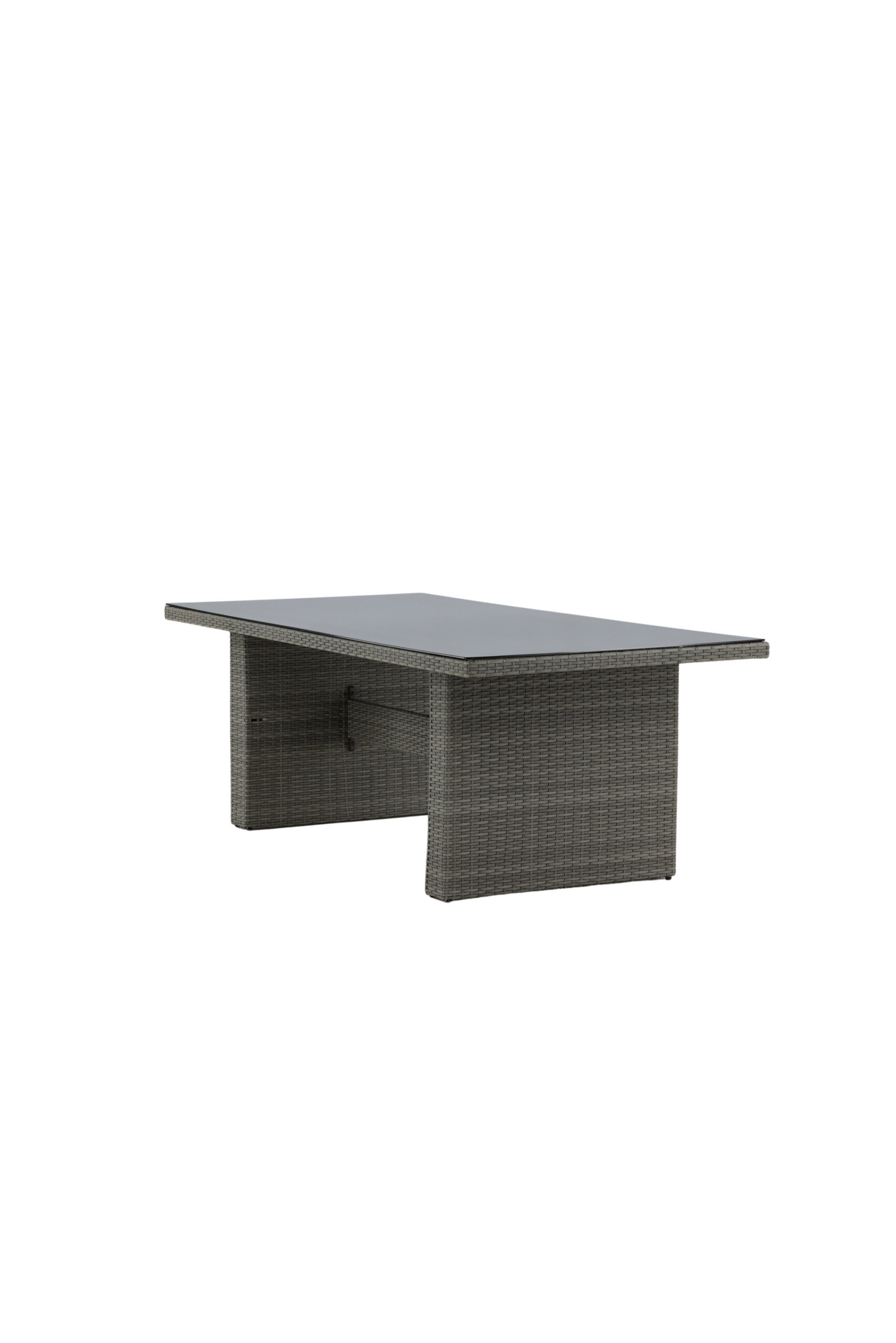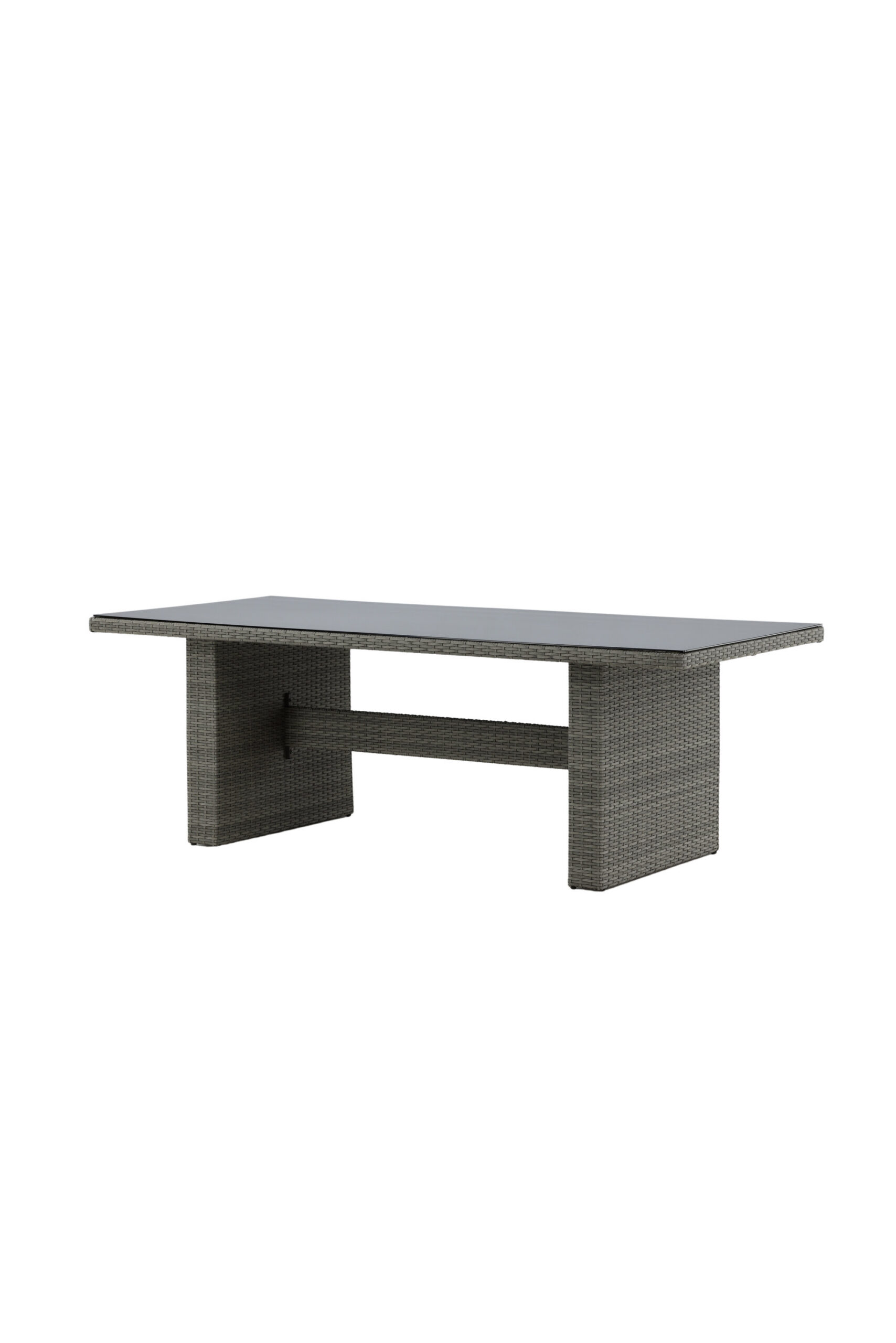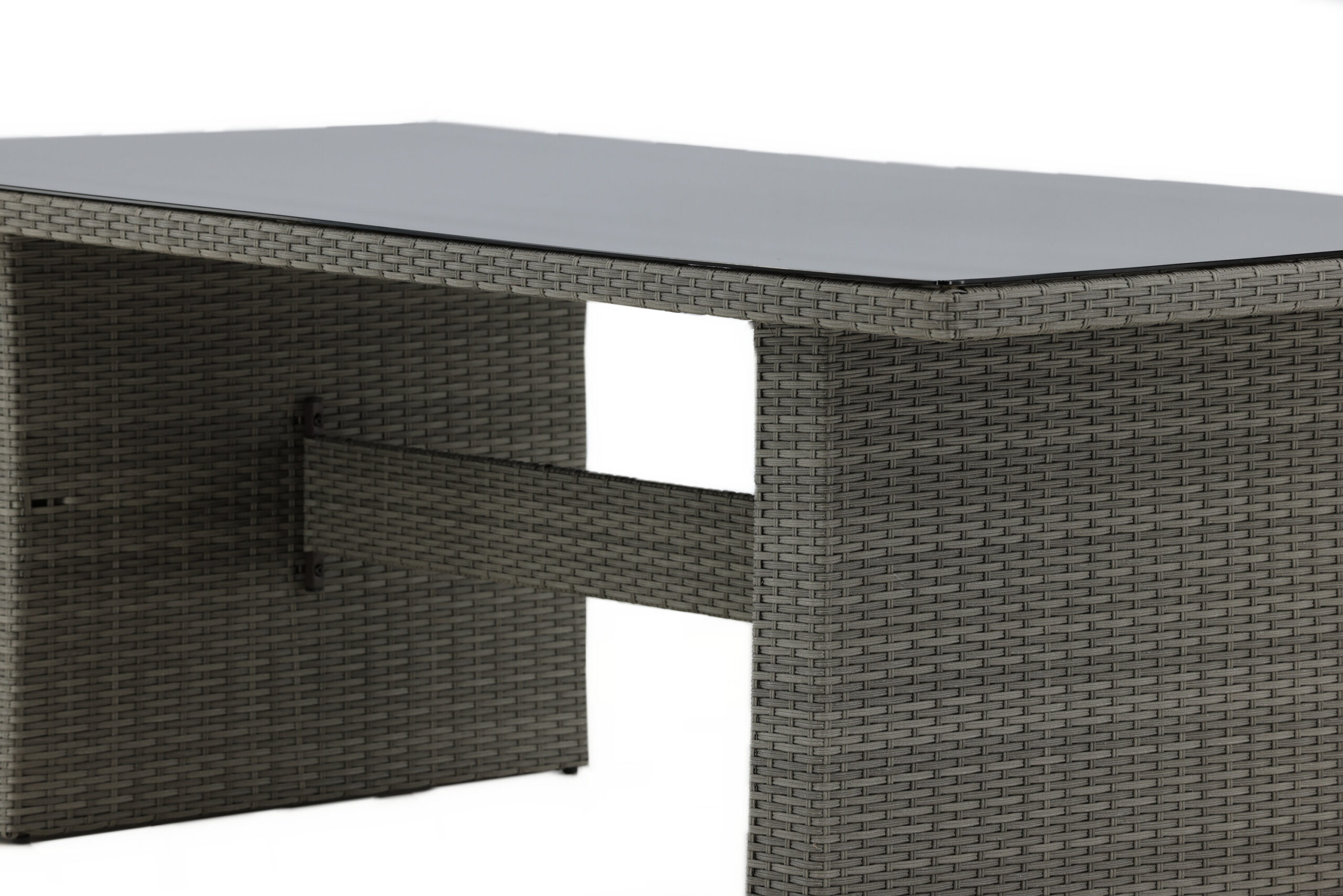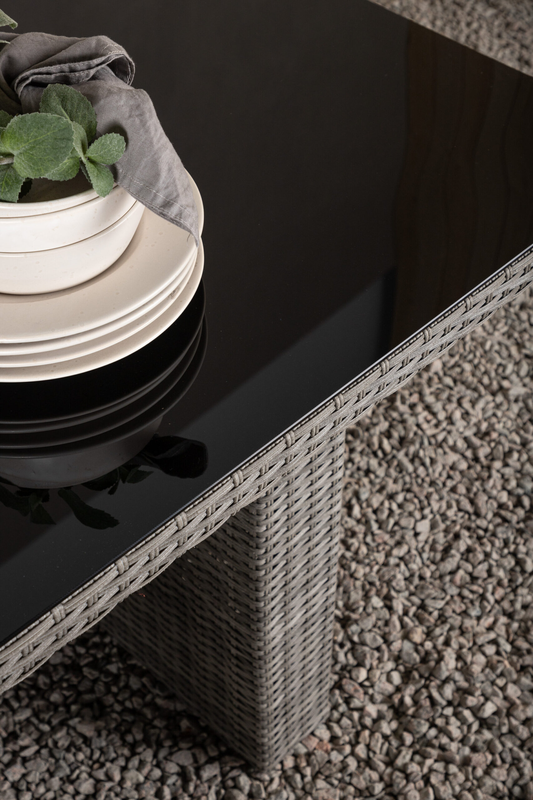 Ristkülikukujuline söögilaud kunstrotangist raami ja lauaklaasiga.