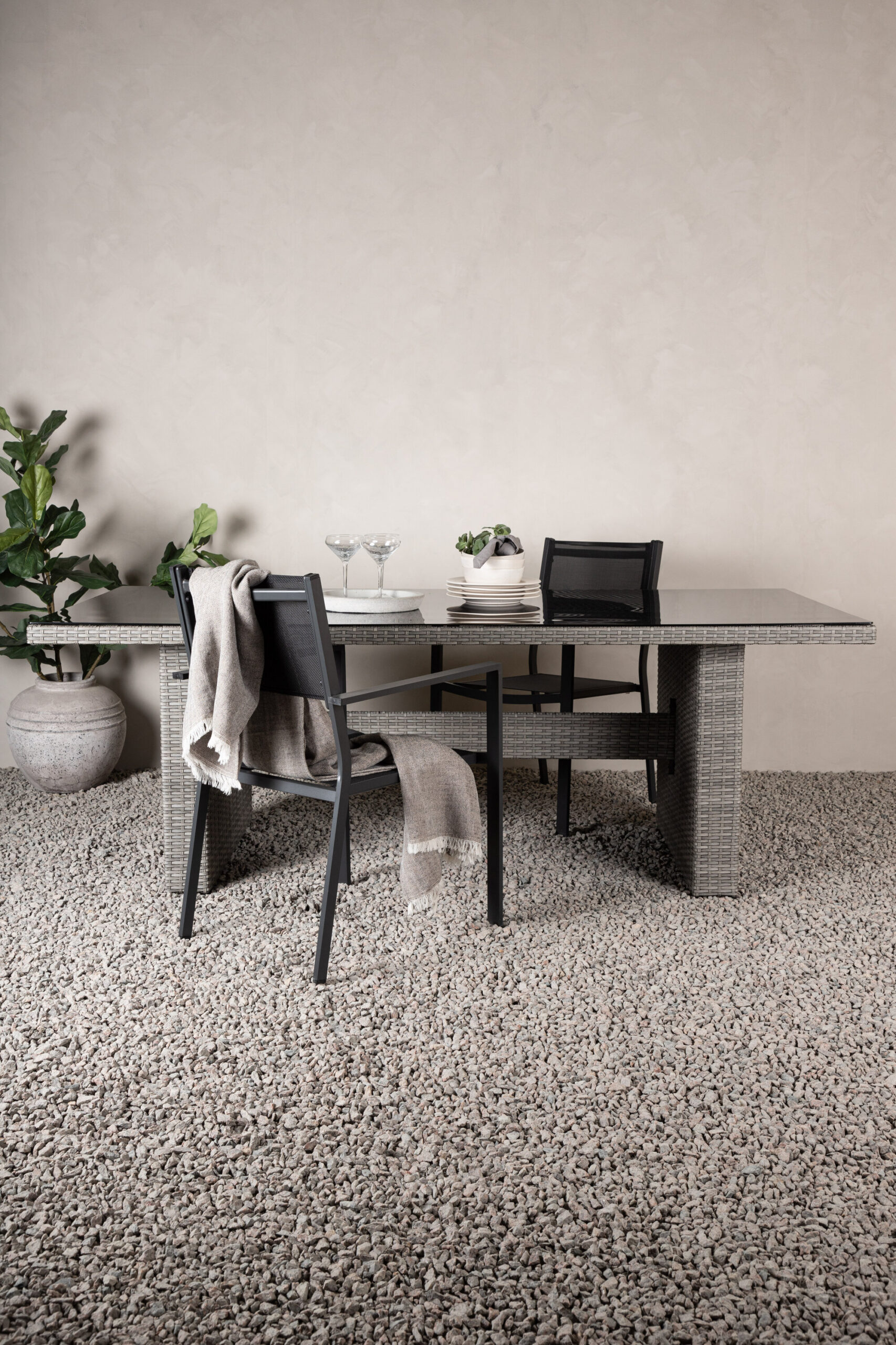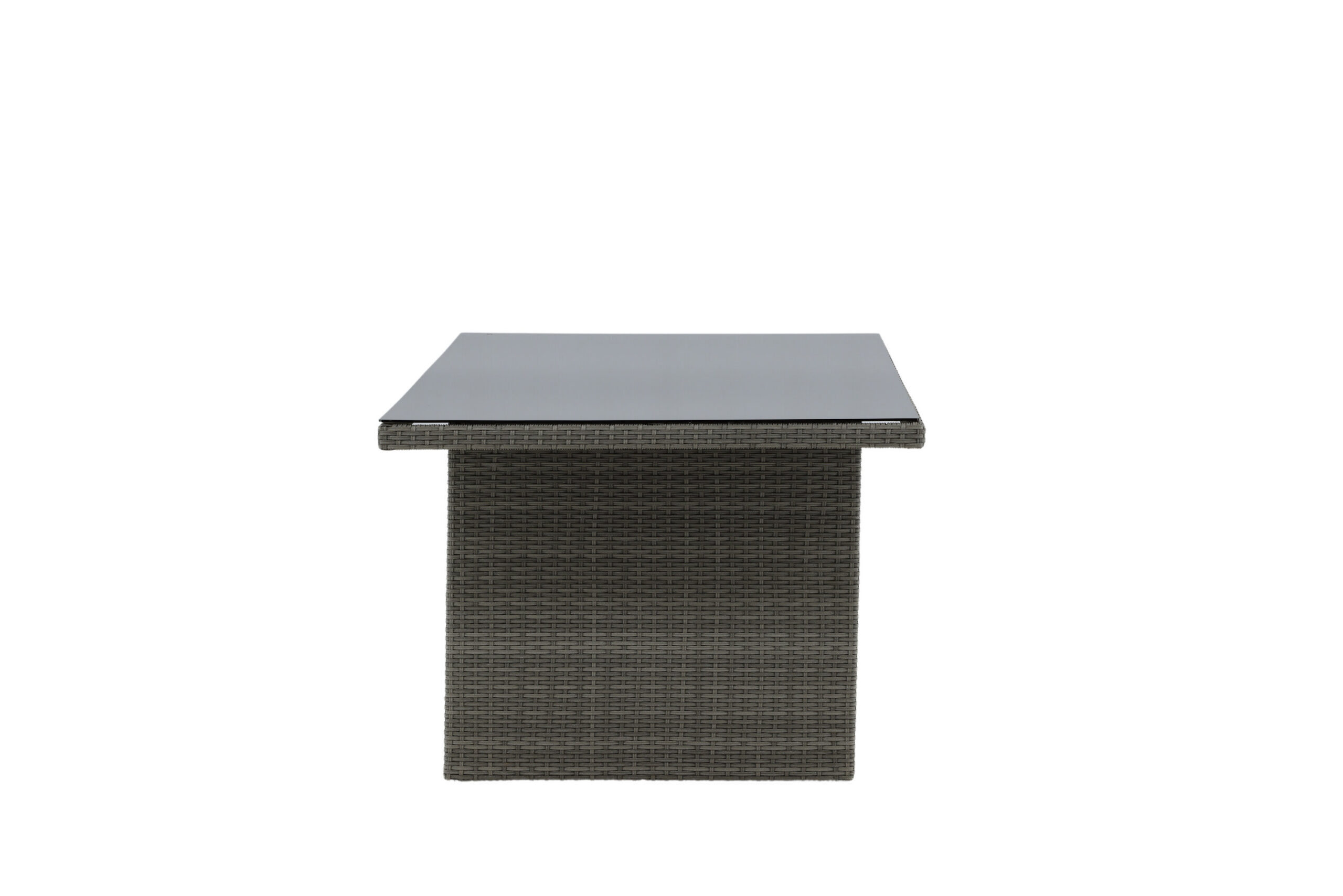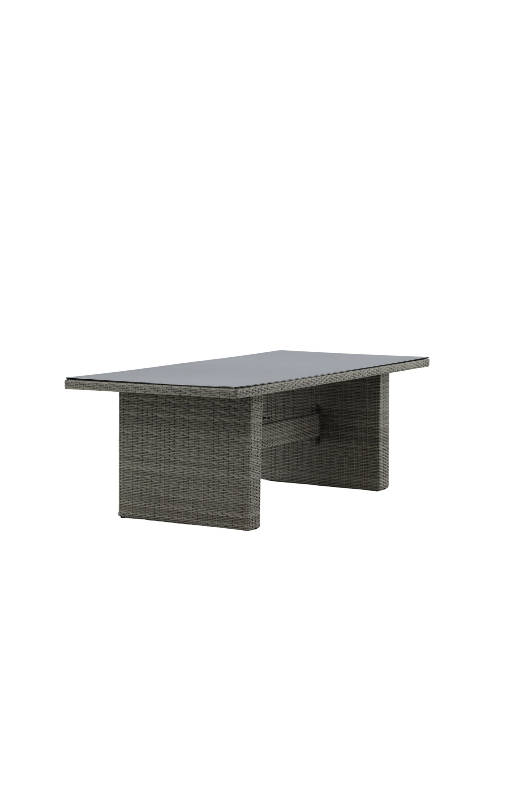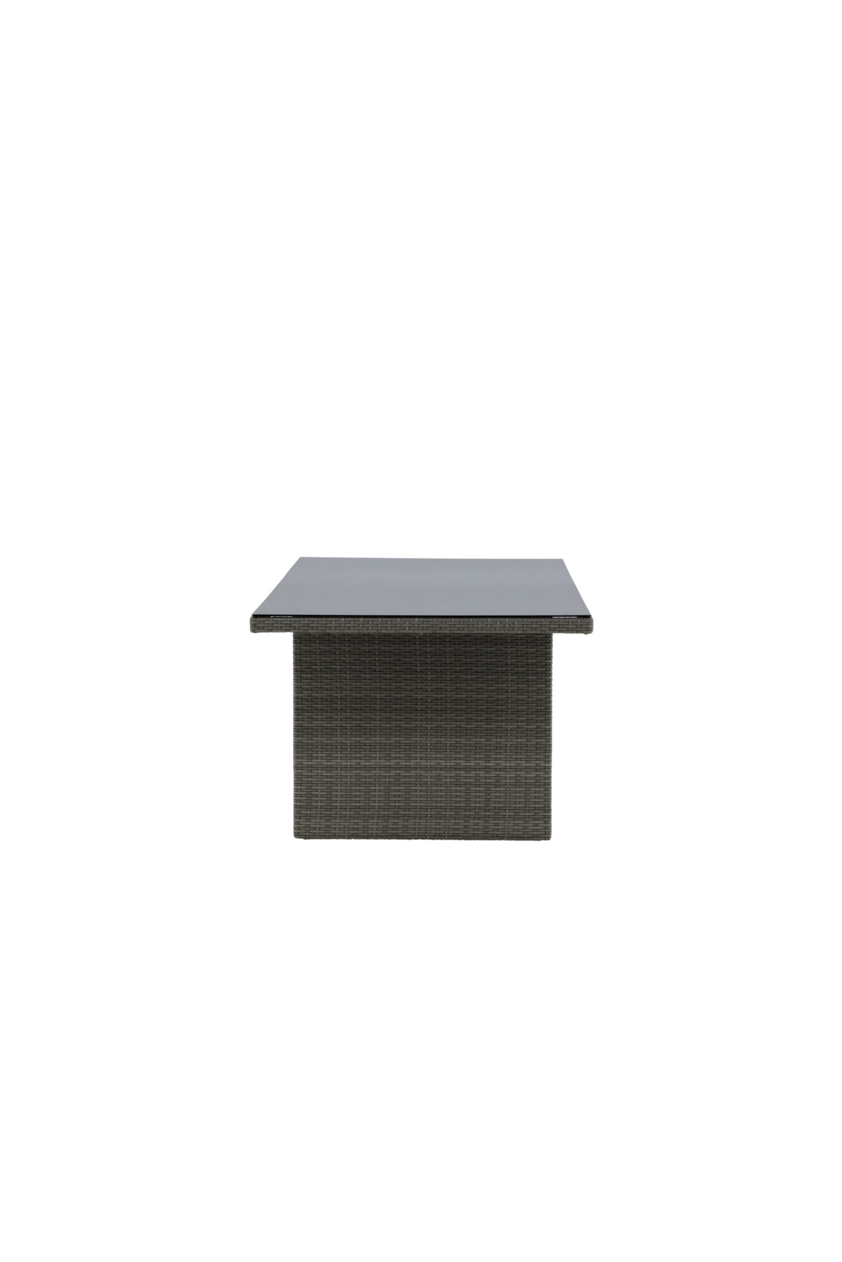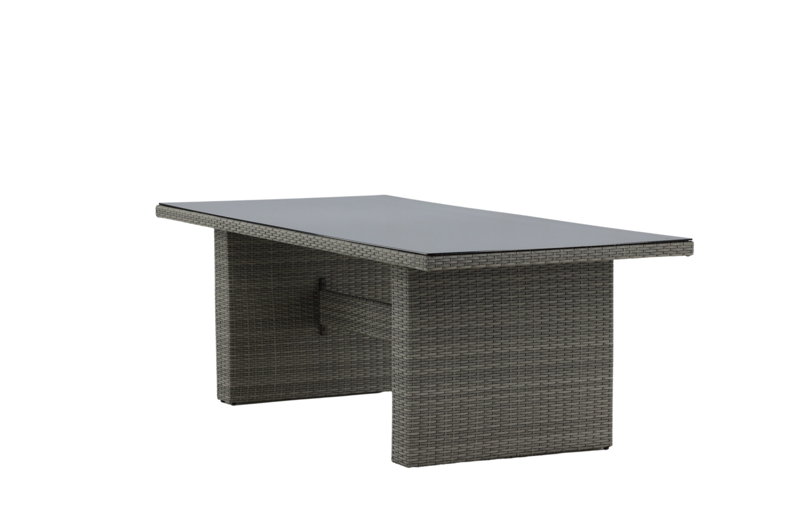 Ristkülikukujuline söögilaud kunstrotangist raami ja lauaklaasiga.