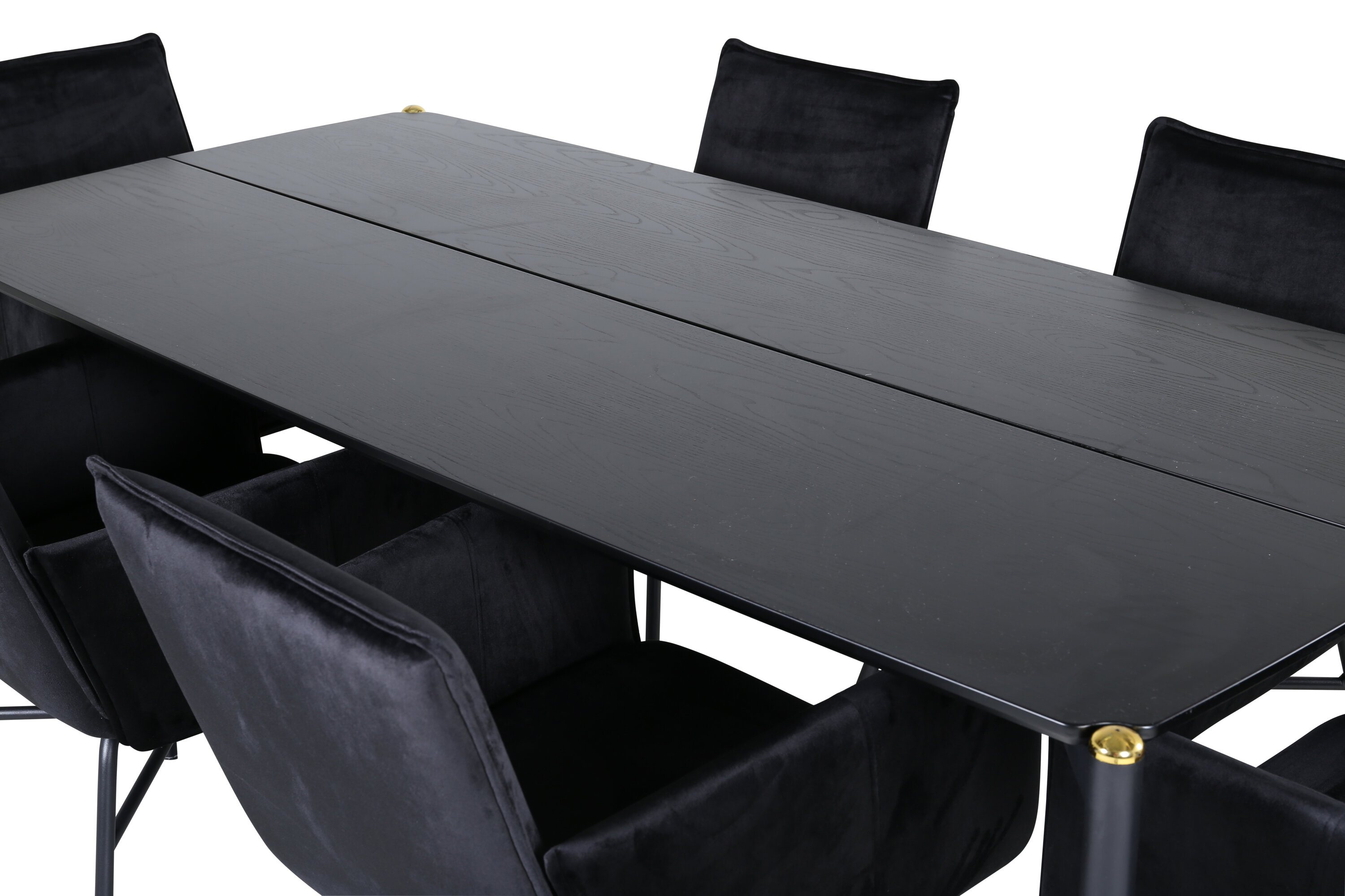 Söögilaual Pelle on hästi läbimõeldud disain sirgete põhjamaiste kujunditega, mis annavad stiilse tunde, kitsad rauast jalad, mille peal on dekoratiivne messingist punn, ja lauaplaadi keskel olev joon, millest saab maitsev detail. Lauaplaat on mustast spooniga MDF-st ja laua mõõdud: pikkus: 190cm, laius: 90cm, kõrgus: 75cm. Siin pompoosses kombinatsioonis 6 Petra söögitooliga. Toolijalad on mustast rauast ja täielikult riietatud must iste pehmest sametkangast. Tooli mõõdud: kõrgus: 87 cm, istme kõrgus: 48 cm, laius: 57 cm, sügavus: 60 cm. See on luksuslik ja mugav teie elutoas!
