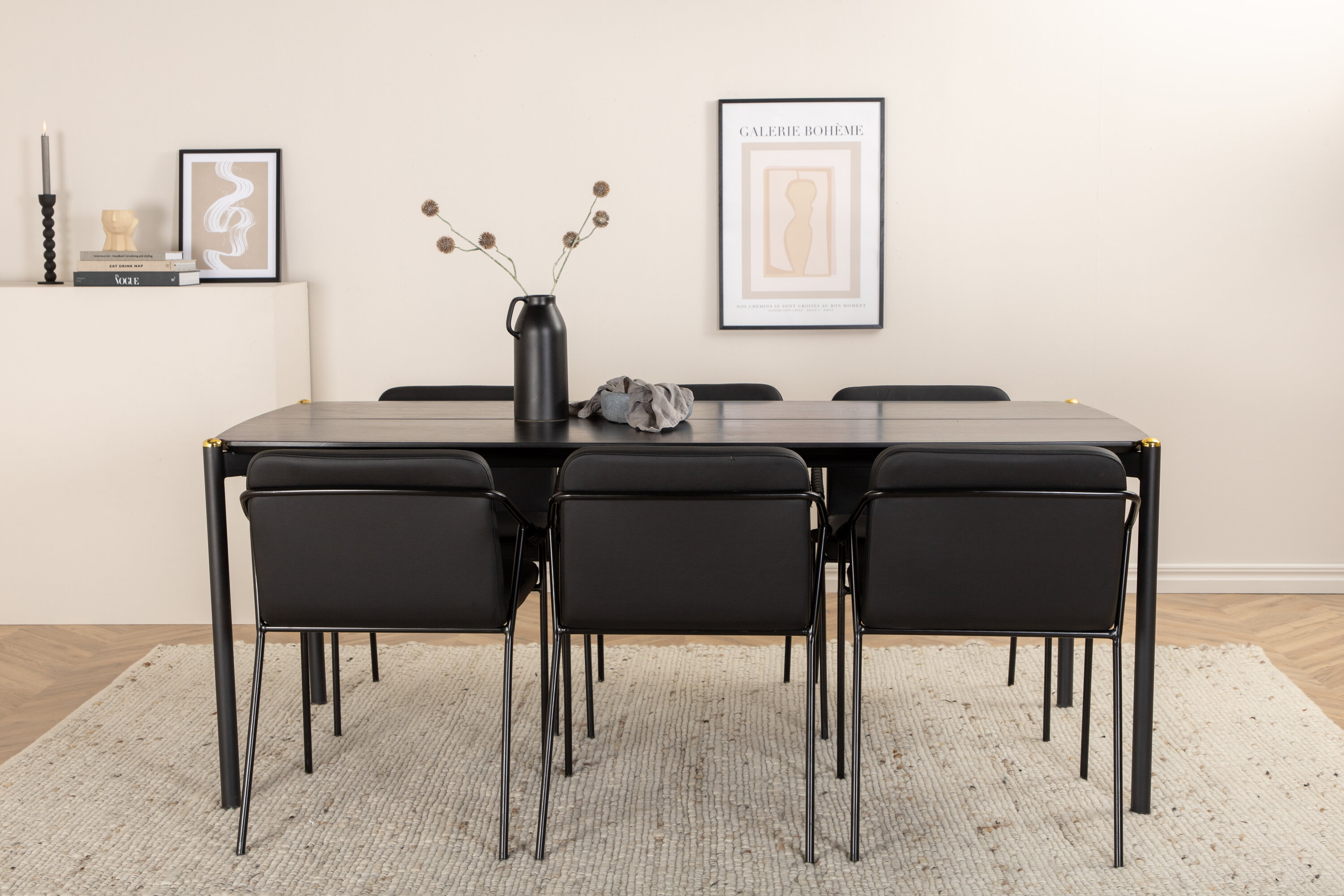 Kutsuv, stiilne ja ajatu – söögilaud Pelle loob teie kodus moeteadliku mulje! Disain on hästi läbimõeldud: sirged põhjamaised vormid, mis annavad stiilse tunde, kitsad rauast jalad, mille peal on dekoratiivne messingist punn, ja lauaplaadi keskel olev kulg, mis muutub maitsvaks detailiks. Lauaplaat on mustast spooniga MDF-st ja laua mõõdud: pikkus: 190cm, laius: 90cm, kõrgus: 75cm. Siin sobib kokku 6 maitseka disainiga vaidlustooli. Istmed on mustast kunstnahast ning neil on integreeritud käetoed ning mustast rauast toolijalad. Tooli mõõdud: kõrgus: 77 cm, istme kõrgus: 48 cm, laius: 53 cm, sügavus: 59 cm.