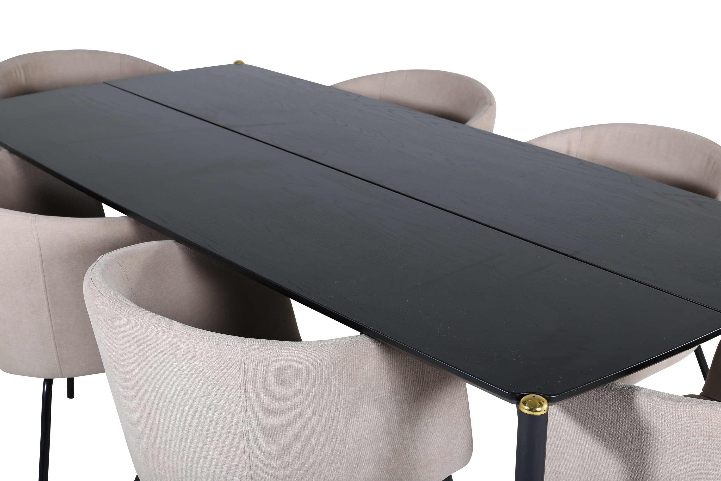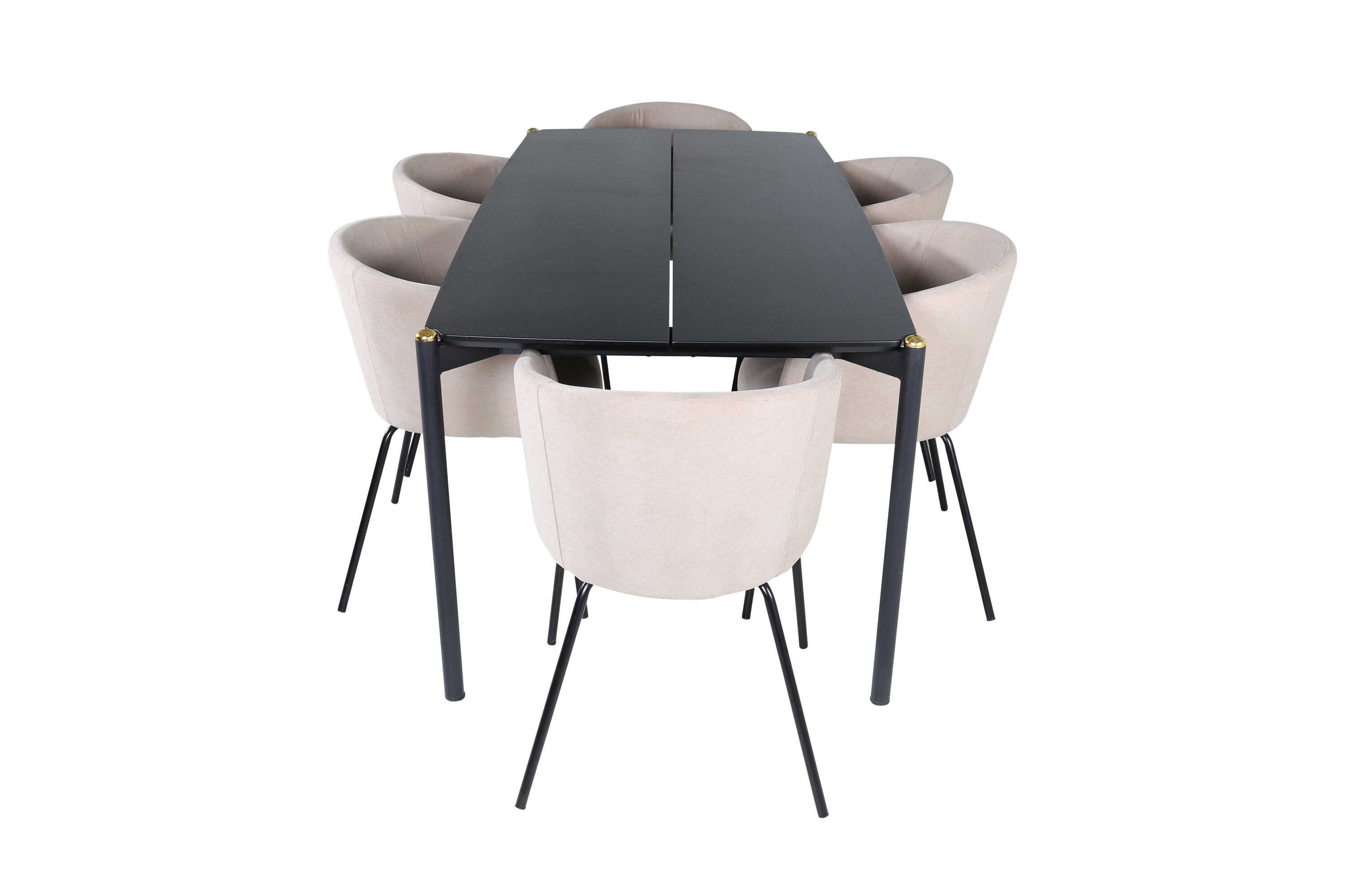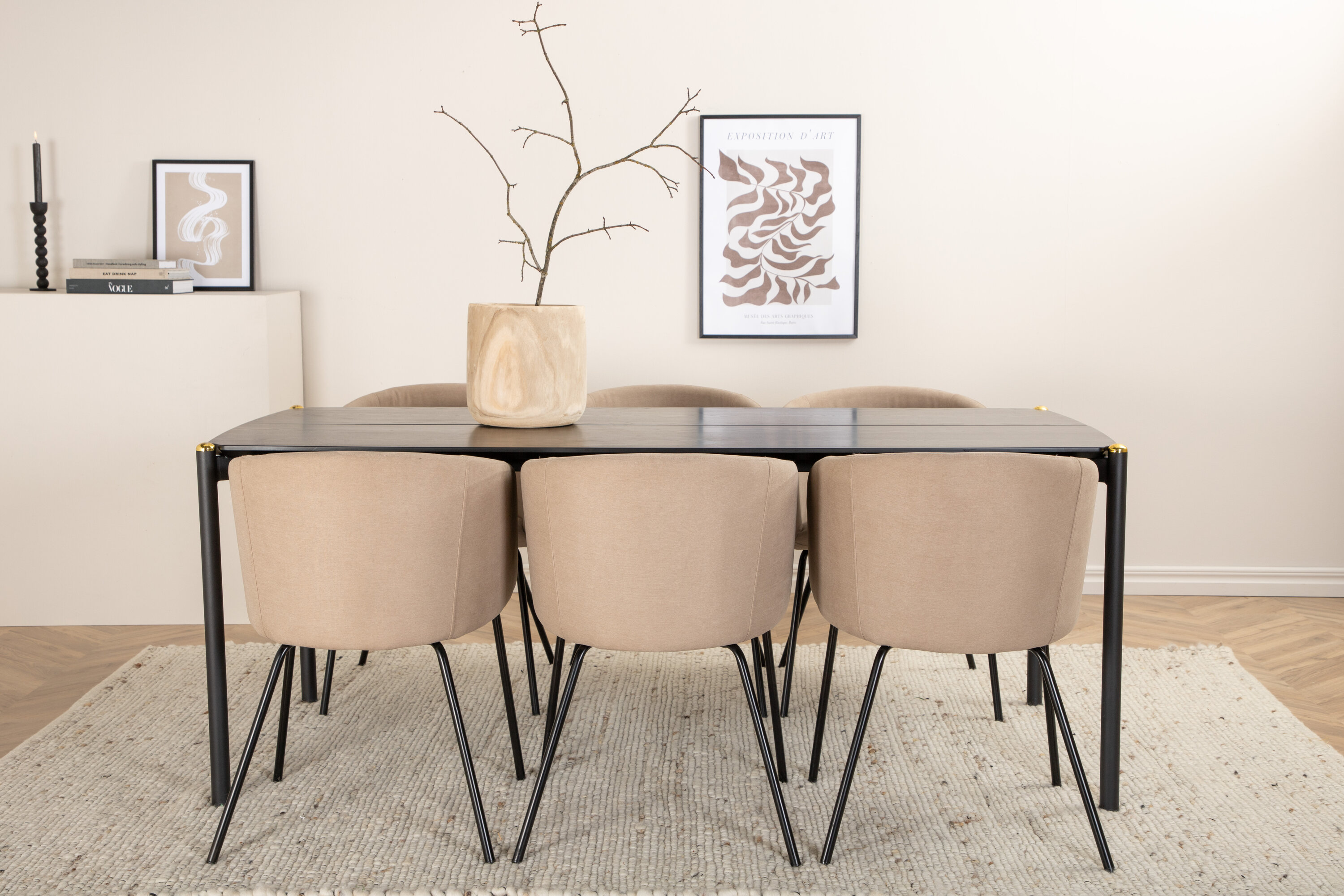 Saagu sellest kaunilt kokkusobivast tänapäevase tunnetusega toidugrupist loomulik kogunemispaik teie kodus. Söögilaual Pelle on hästi läbimõeldud disain sirgete põhjamaiste kujunditega, mis annavad stiilse tunde, kitsad rauast jalad, mille peal on dekoratiivne messingist punn, ja lauaplaadi keskel olev joon, millest saab maitsev detail. Lauaplaat on mustast spooniga MDF-st ja laua mõõdud: pikkus: 190cm, laius: 90cm, kõrgus: 75cm. Siin sobib kokku 6 meie populaarse Berit söögitooliga. Luksusliku disainiga toolidel on mugav beežist polüesterlinast iste ja stiilselt kitsas mustast rauast taburetijalg. Tooli mõõdud: kõrgus: 78 cm, istme kõrgus: 49 cm, laius: 55 cm, sügavus: 55 cm.