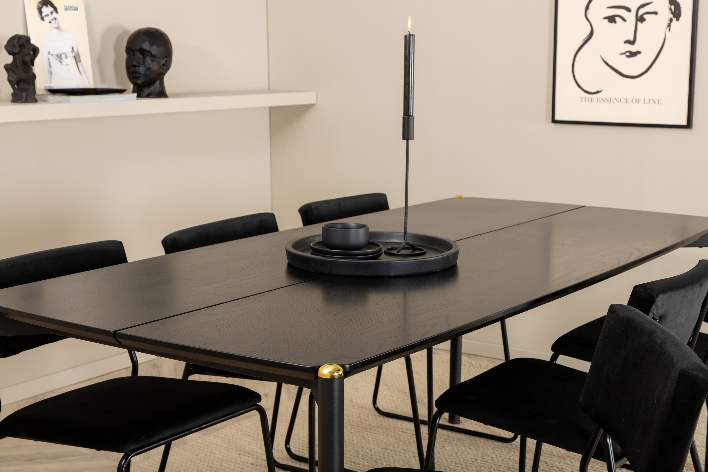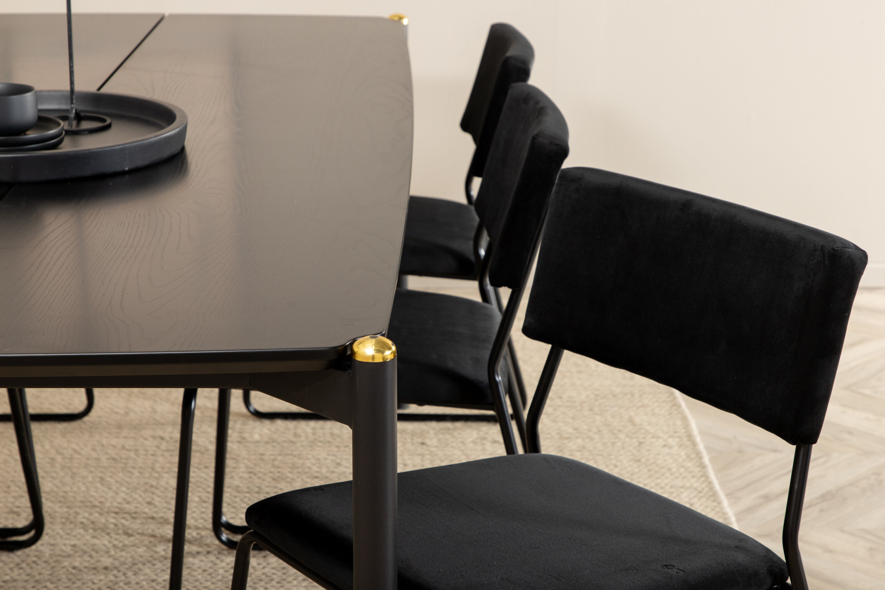 Kutsuv, stiilne ja ajatu – söögilaud Pelle loob teie kodus moeteadliku mulje! Disain on hästi läbimõeldud: sirged põhjamaised vormid, mis annavad stiilse tunde, kitsad rauast jalad, mille peal on dekoratiivne messingist punn, ja lauaplaadi keskel olev kulg, mis muutub maitsvaks detailiks. Lauaplaat on mustast spooniga MDF-st ja laua mõõdud: pikkus: 190cm, laius: 90cm, kõrgus: 75cm. Siin sobib kokku 6 musta värvi Kenth söögitooli, millel on rauast toolijalad ja pehmest sametkangast istmed. Tooli mõõdud: kõrgus: 76 cm, istme kõrgus: 48,5 cm, laius: 40 cm, sügavus: 52 cm